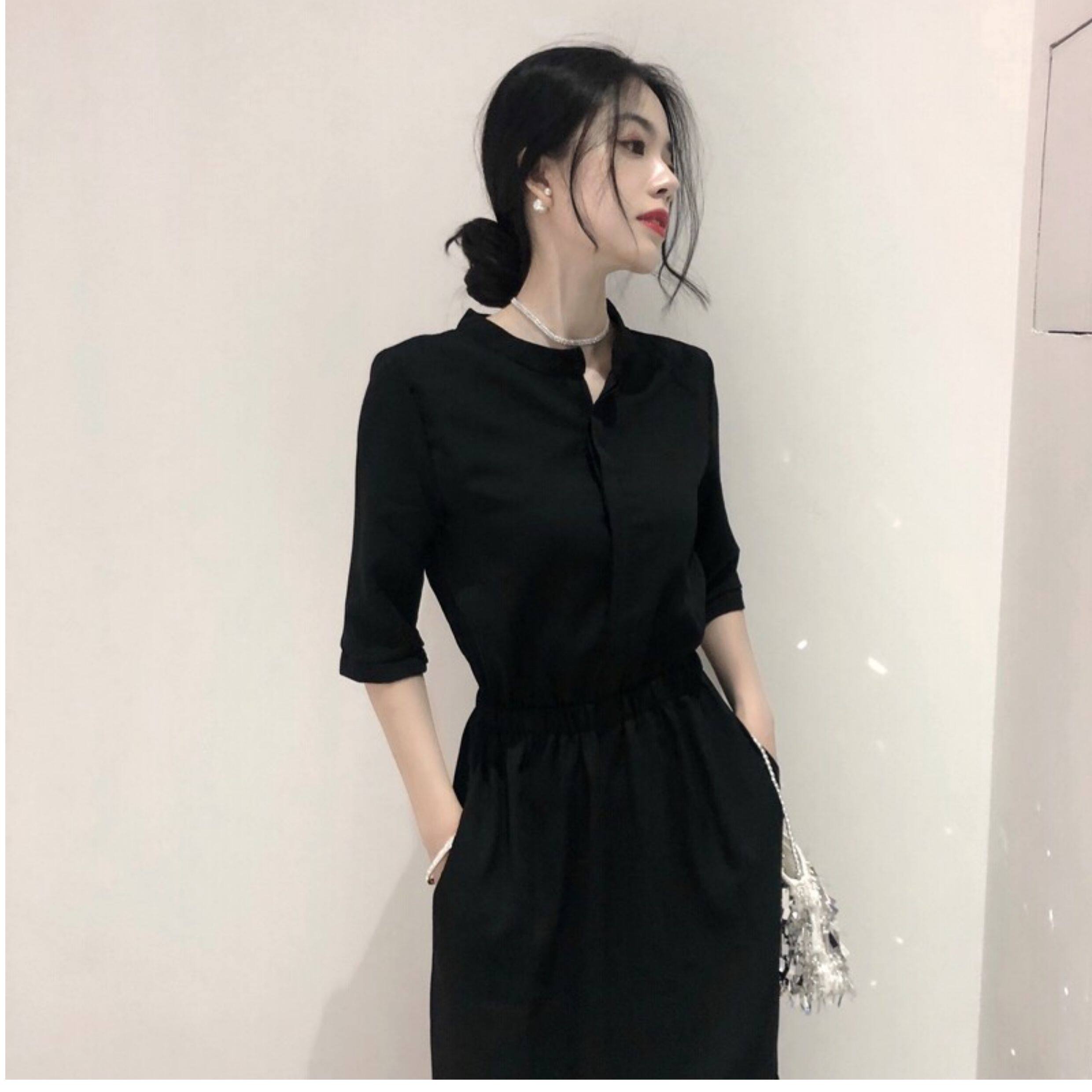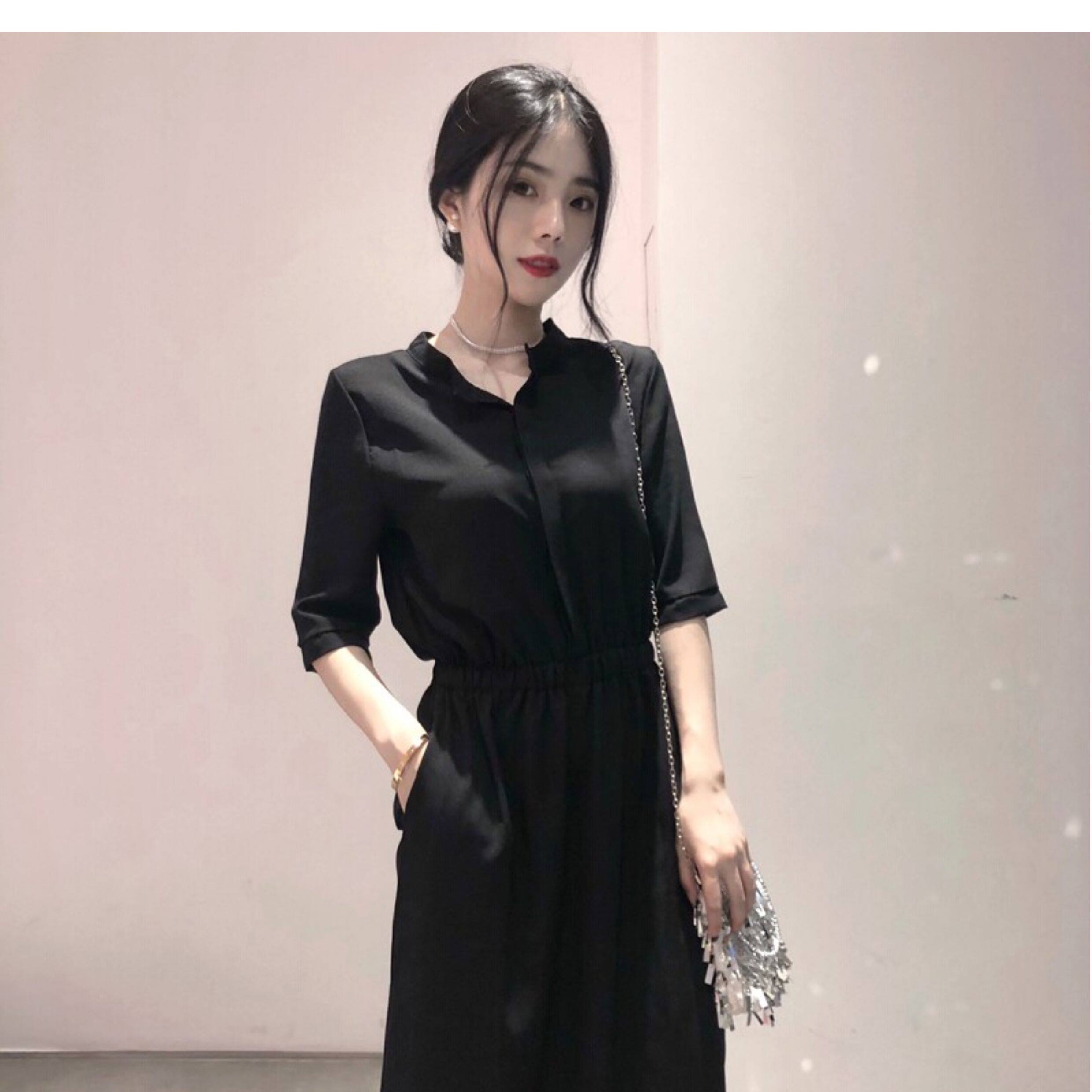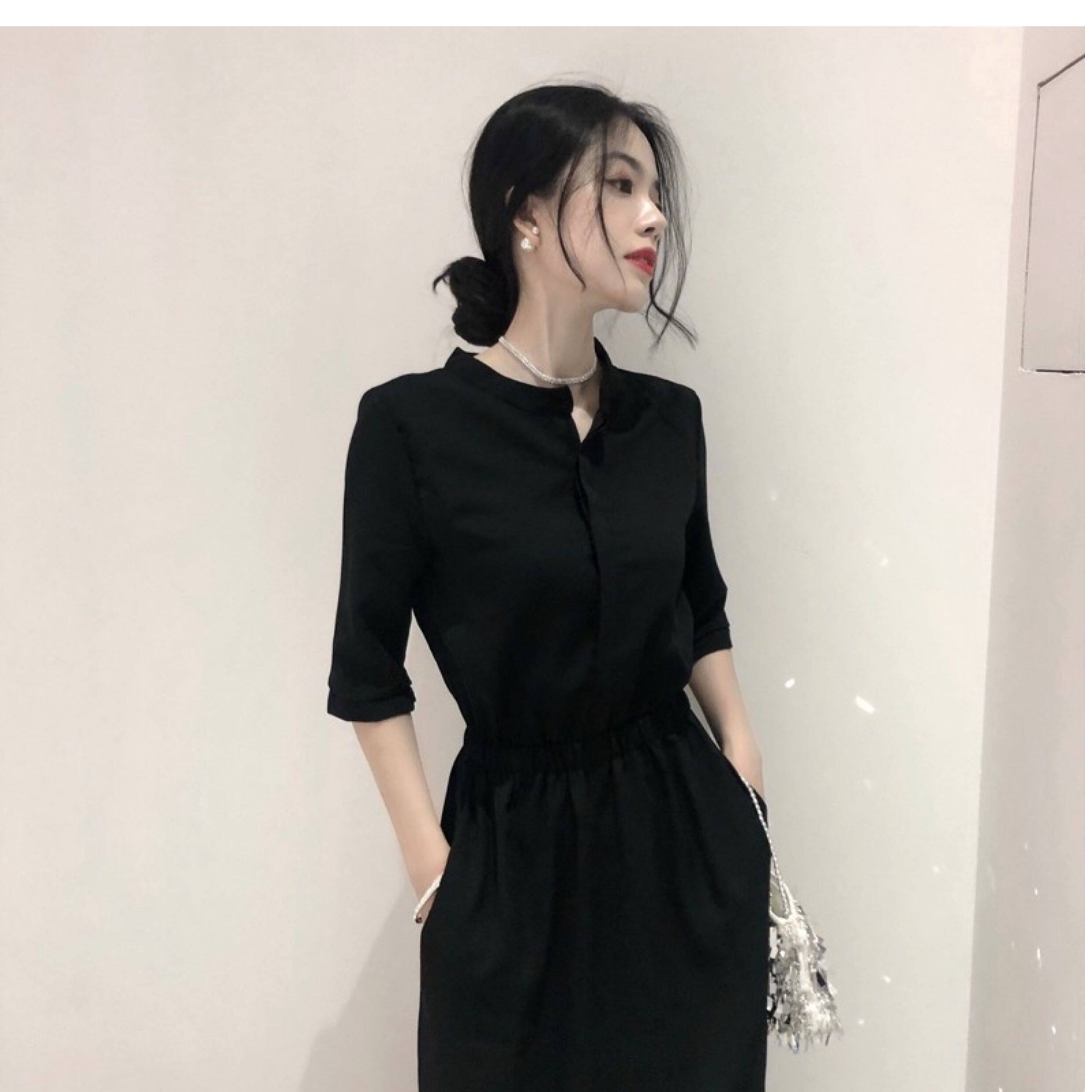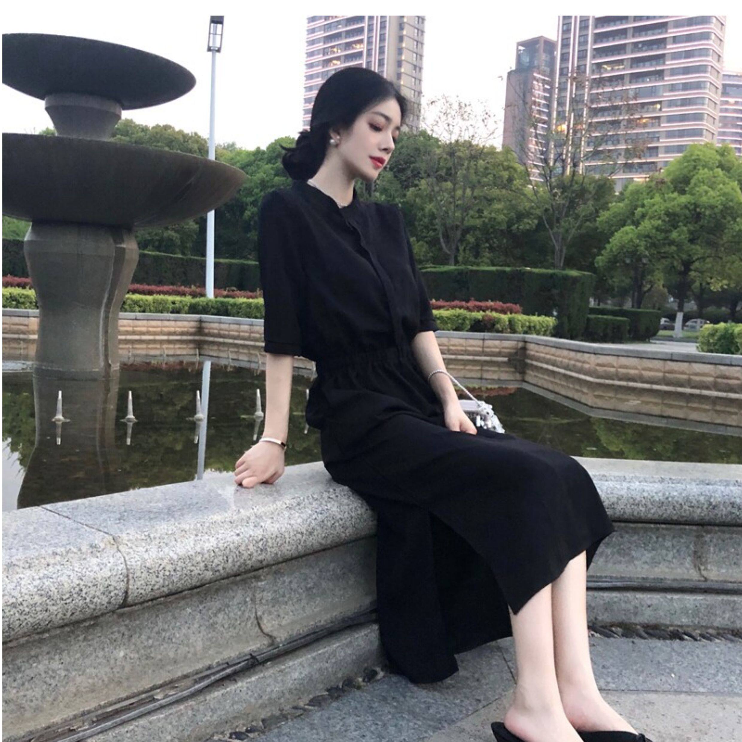 裙子女長款夏季收腰顯瘦氣質長裙高級感雪紡赫本風中袖黑色連衣裙