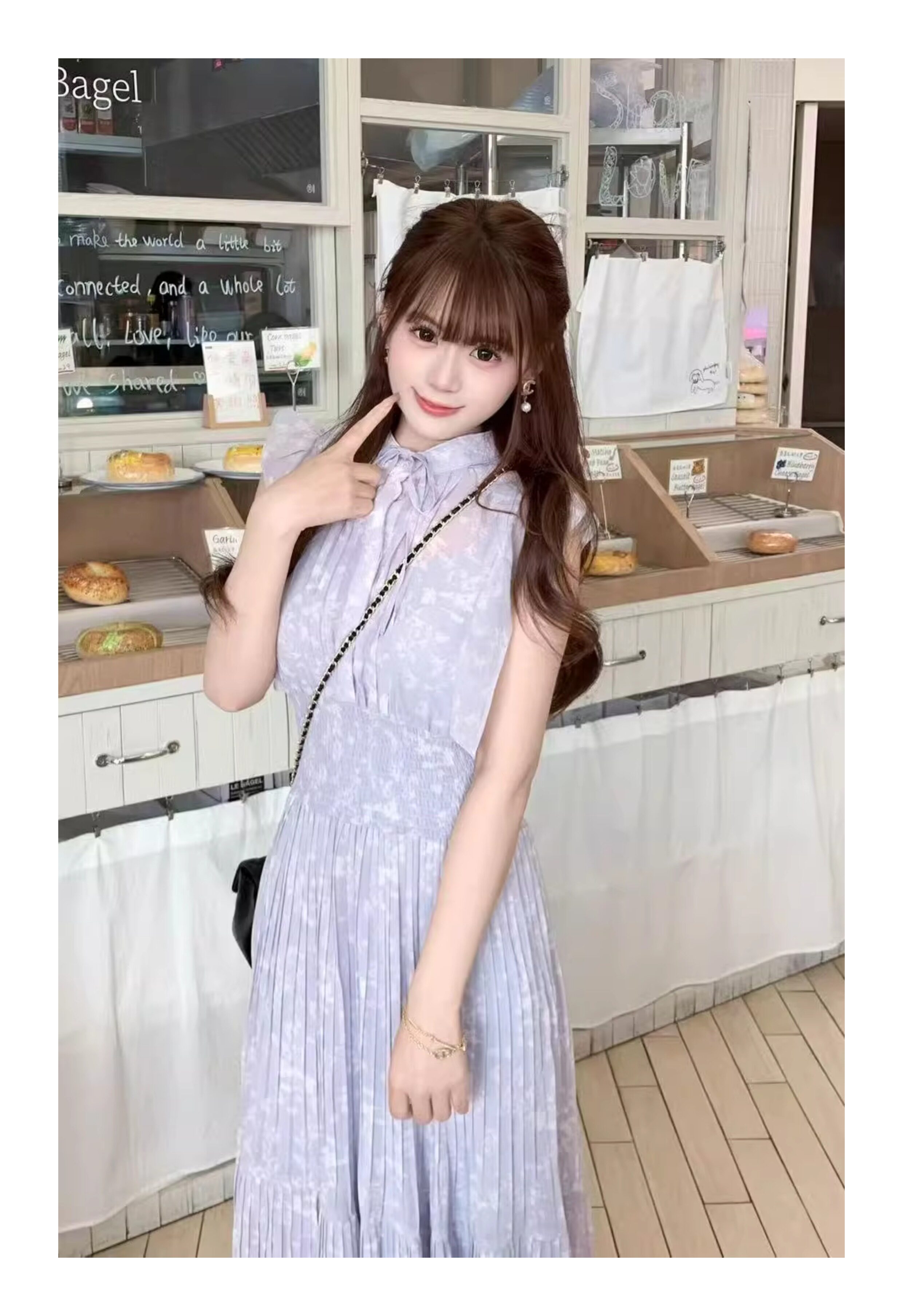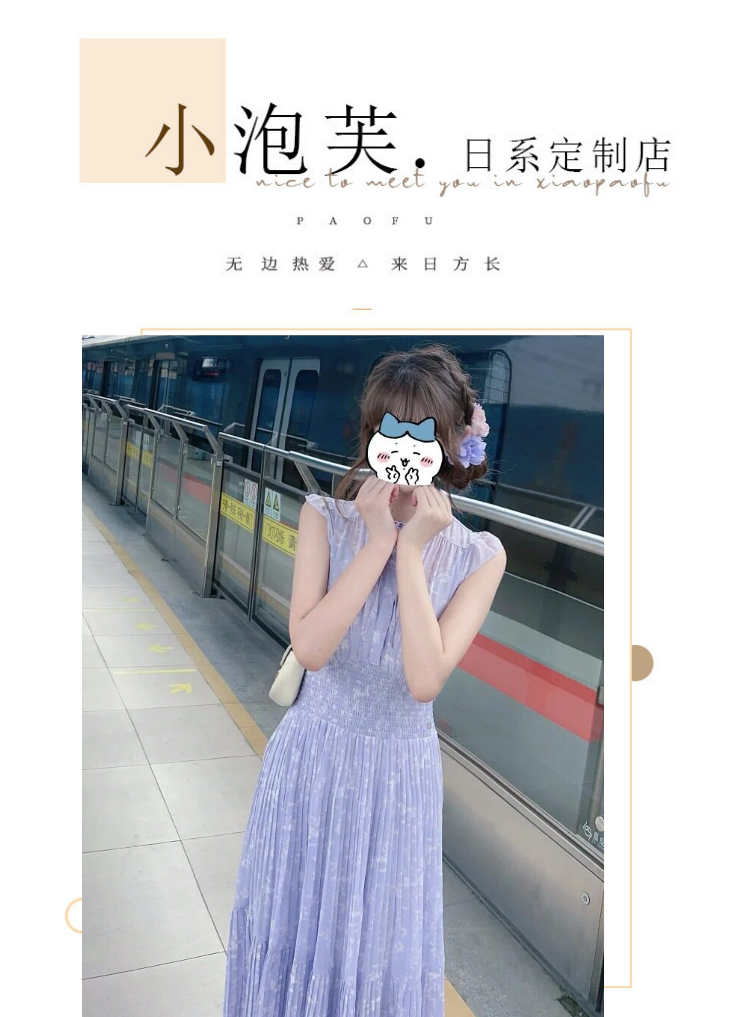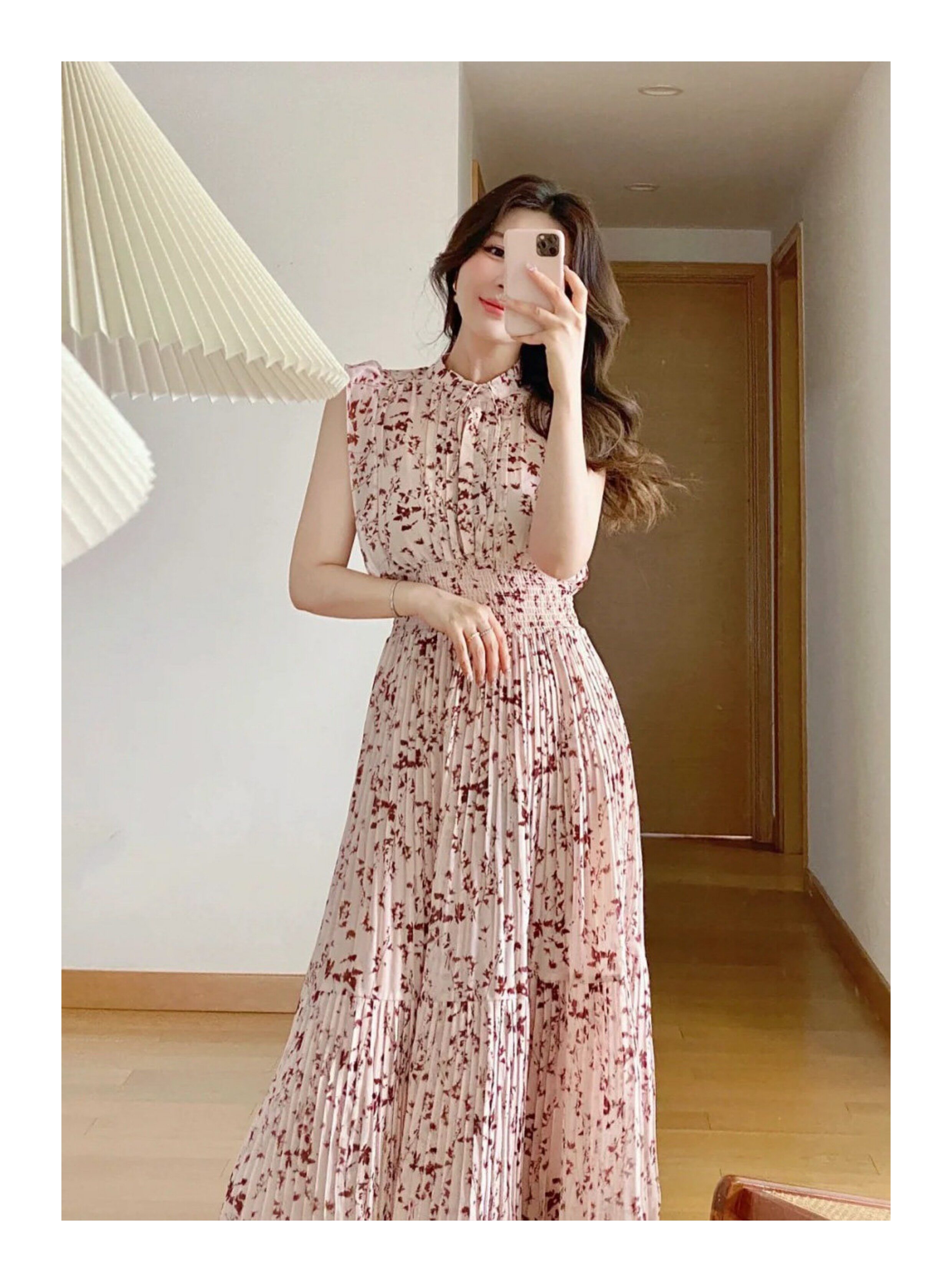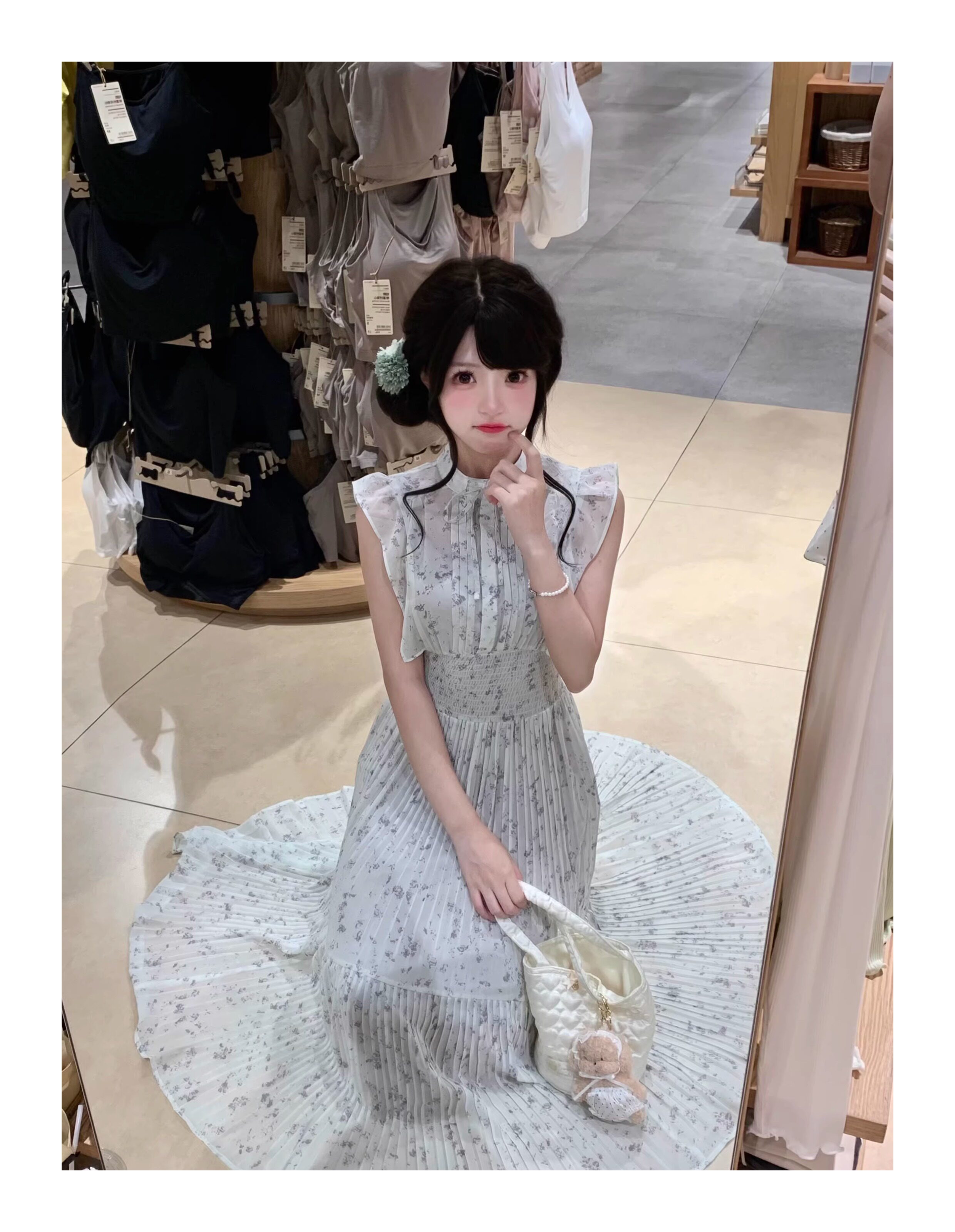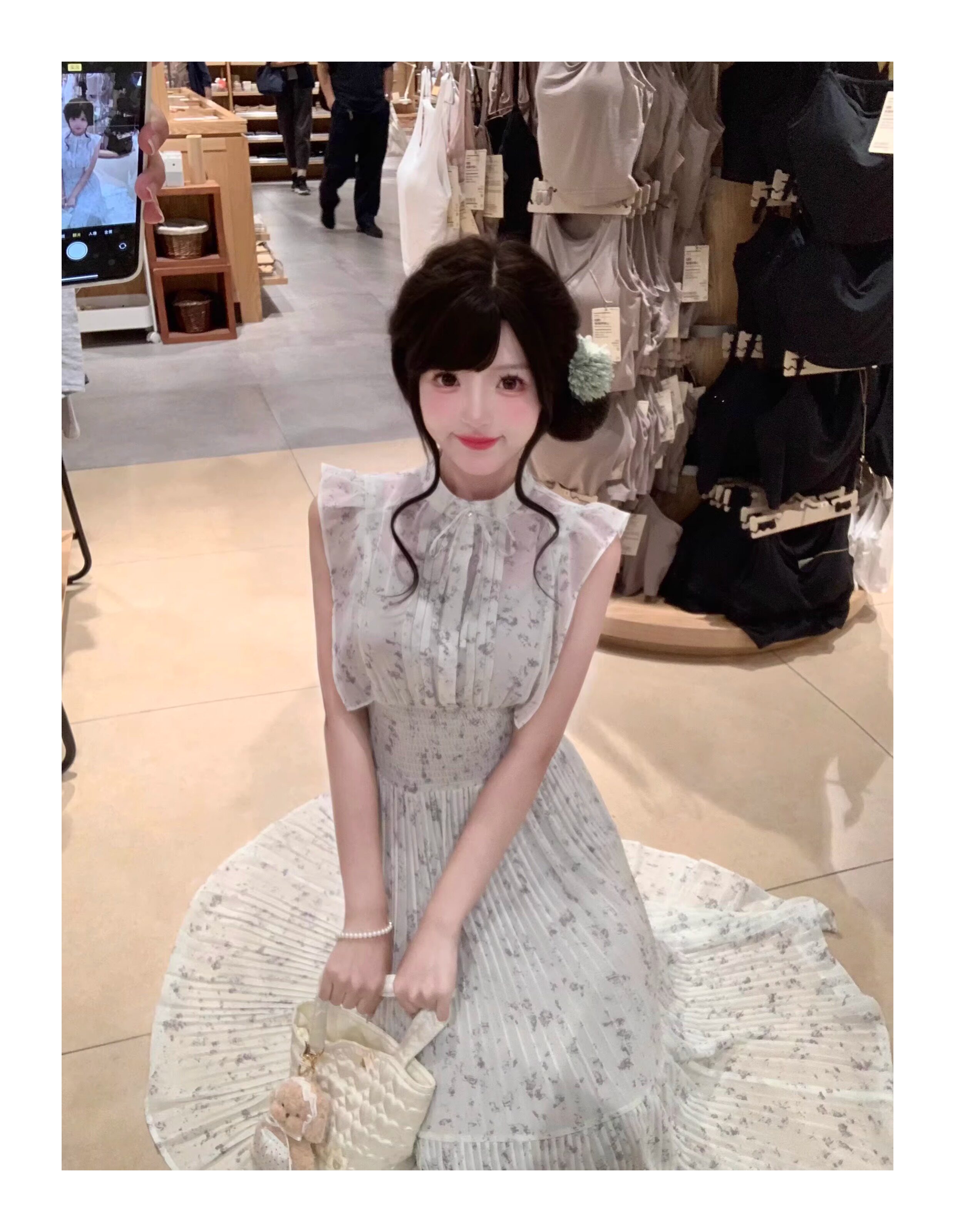 小泡芙日系春夏款女裝時尚甜美小飛袖印花百褶收腰無袖長款連衣裙