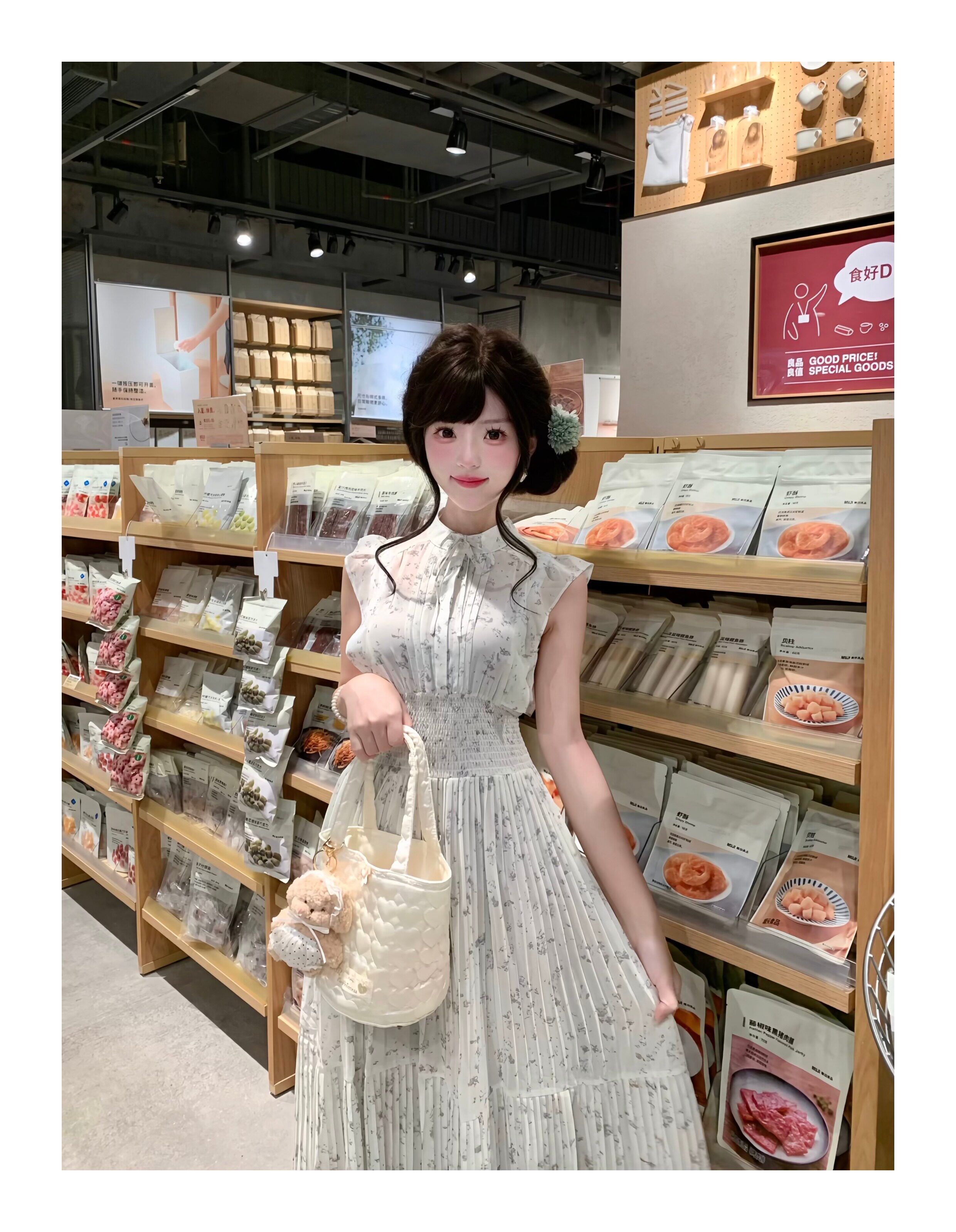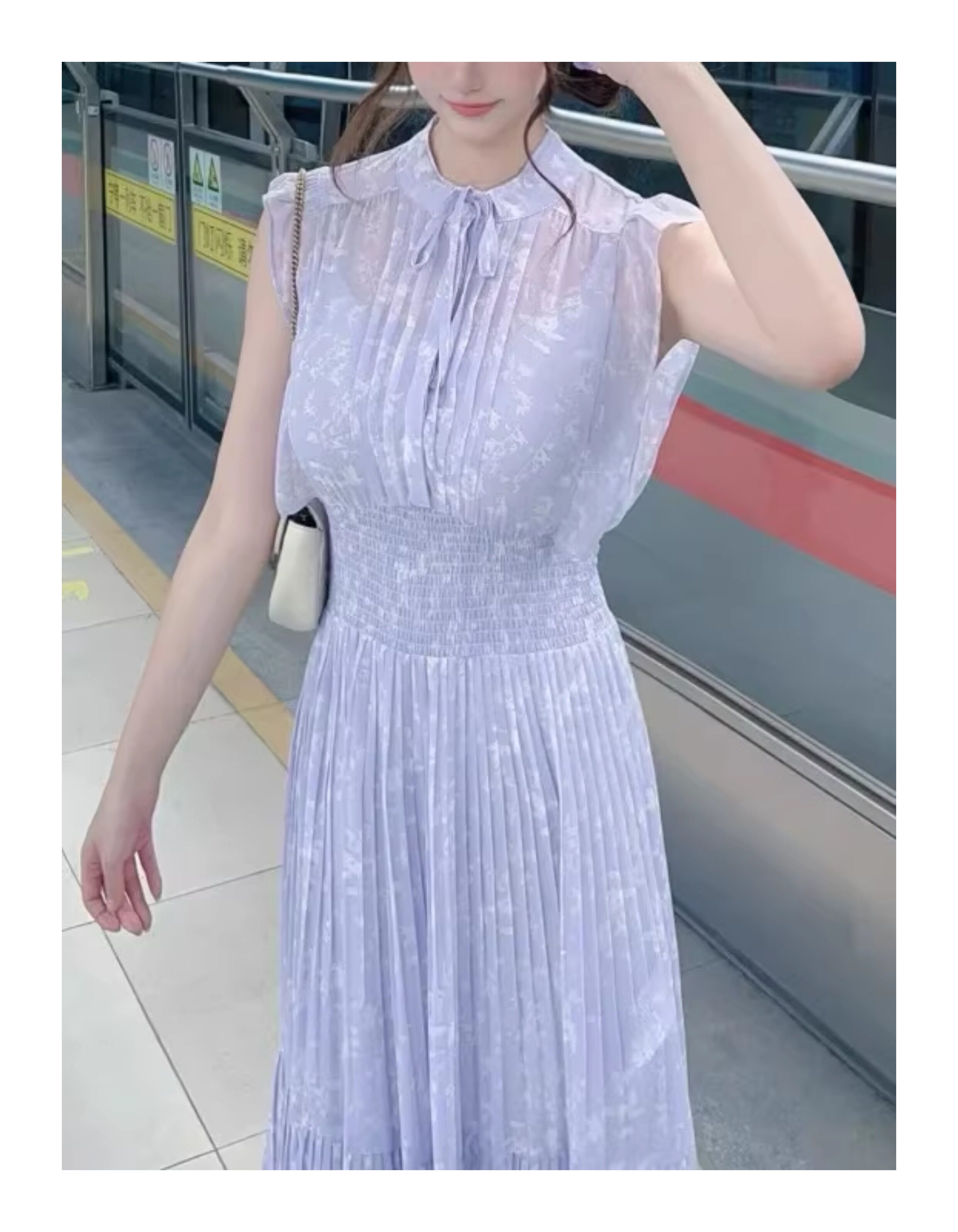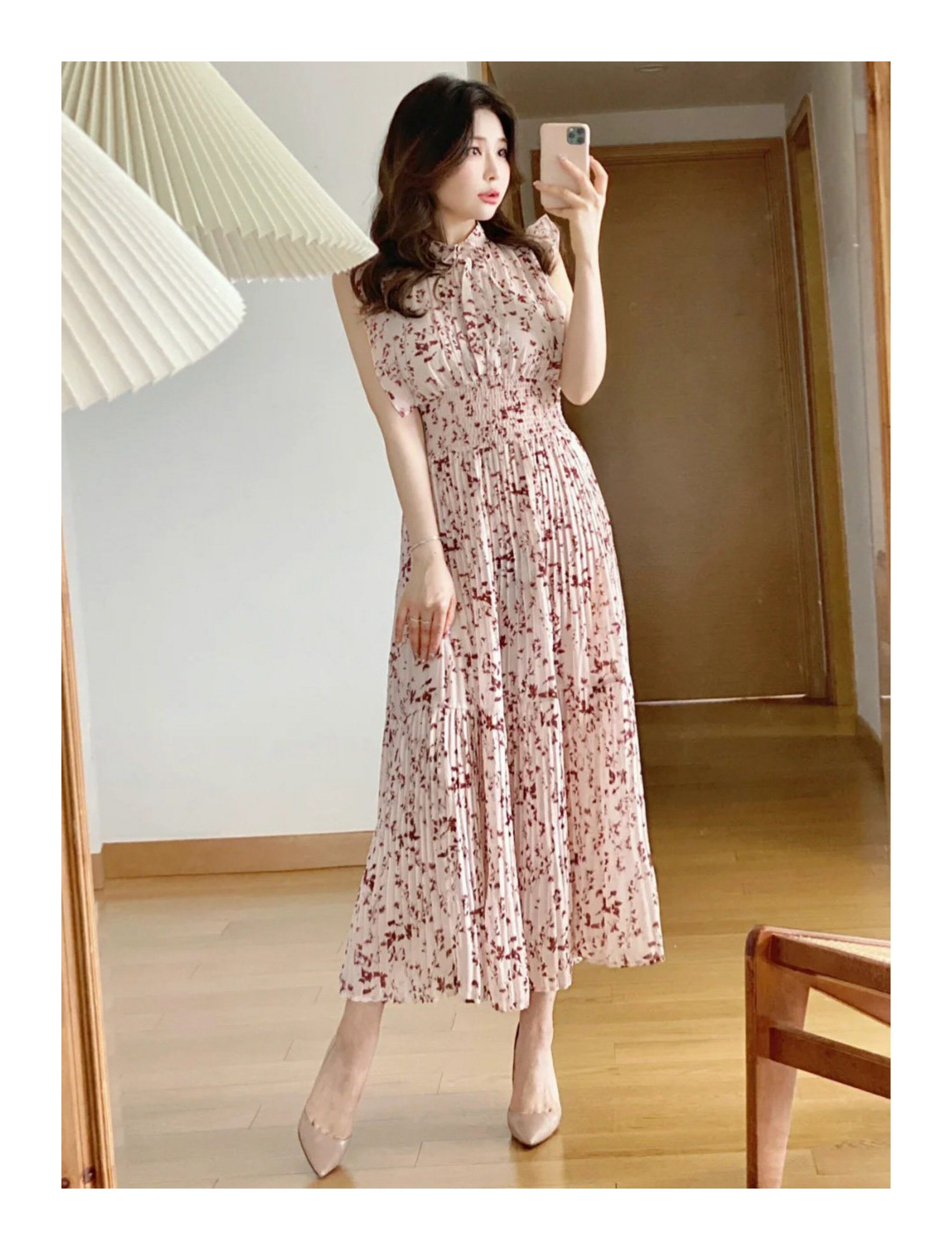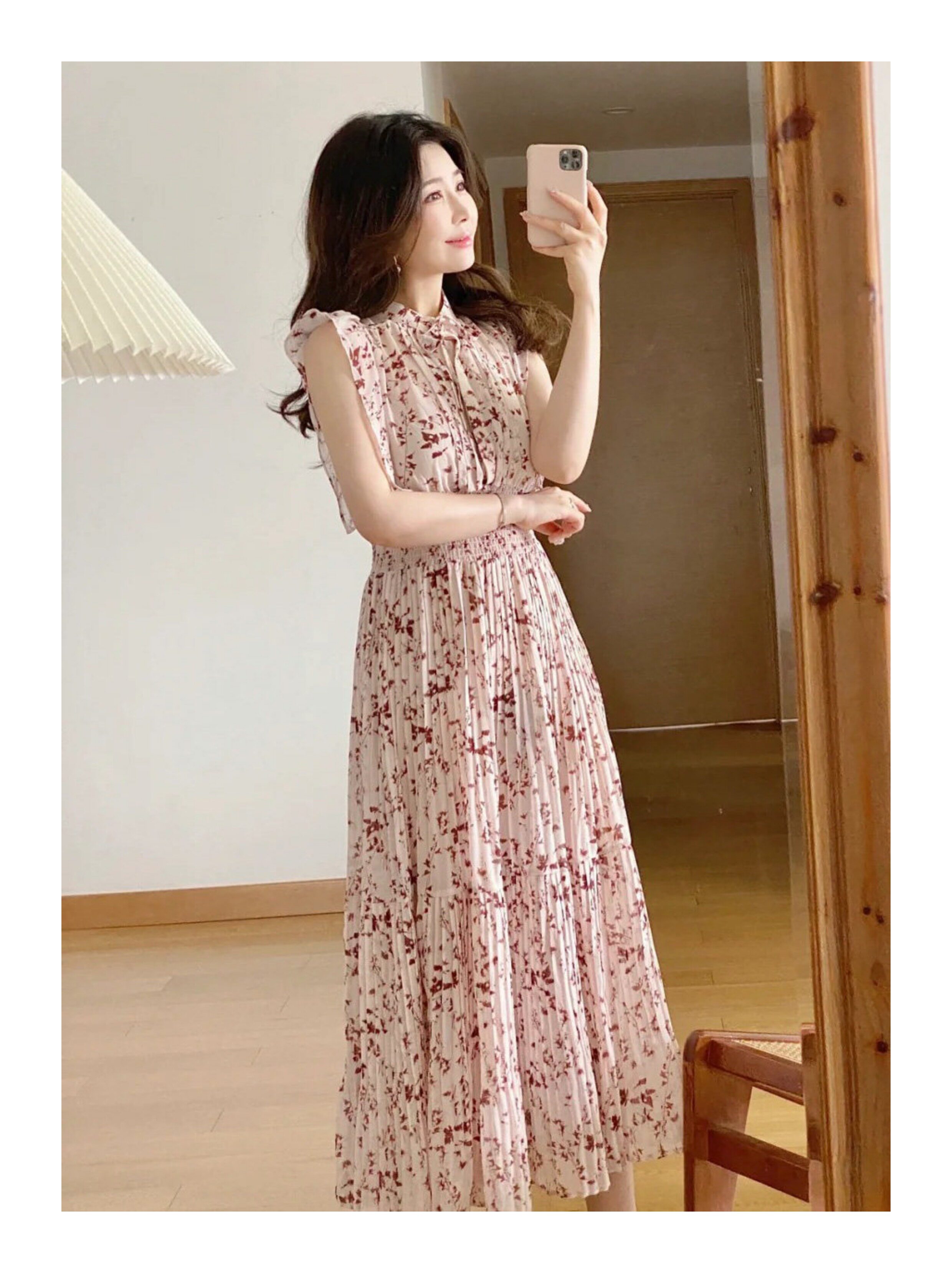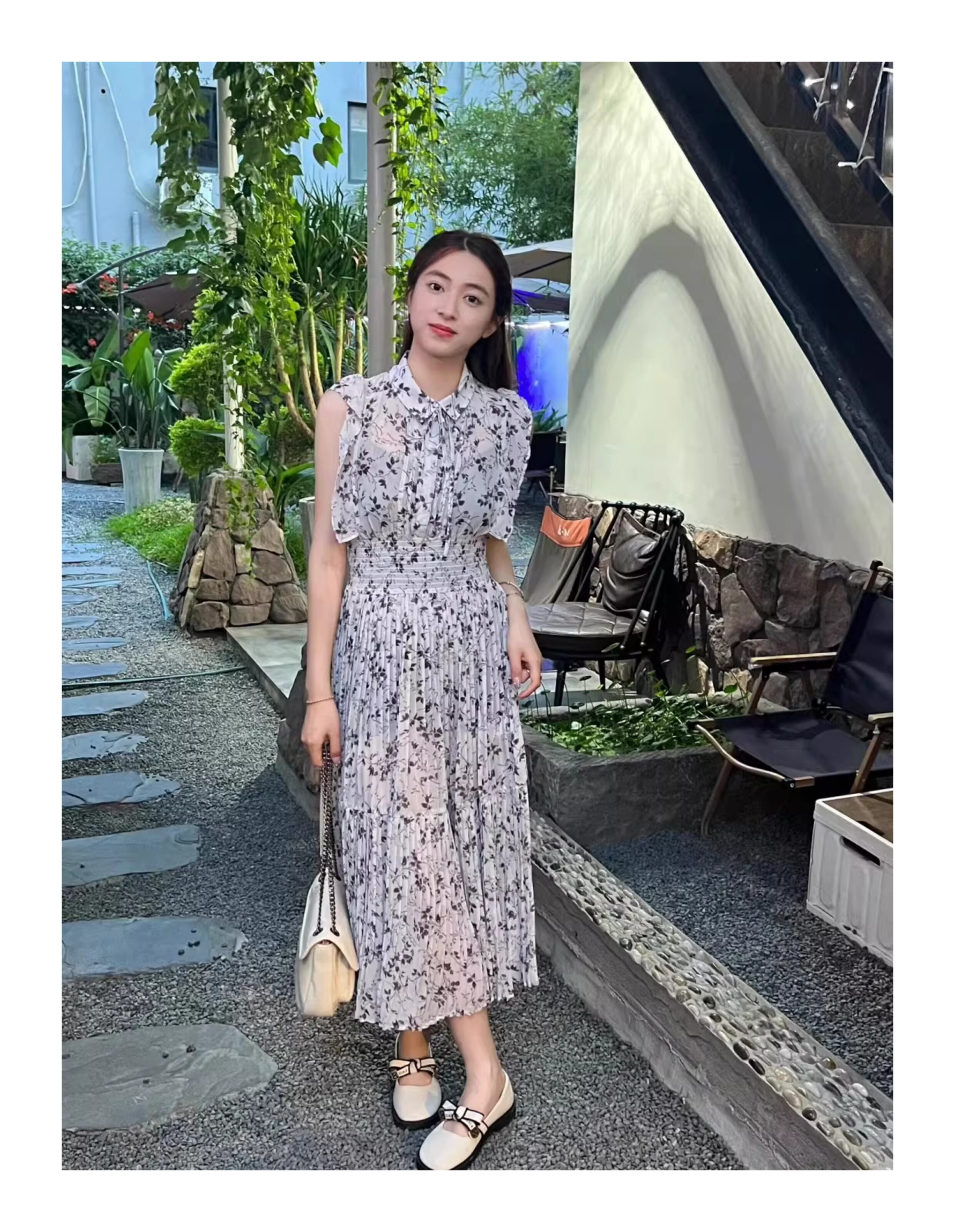 小泡芙日系春夏款女裝時尚甜美小飛袖印花百褶收腰無袖長款連衣裙
