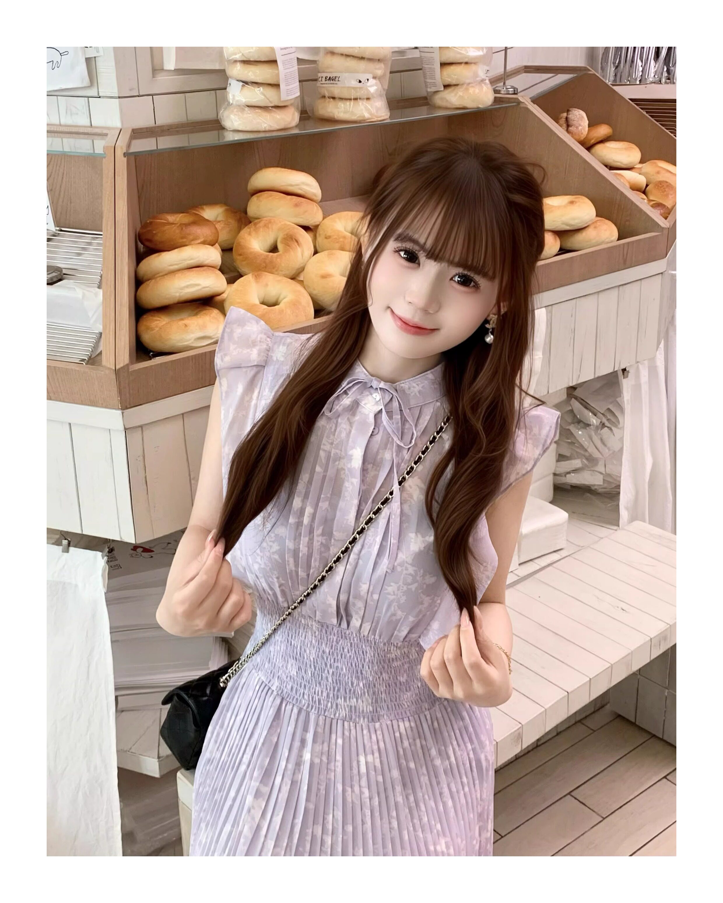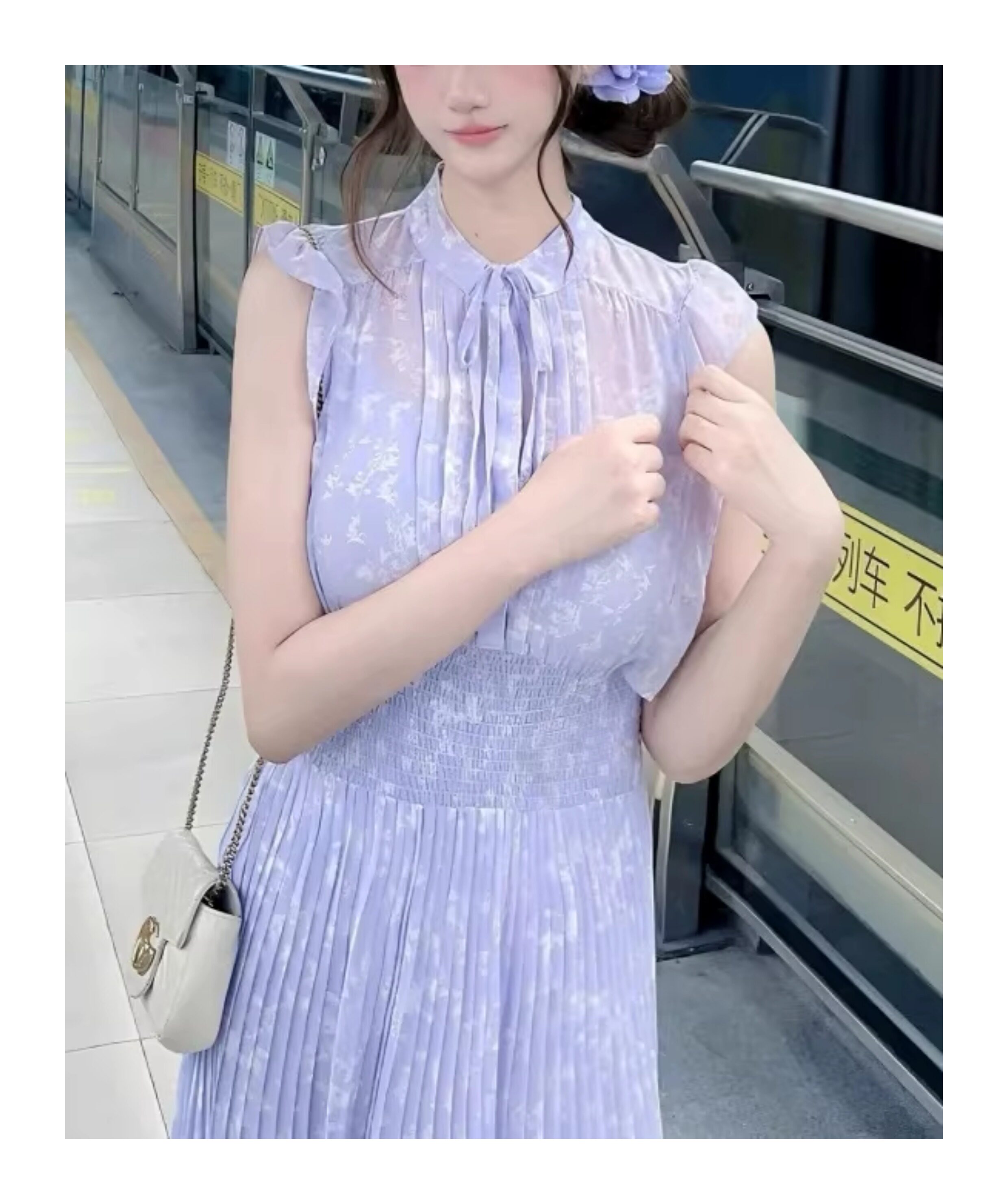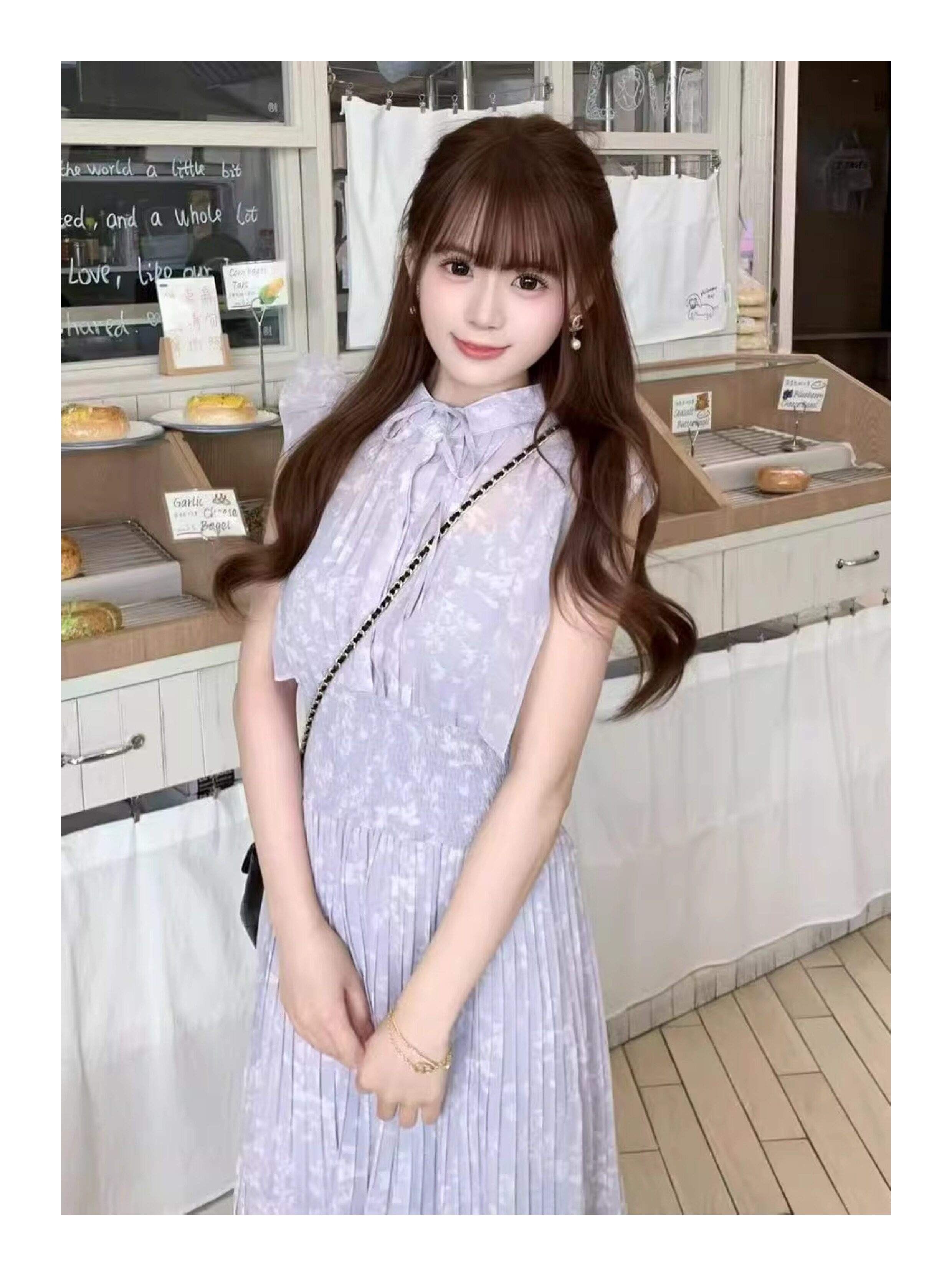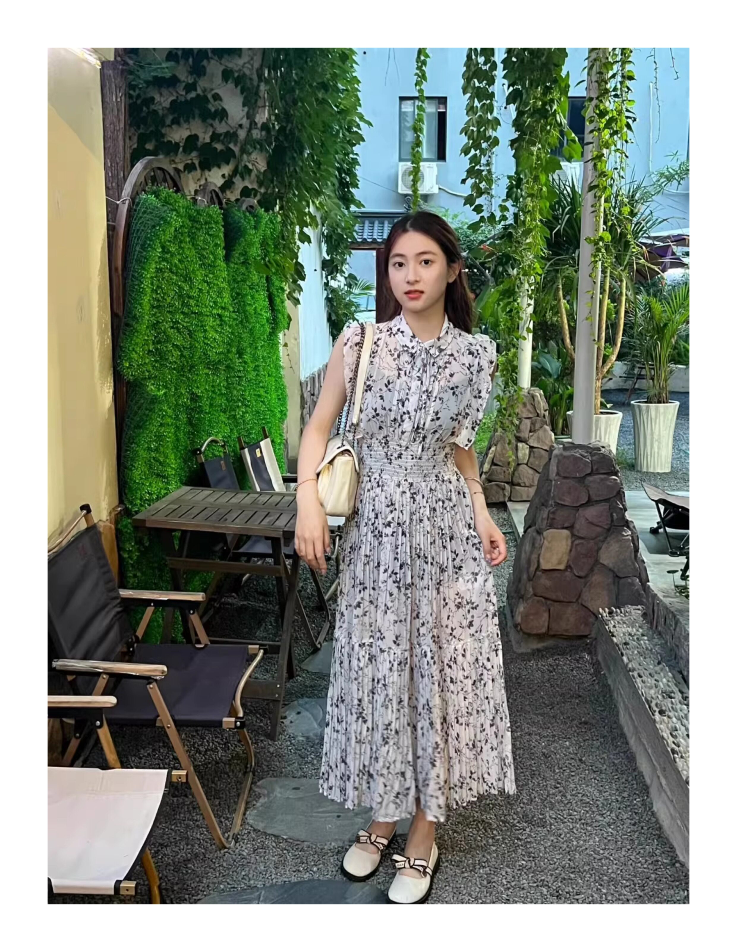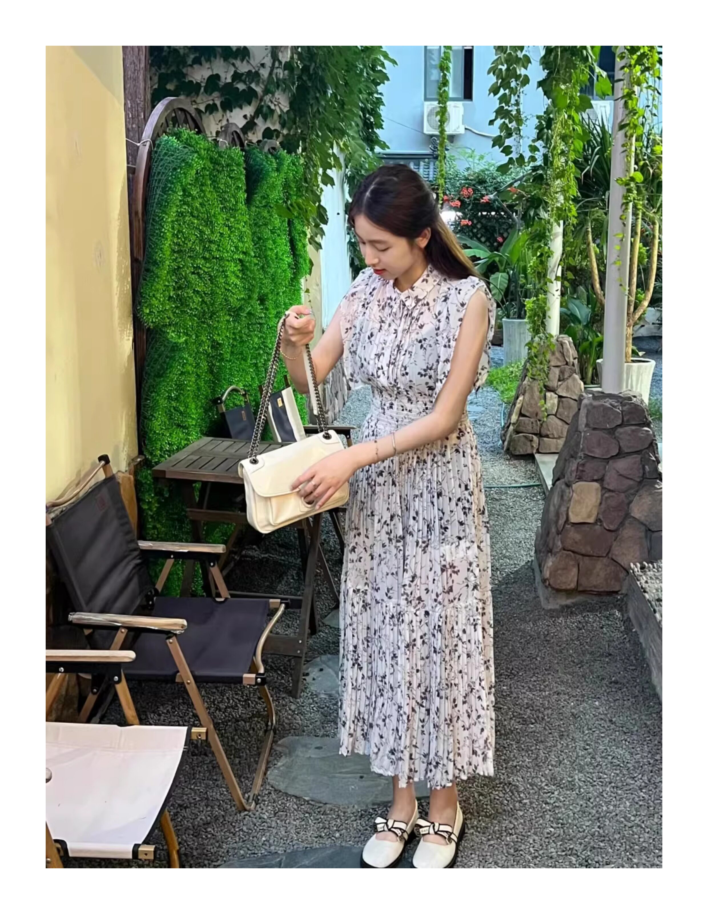 小泡芙日系春夏款女裝時尚甜美小飛袖印花百褶收腰無袖長款連衣裙