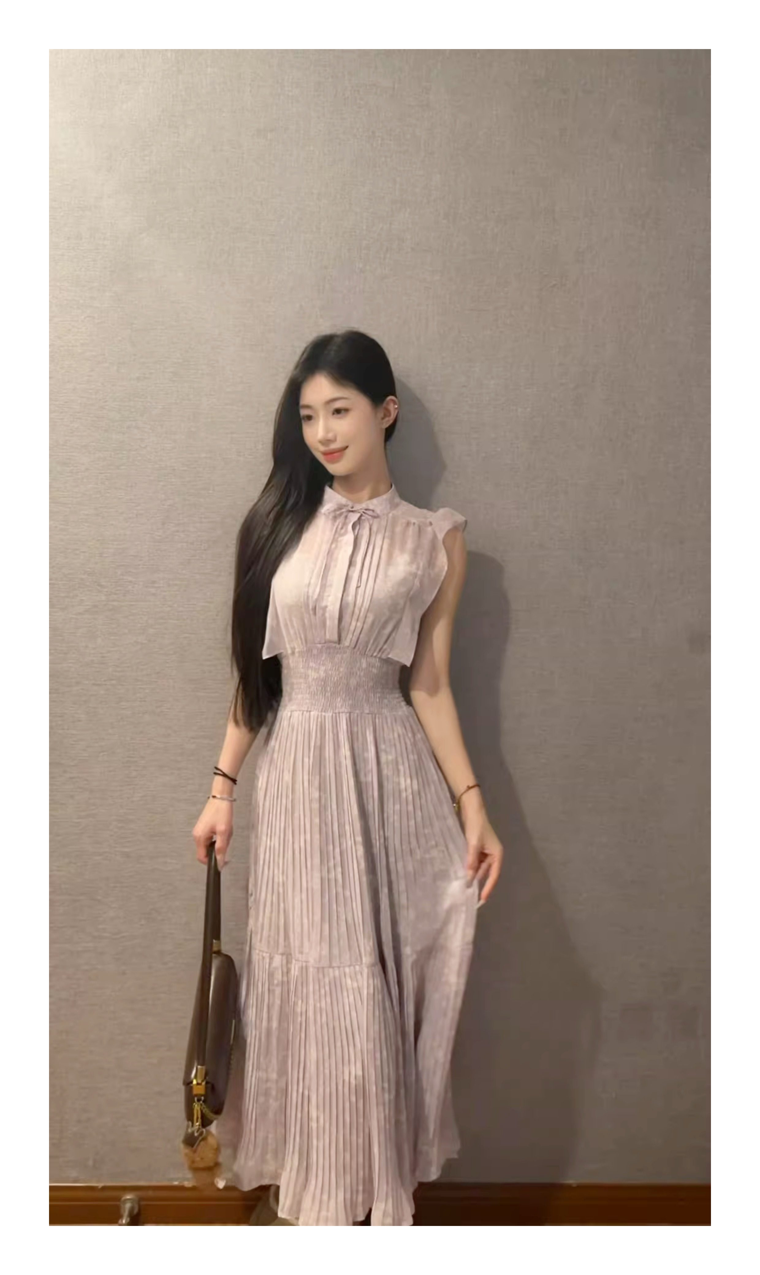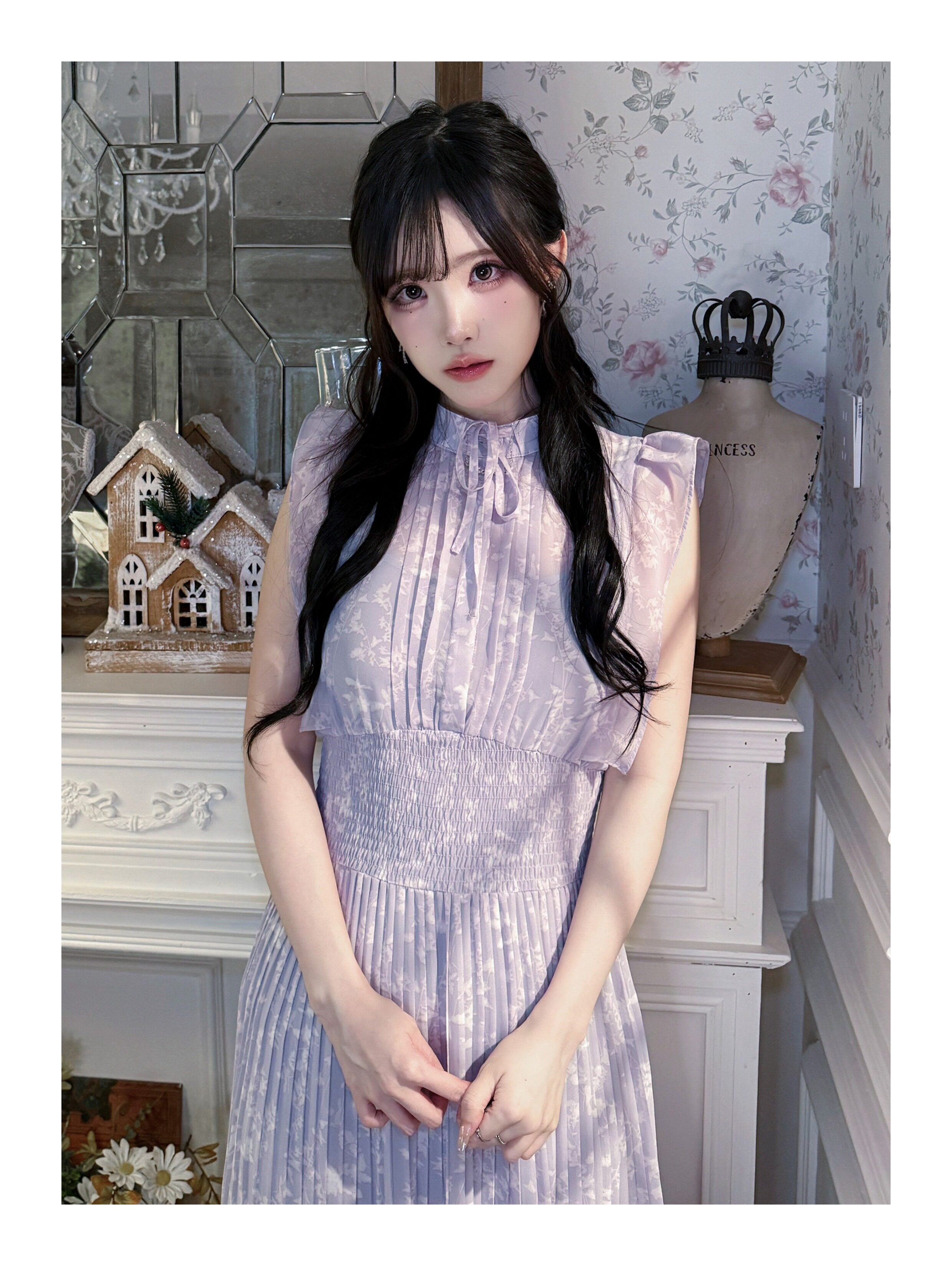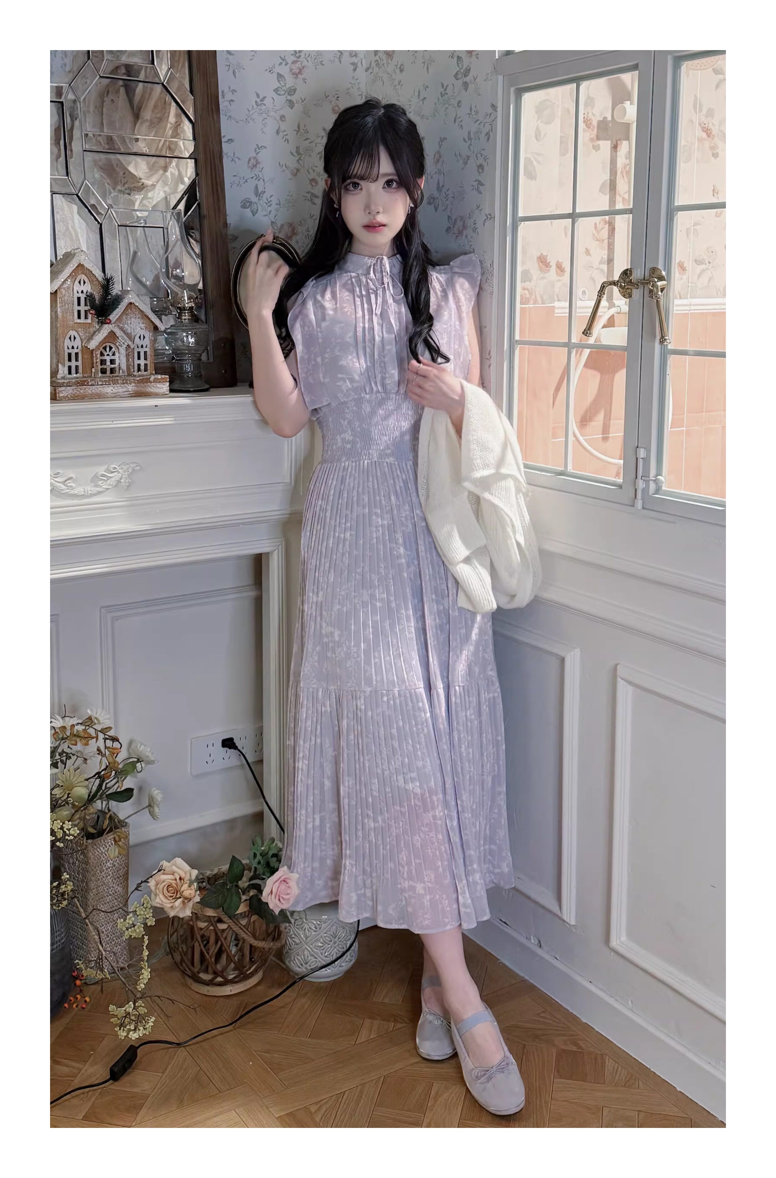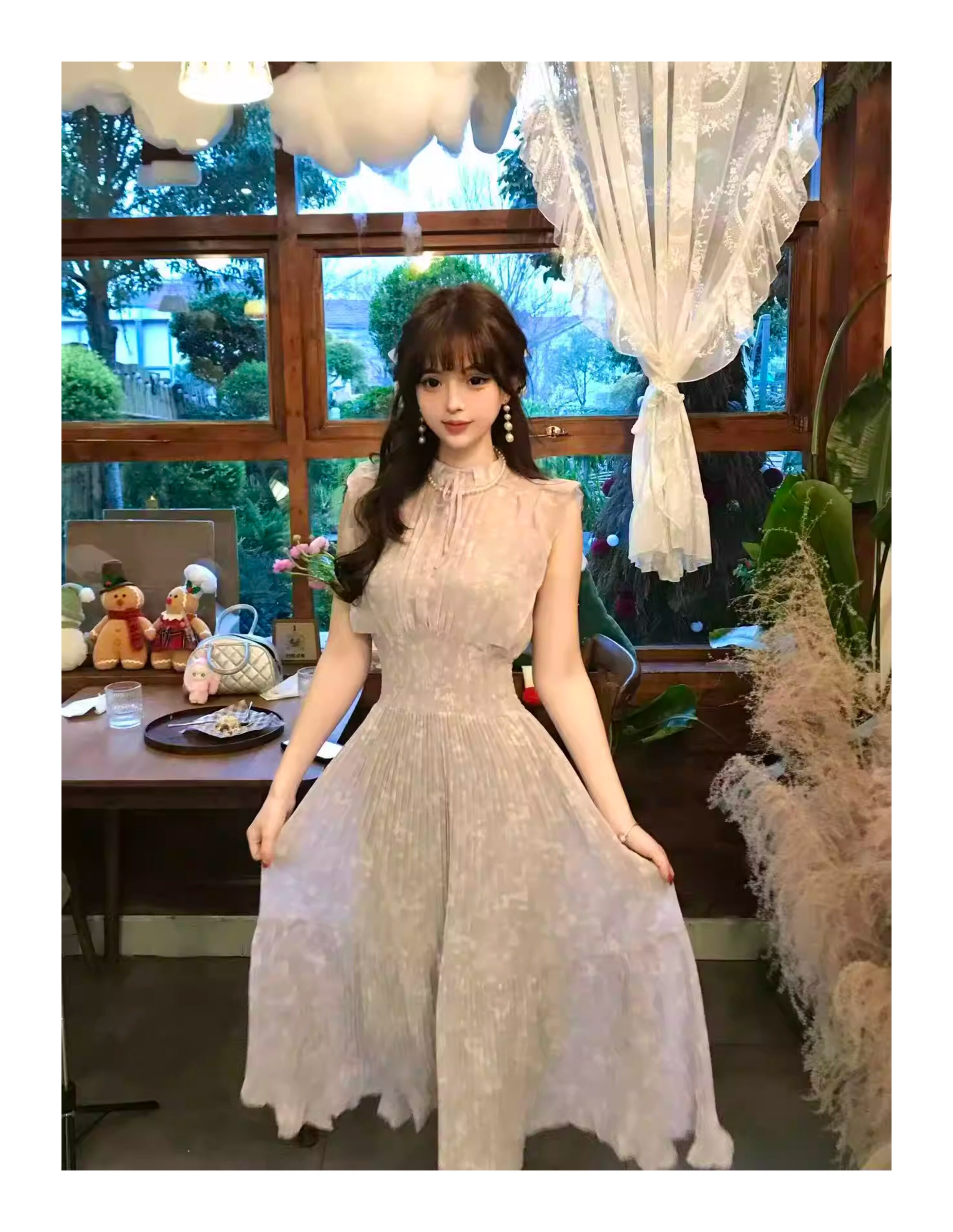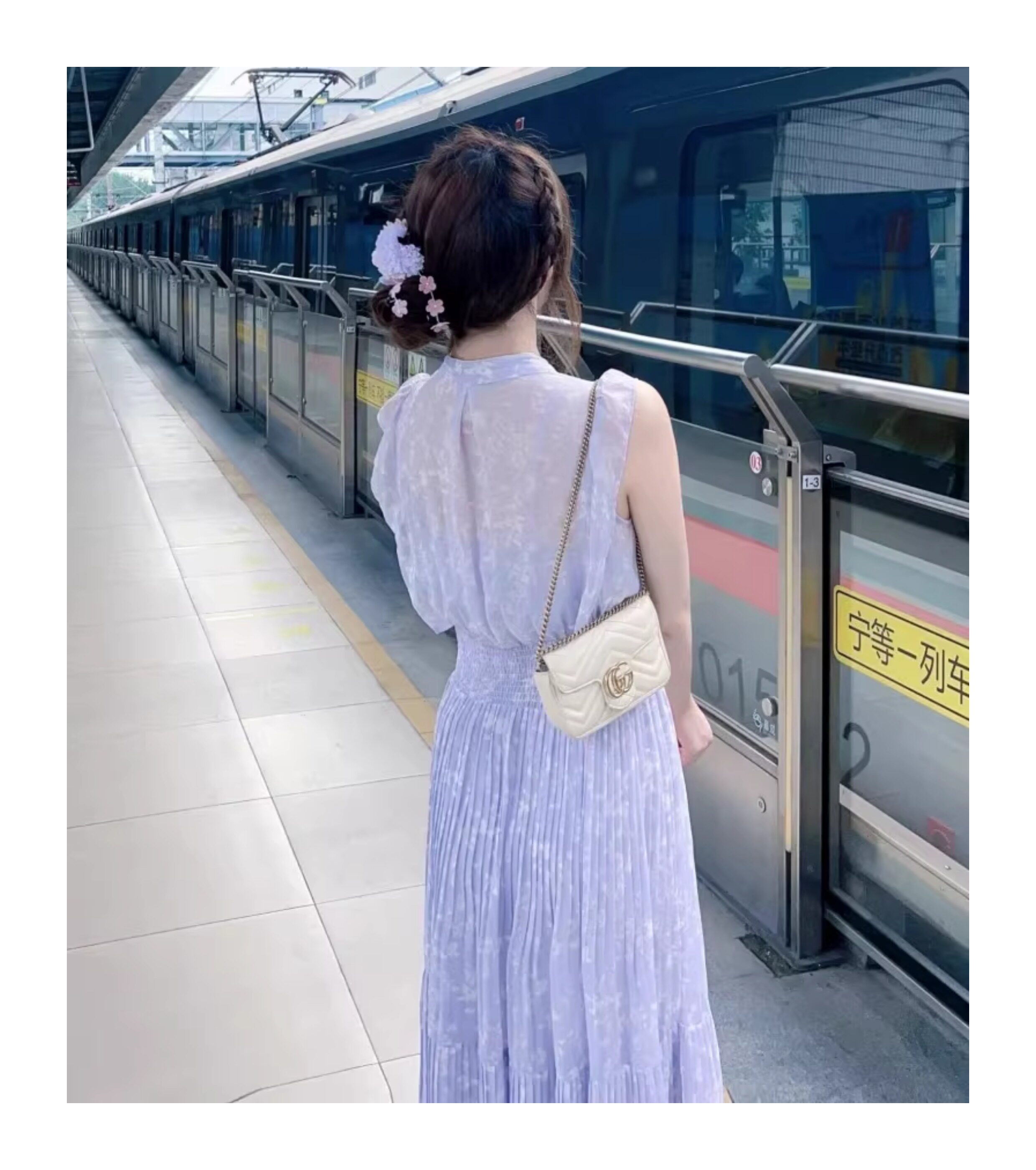 小泡芙日系春夏款女裝時尚甜美小飛袖印花百褶收腰無袖長款連衣裙