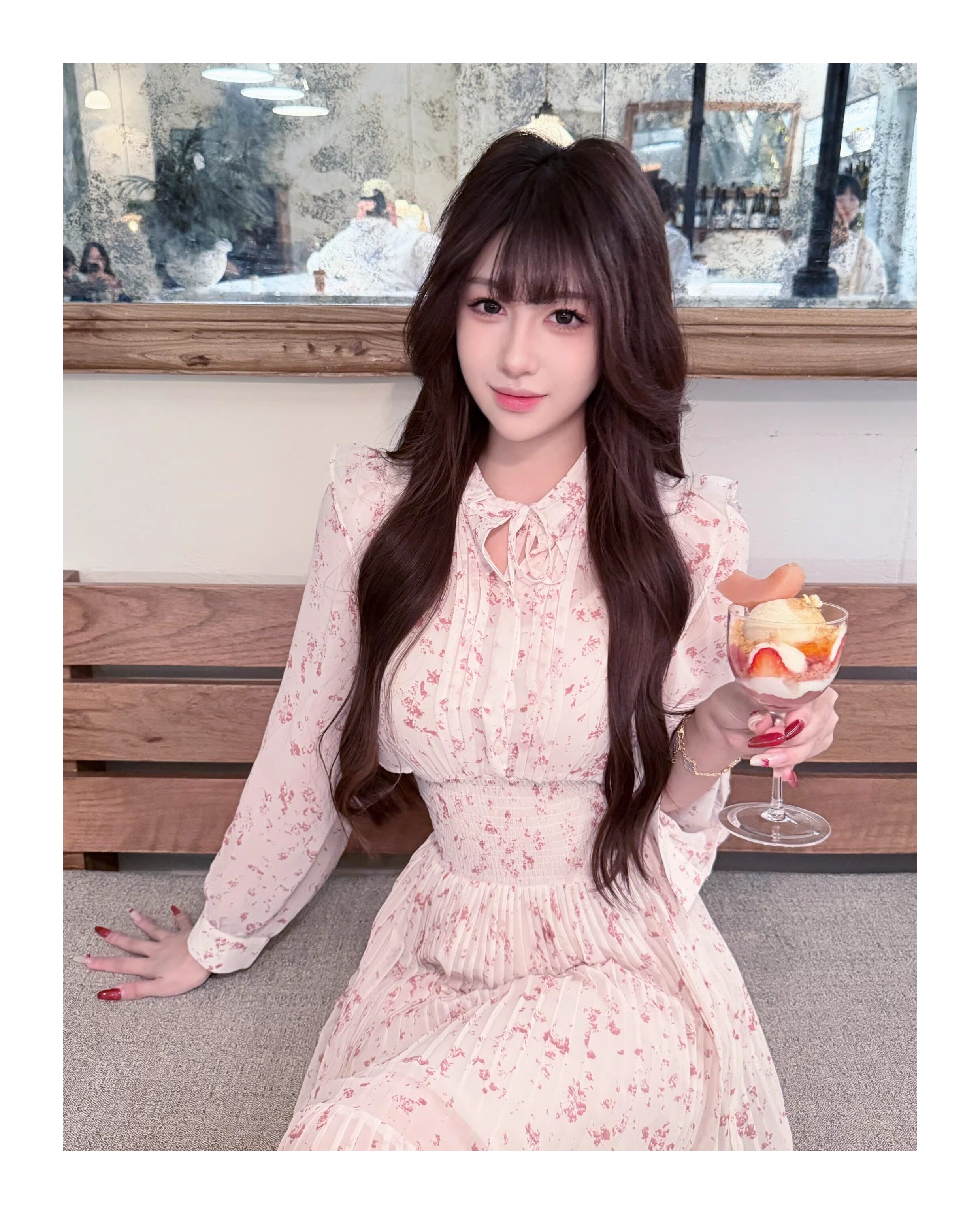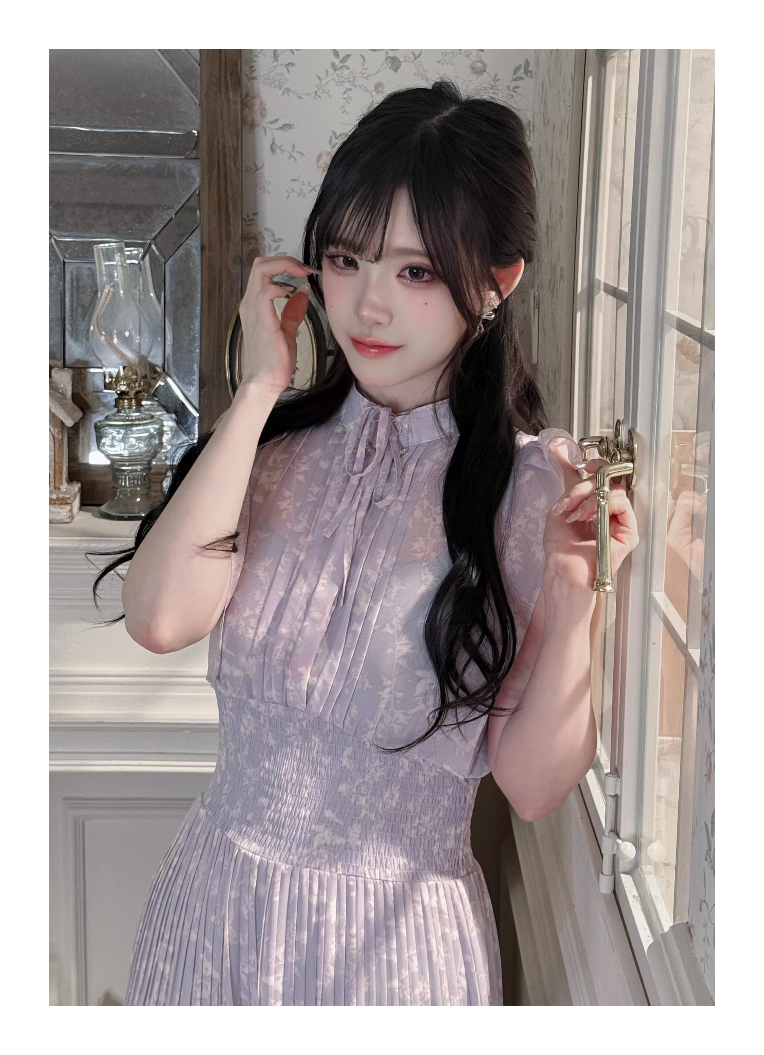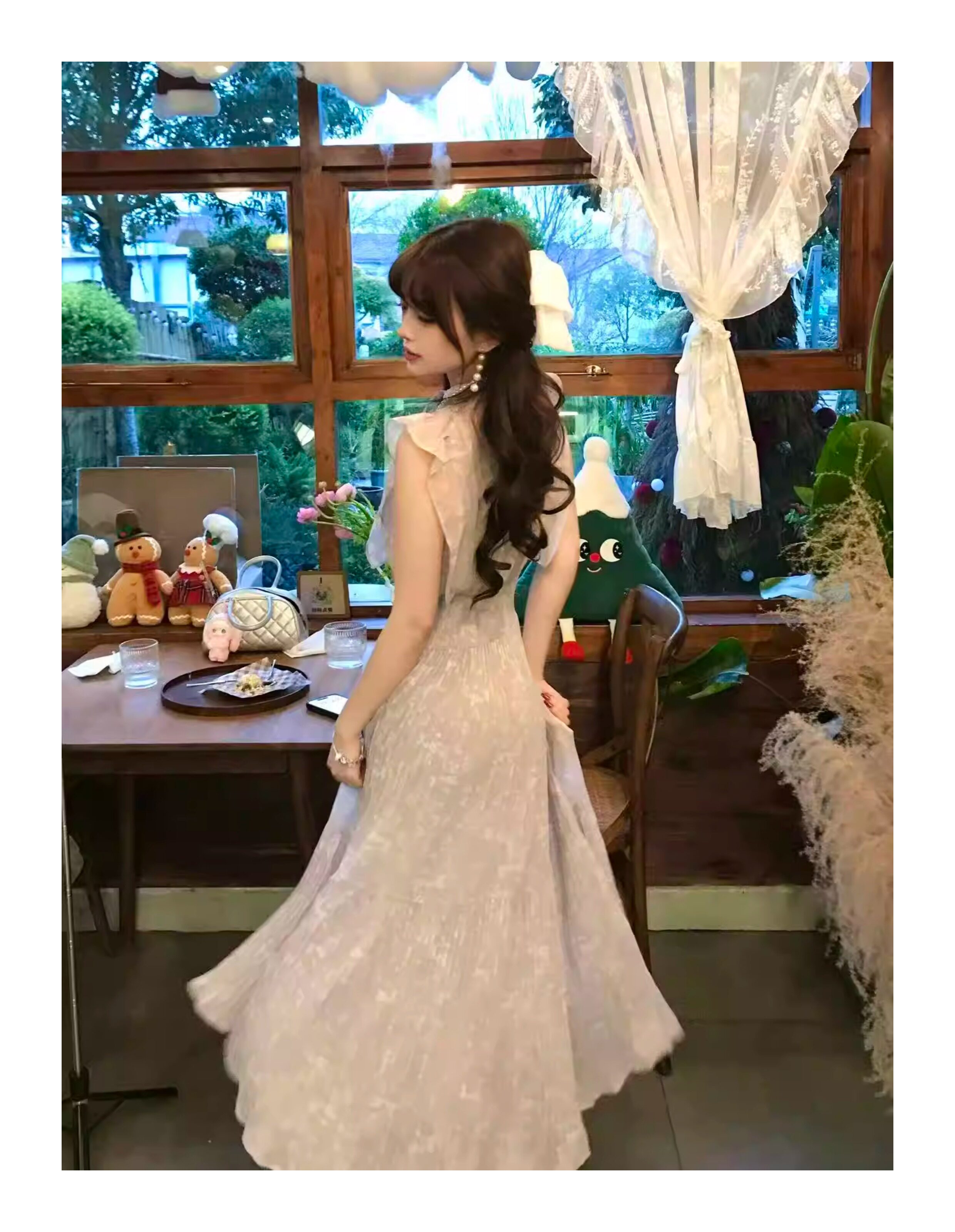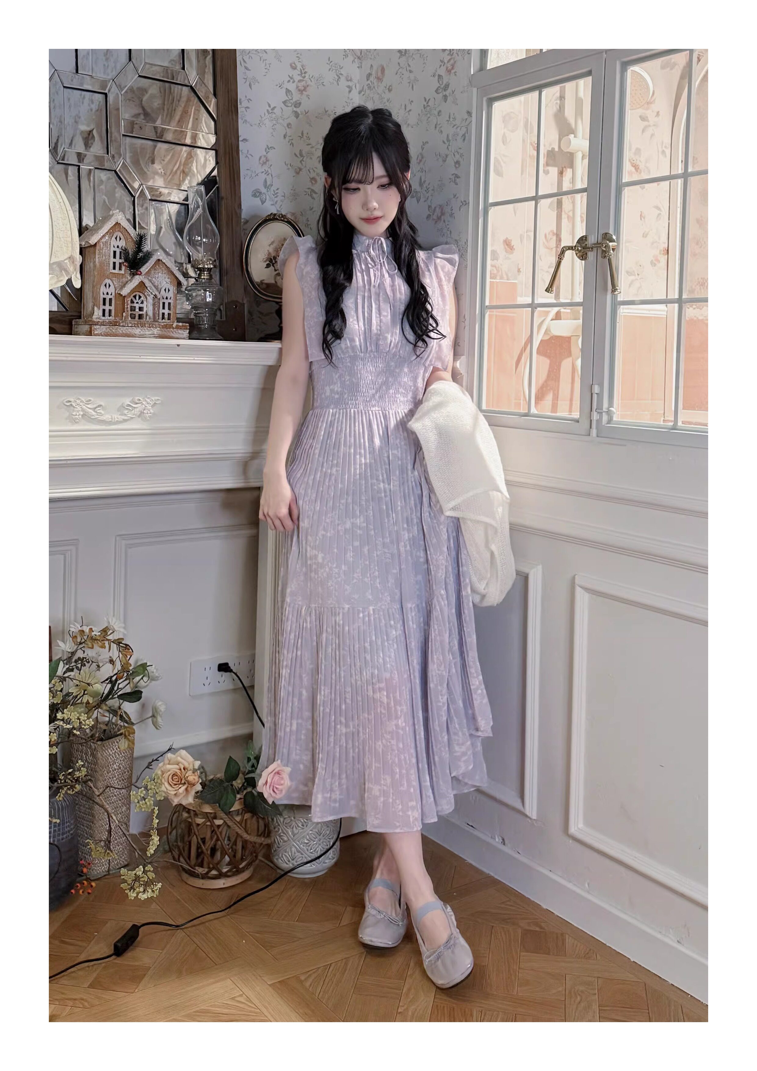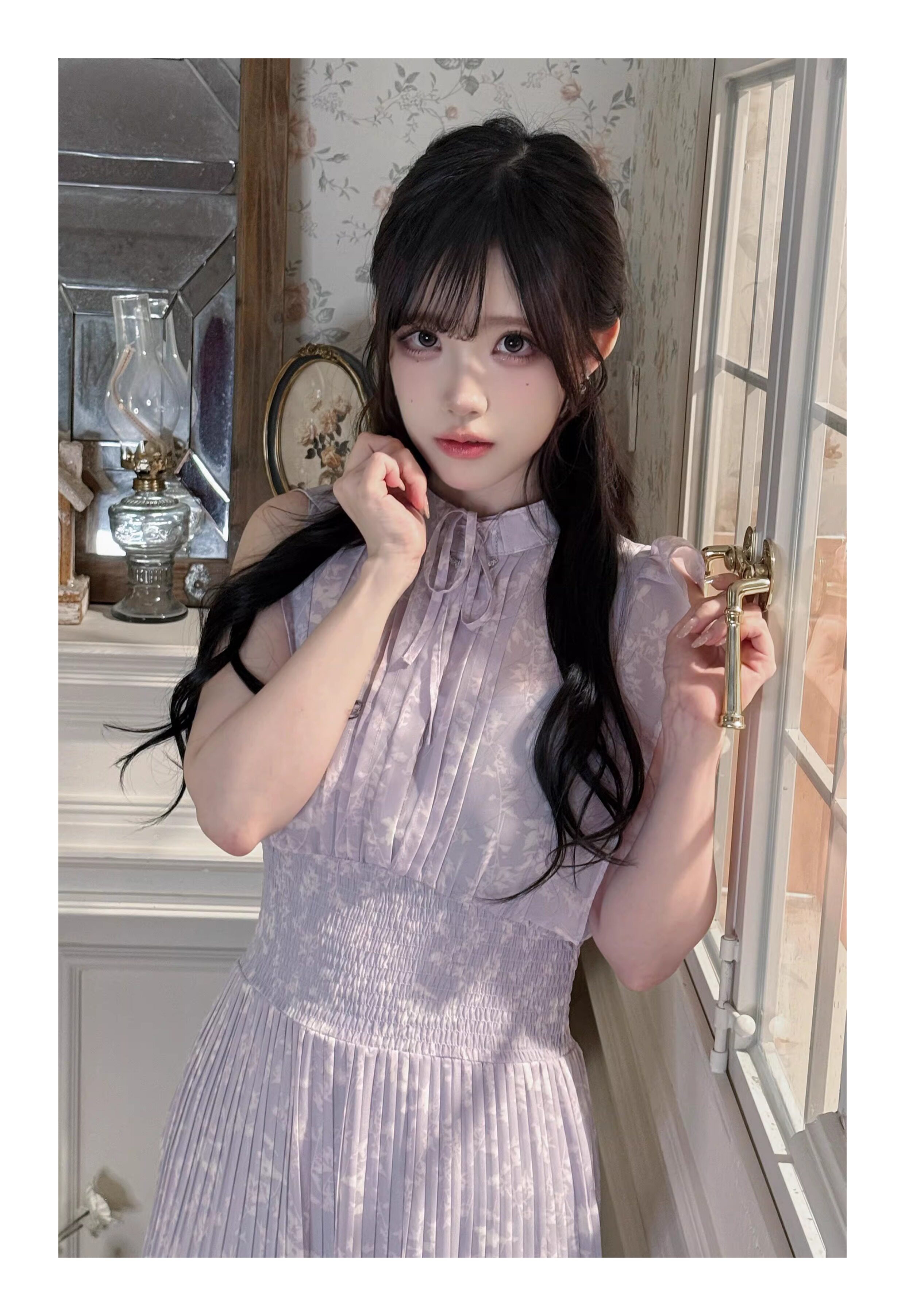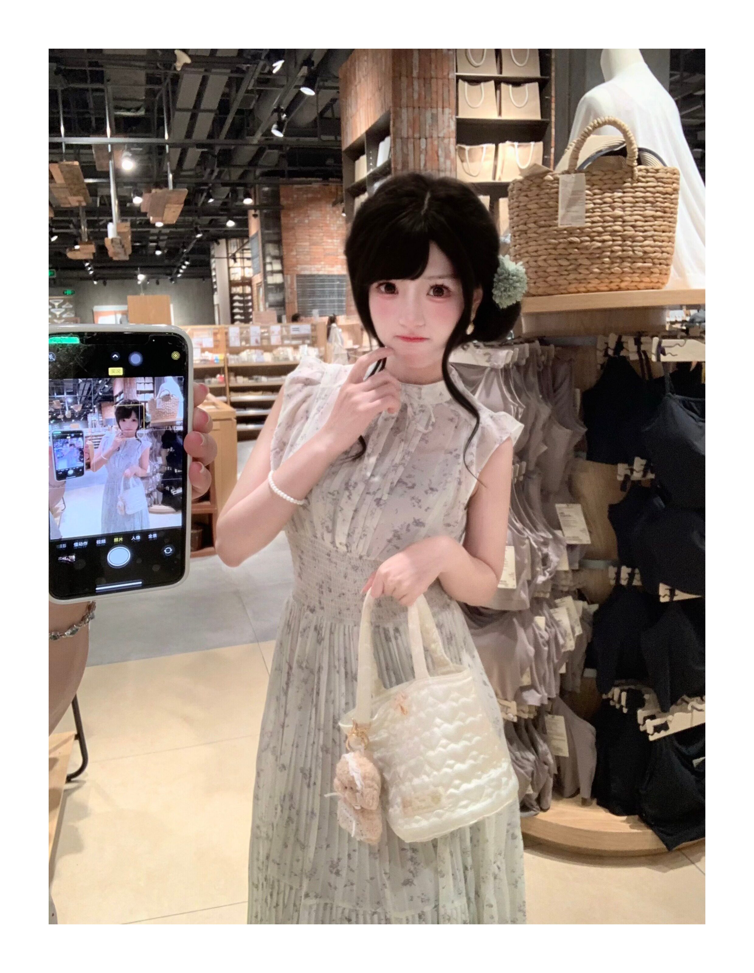 小泡芙日系春夏款女裝時尚甜美小飛袖印花百褶收腰無袖長款連衣裙
