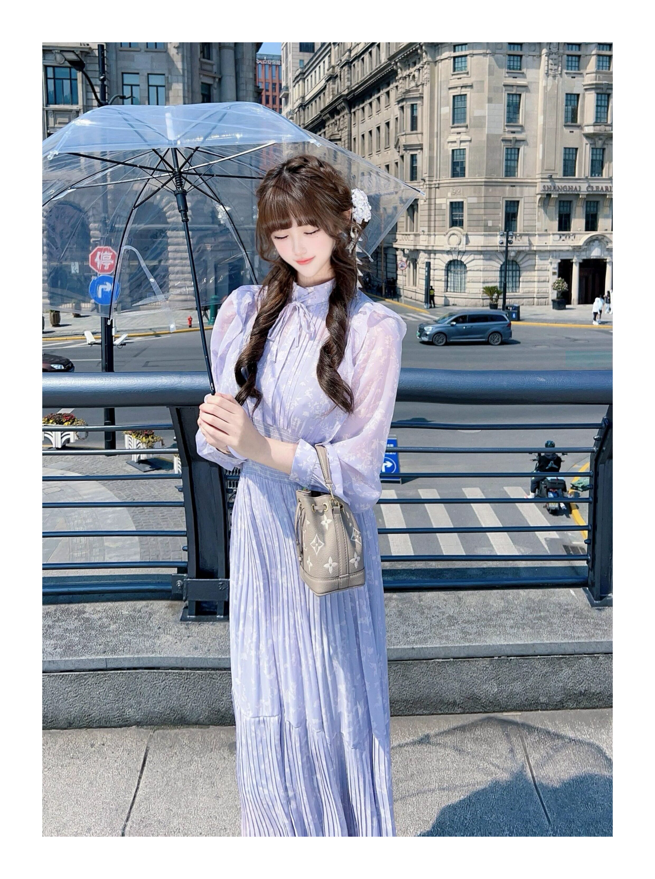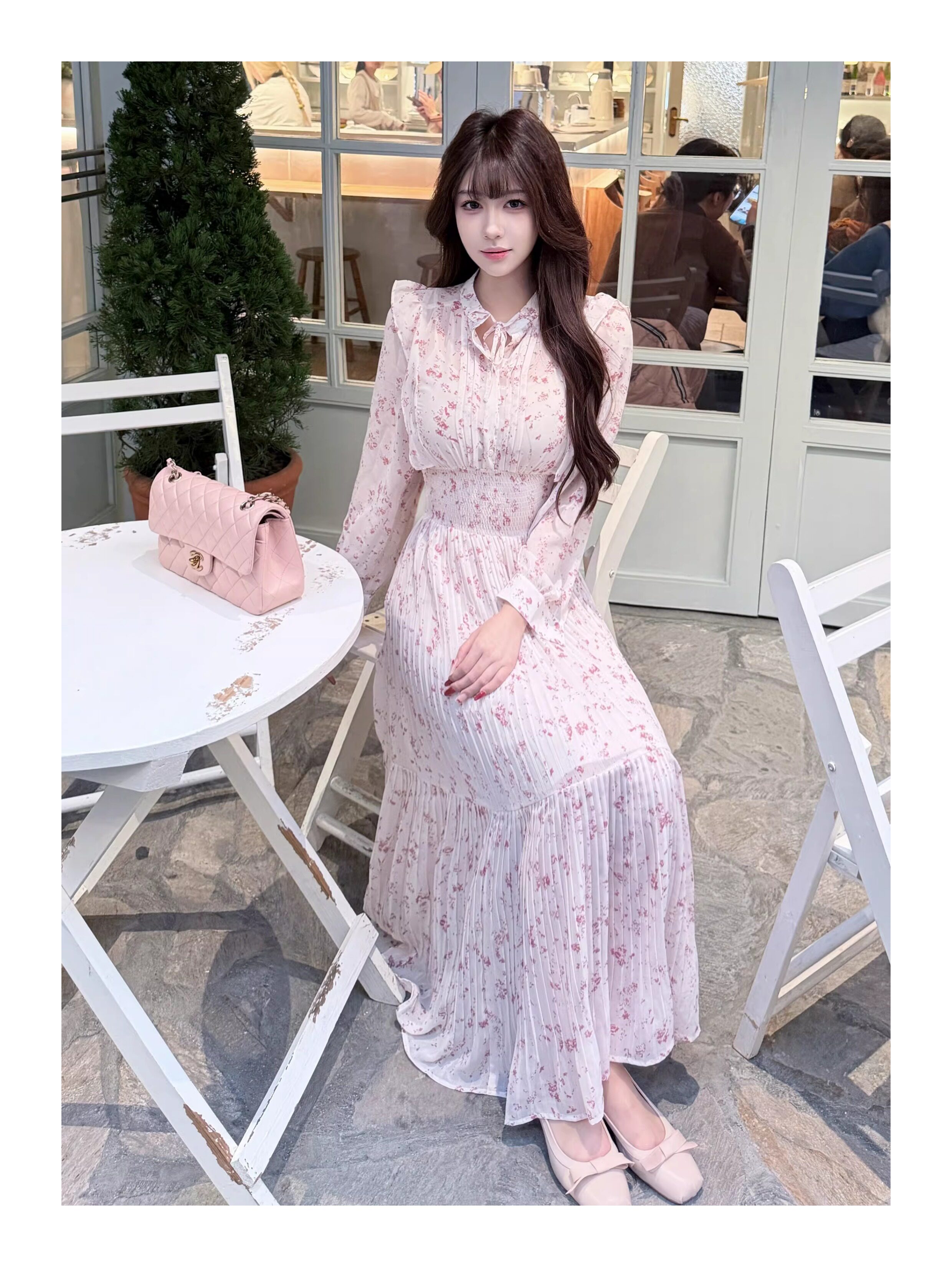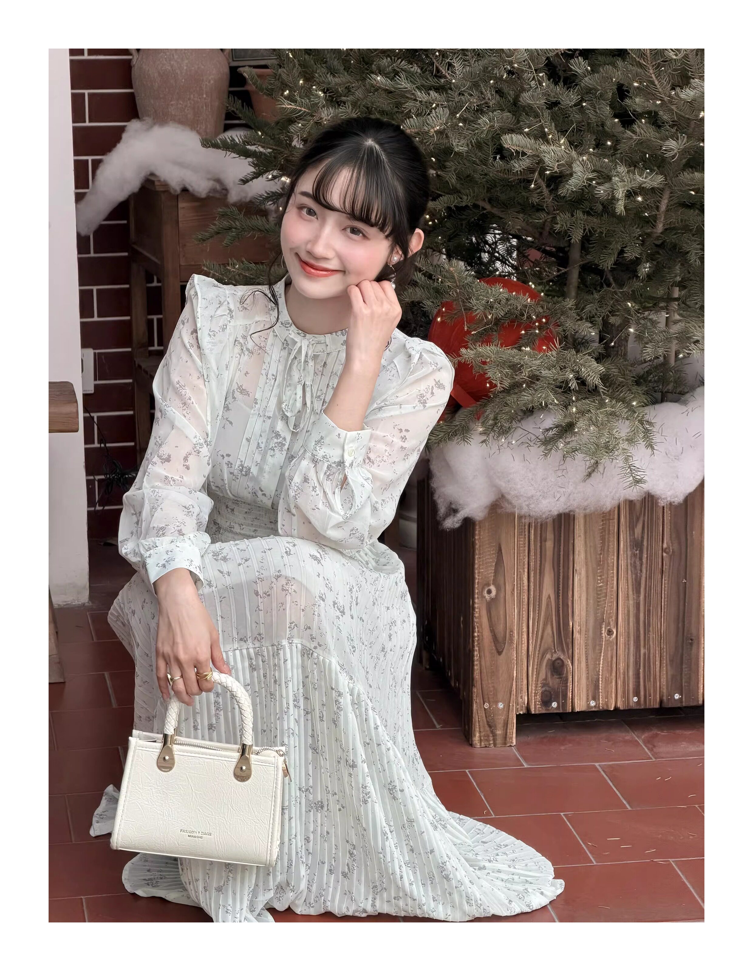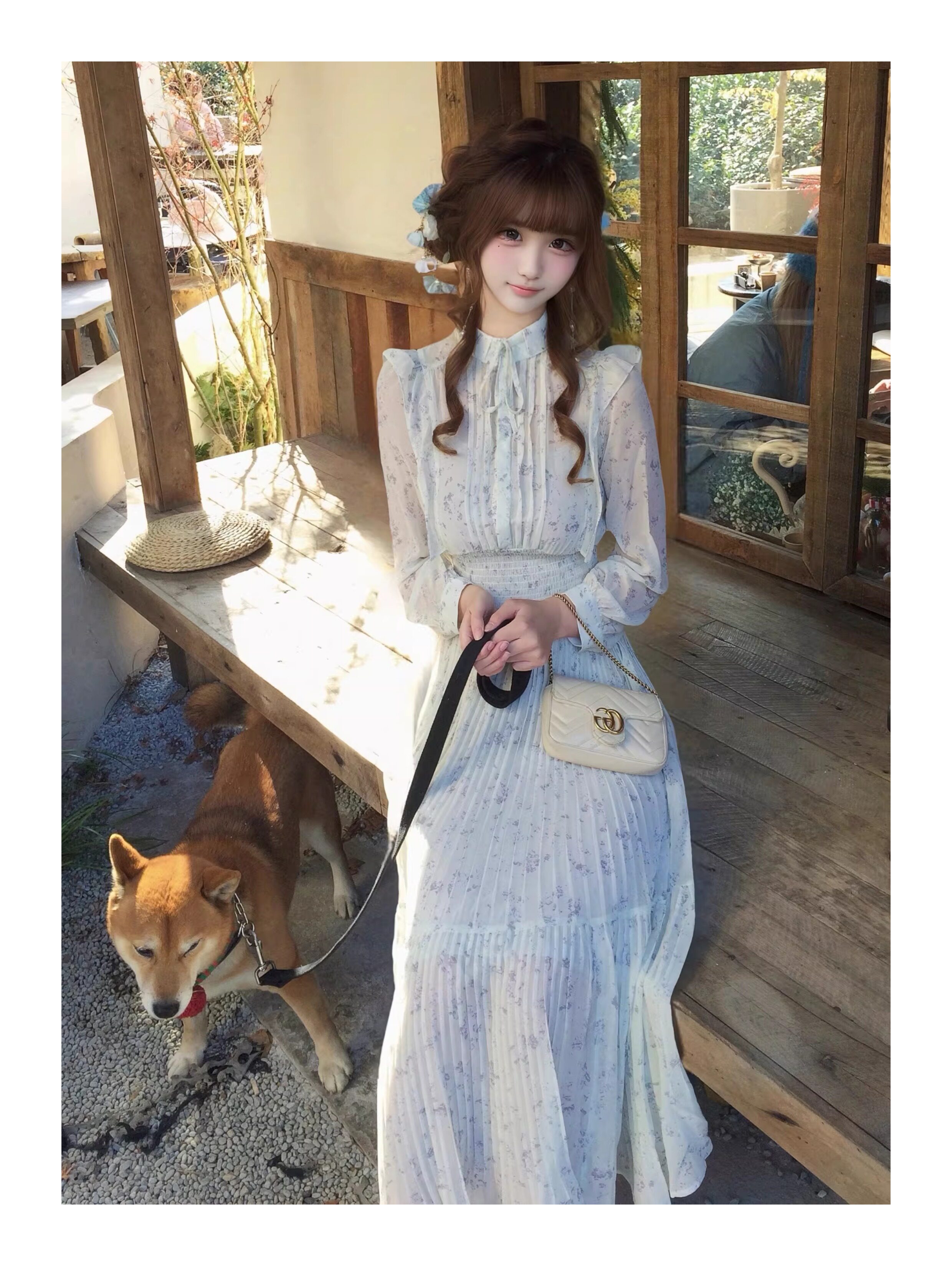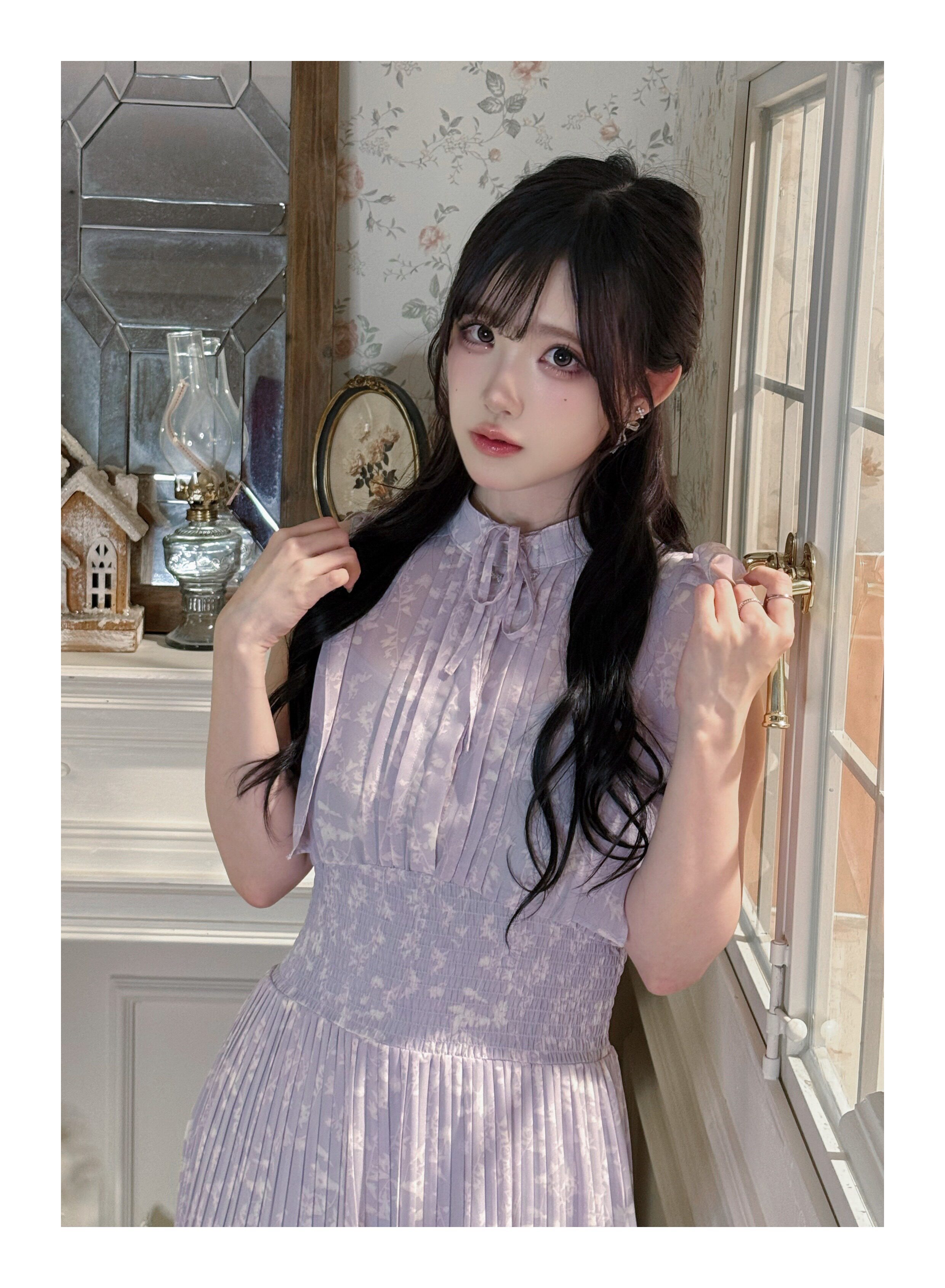 小泡芙日系春夏款女裝時尚甜美小飛袖印花百褶收腰無袖長款連衣裙