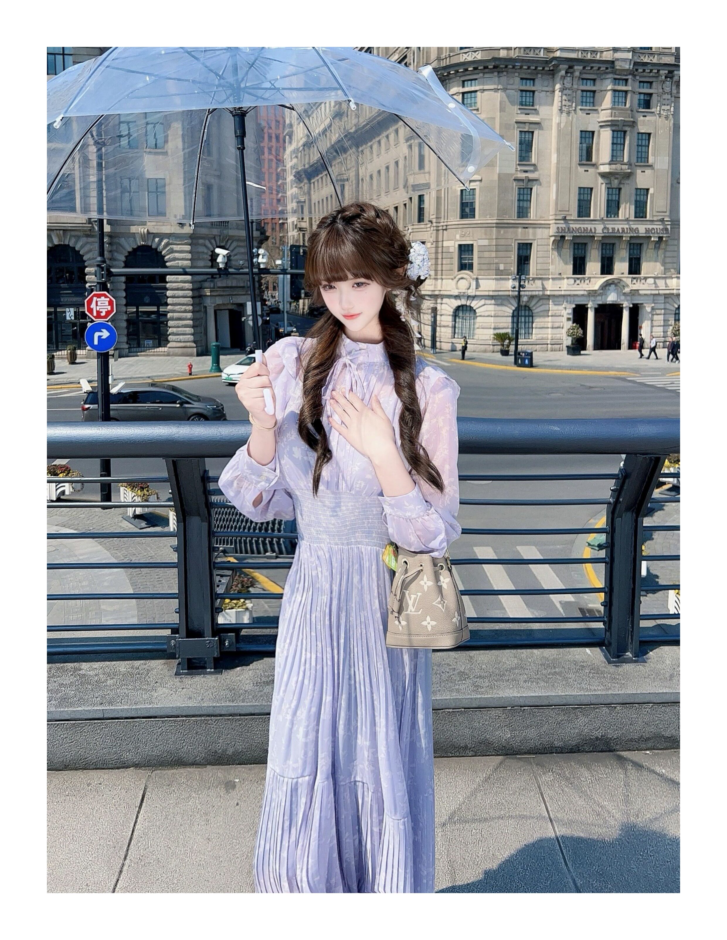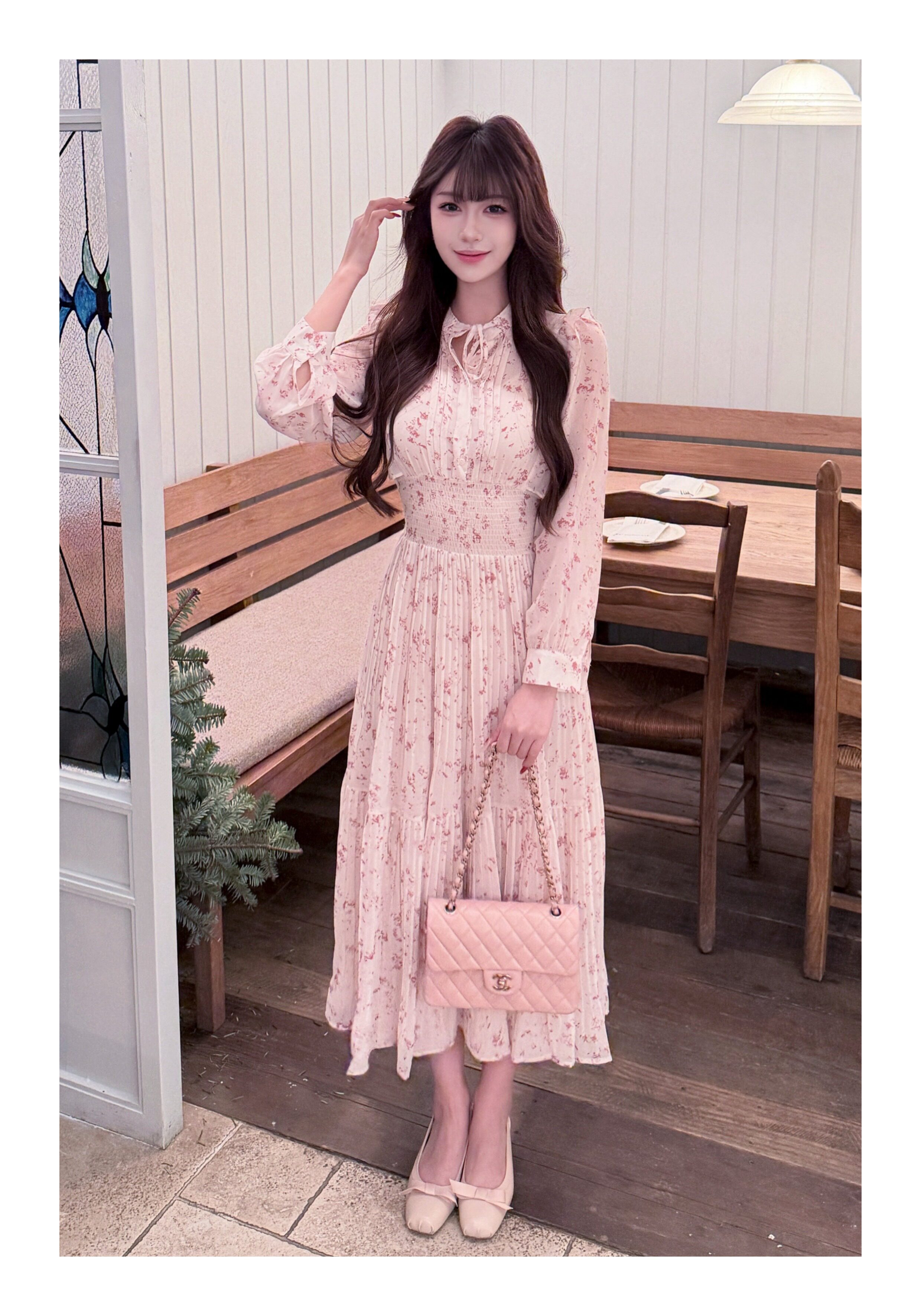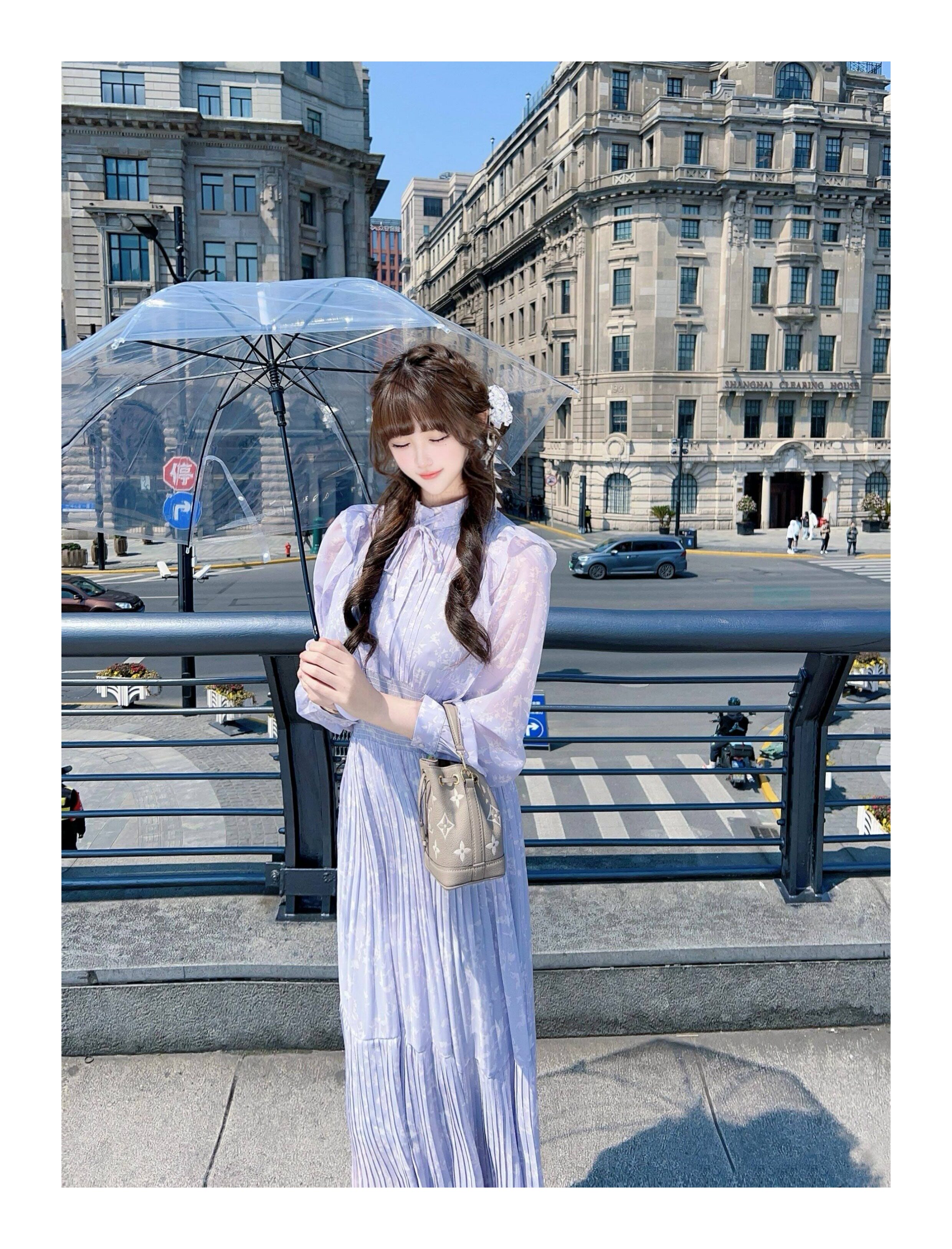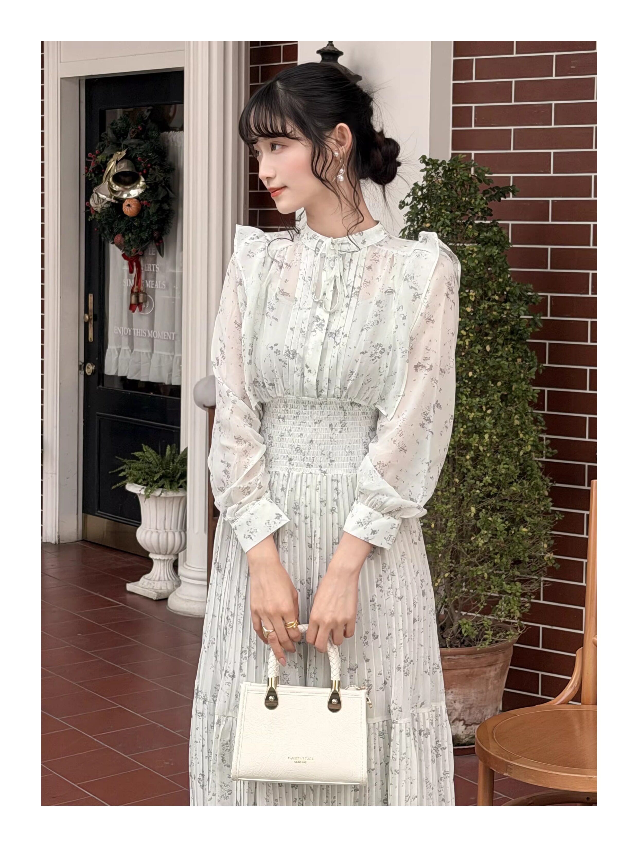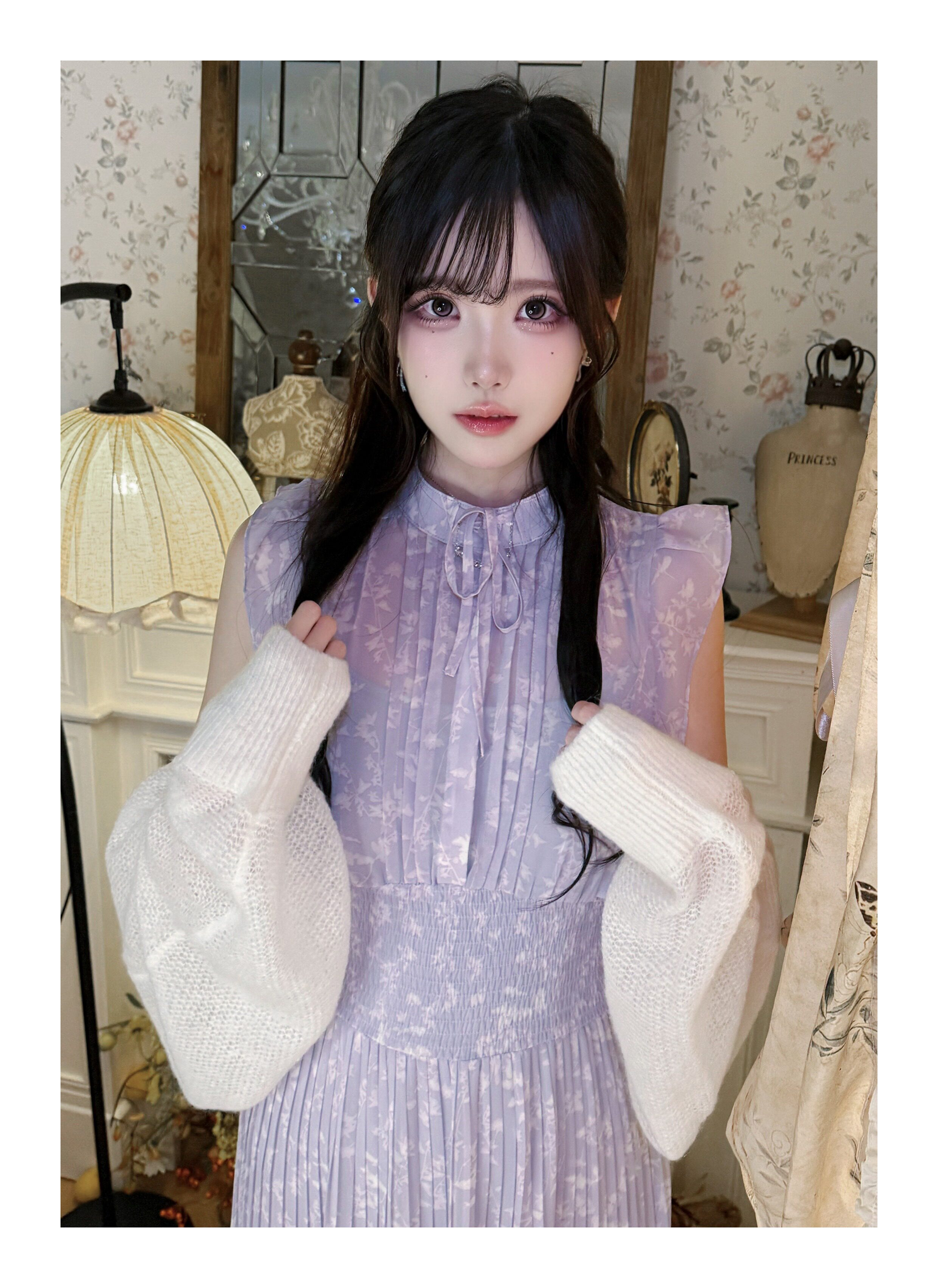小泡芙日系春夏款女裝時尚甜美小飛袖印花百褶收腰無袖長款連衣裙