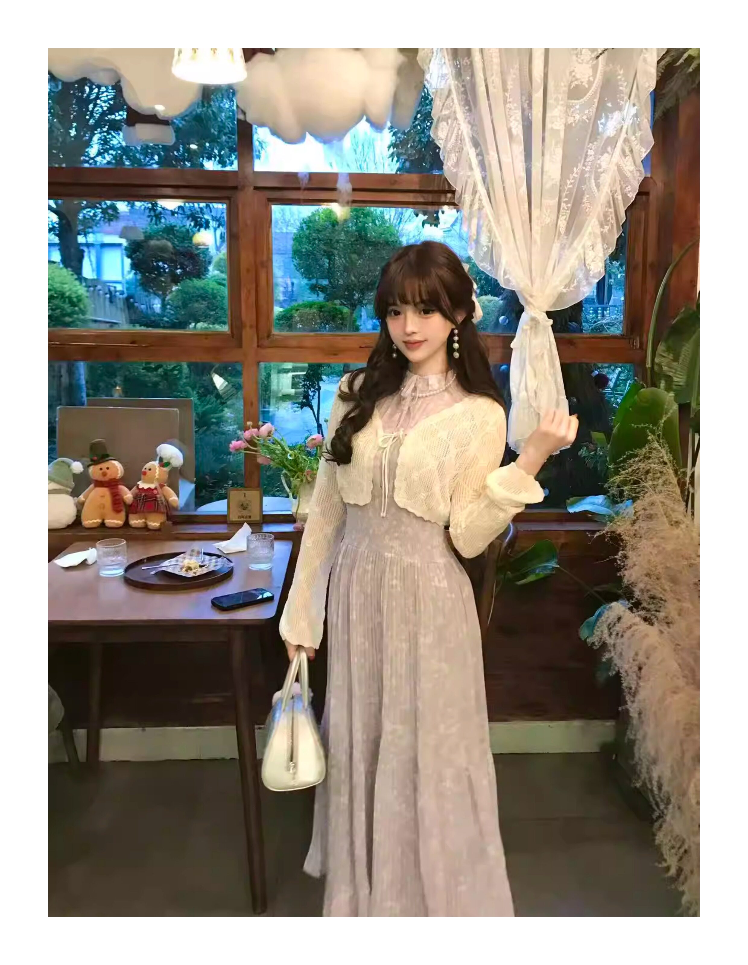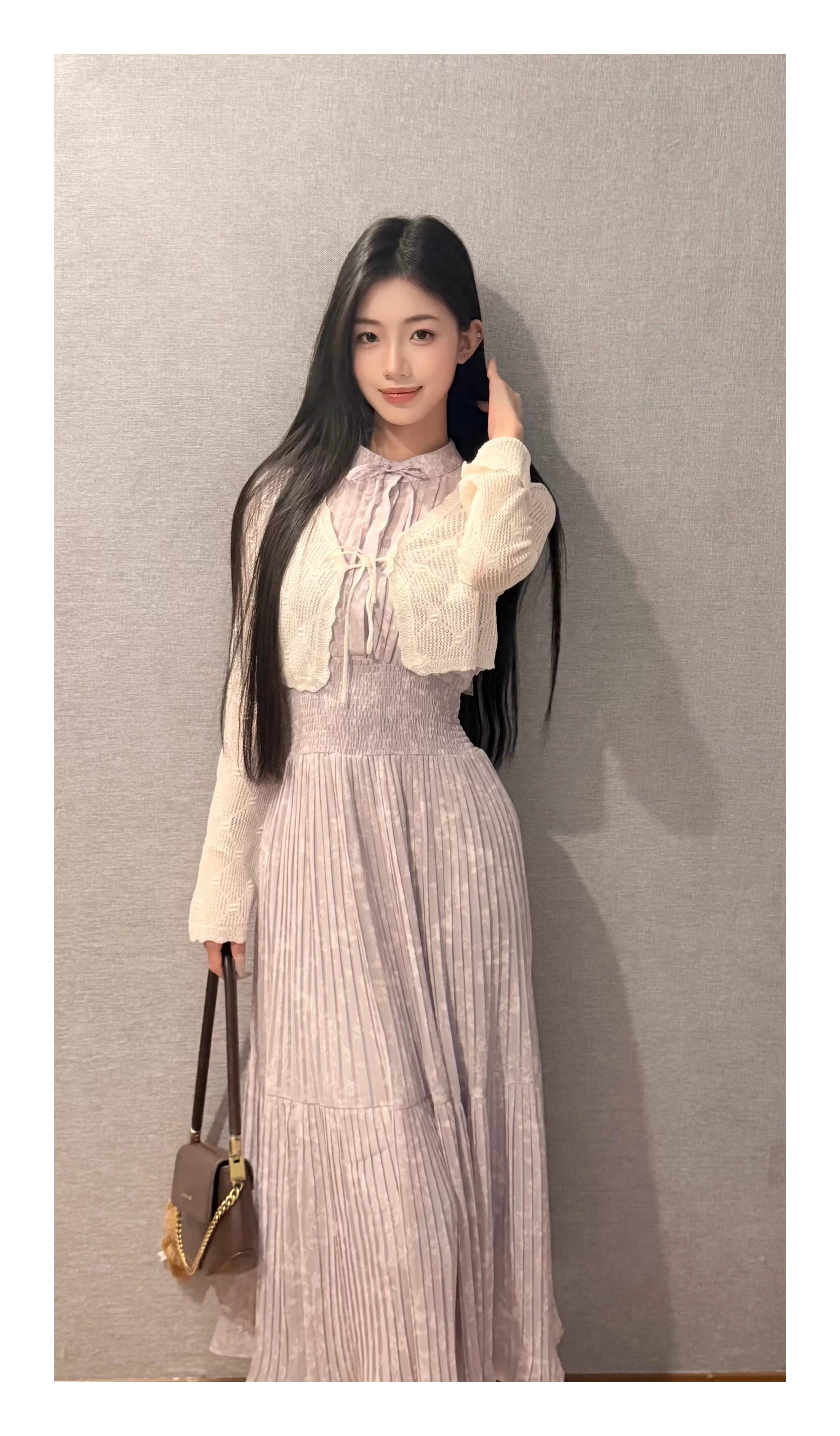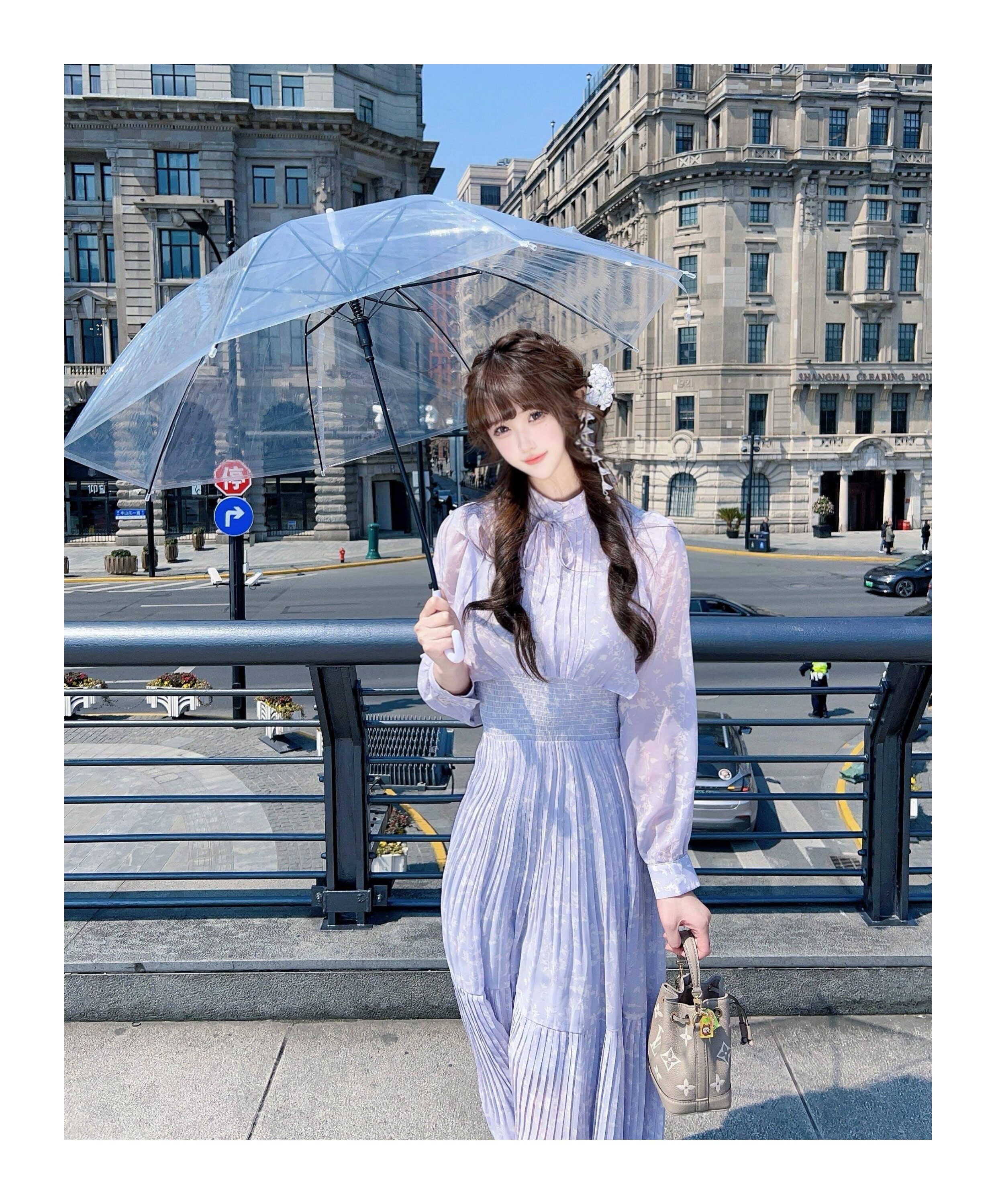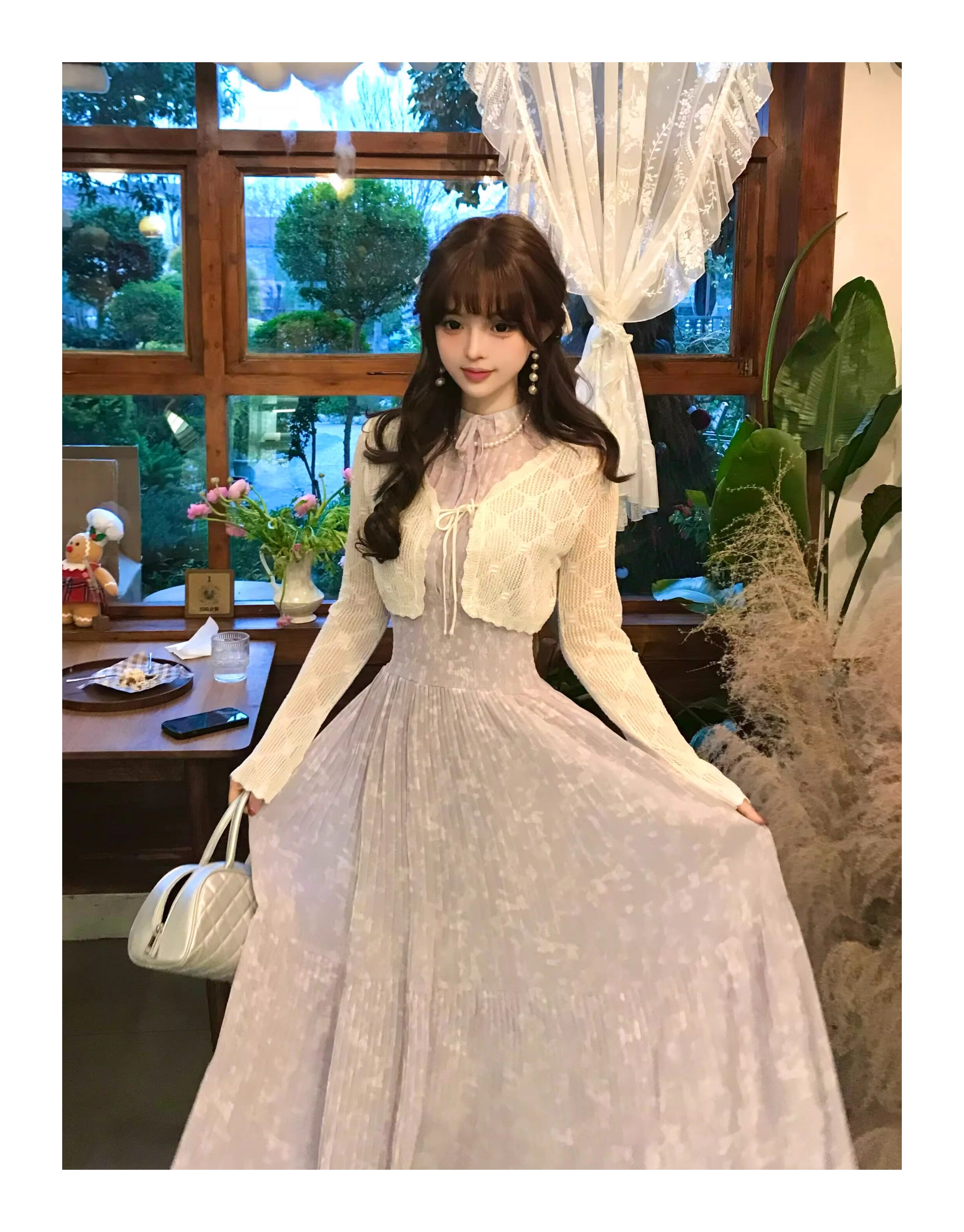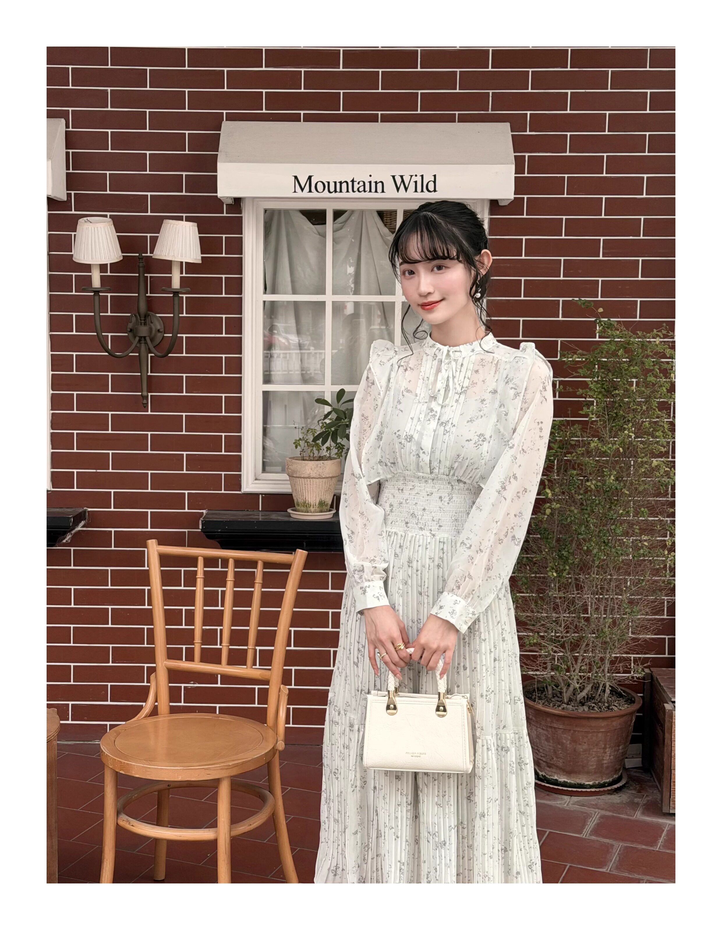 小泡芙日系春夏款女裝時尚甜美小飛袖印花百褶收腰無袖長款連衣裙