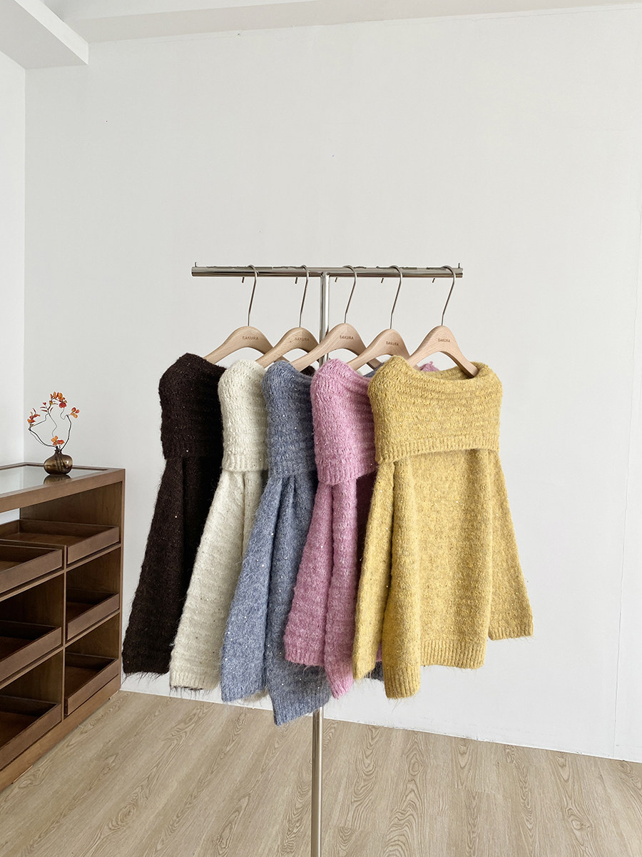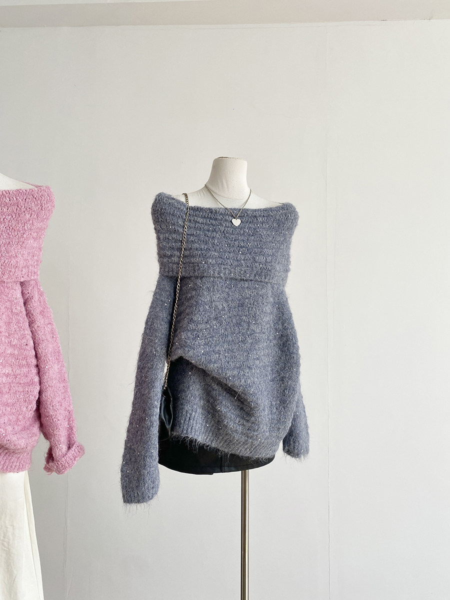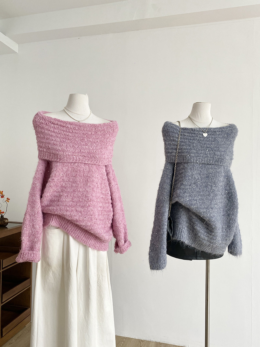 2025秋季新款韓系甜美軟糯一字肩針織毛衣女通勤寬鬆顯瘦閃片上衣