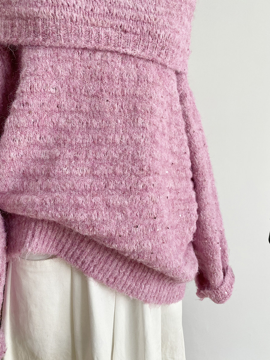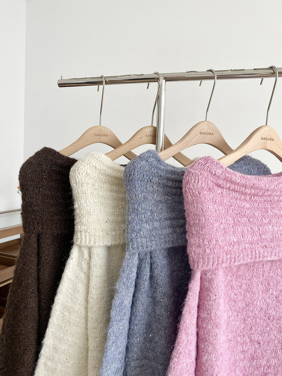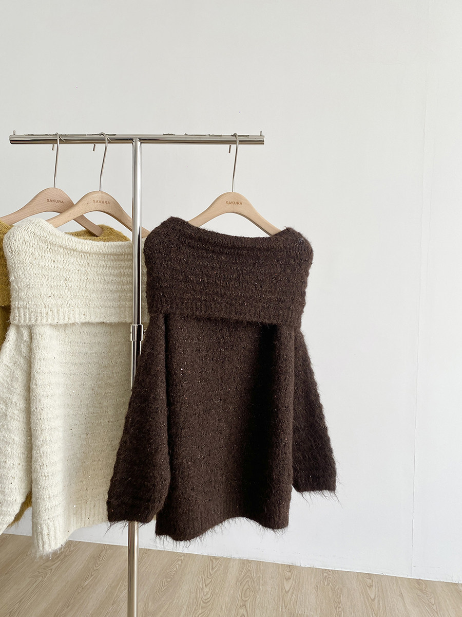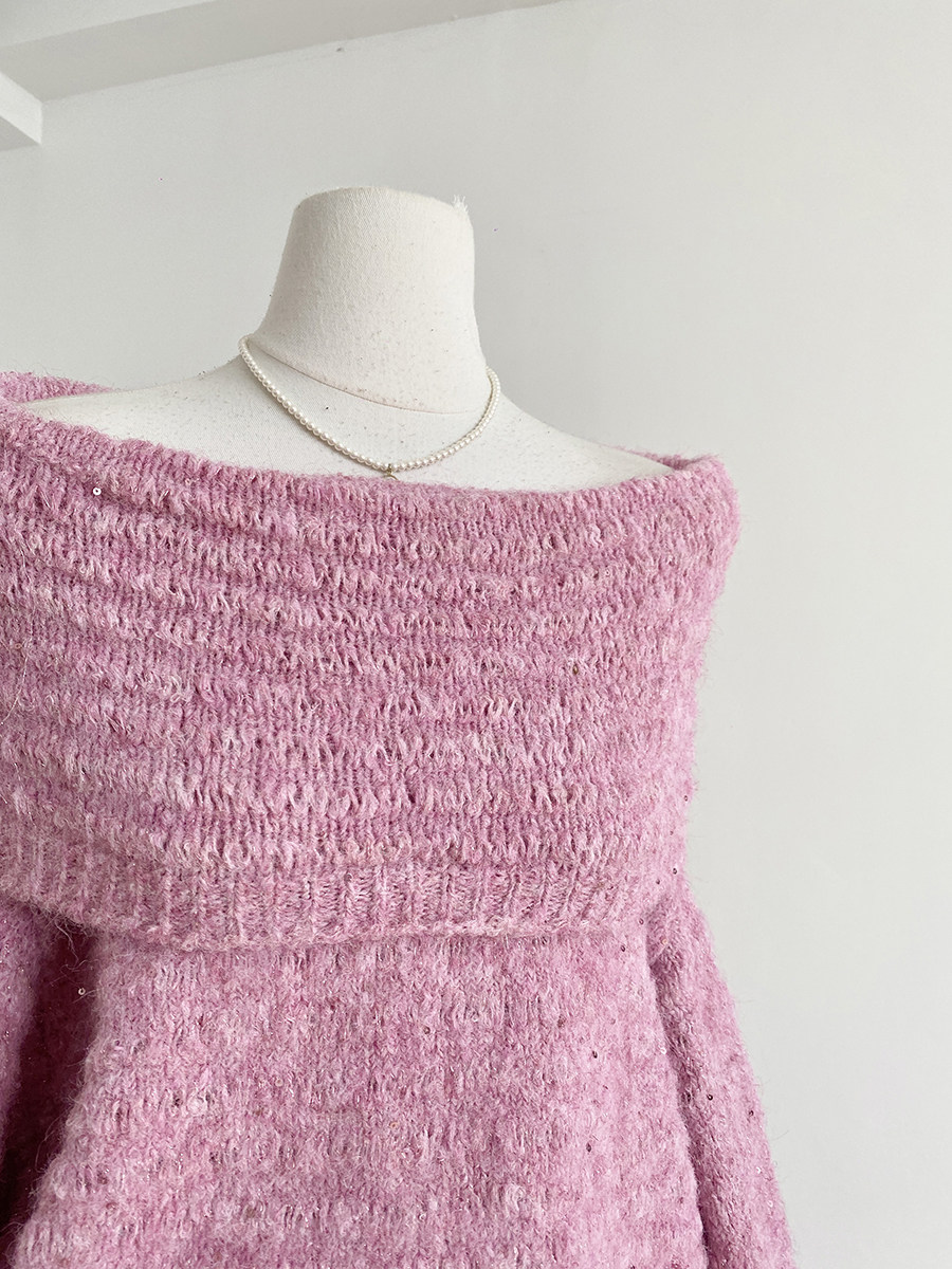 2025秋季新款韓系甜美軟糯一字肩針織毛衣女通勤寬鬆顯瘦閃片上衣