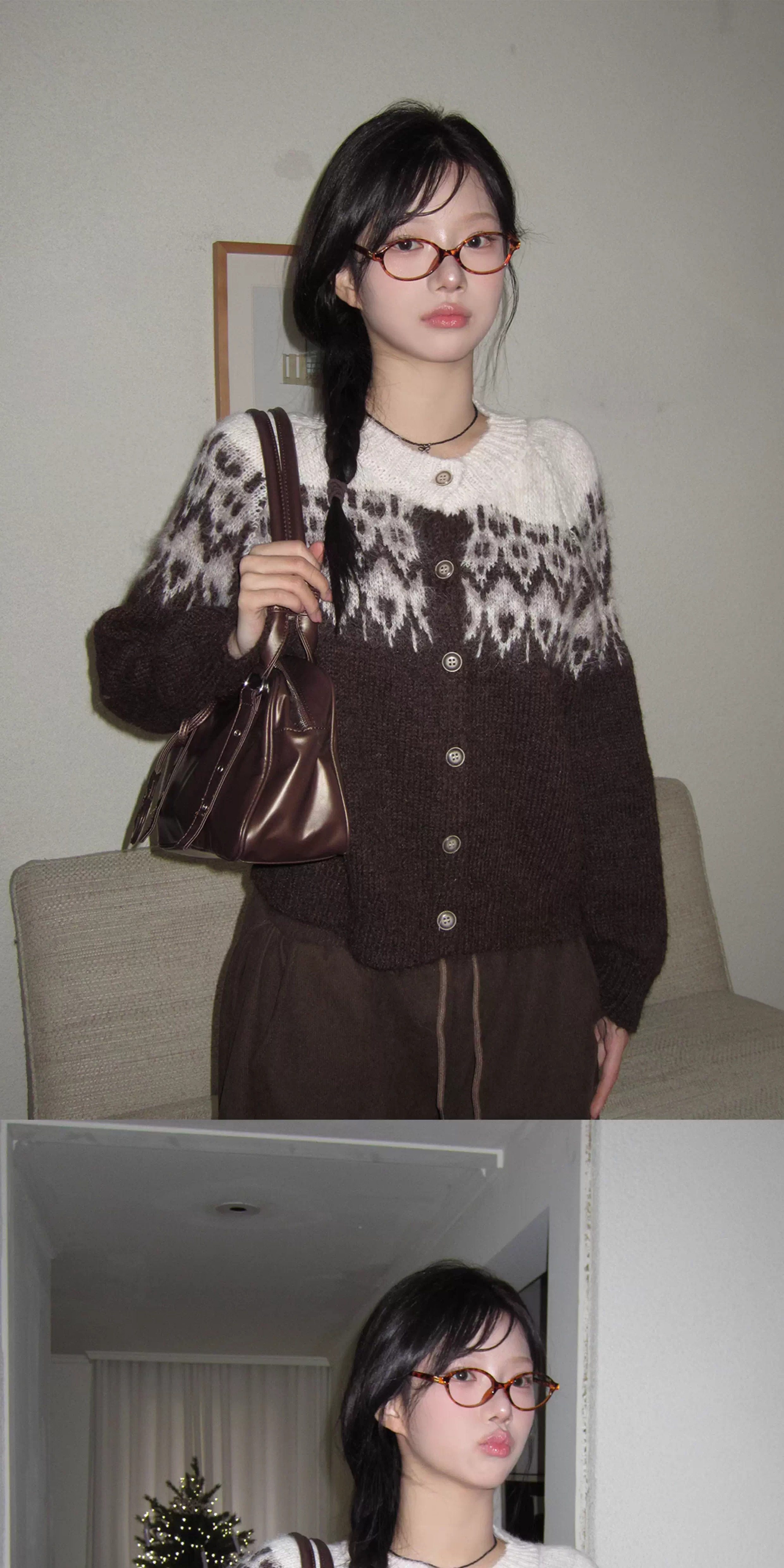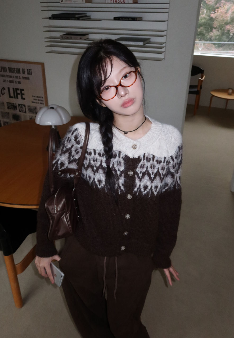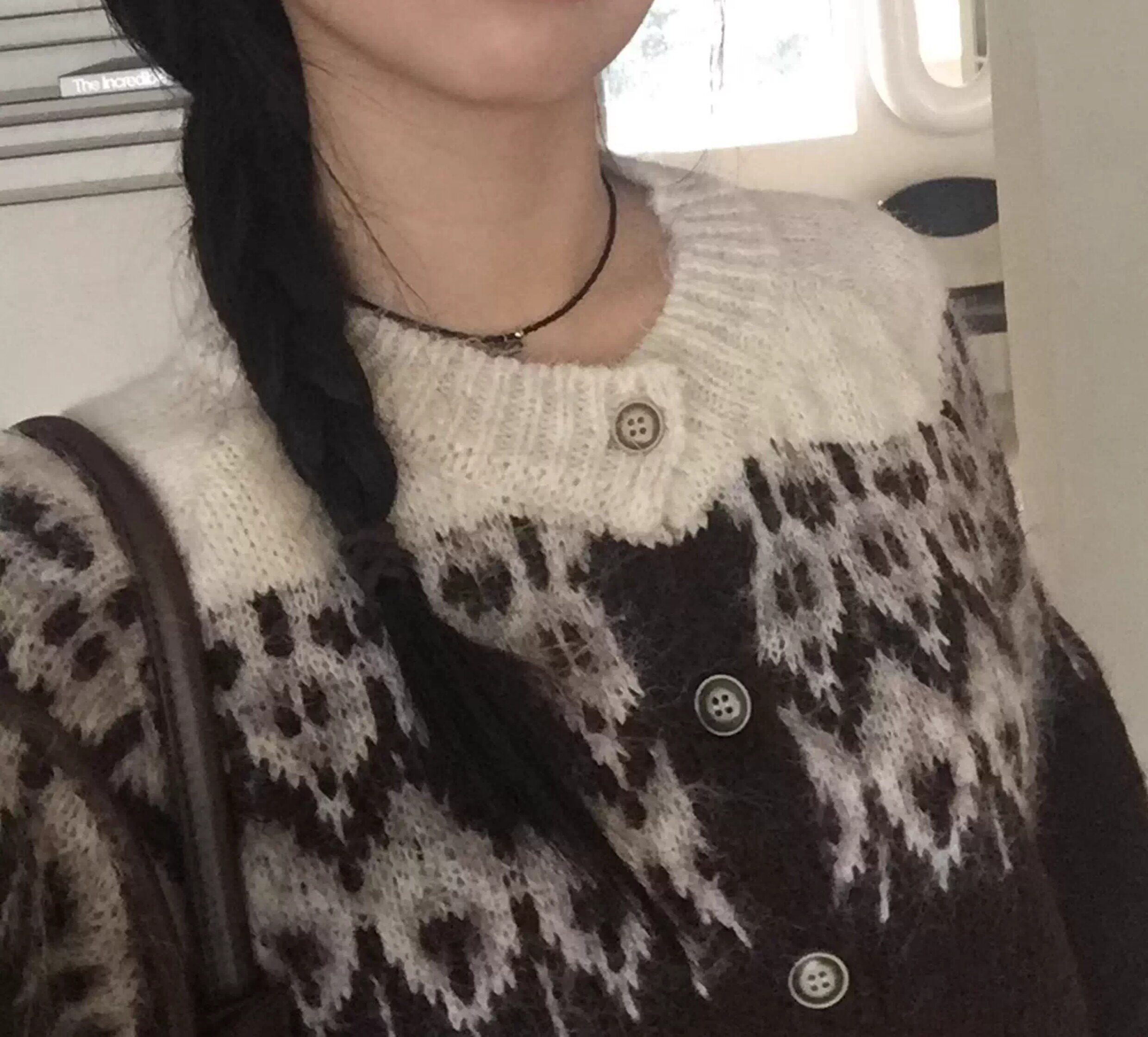 Up and on 韓系慵嬾費爾島提花圓領單排釦休閒百搭針織開衫毛衣