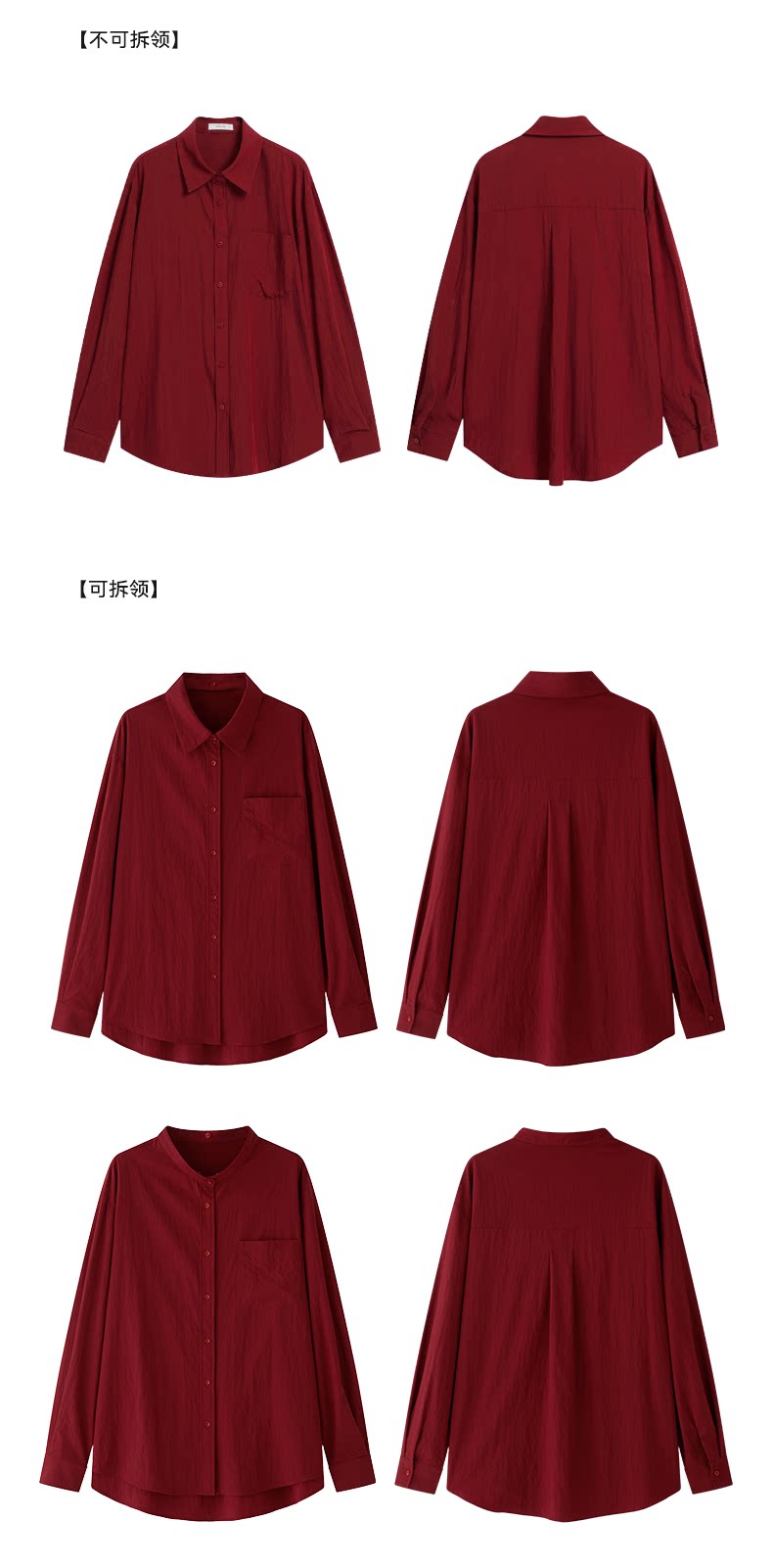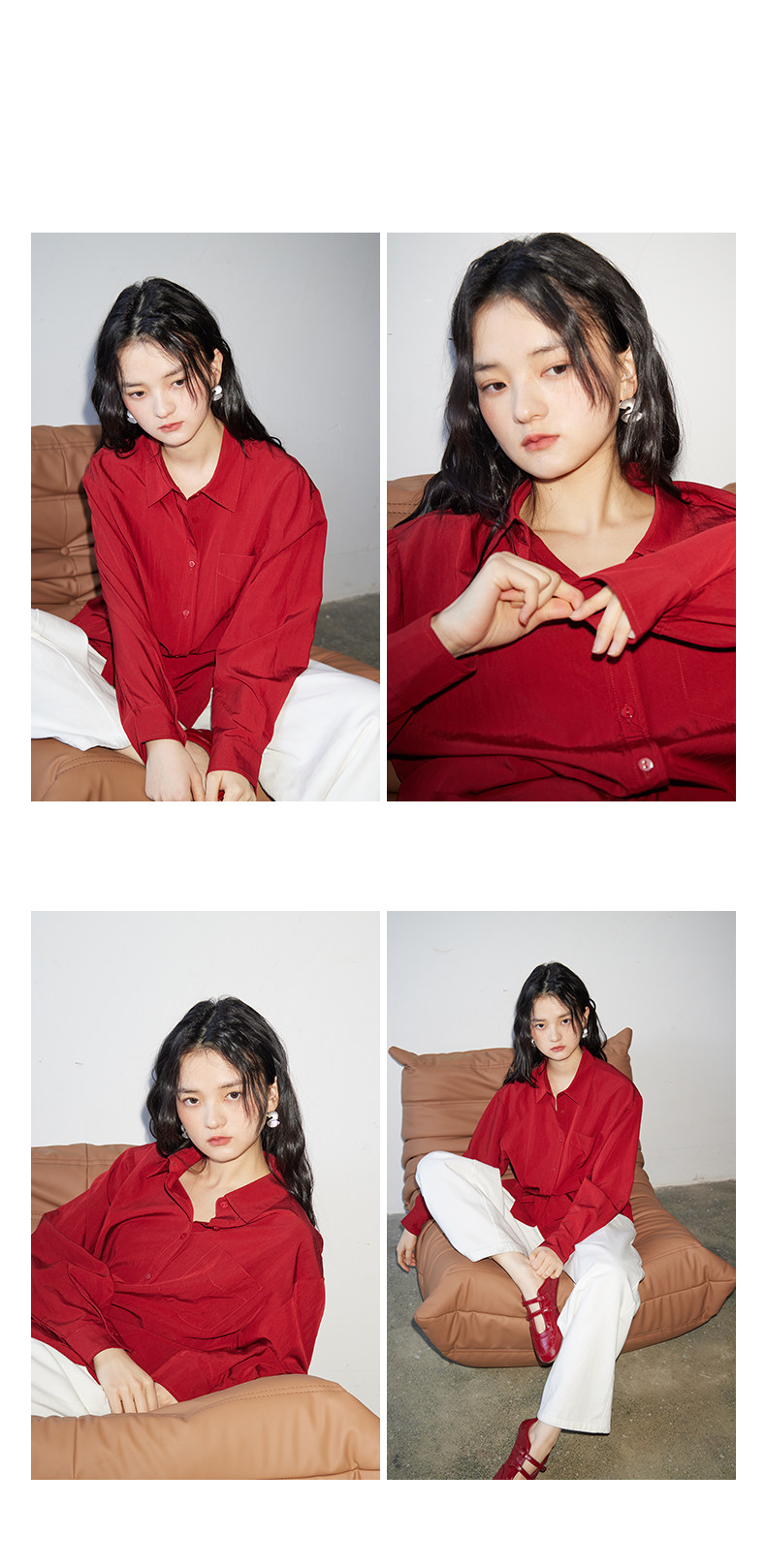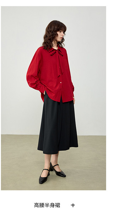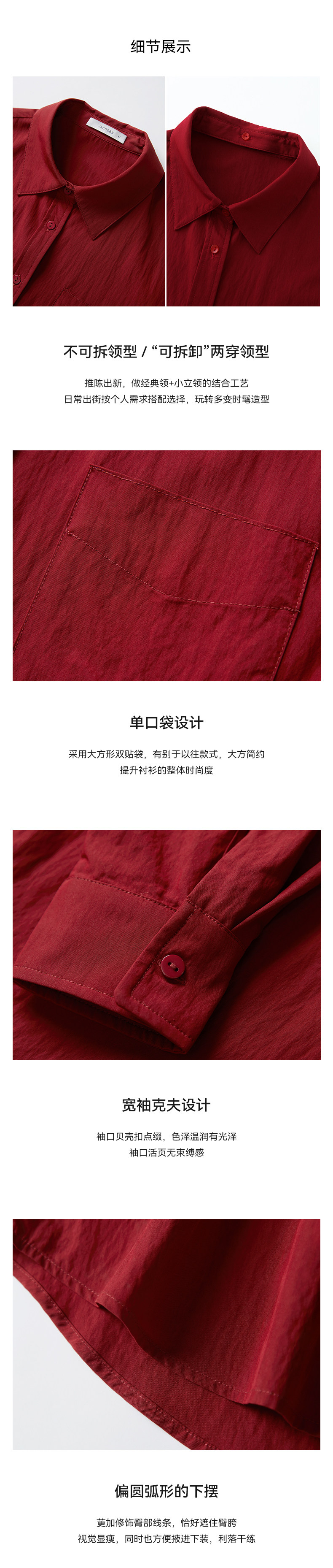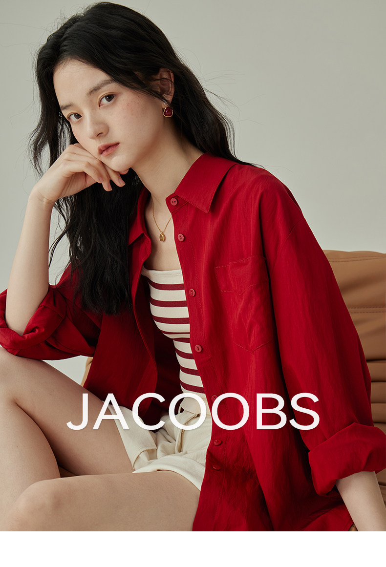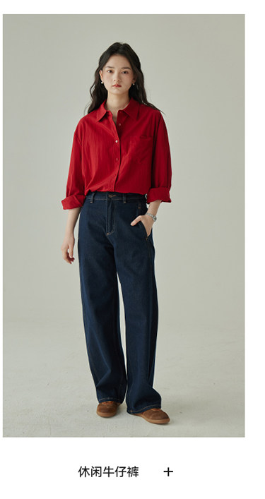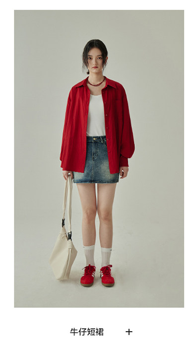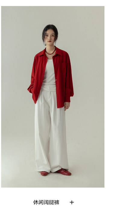 婭可家紅色上衣女設計感小衆春夏新款寬鬆繙領休閒褶皺防曬襯衫女