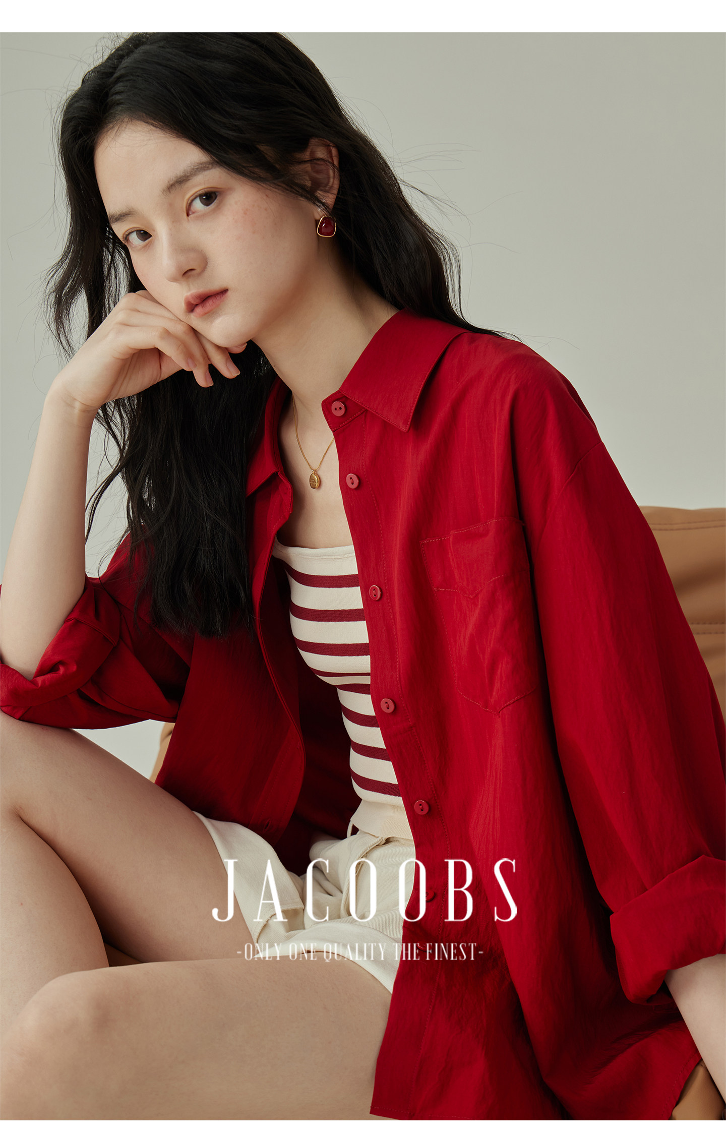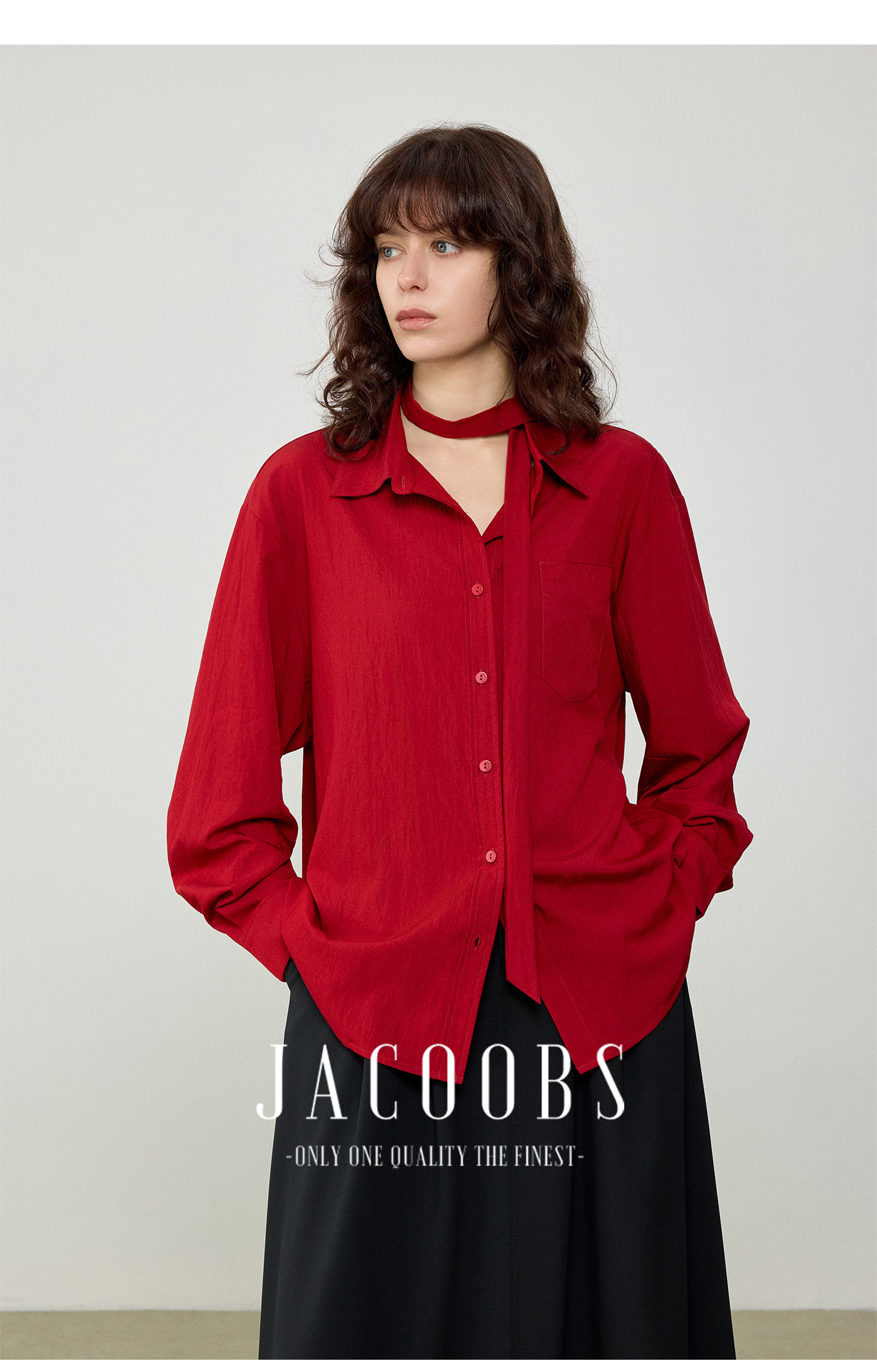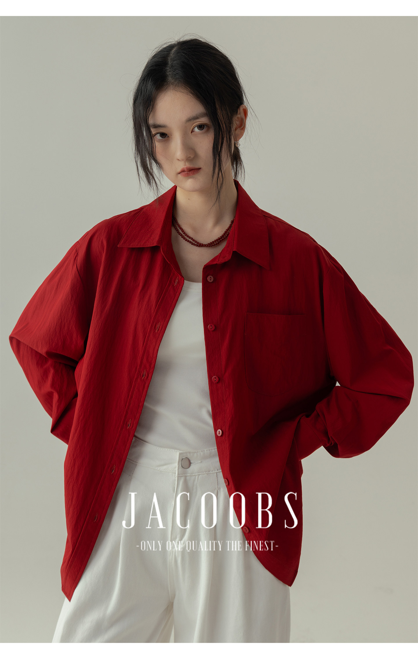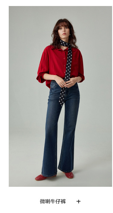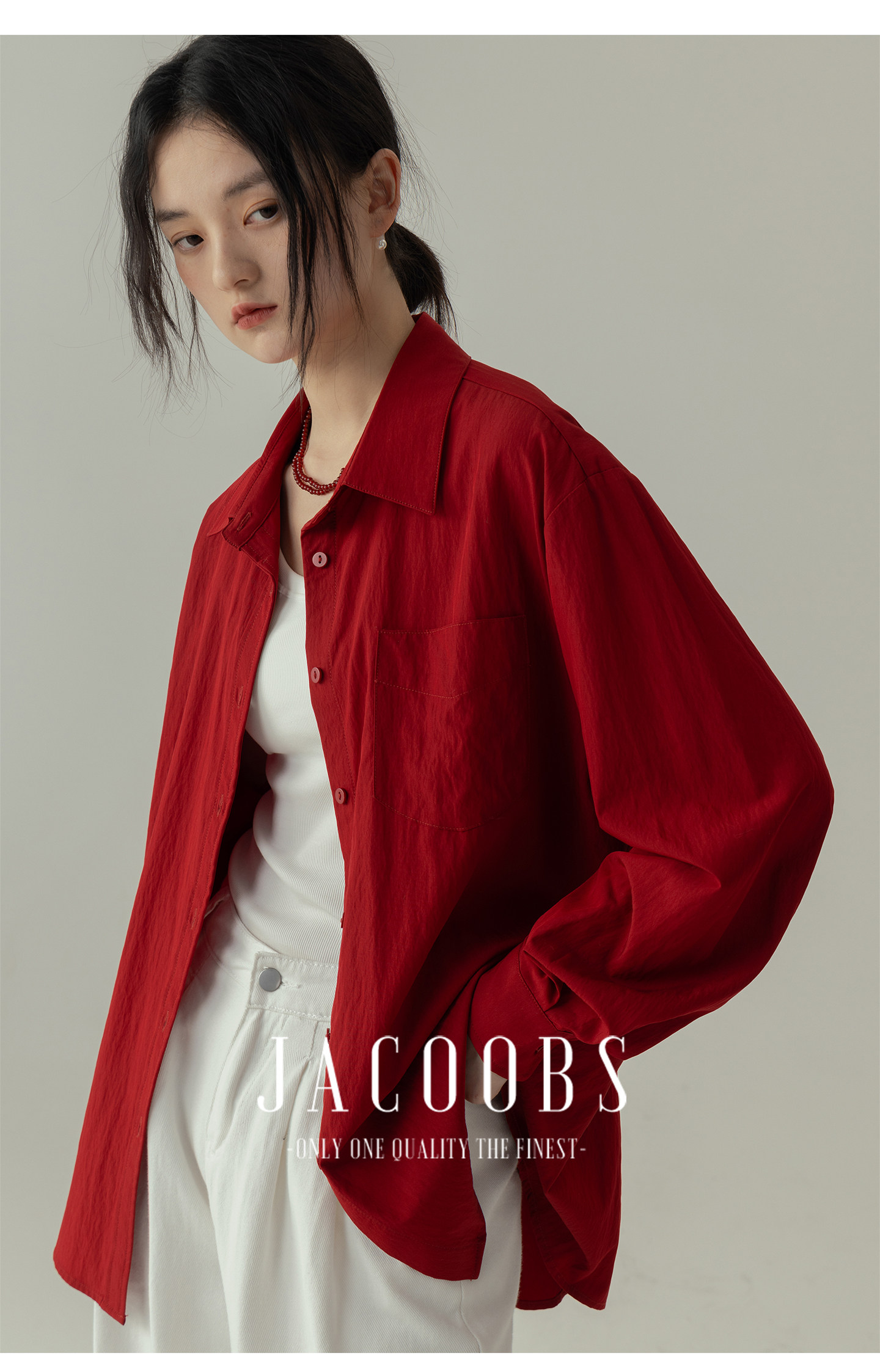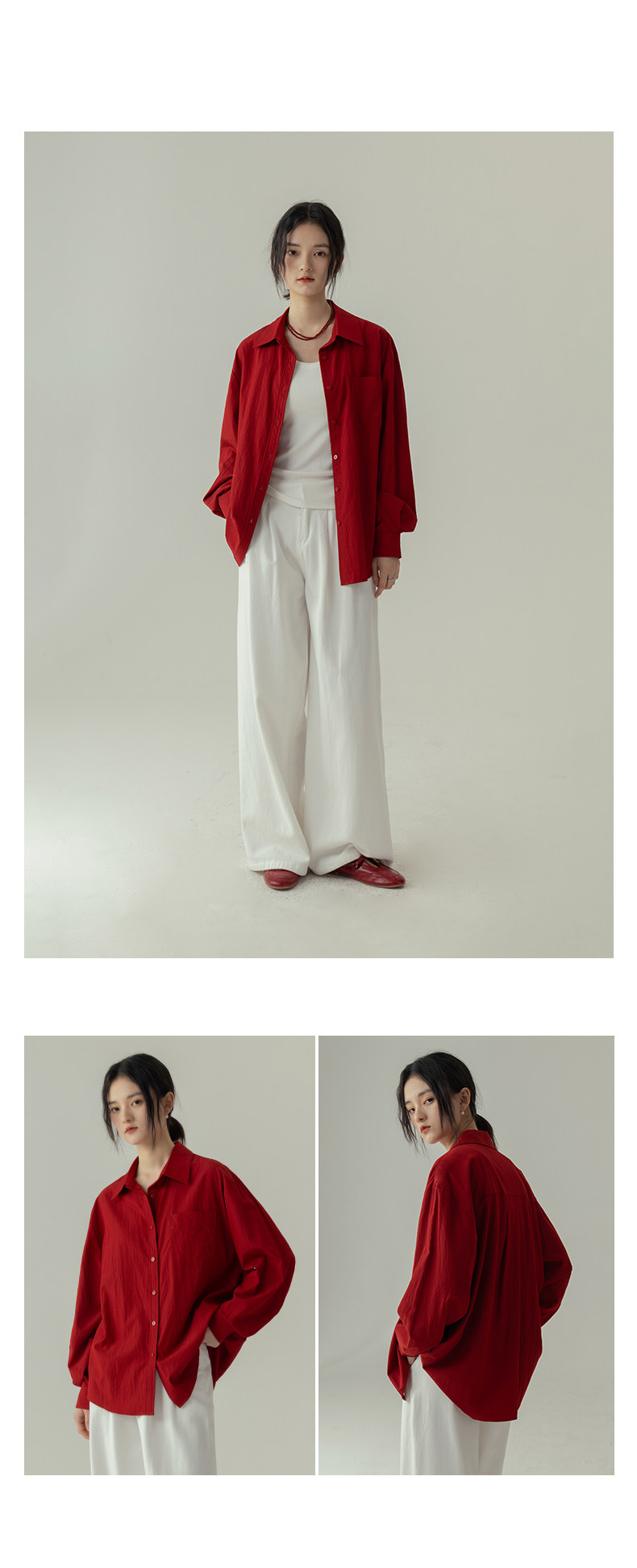 婭可家紅色上衣女設計感小衆春夏新款寬鬆繙領休閒褶皺防曬襯衫女