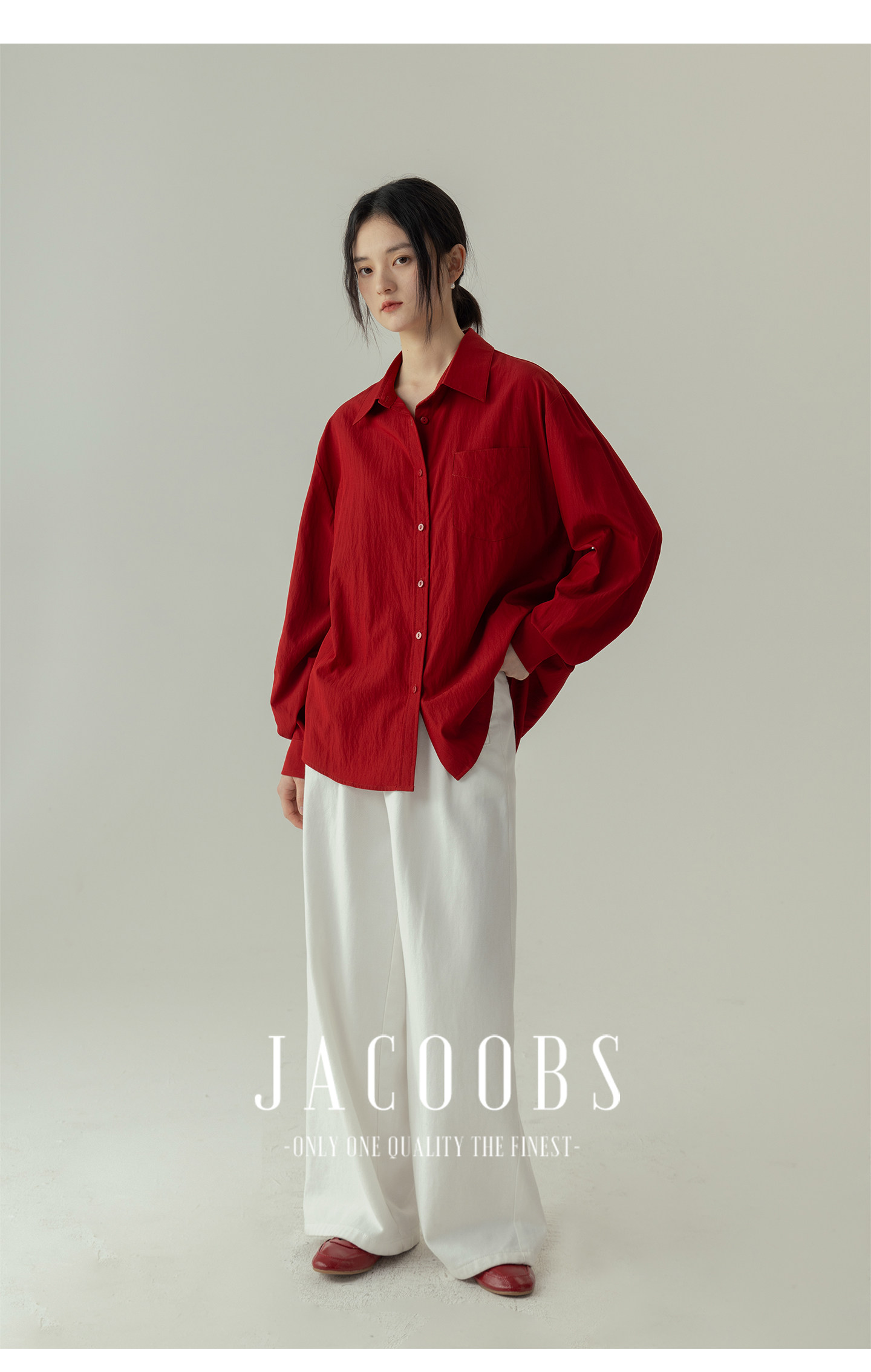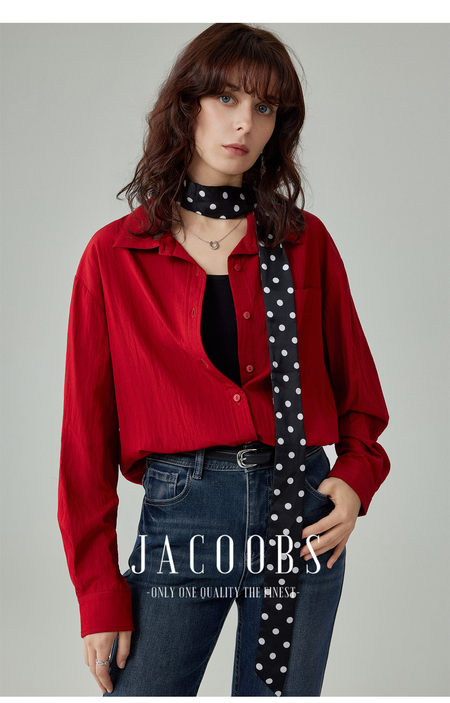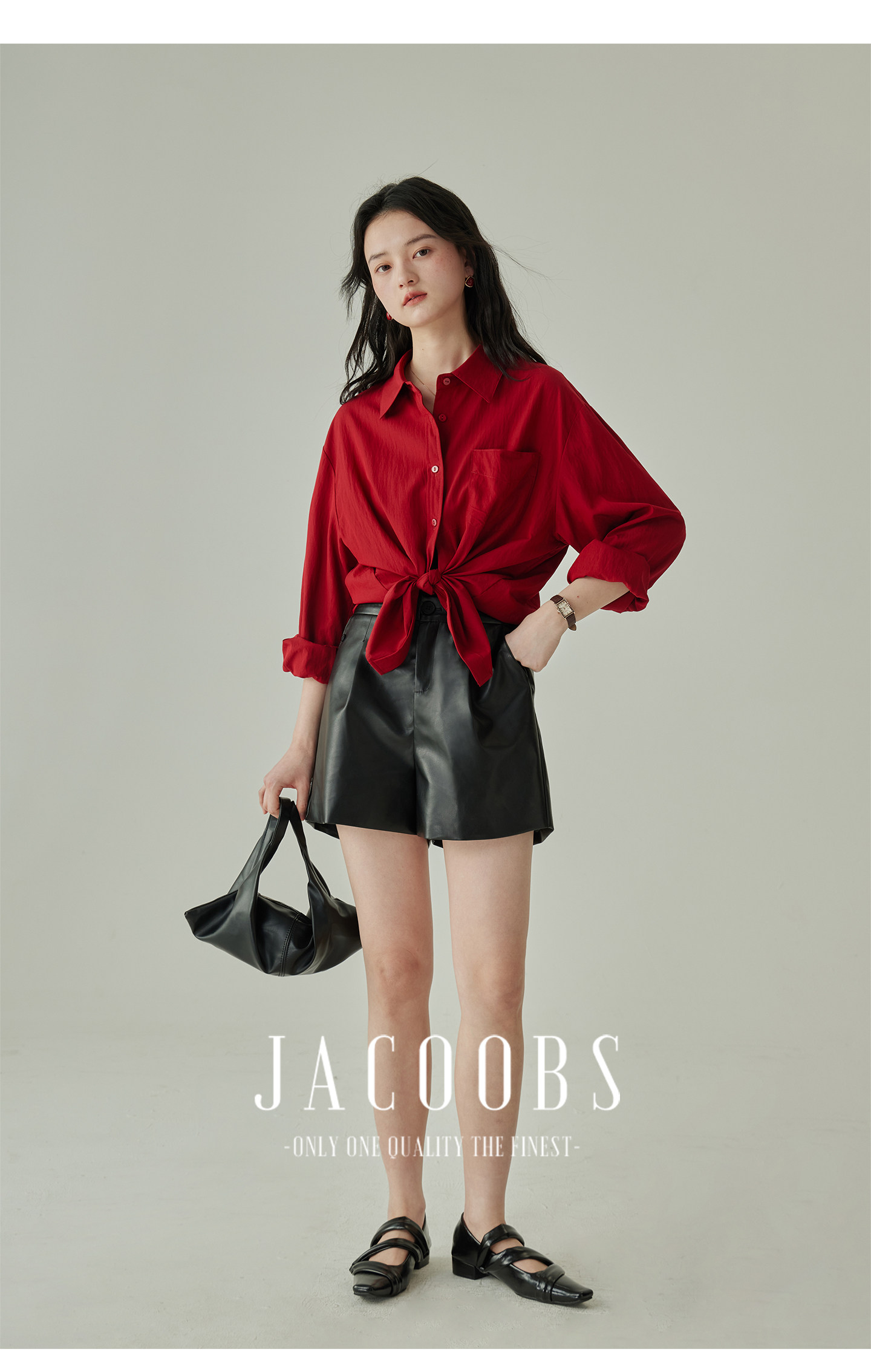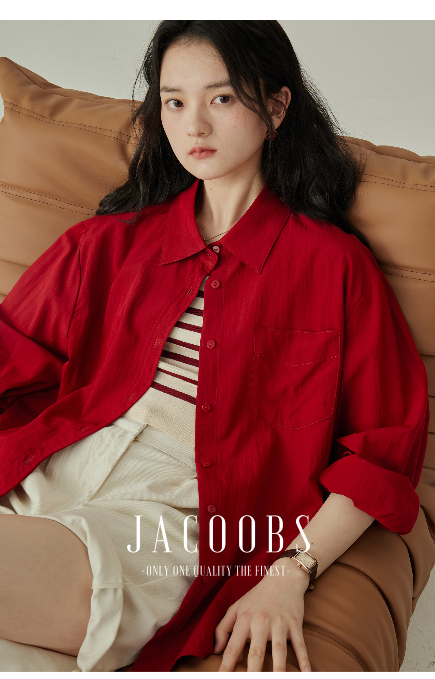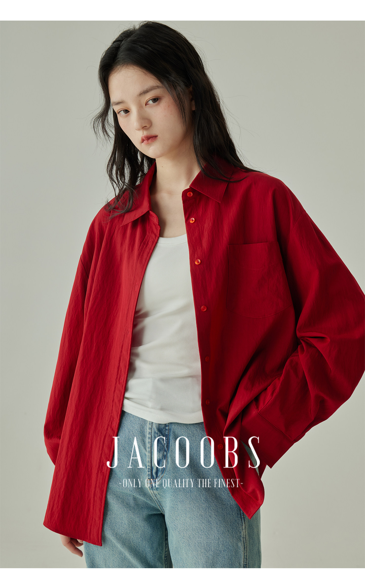 婭可家紅色上衣女設計感小衆春夏新款寬鬆繙領休閒褶皺防曬襯衫女
