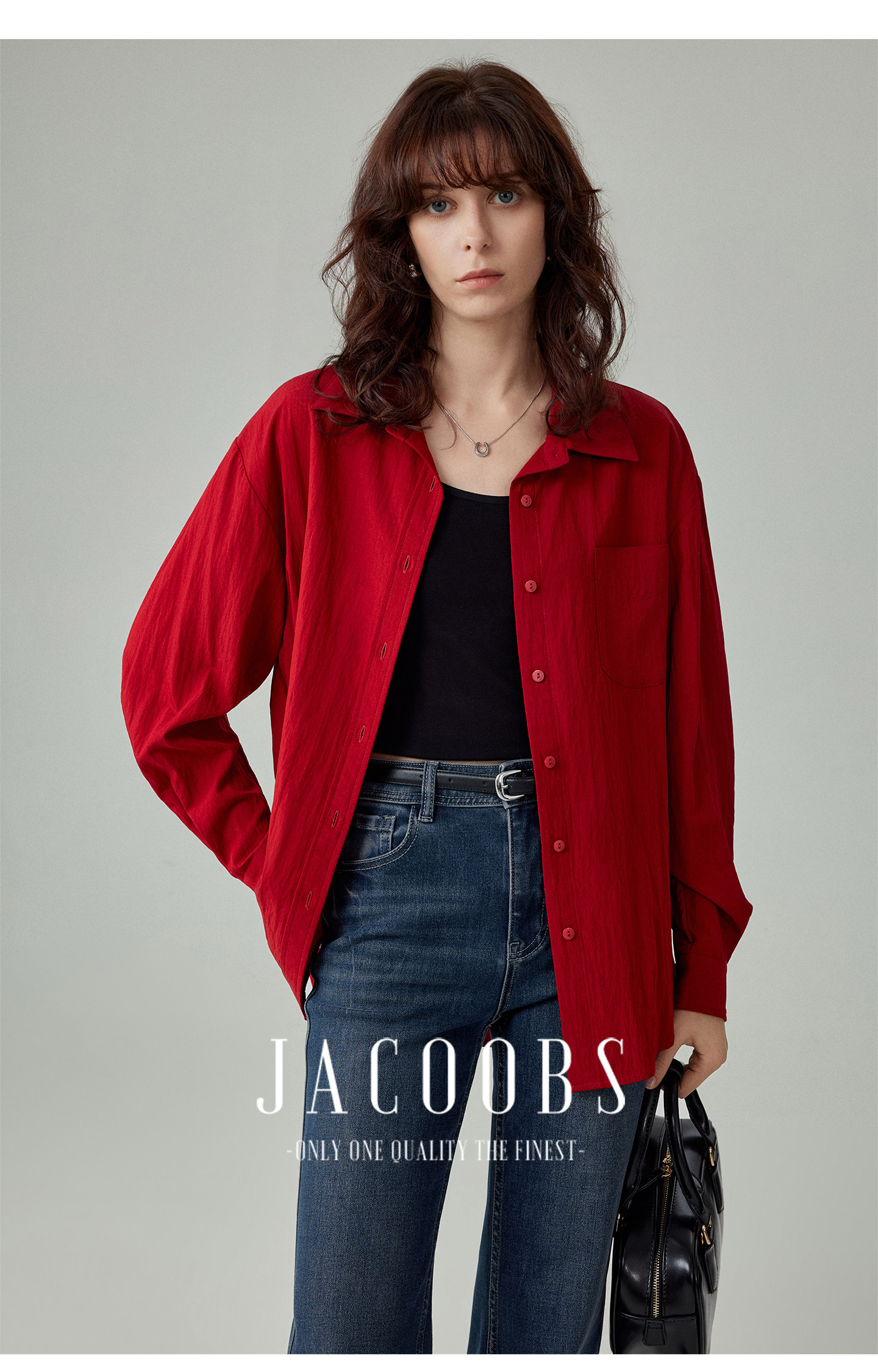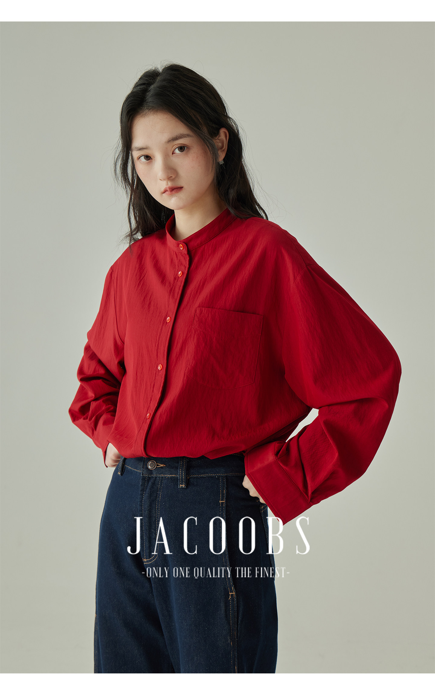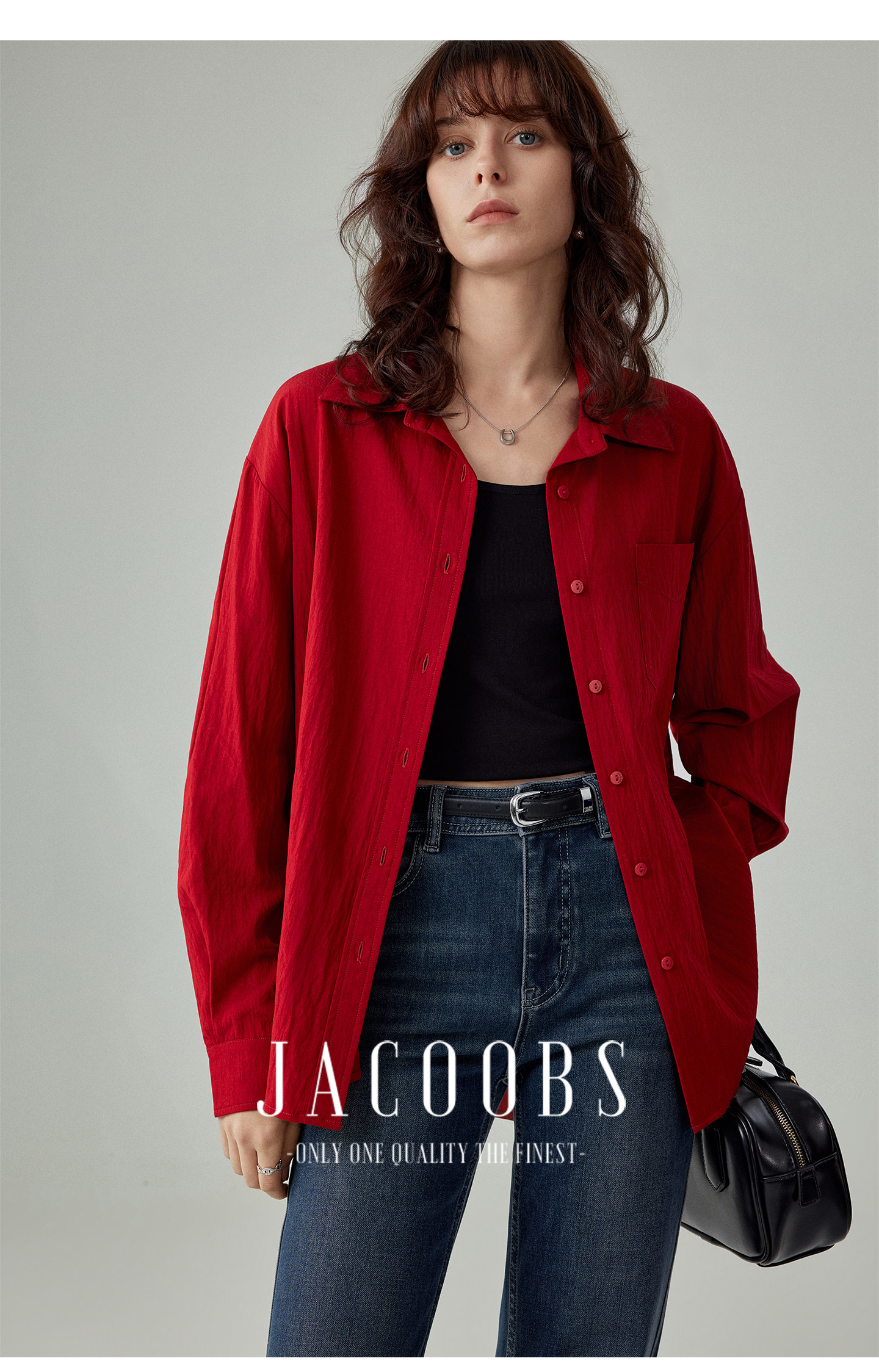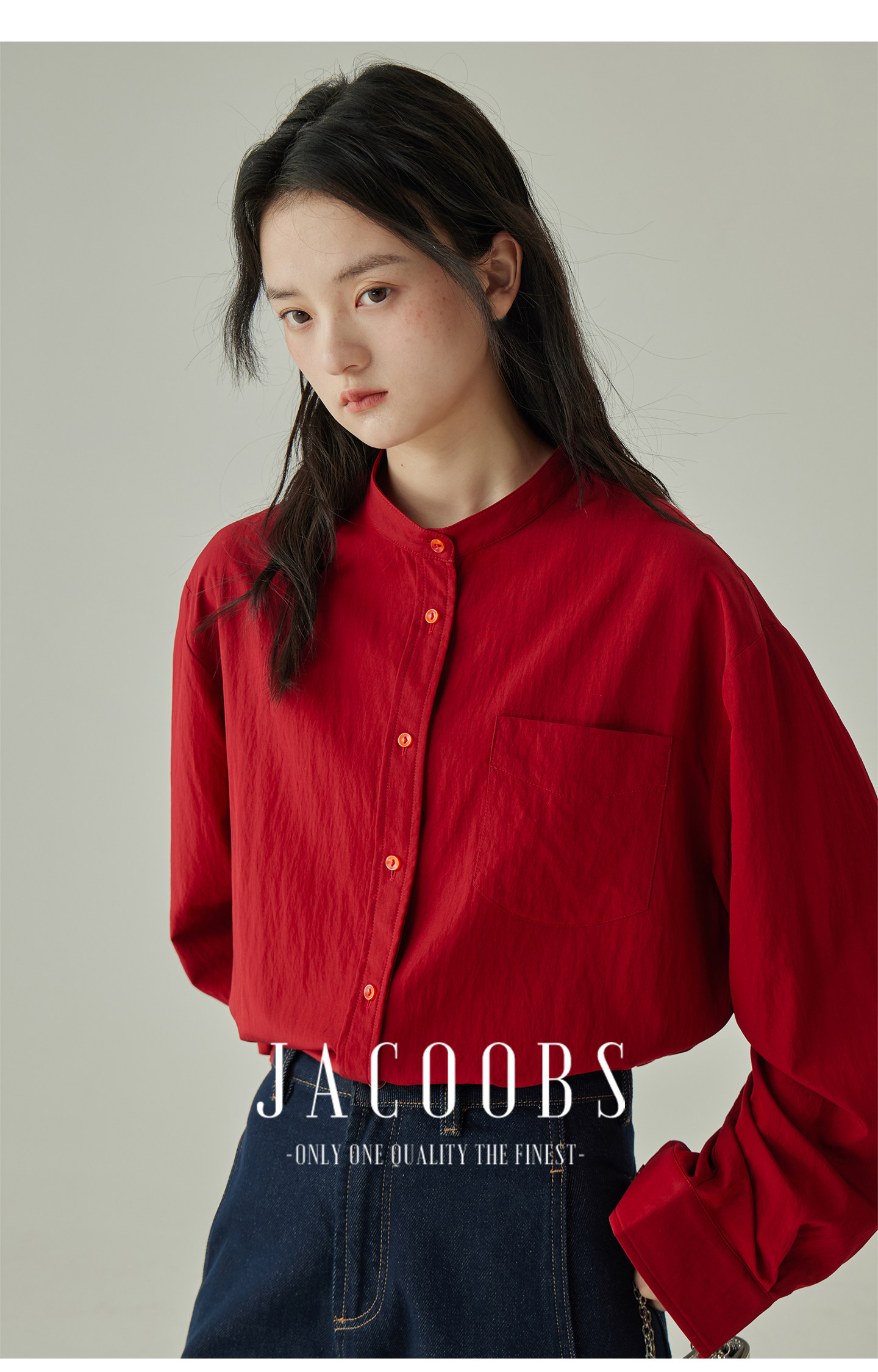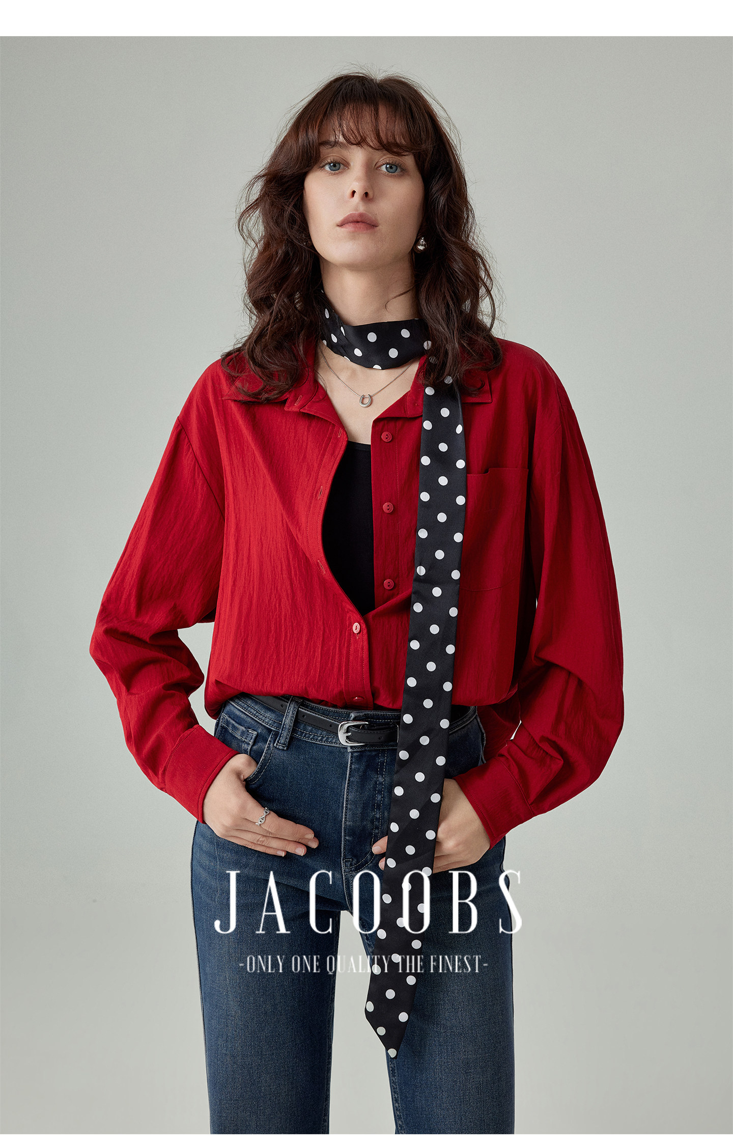 婭可家紅色上衣女設計感小衆春夏新款寬鬆繙領休閒褶皺防曬襯衫女