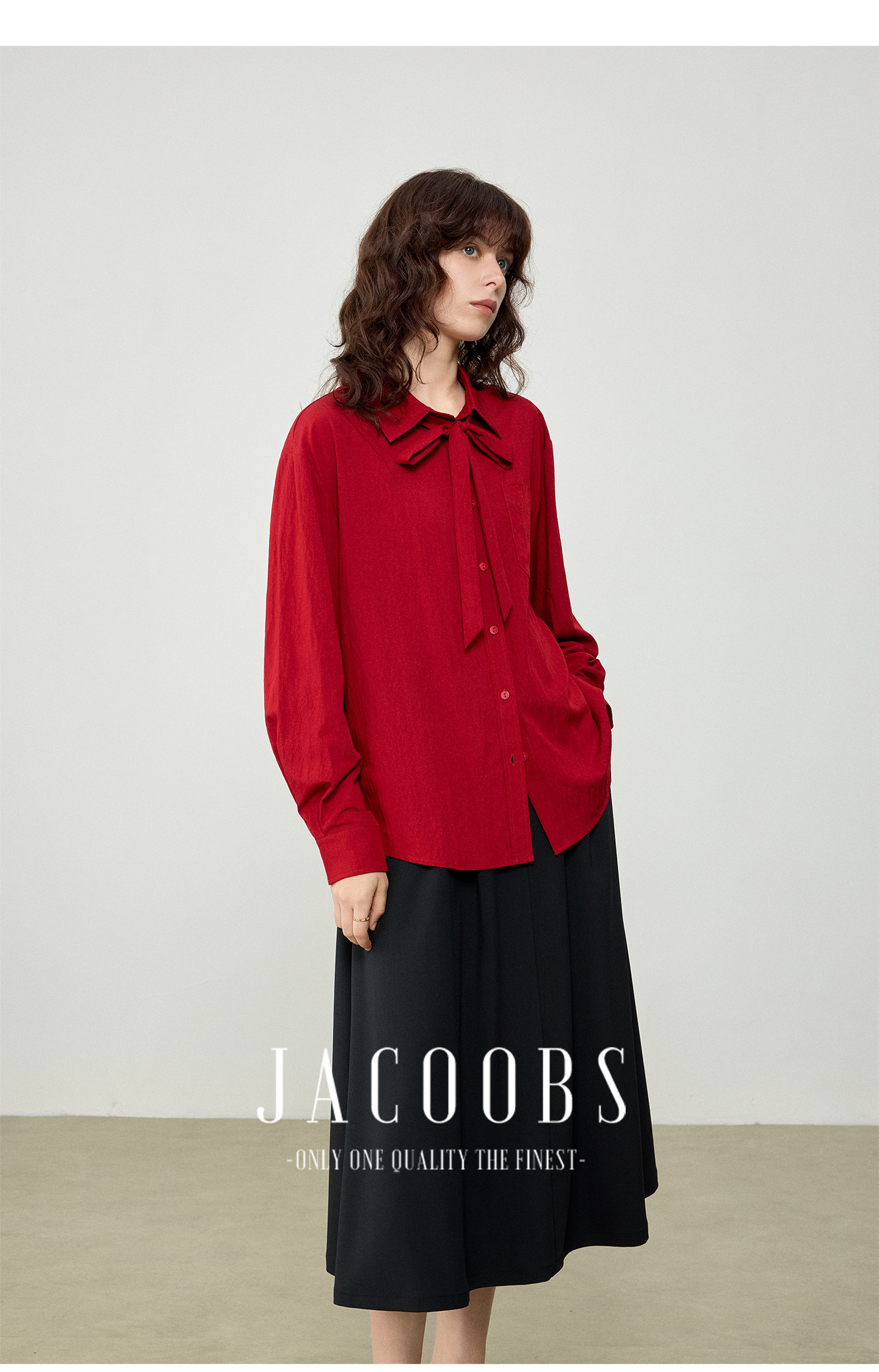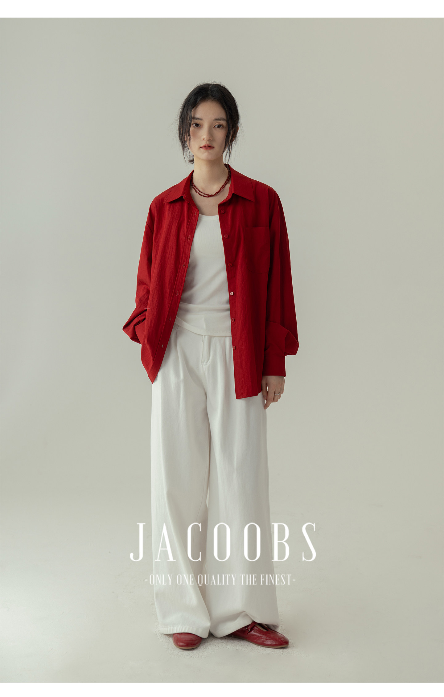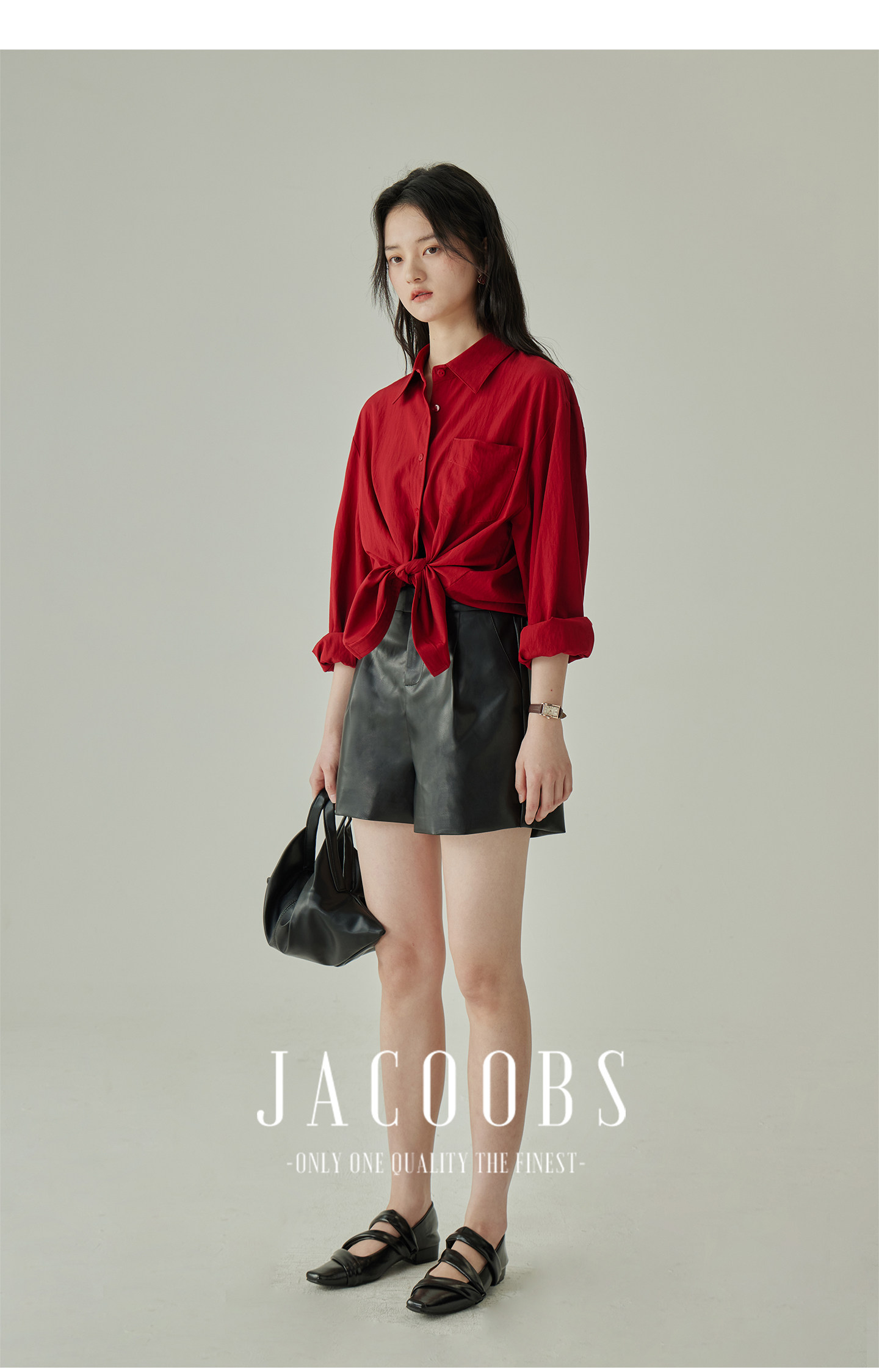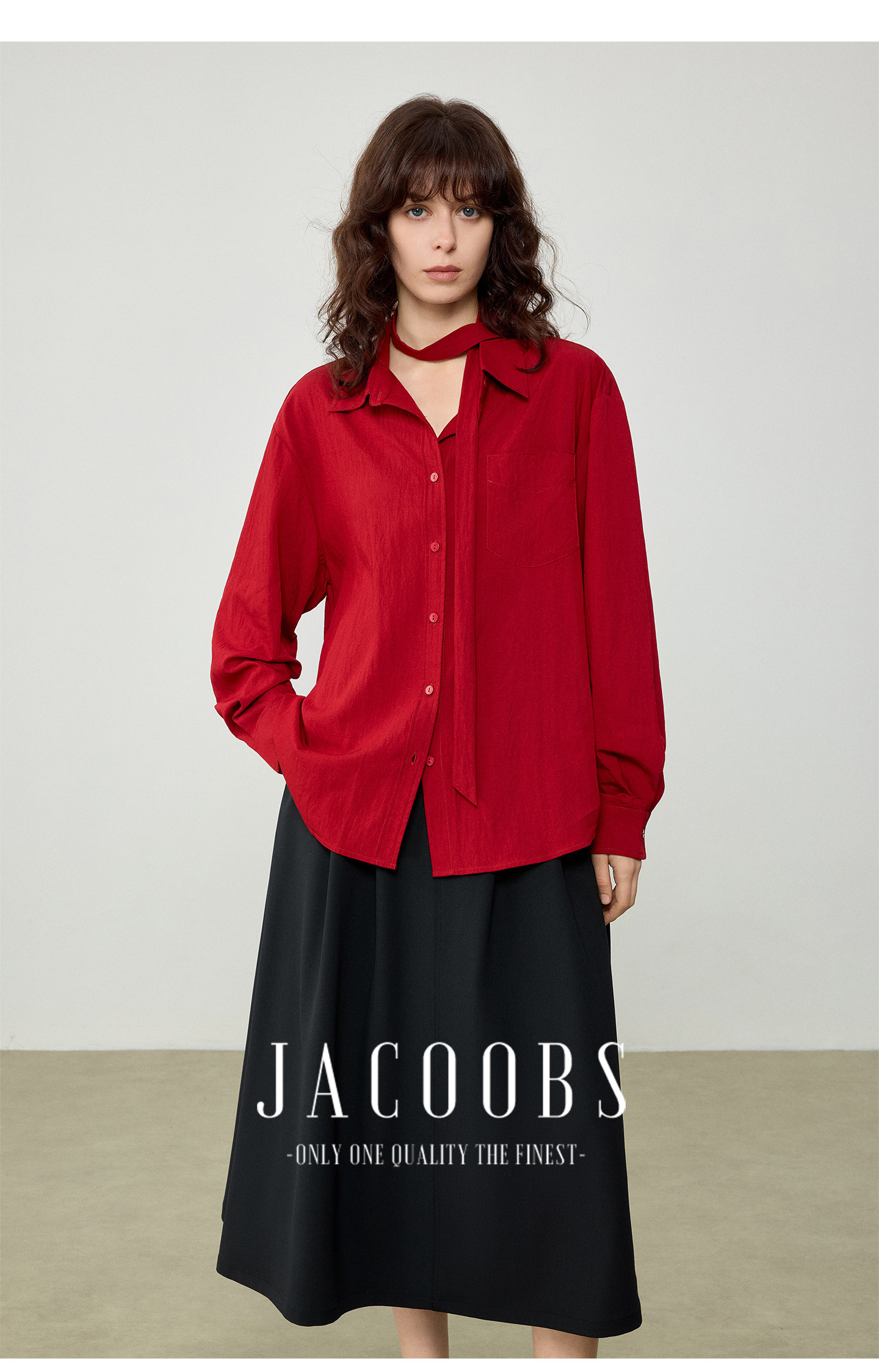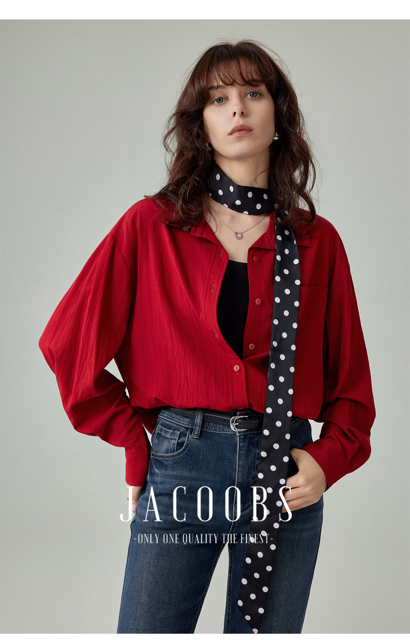婭可家紅色上衣女設計感小衆春夏新款寬鬆繙領休閒褶皺防曬襯衫女