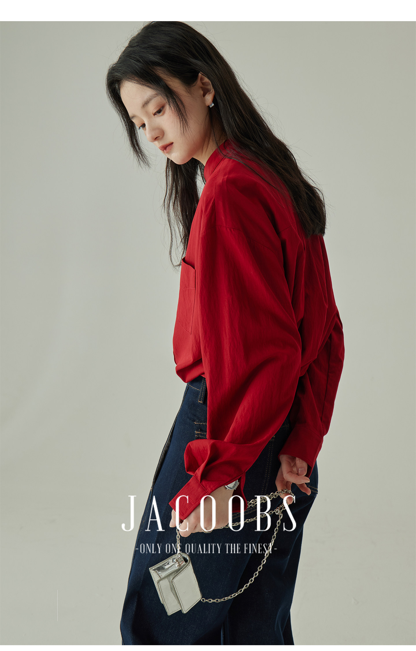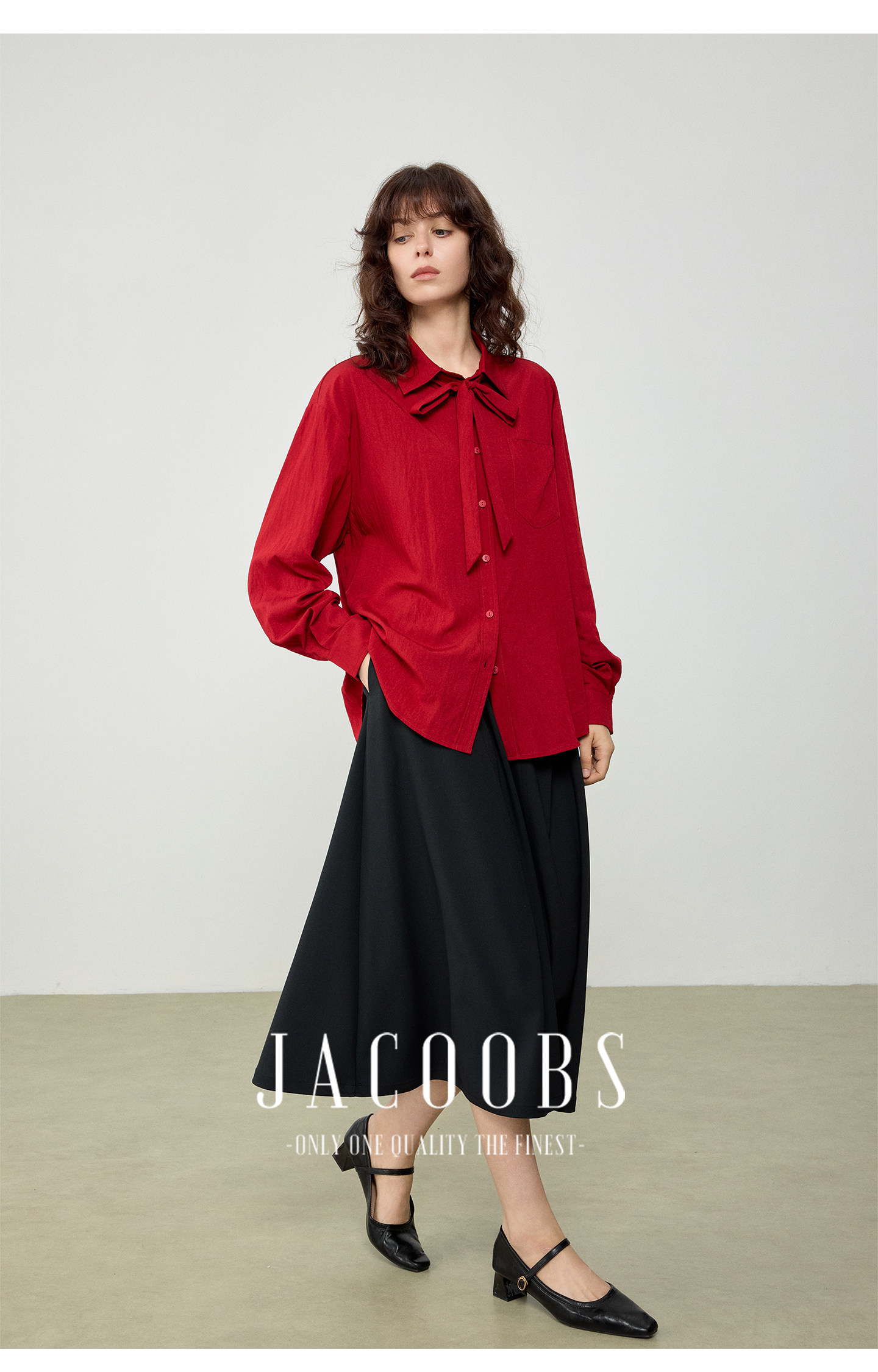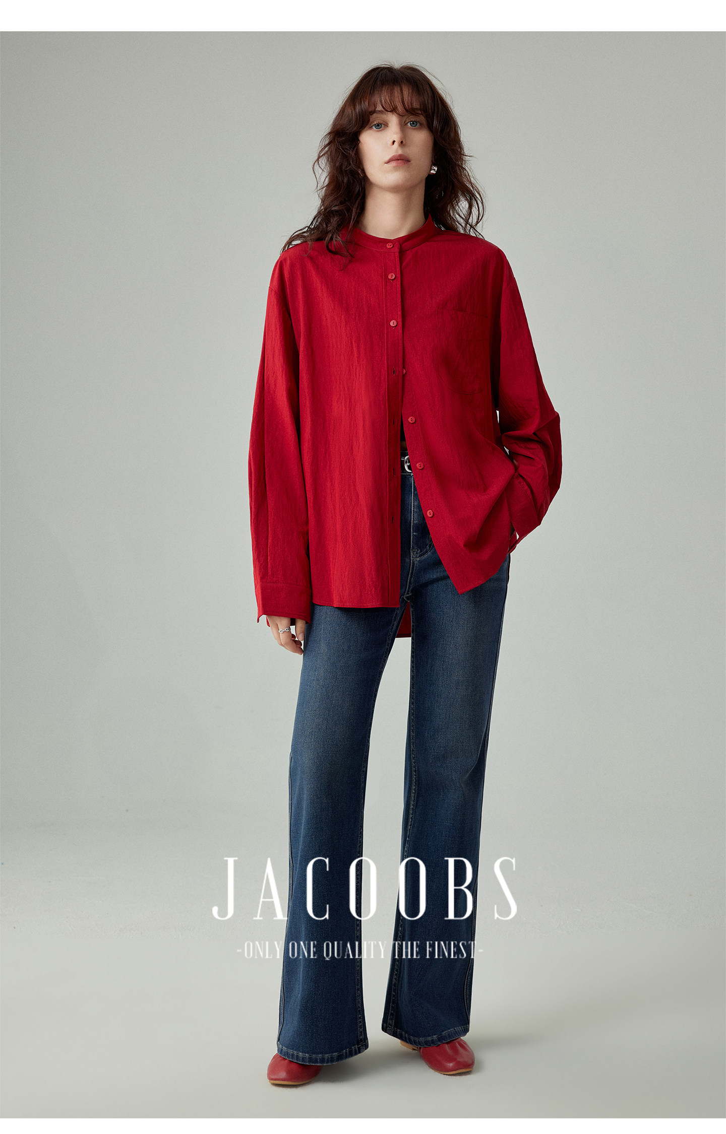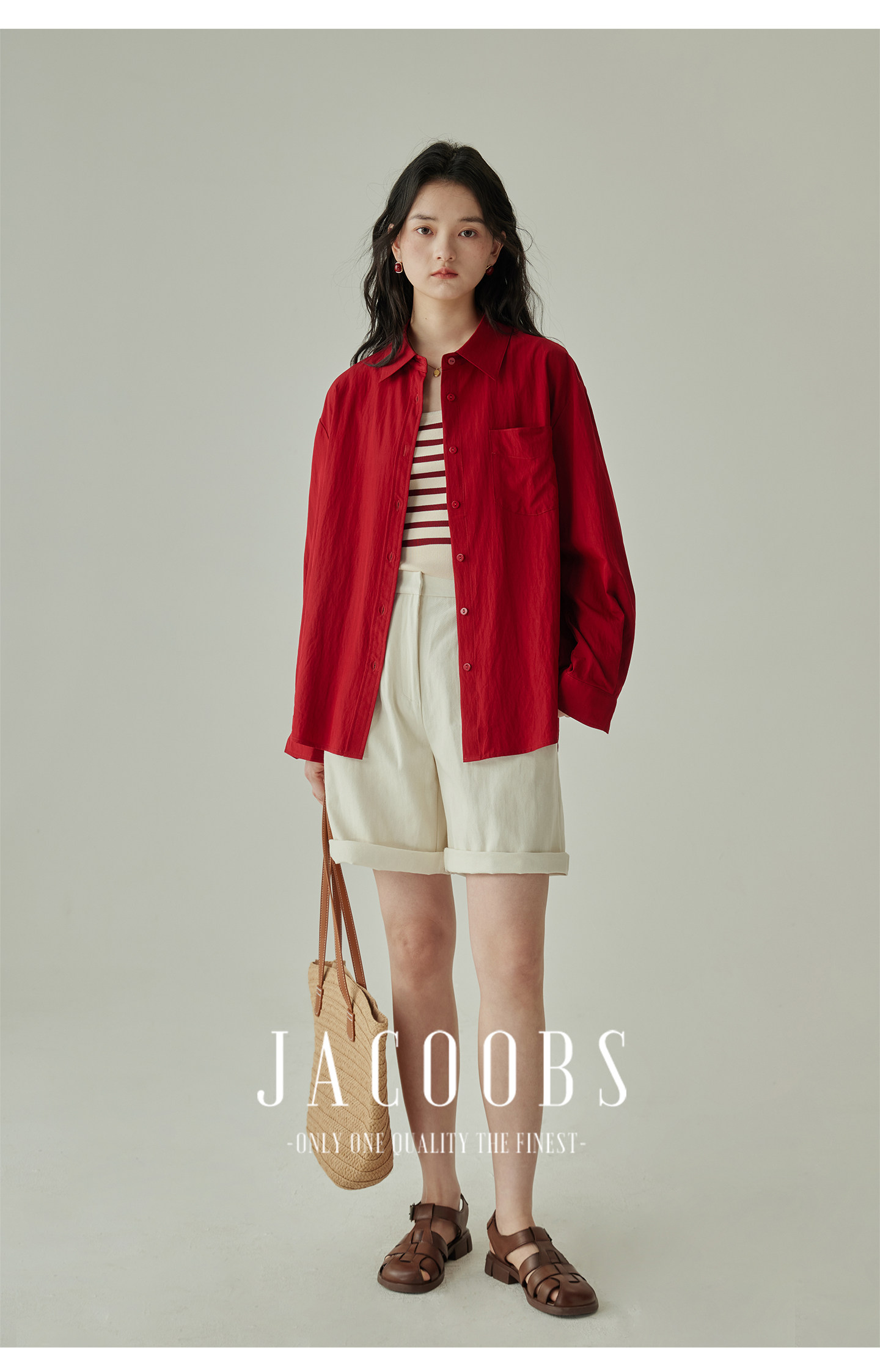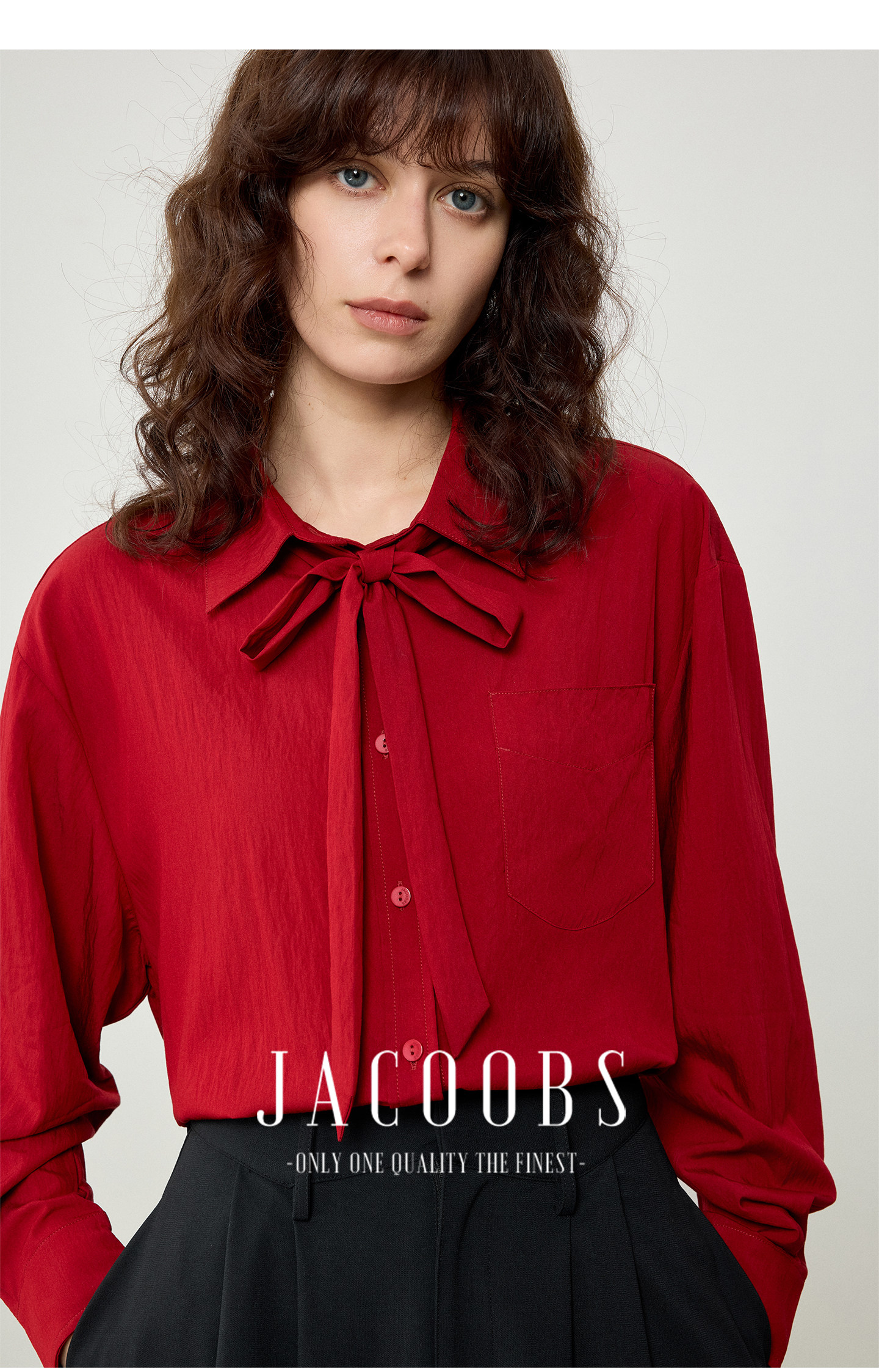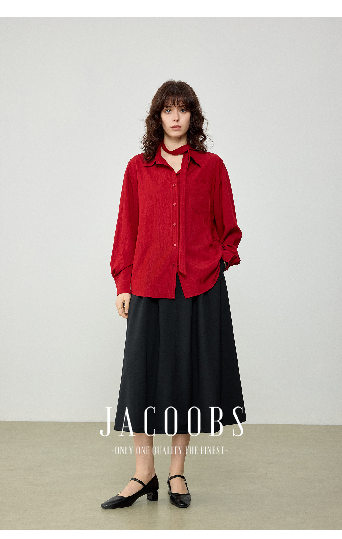 婭可家紅色上衣女設計感小衆春夏新款寬鬆繙領休閒褶皺防曬襯衫女