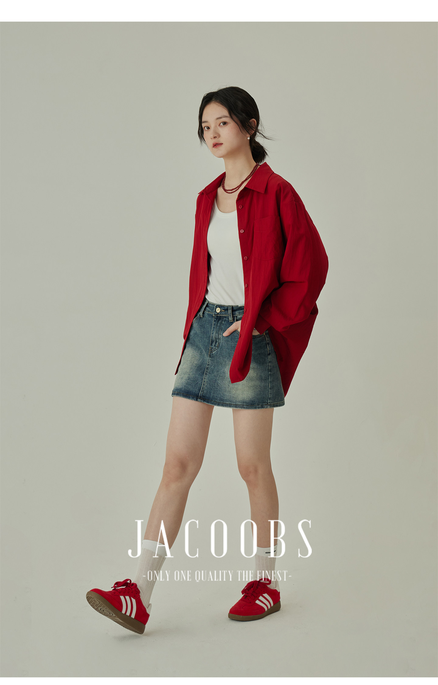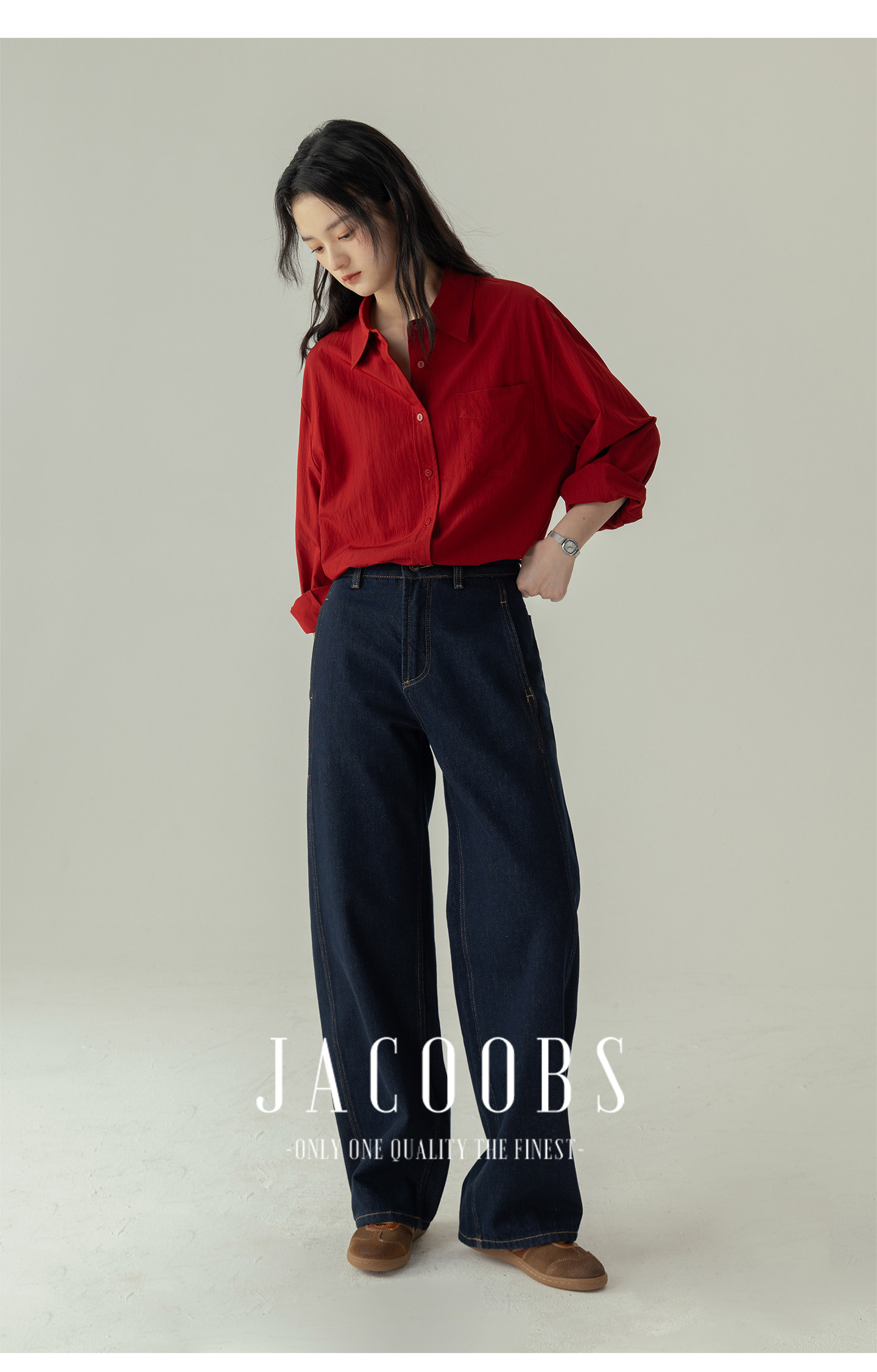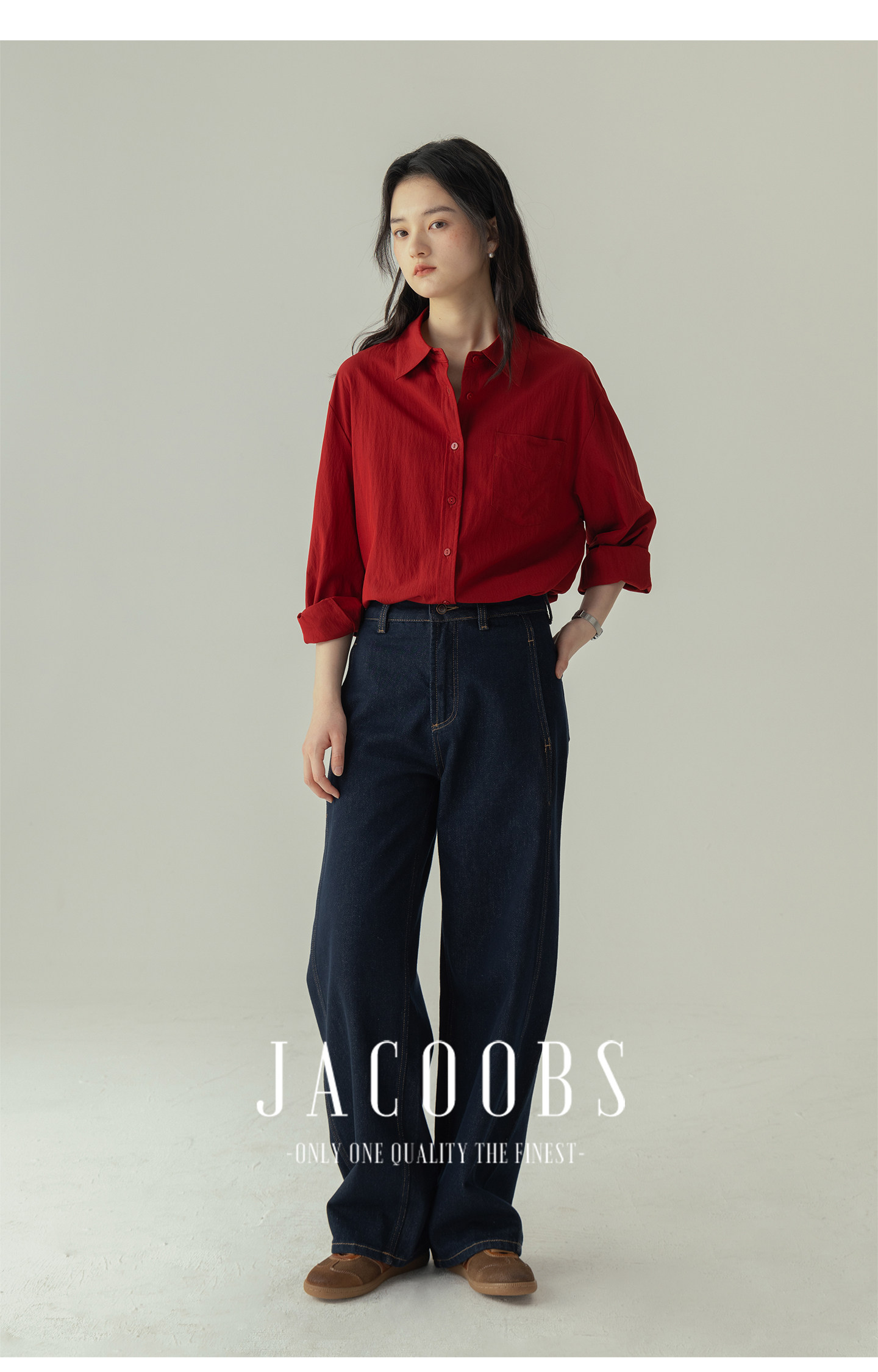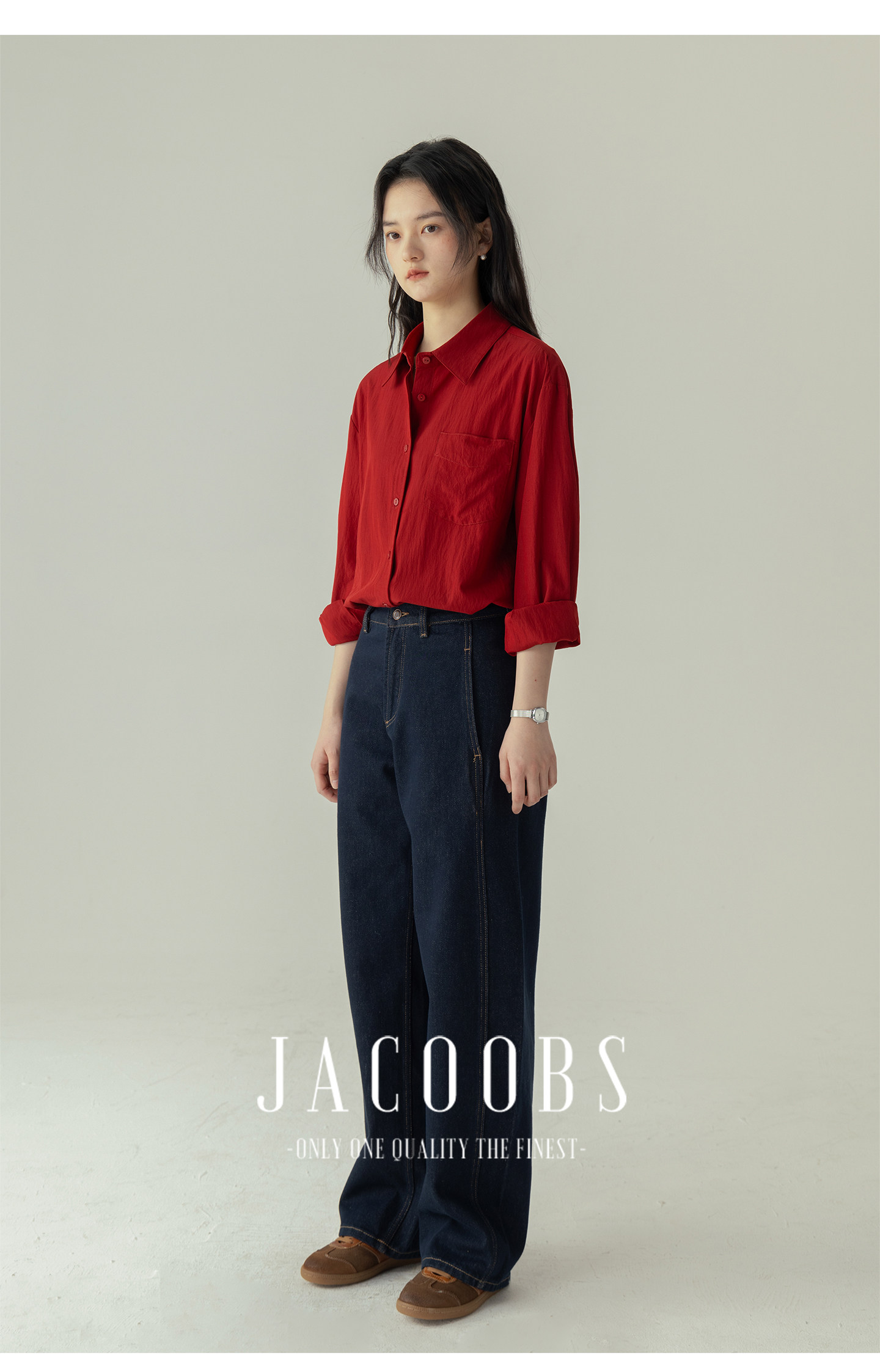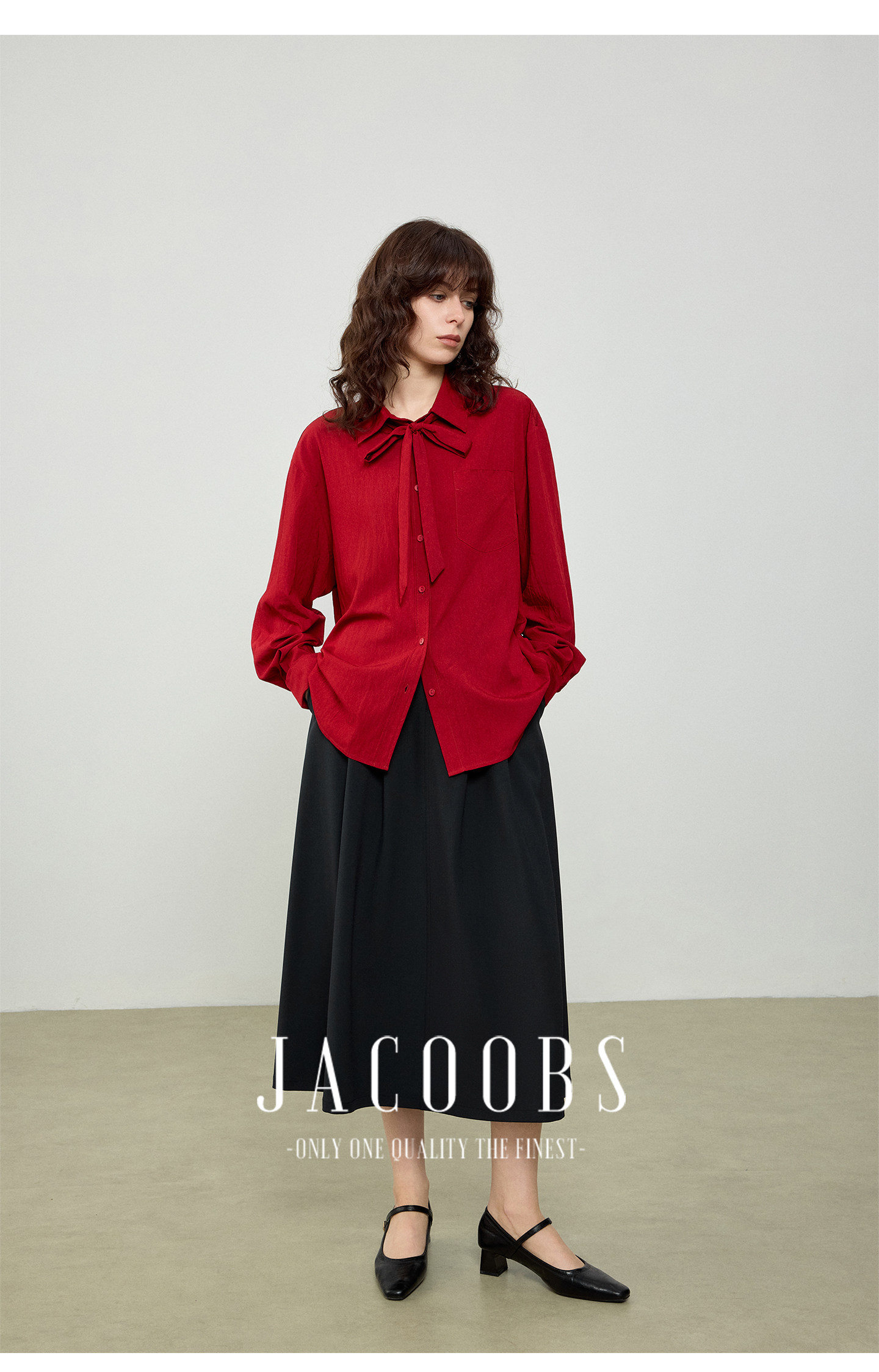 婭可家紅色上衣女設計感小衆春夏新款寬鬆繙領休閒褶皺防曬襯衫女