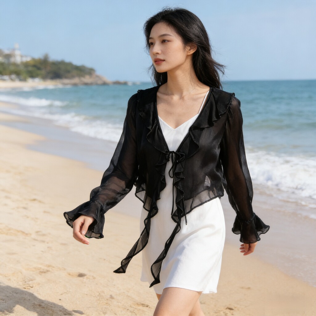 黑色真絲輕薄速乾透氣防曬衣罩衫女短款夏季桑蠶絲開衫配裙子外搭