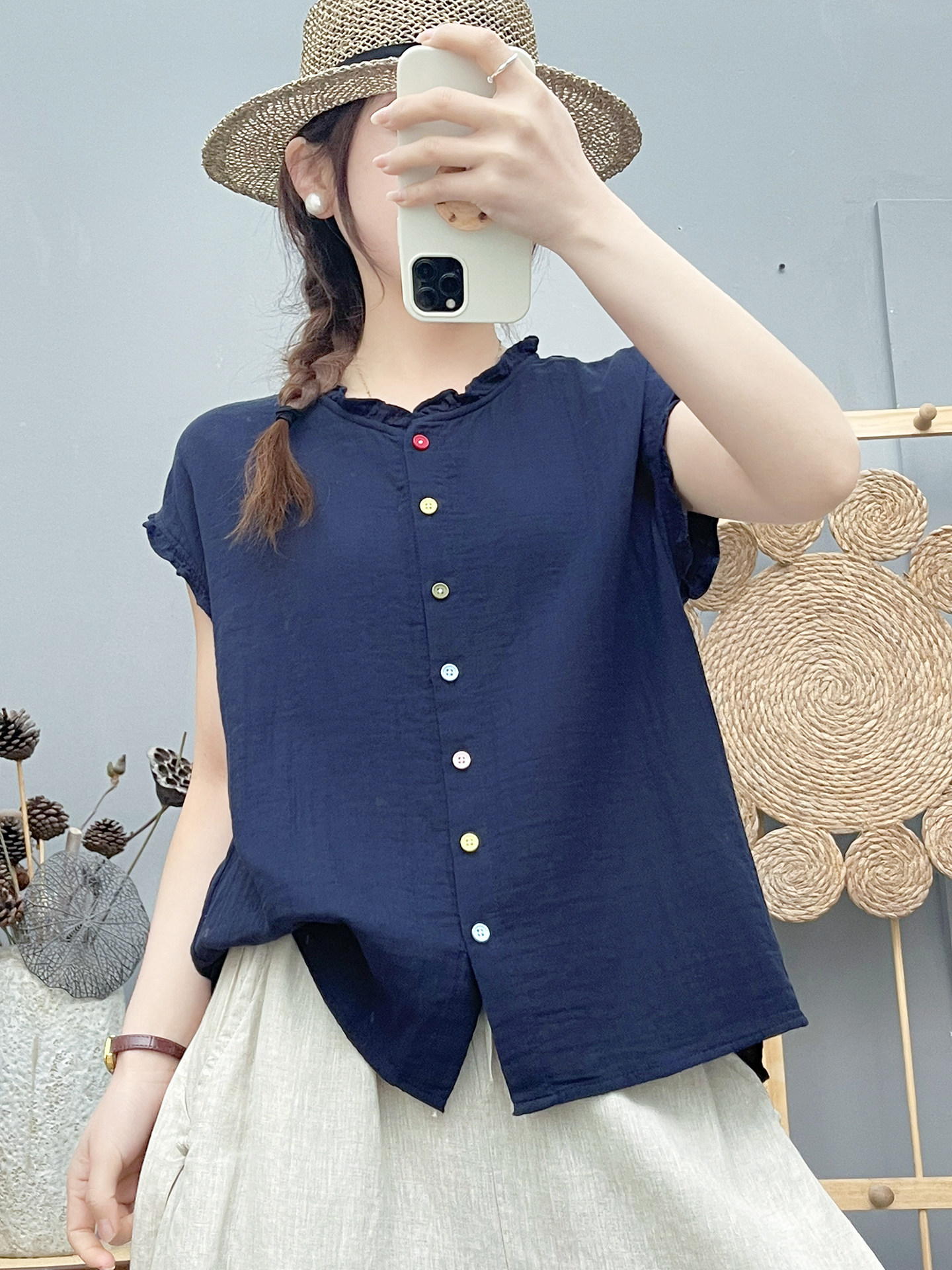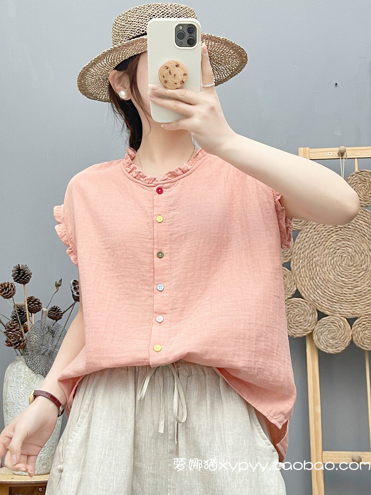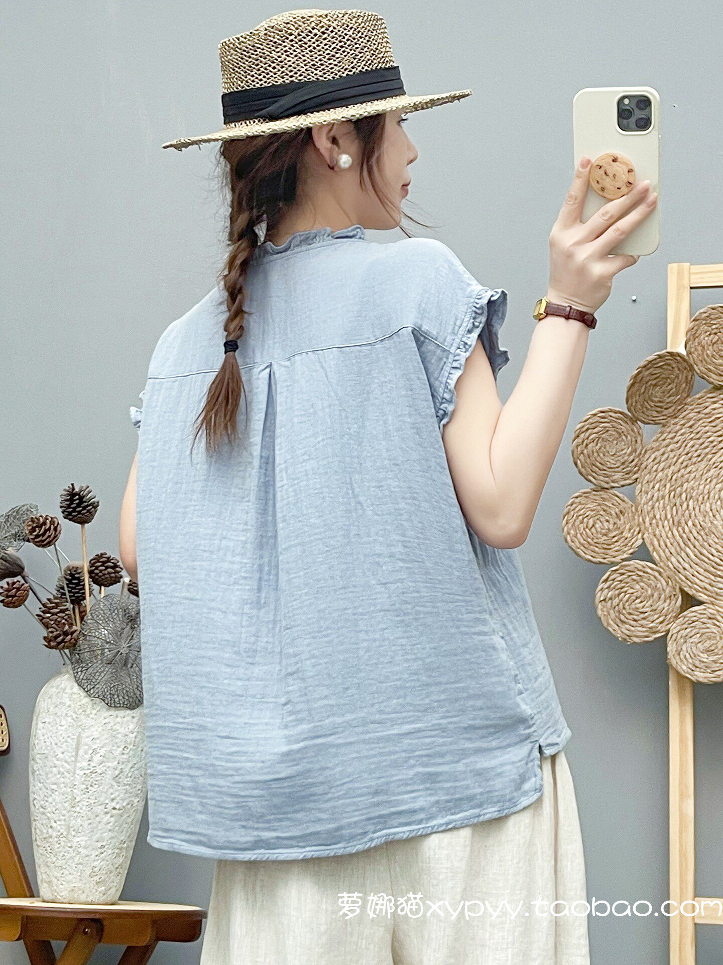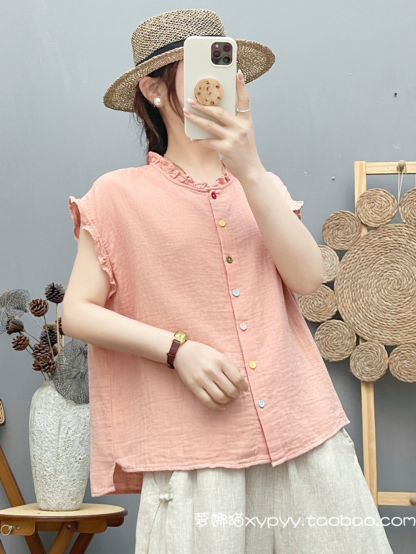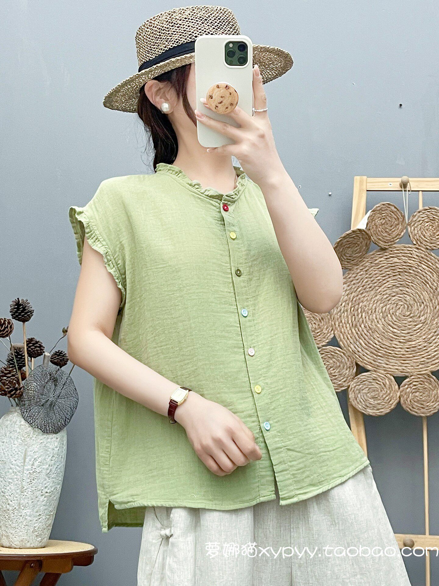 雙層棉紗飛飛袖襯衫女夏裝文藝小清新木耳領柔軟親膚純棉無袖上衣