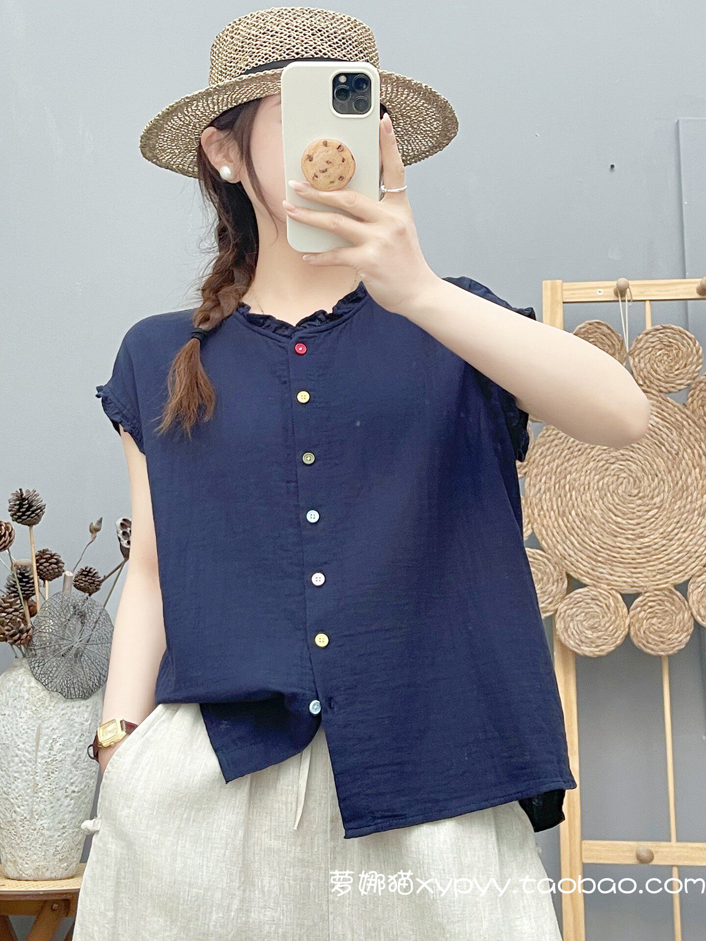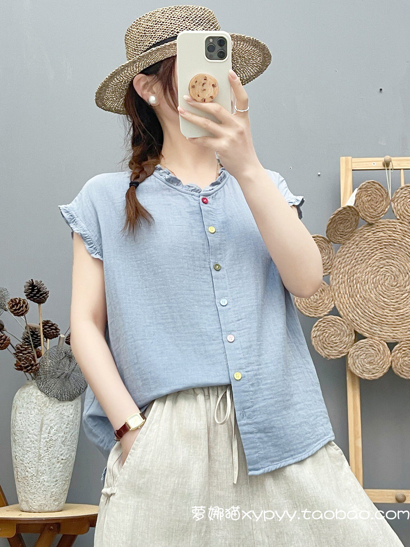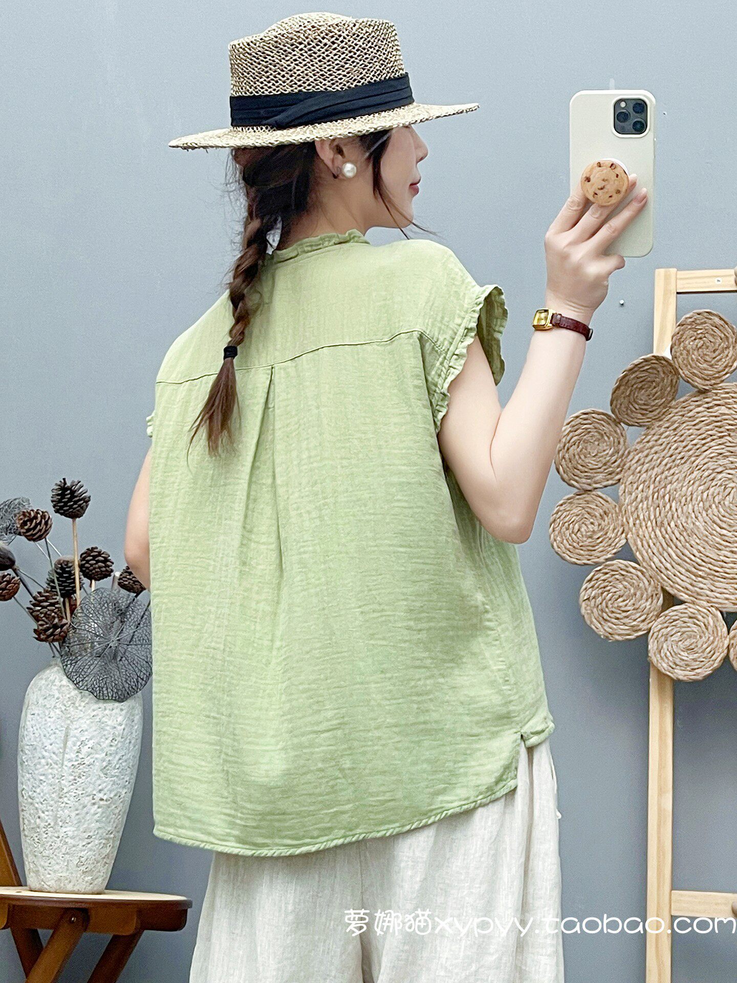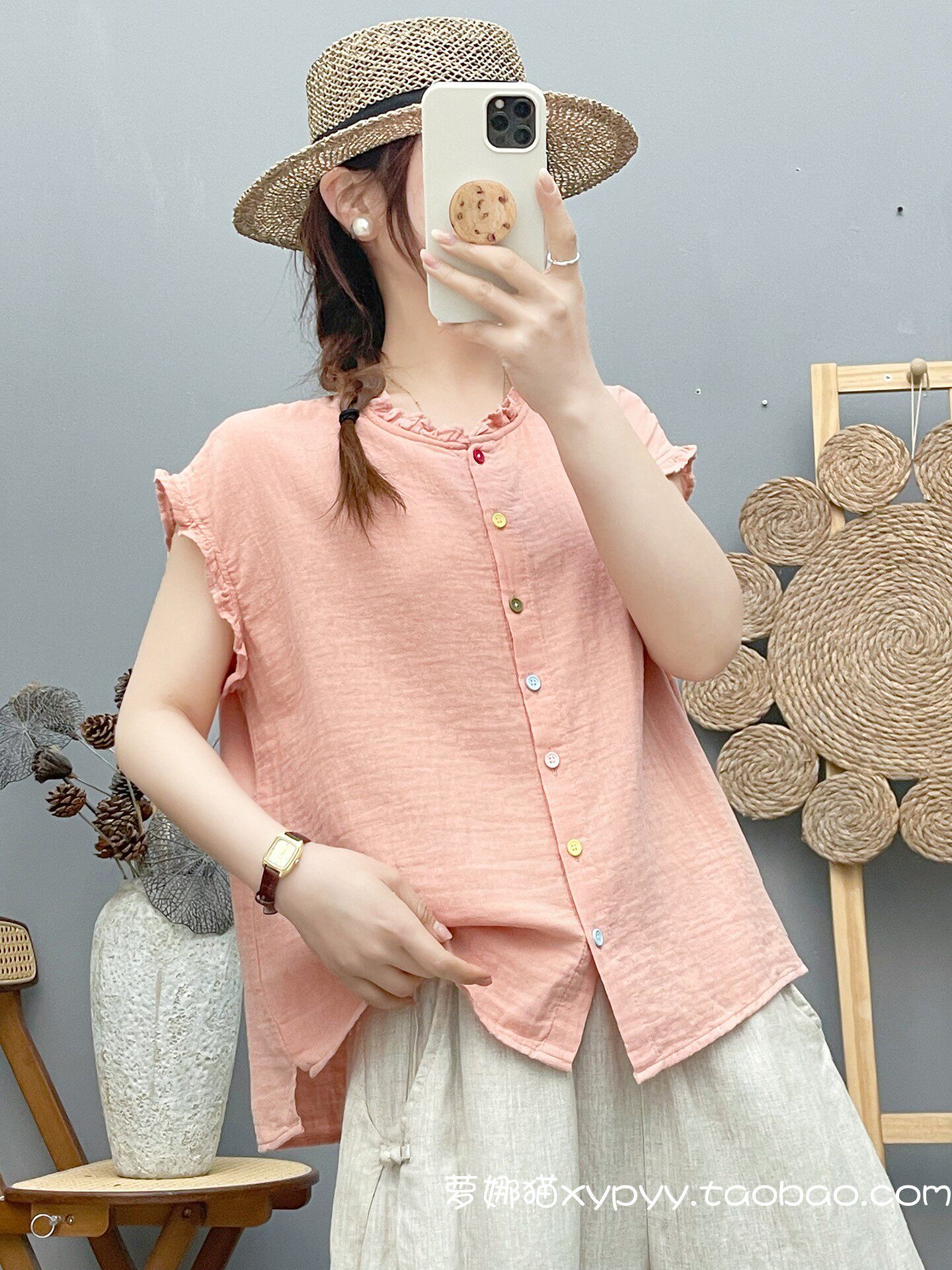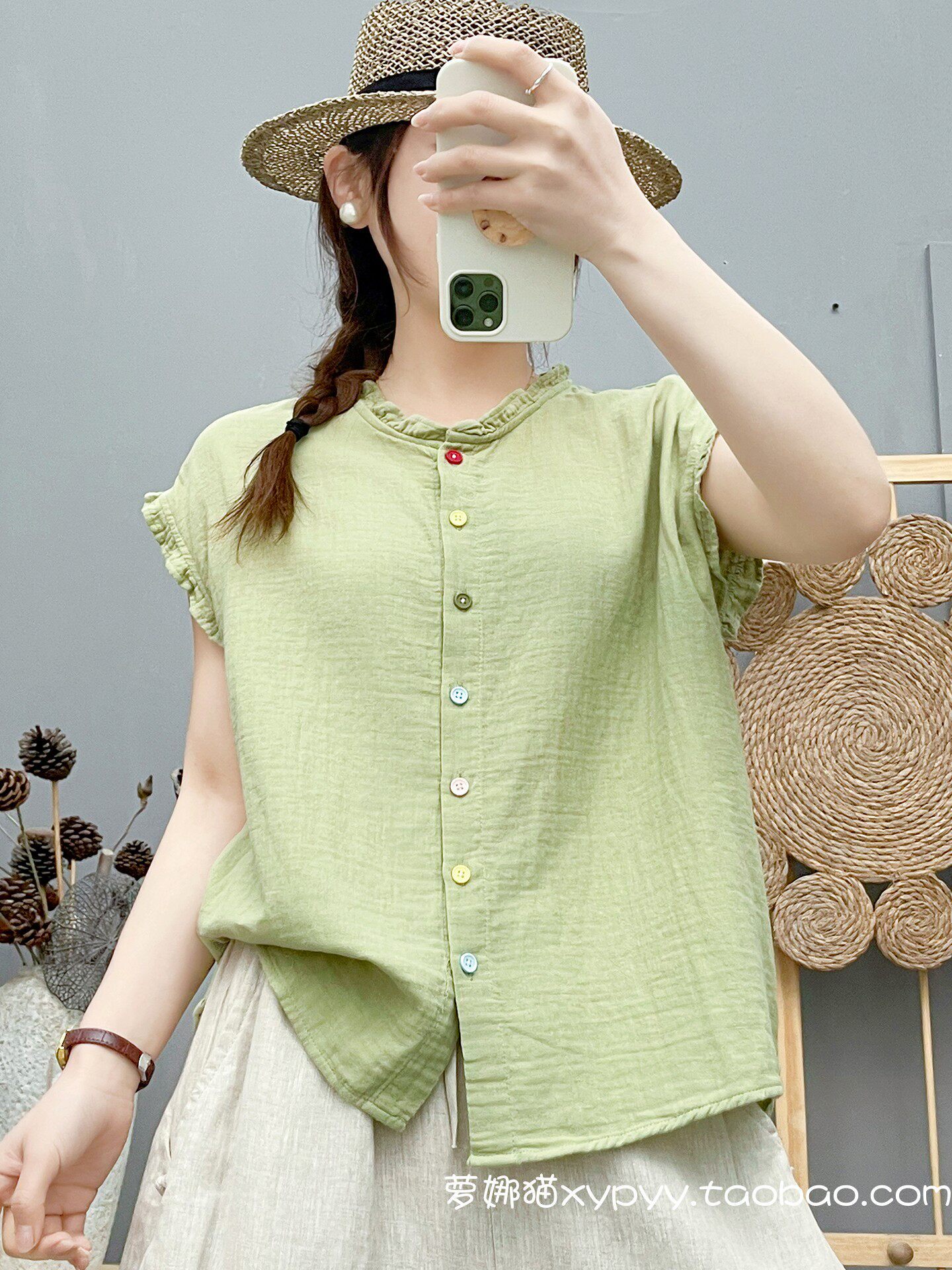 雙層棉紗飛飛袖襯衫女夏裝文藝小清新木耳領柔軟親膚純棉無袖上衣