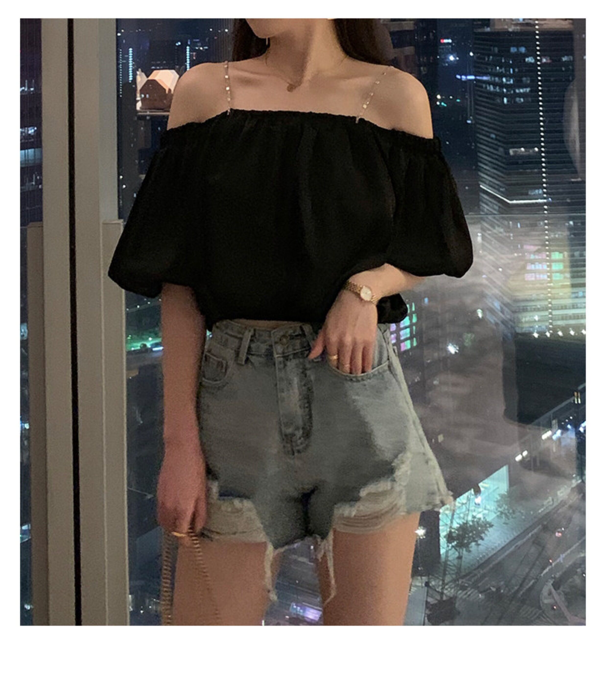 黑色一字肩上衣女夏季鎖骨心機吊帶短袖露肩t恤泡泡袖短款襯衫潮