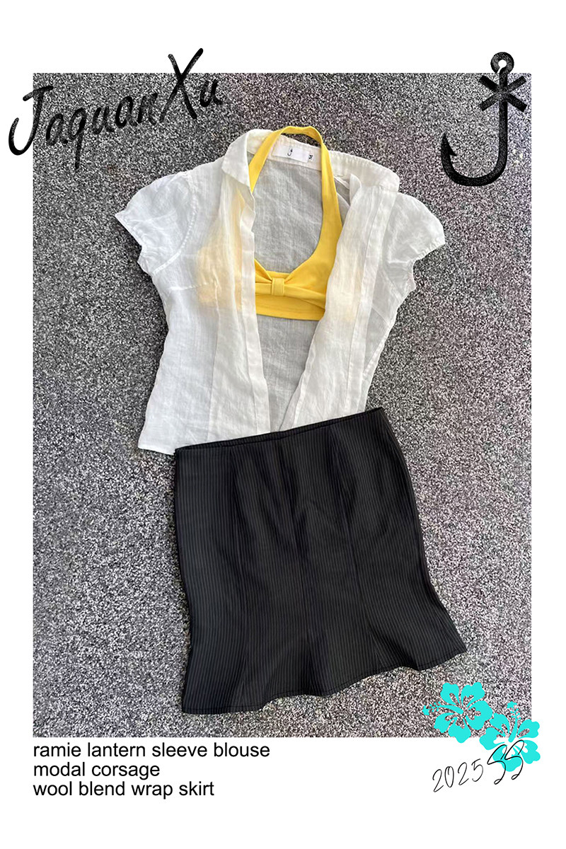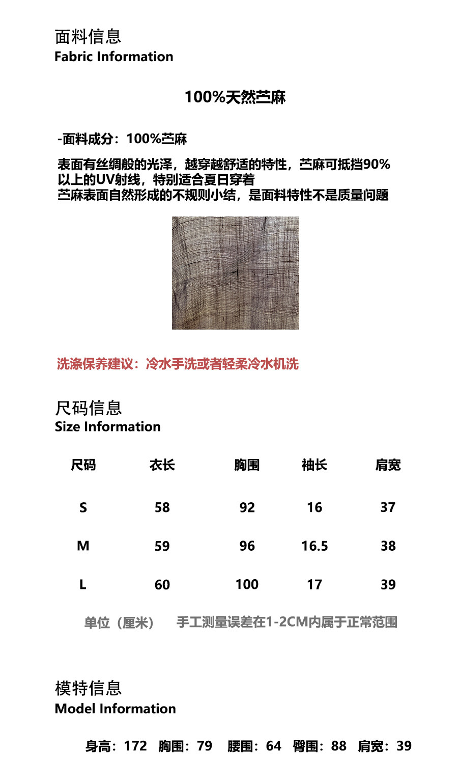 JaquanXu 100%天然苧麻 燈籠袖修身短袖襯衫上衣夏日防曬清透