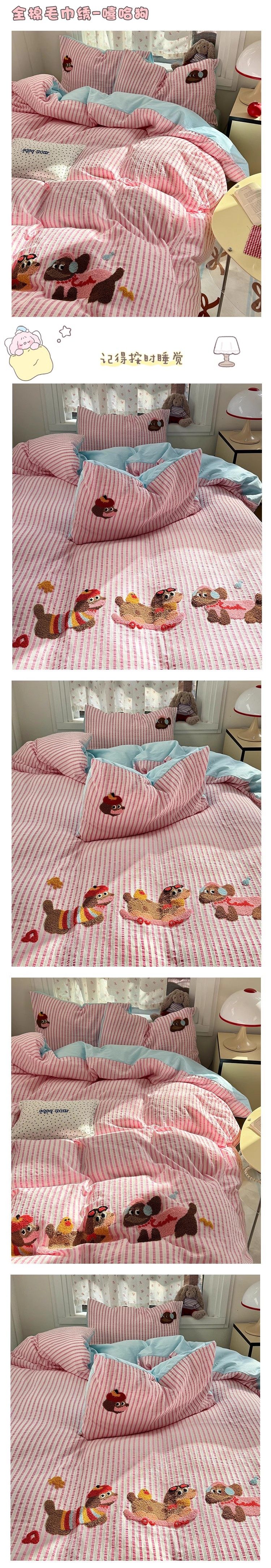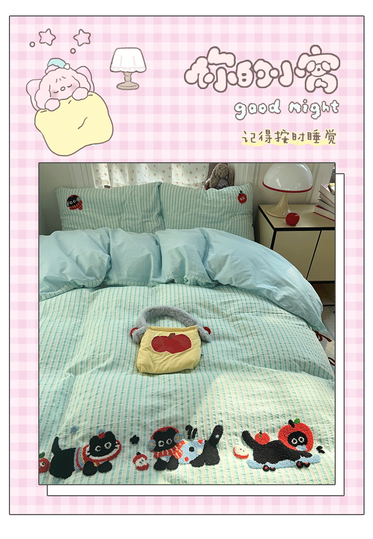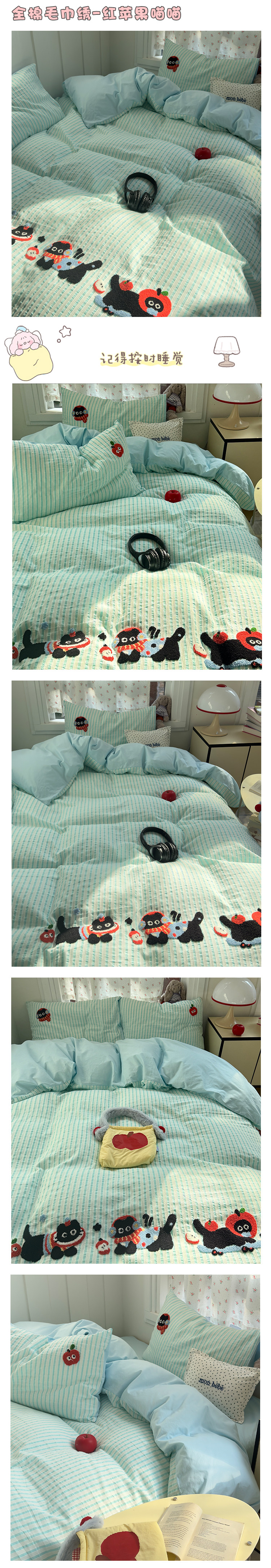ins提花條紋純棉水洗棉四件套可愛蘋果小貓咪毛巾綉全棉被套床單