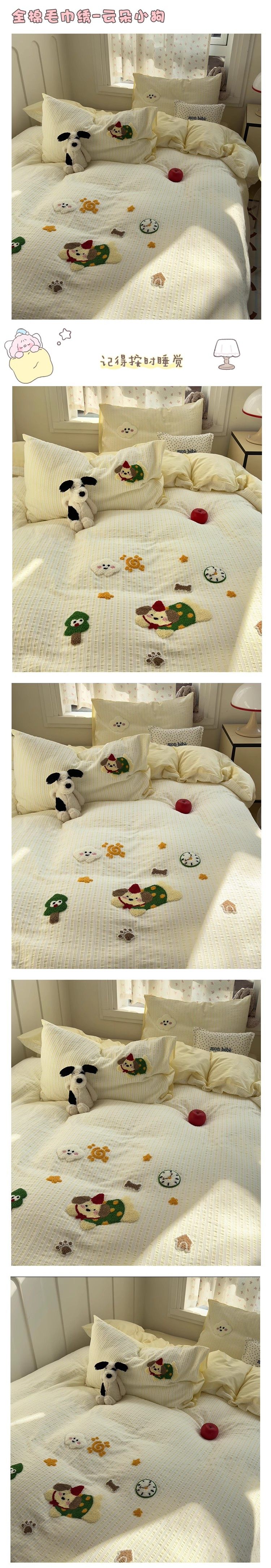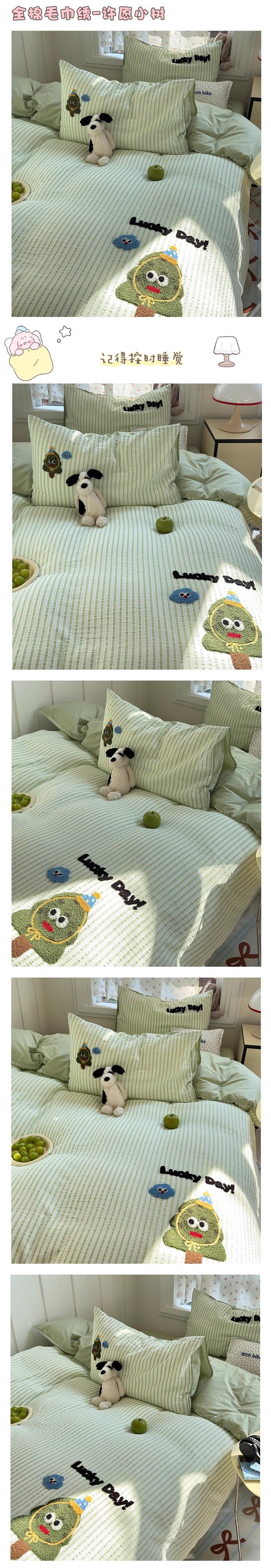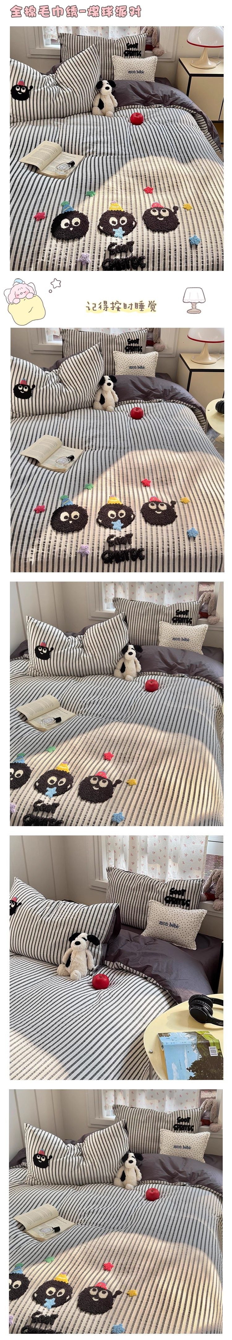 ins提花條紋純棉水洗棉四件套可愛蘋果小貓咪毛巾綉全棉被套床單