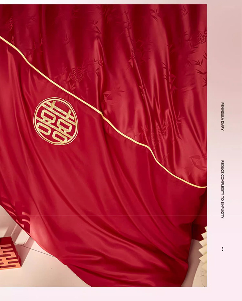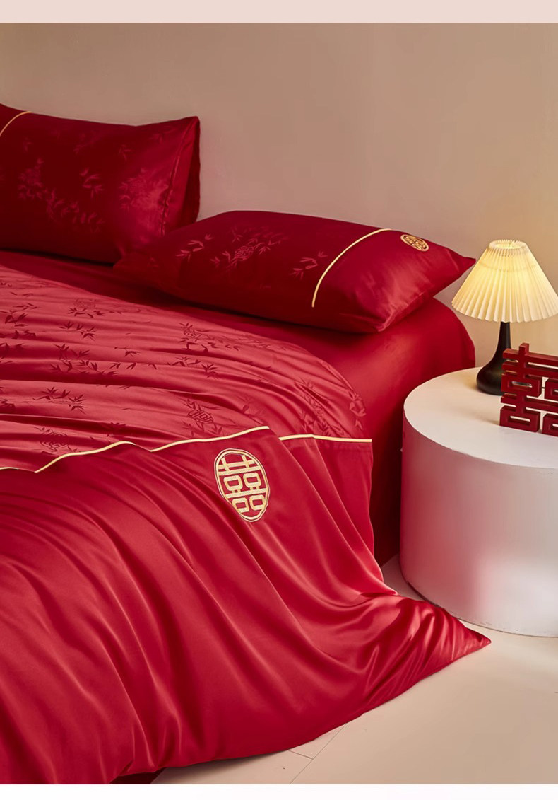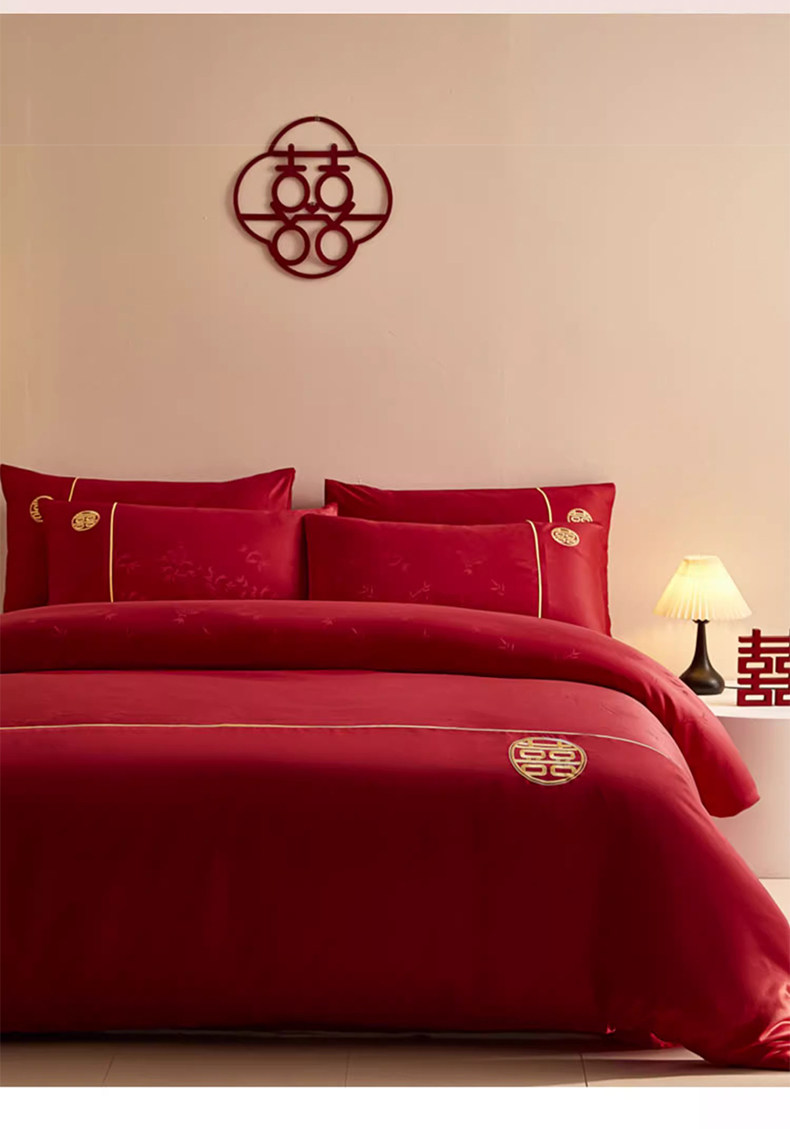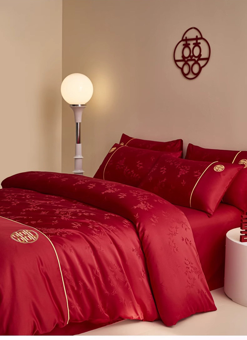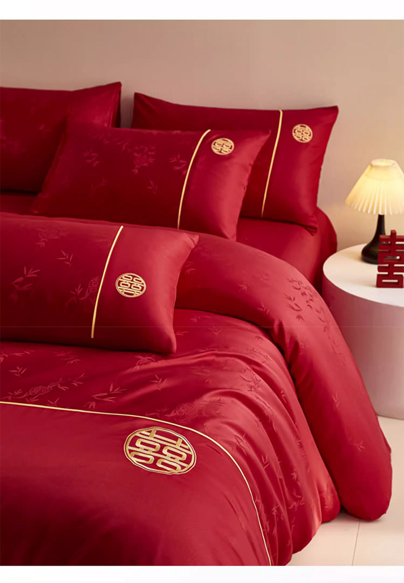 高檔提花結婚床上四件套婚慶大紅色非純棉全棉被套新婚房喜被床單