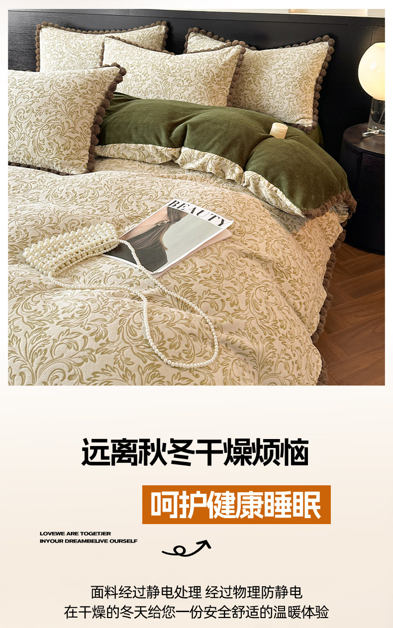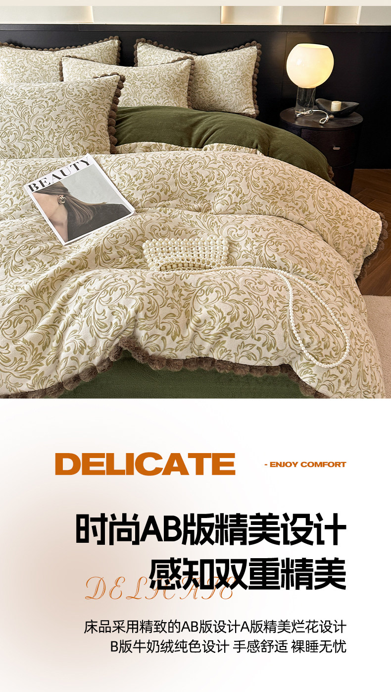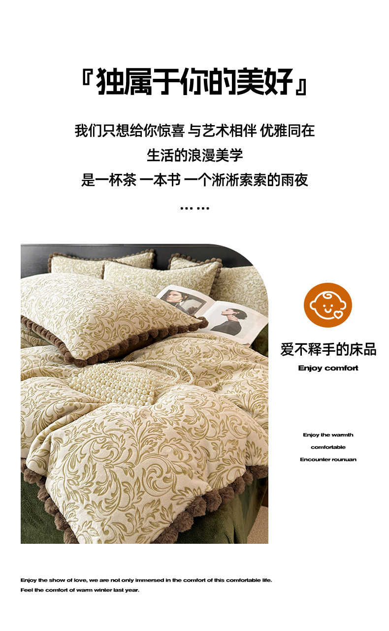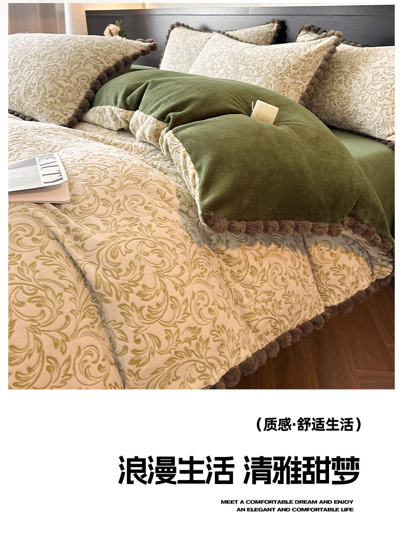 法式兔毛球雕花牛奶絨床上四件套高級感冬季加厚珊瑚絨被套床單三