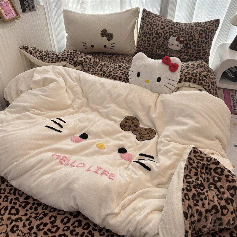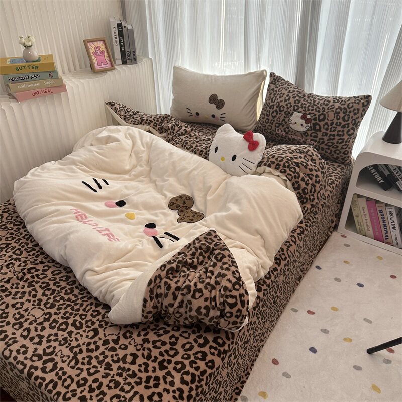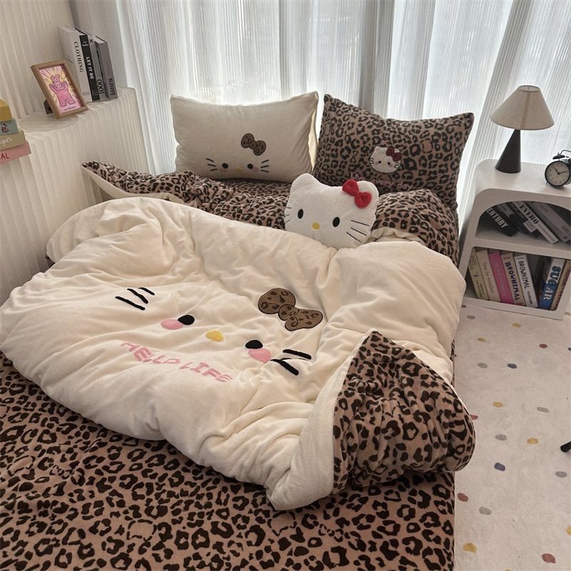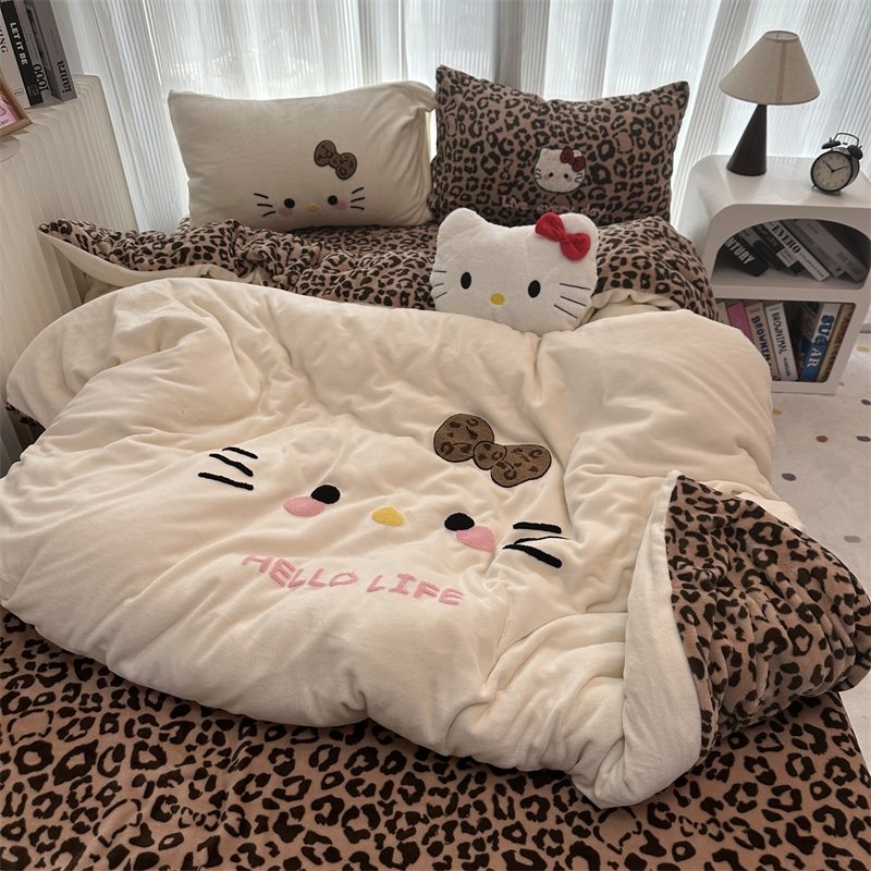 豹紋少女心可愛白色貓咪牛奶絨冬季加厚保暖四件套雙面絨三件套