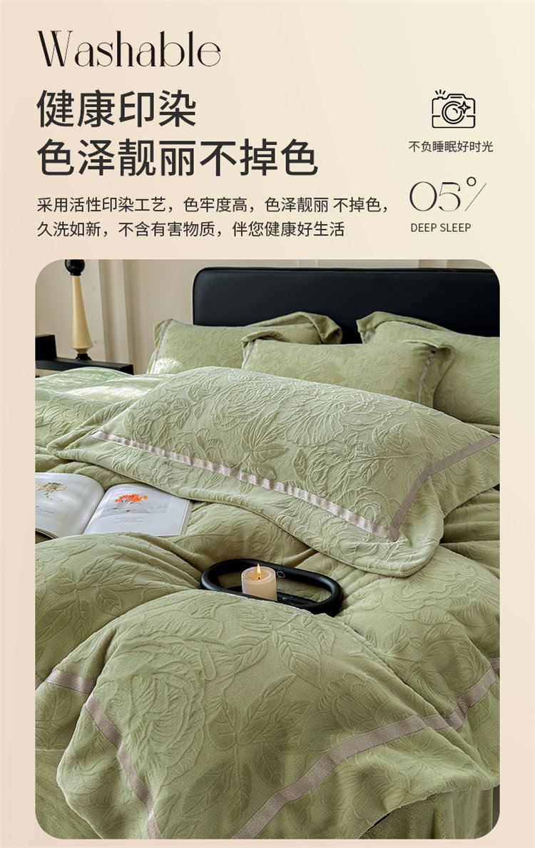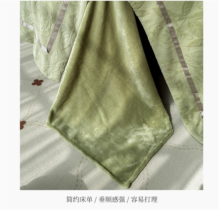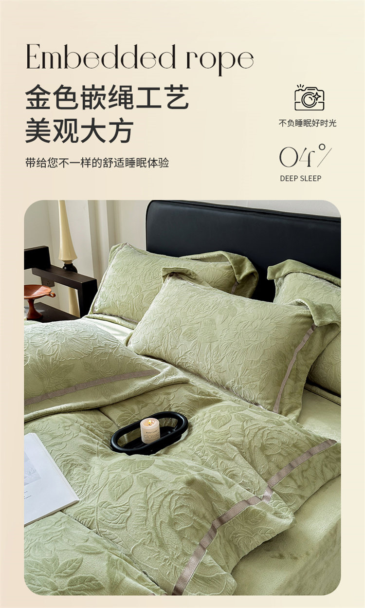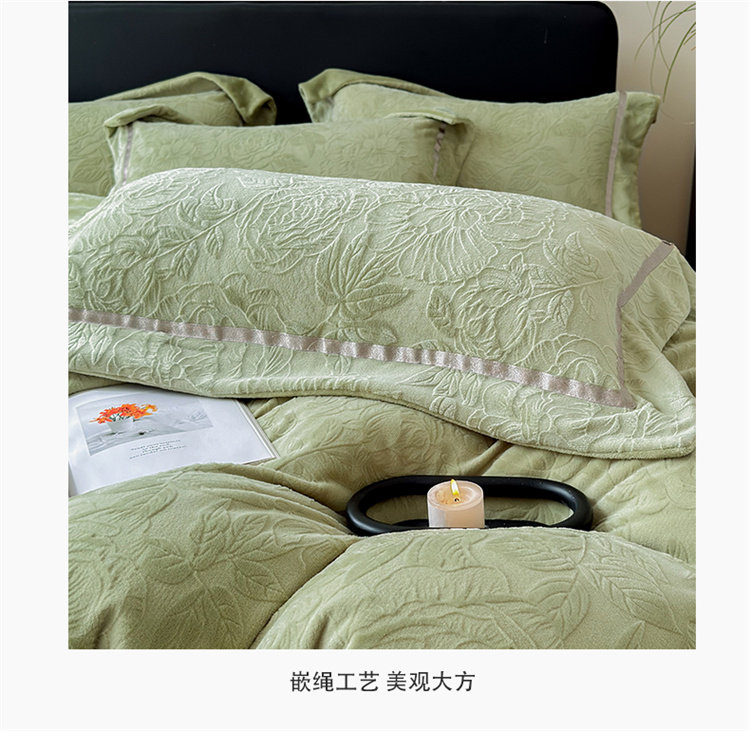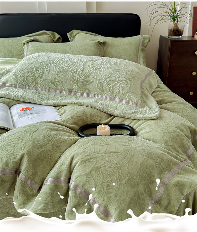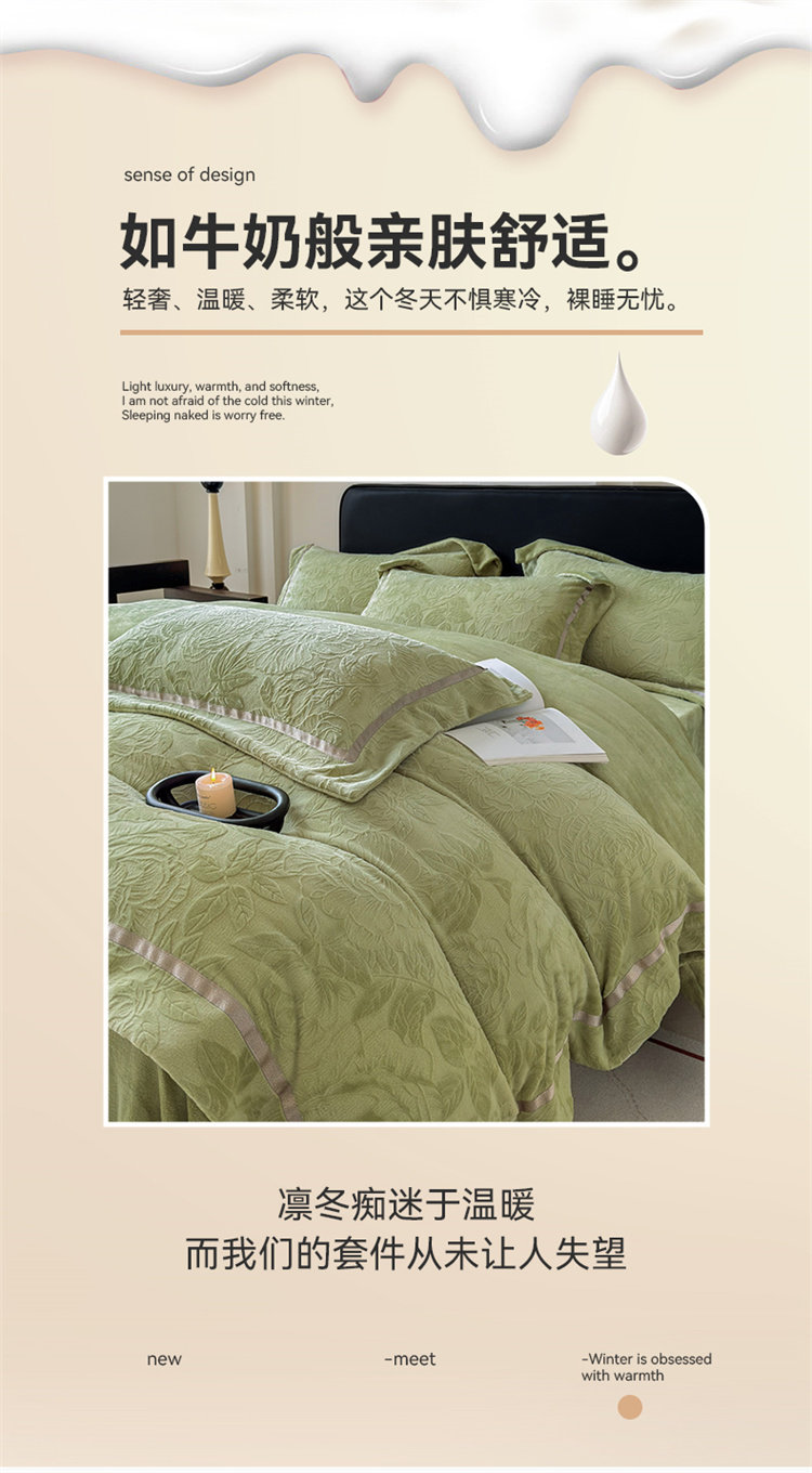 復古綠色雕花牛奶絨高級四件套大氣輕奢被套珊瑚毛絨床單冬季床品