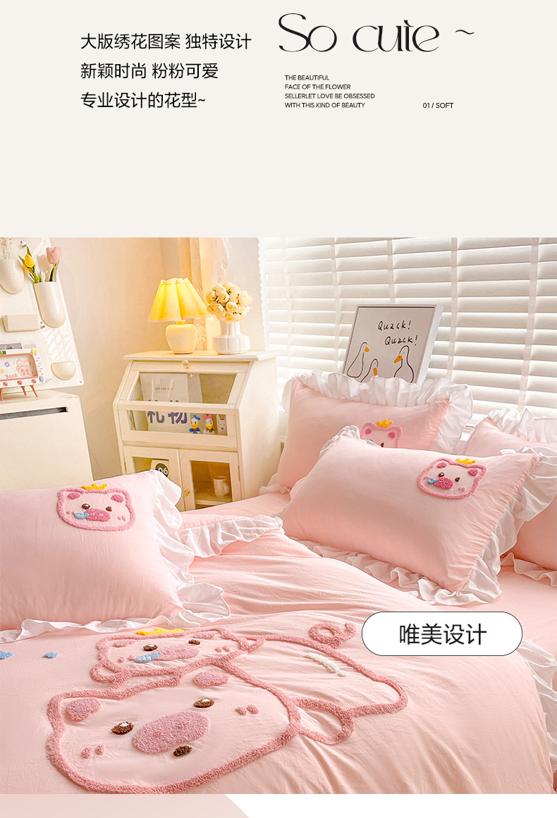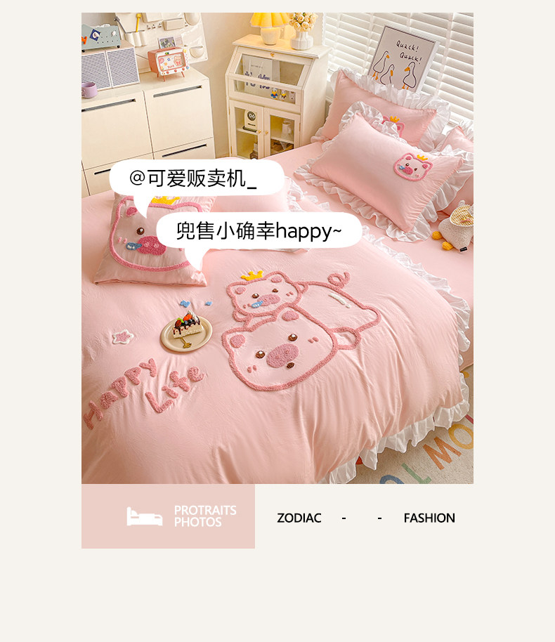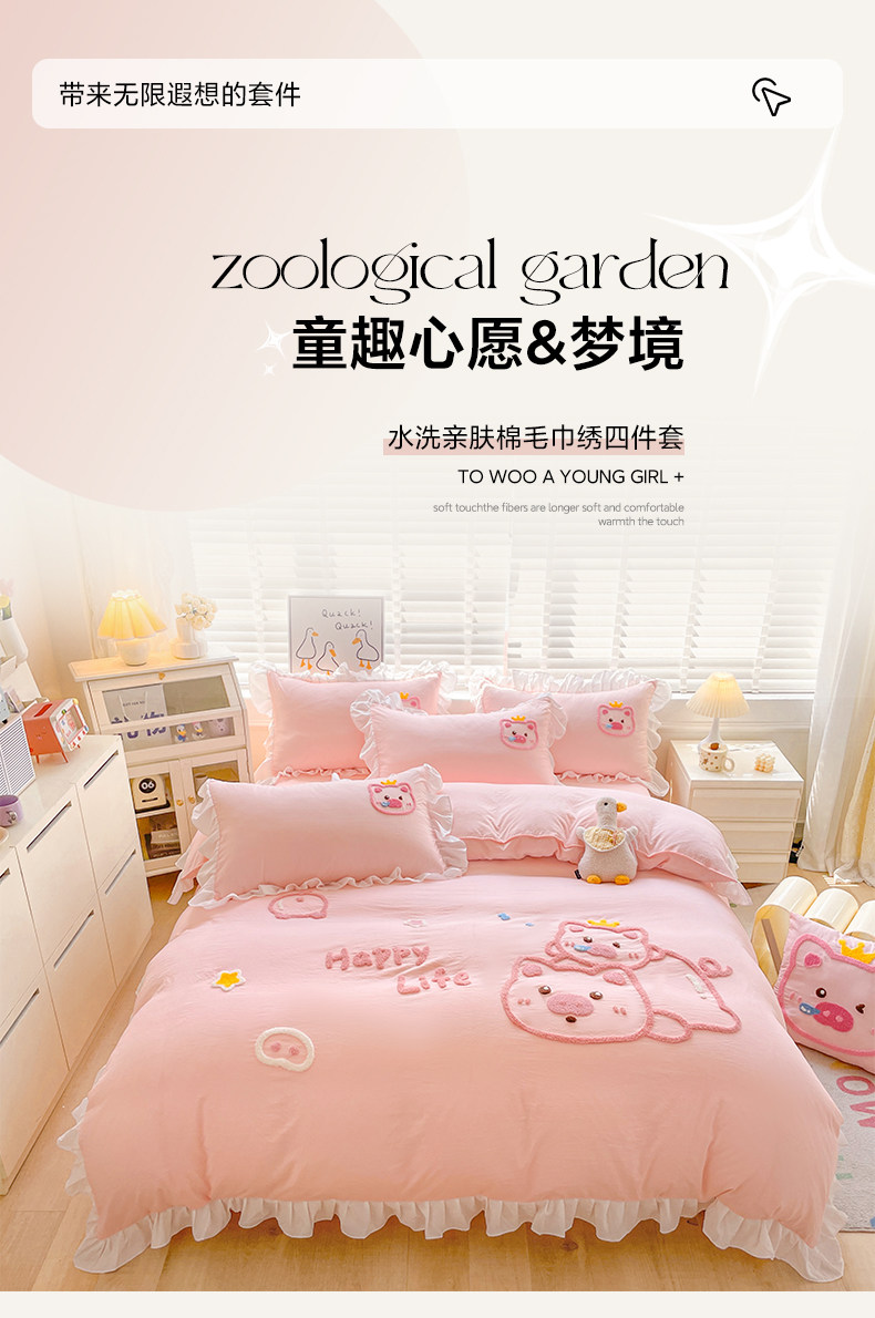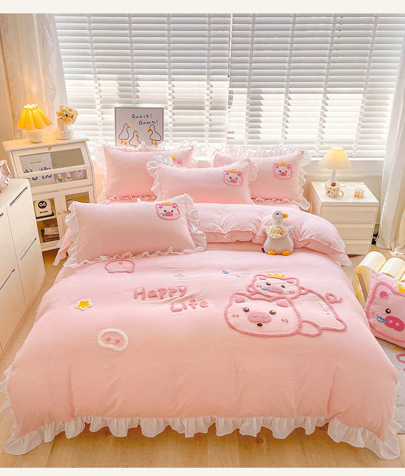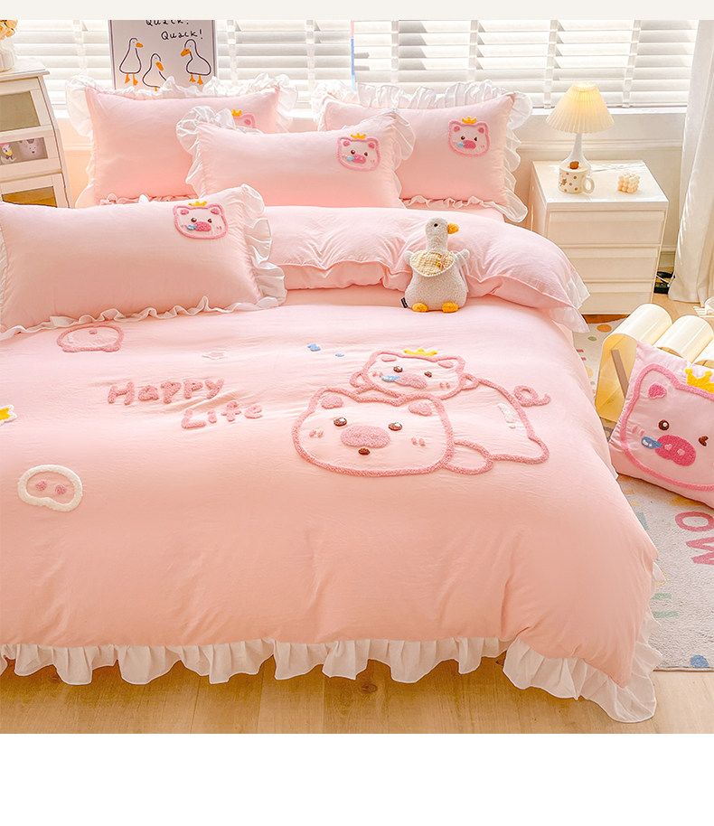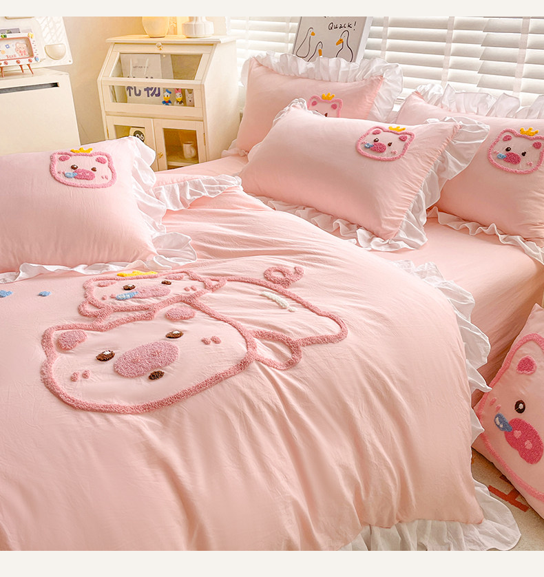 可愛花邊四件套萌豬毛巾綉非全棉純棉被罩裸睡少女床罩床包三件套