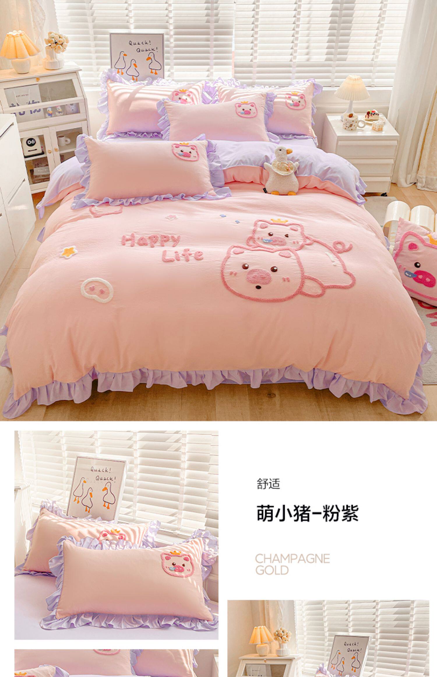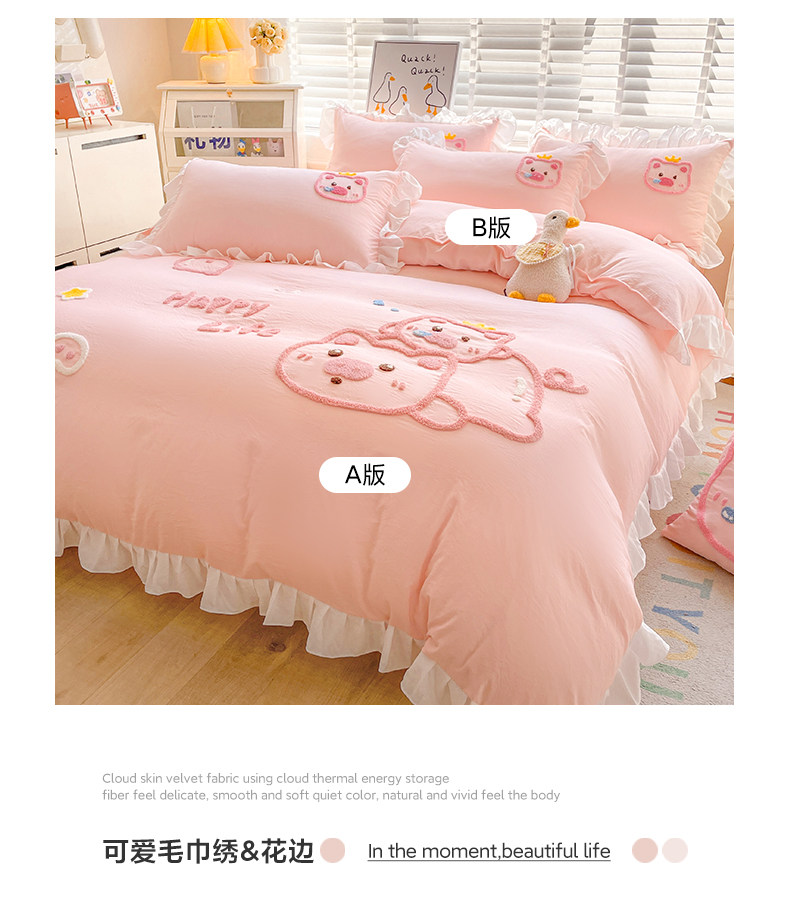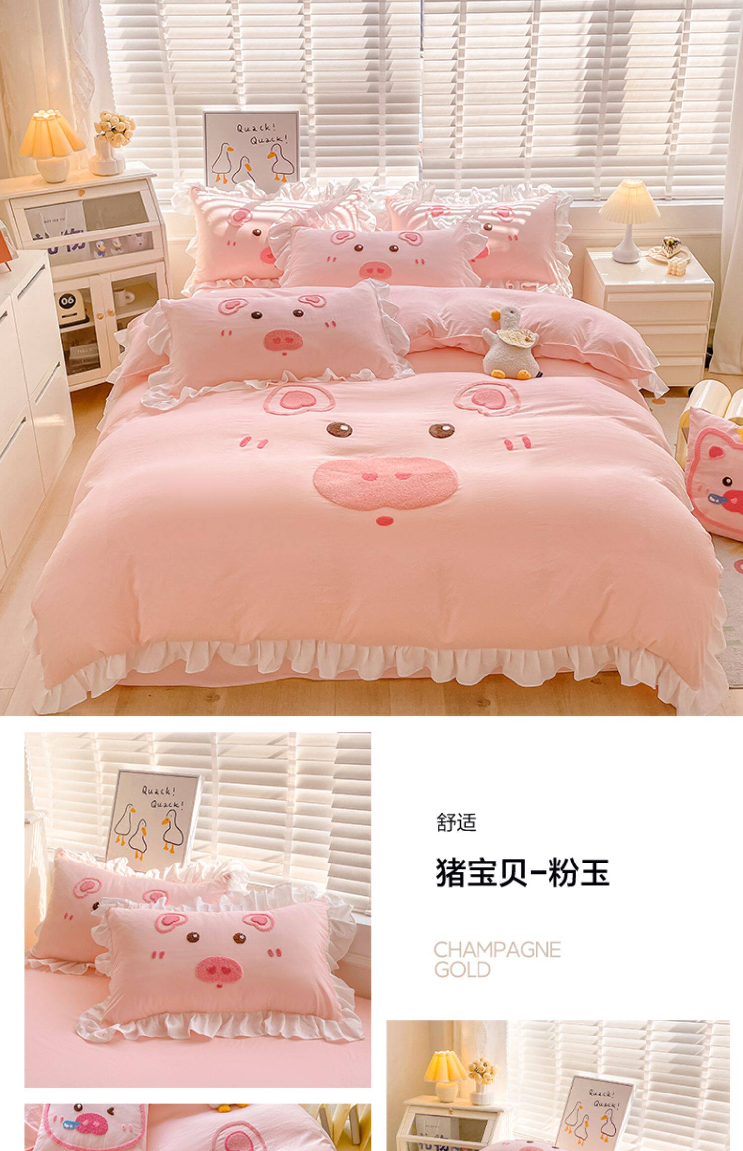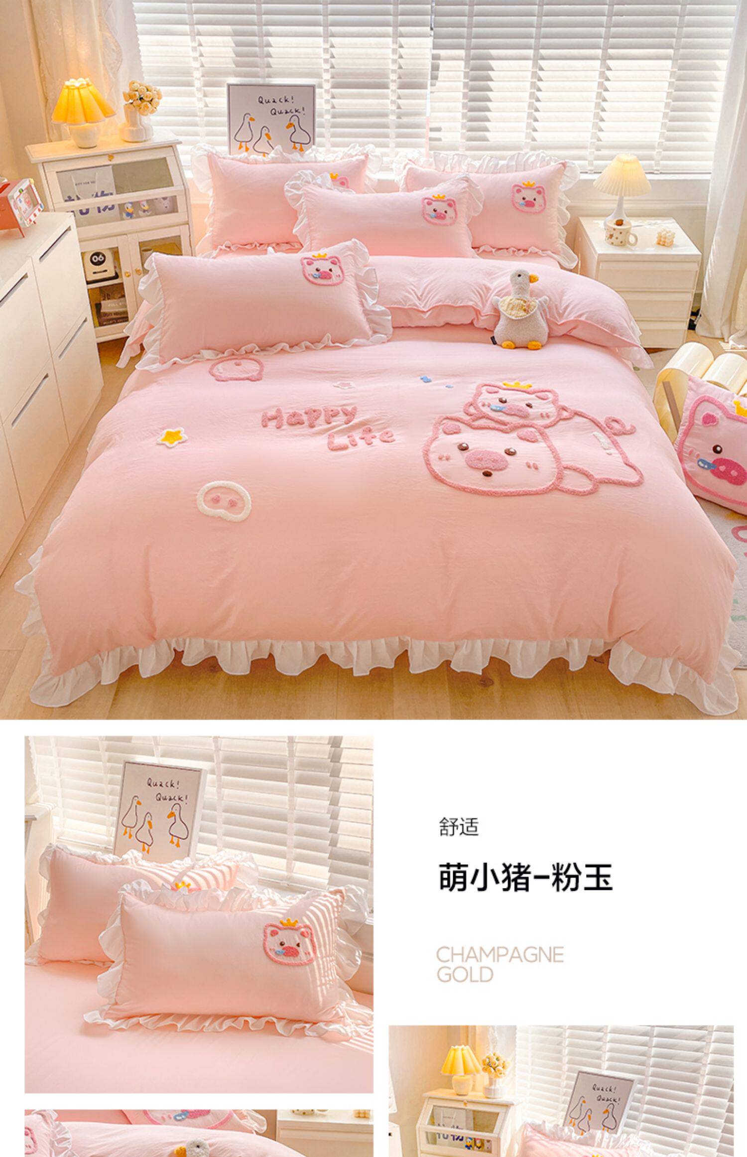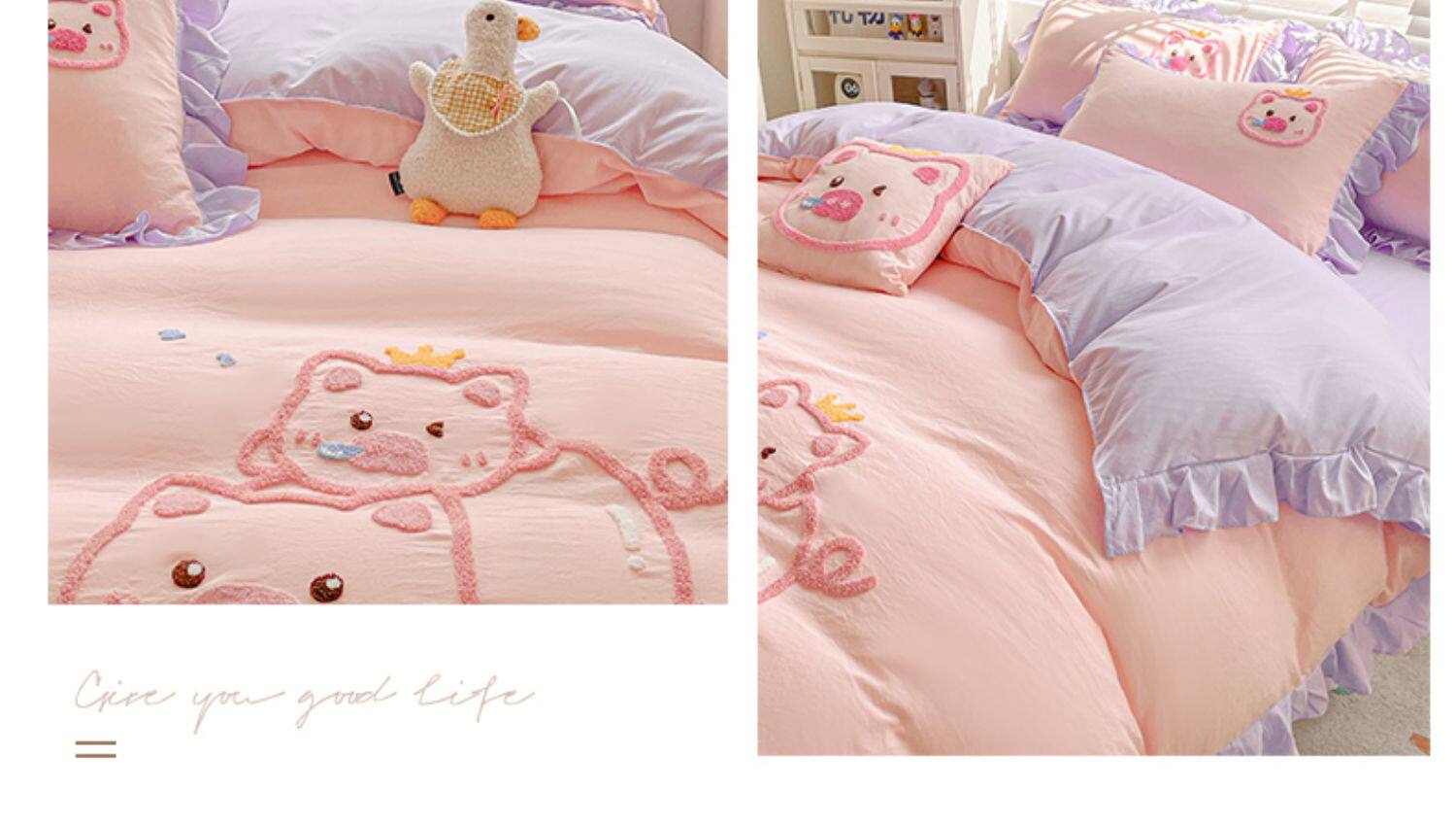 可愛花邊四件套萌豬毛巾綉非全棉純棉被罩裸睡少女床罩床包三件套