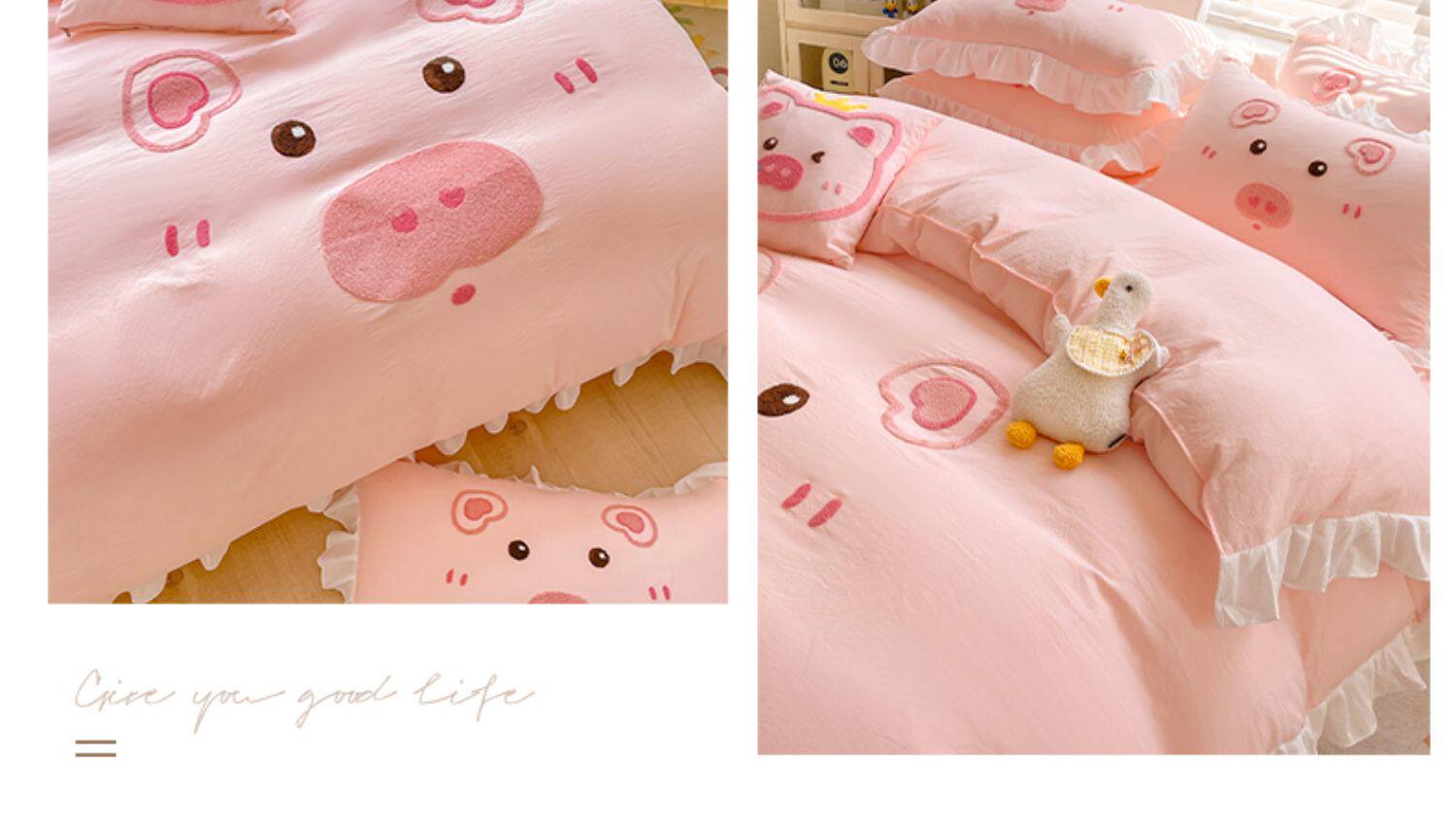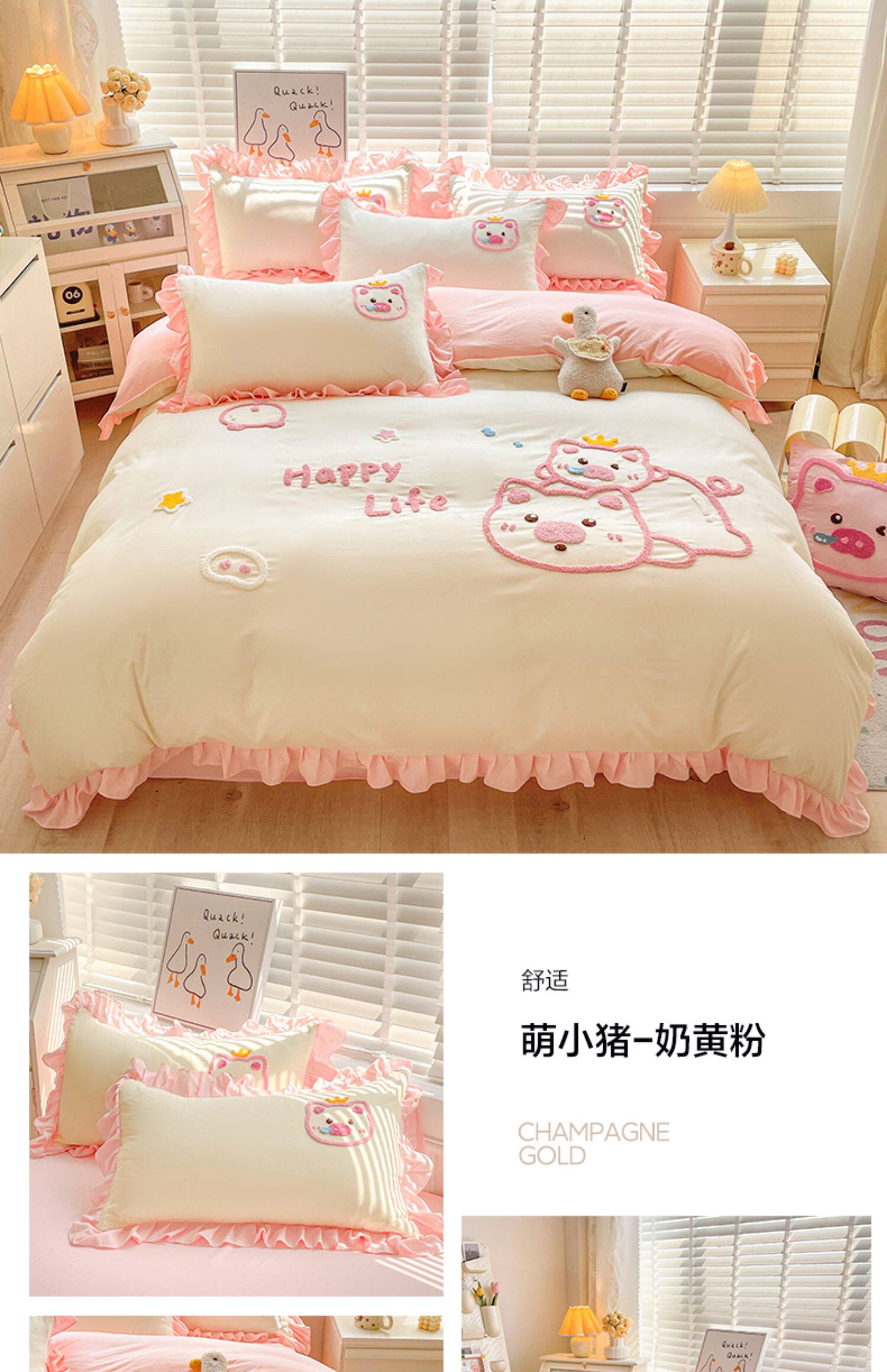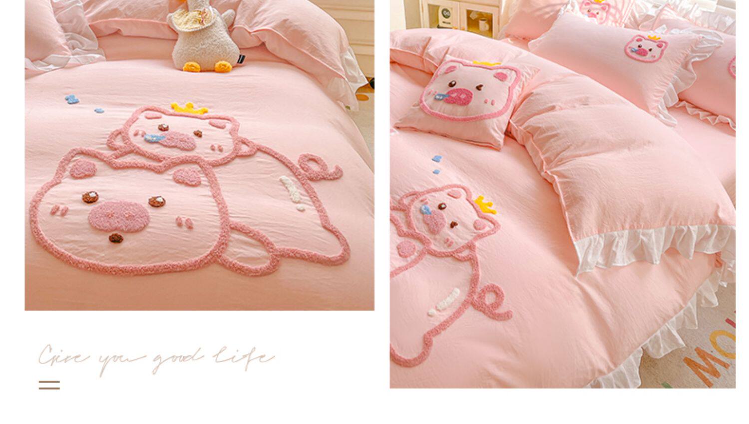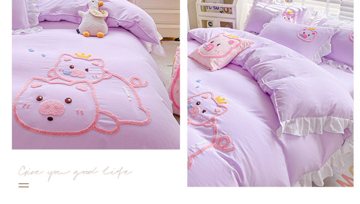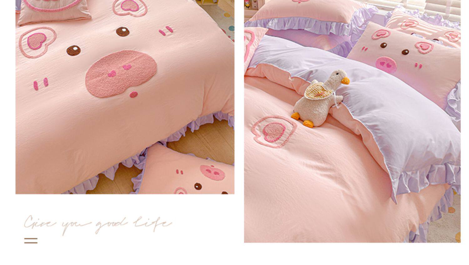 可愛花邊四件套萌豬毛巾綉非全棉純棉被罩裸睡少女床罩床包三件套