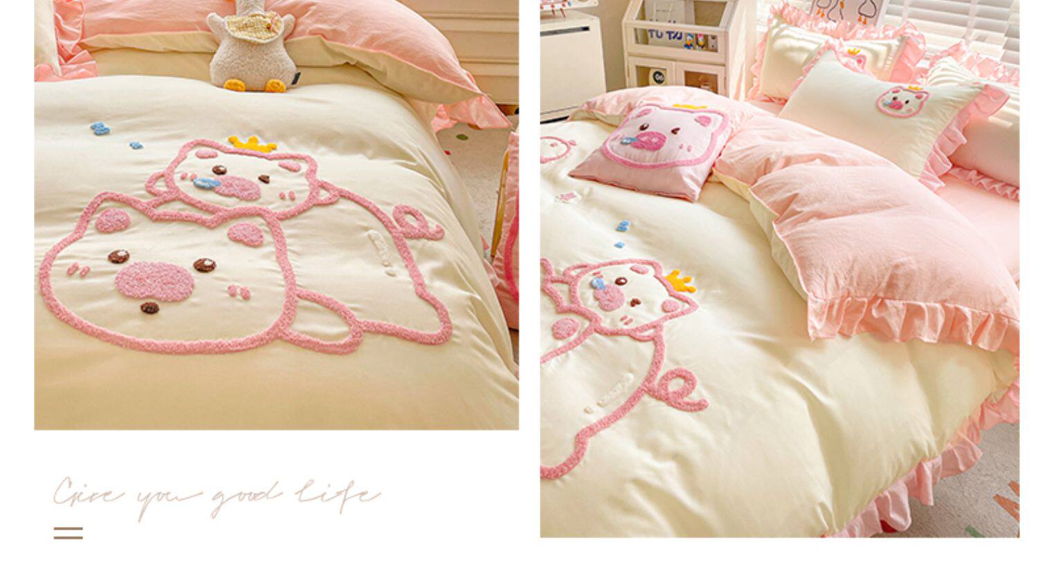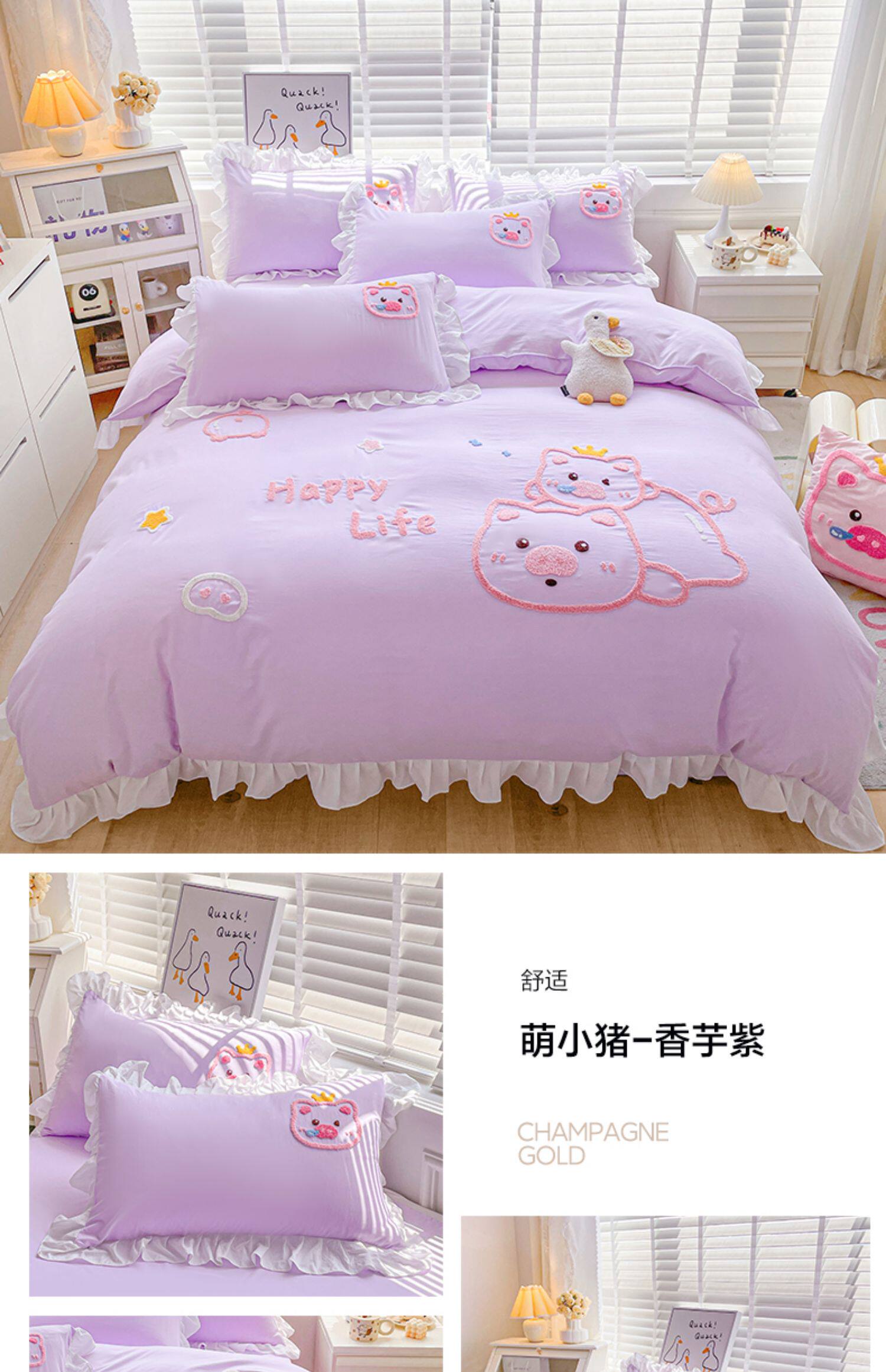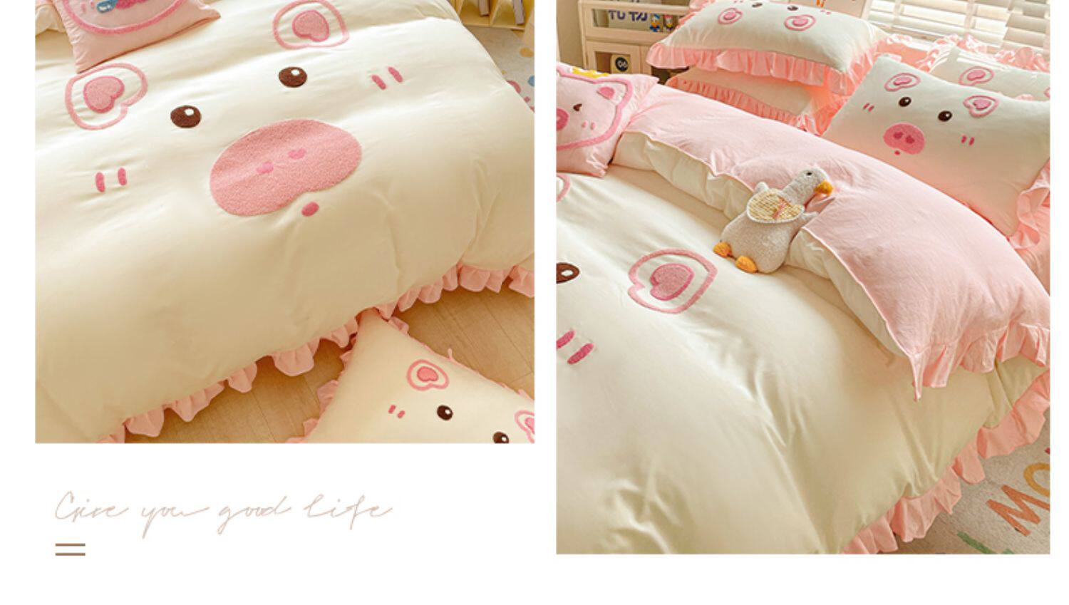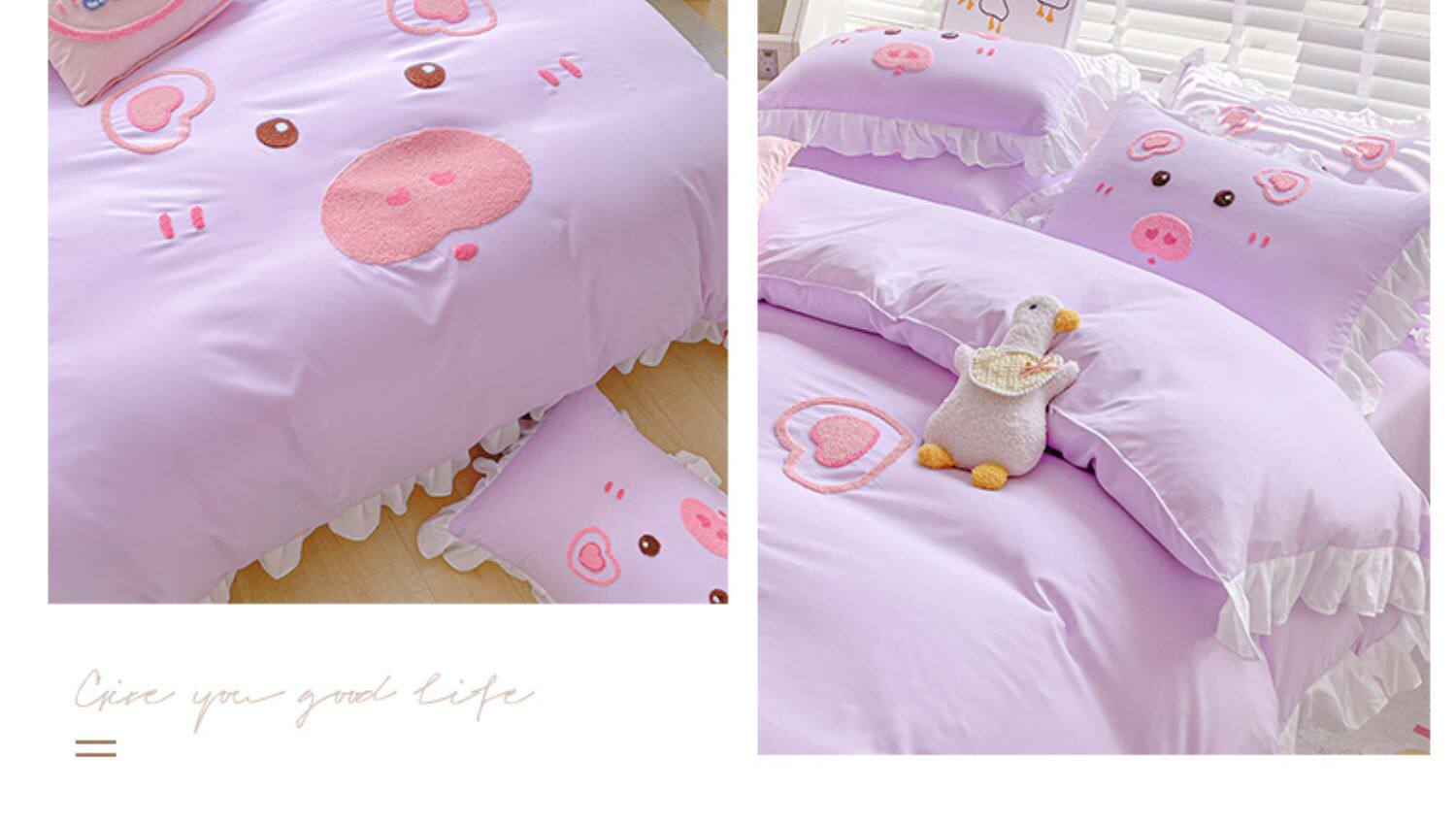 可愛花邊四件套萌豬毛巾綉非全棉純棉被罩裸睡少女床罩床包三件套