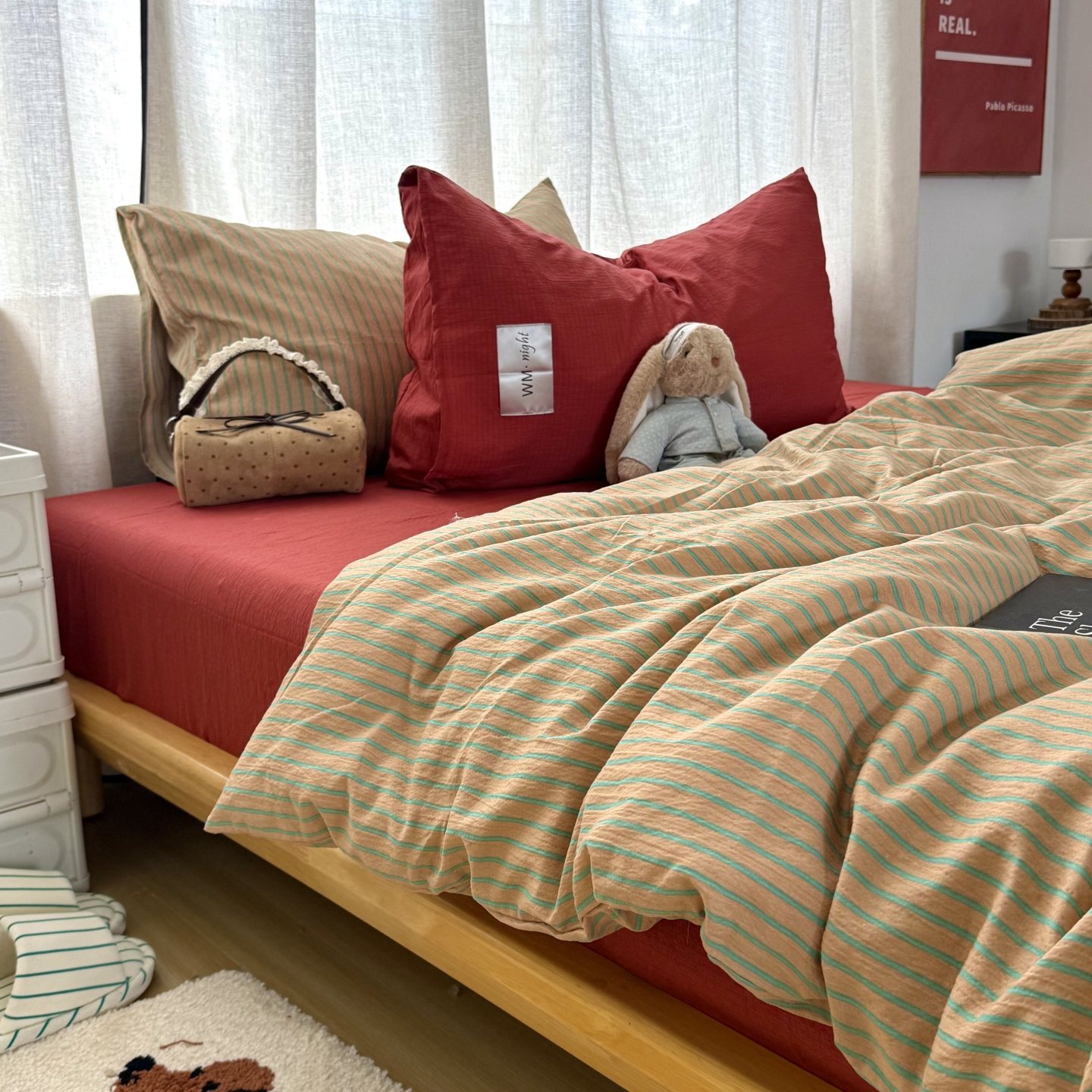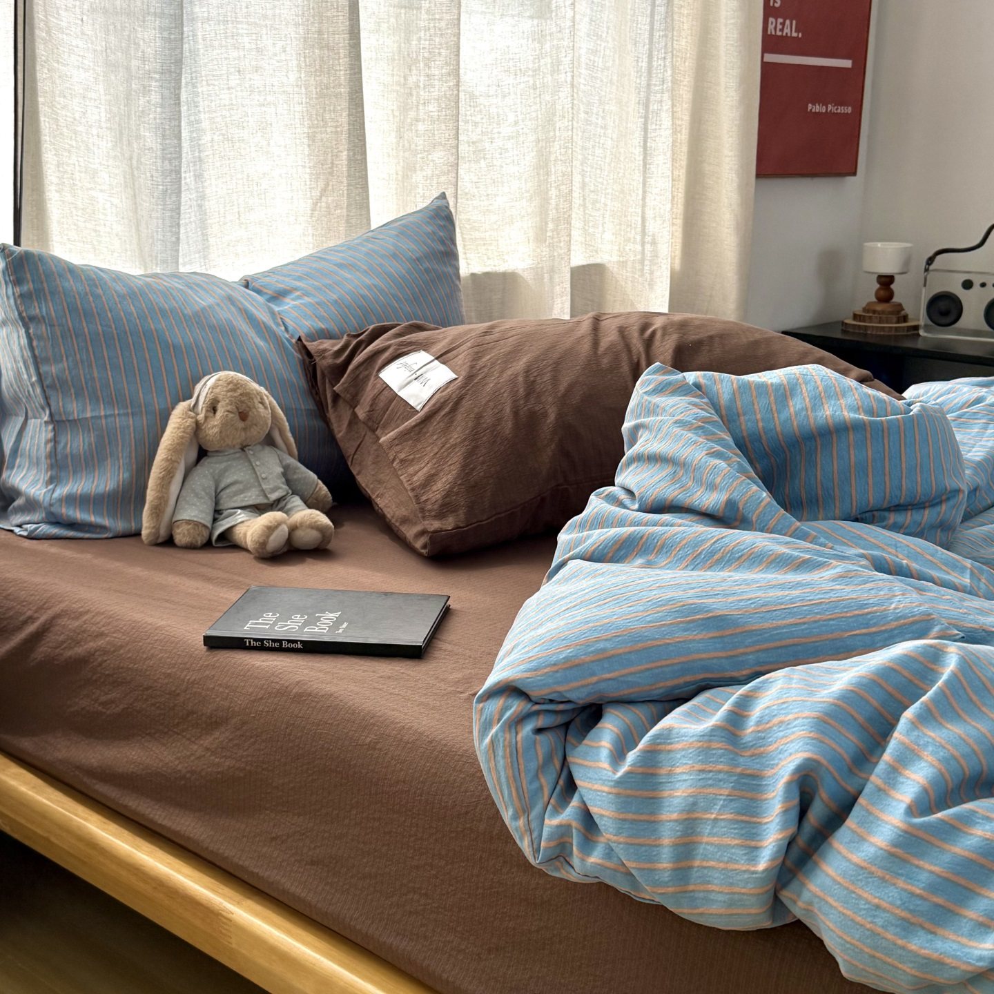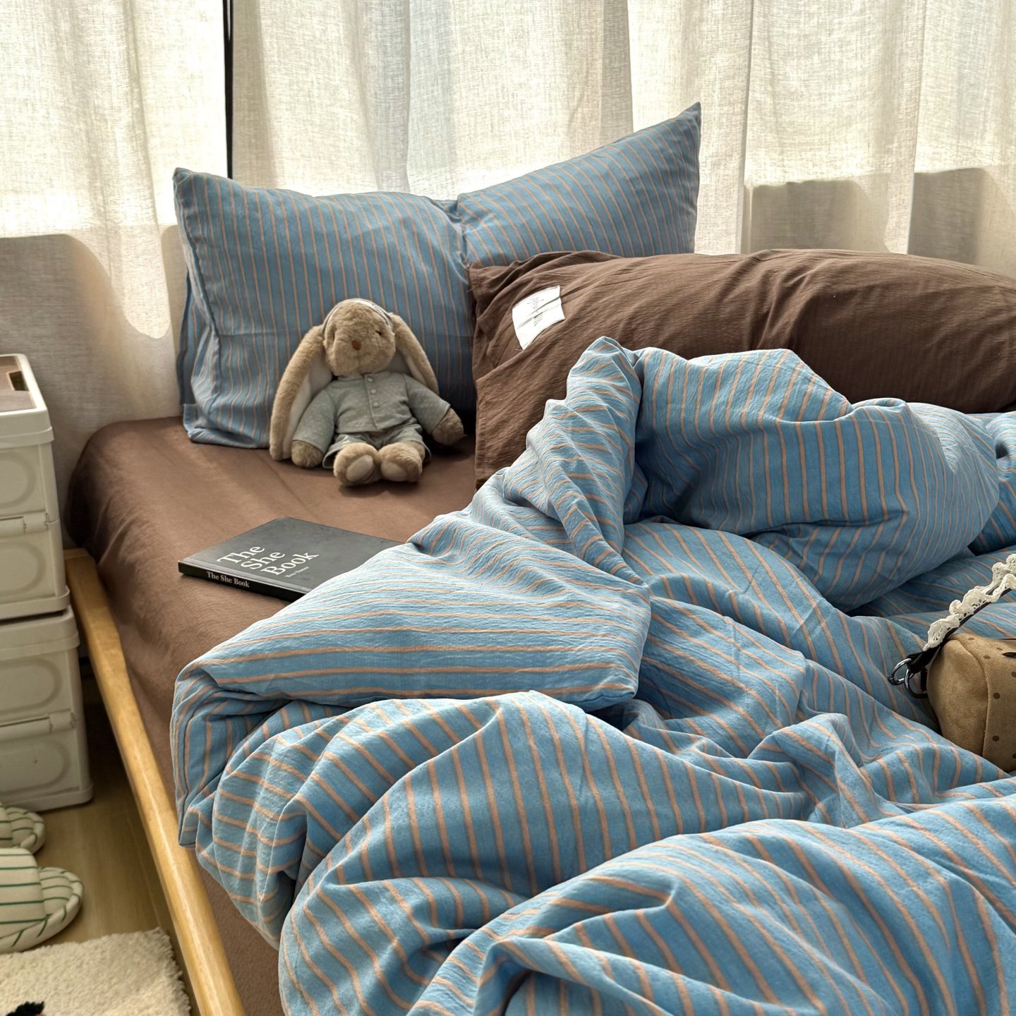簡約ins慵懶風條紋混搭風水洗棉四件套床單學生宿捨三件套床包1.8