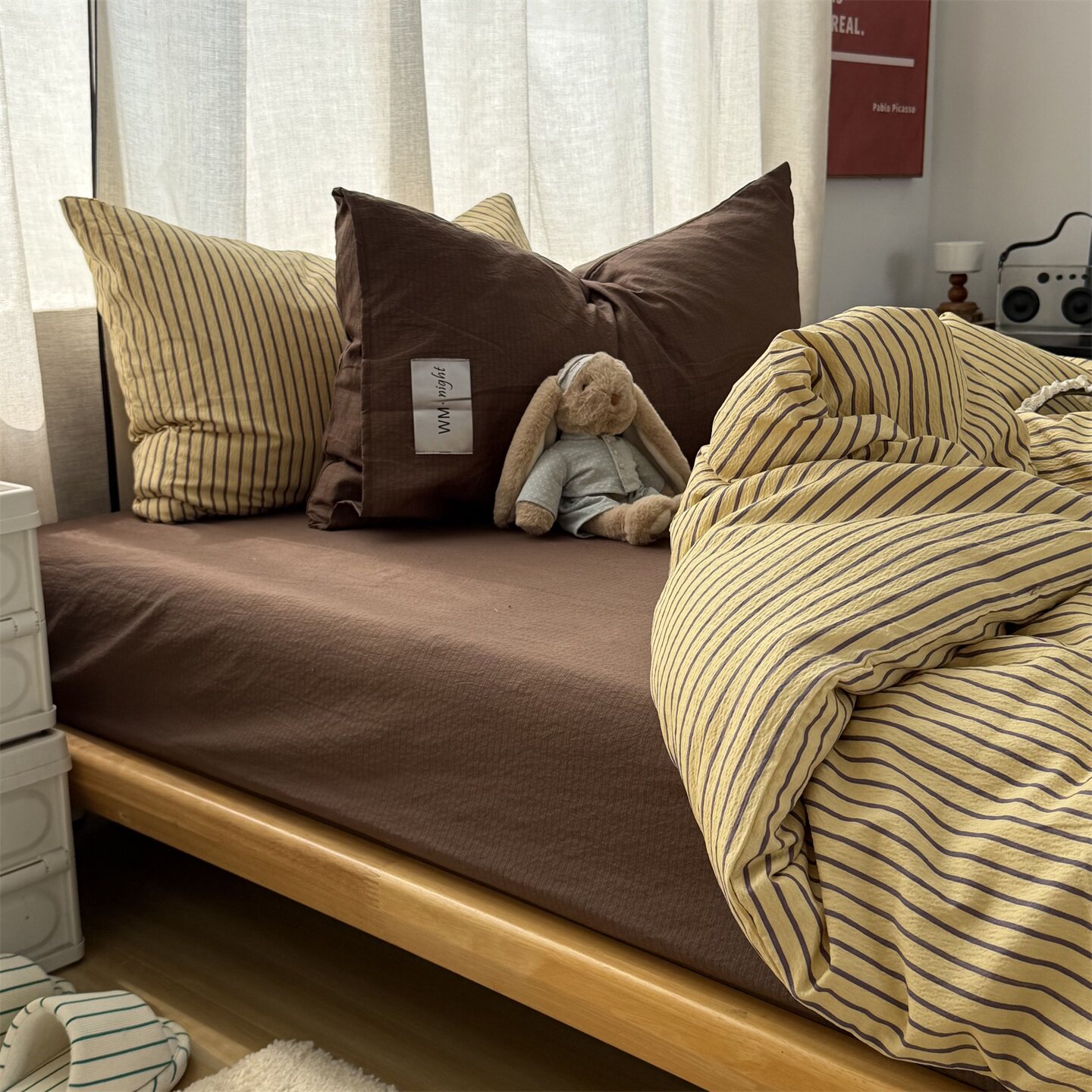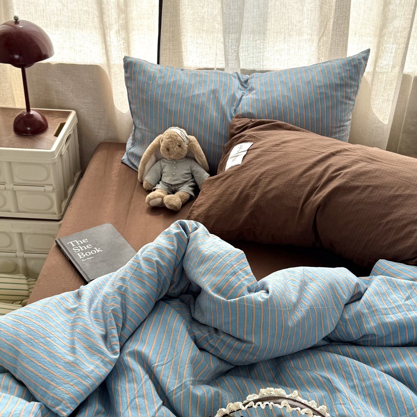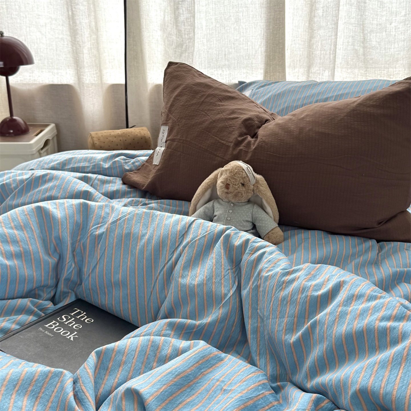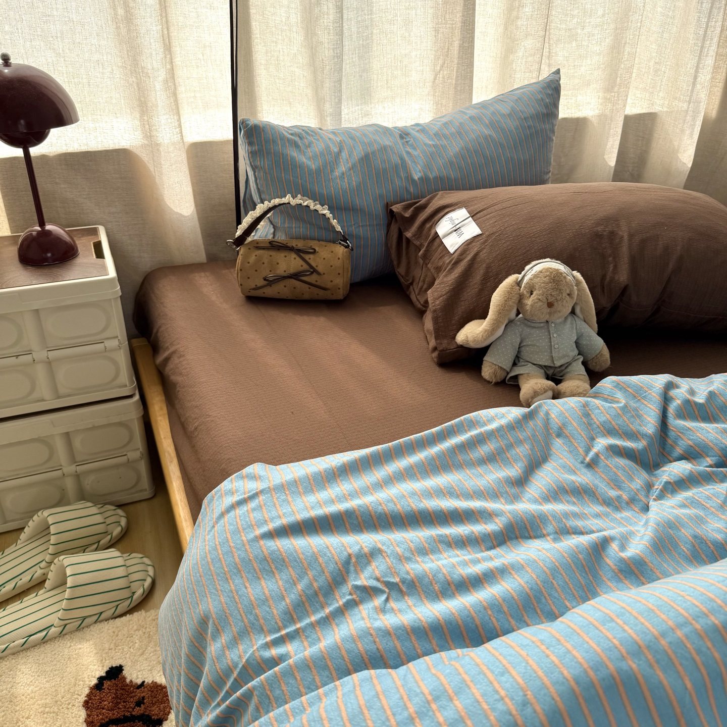 簡約ins慵懶風條紋混搭風水洗棉四件套床單學生宿捨三件套床包1.8