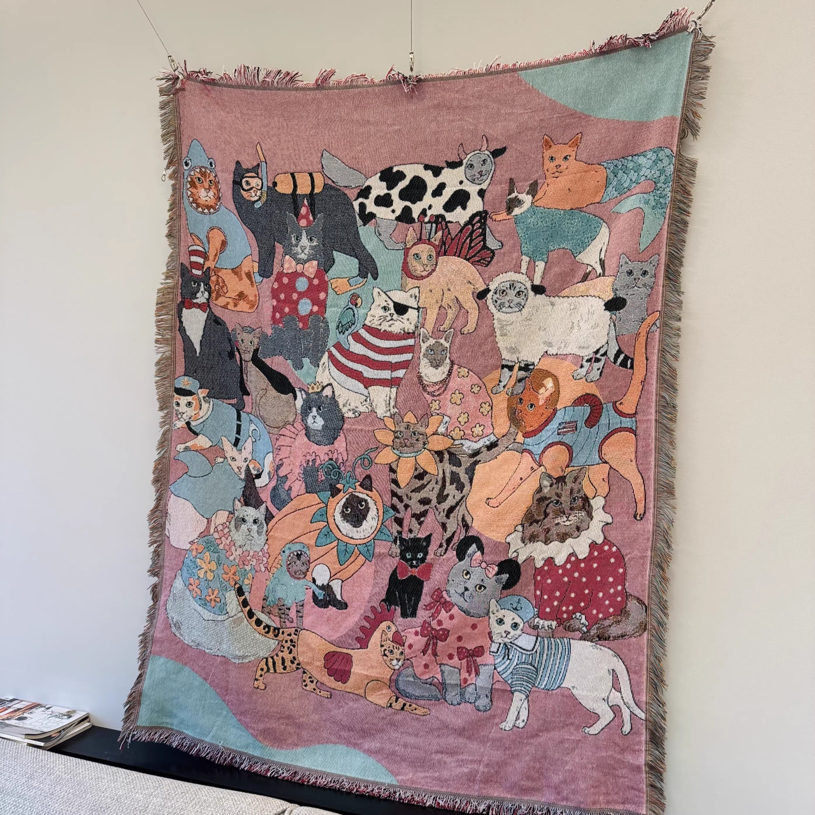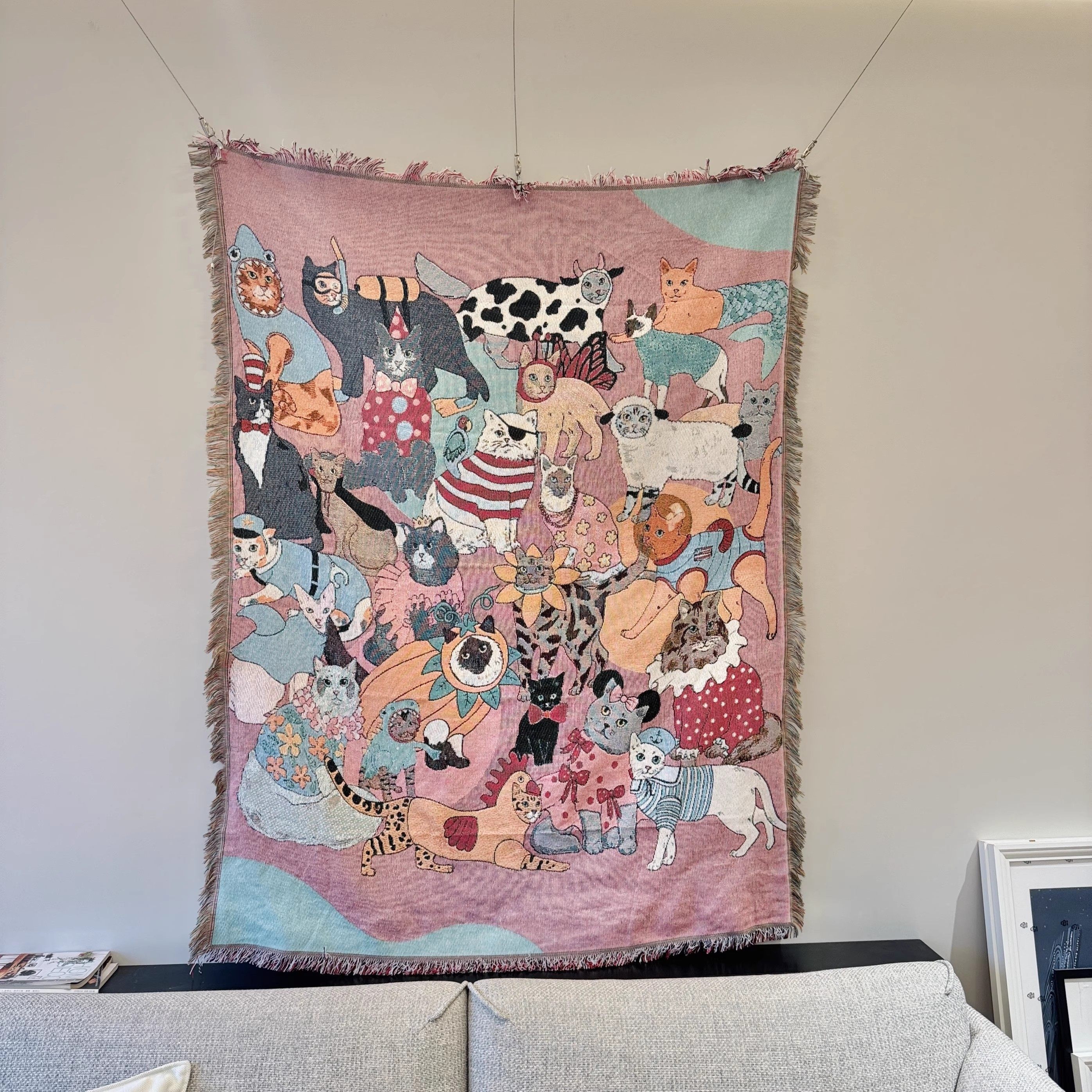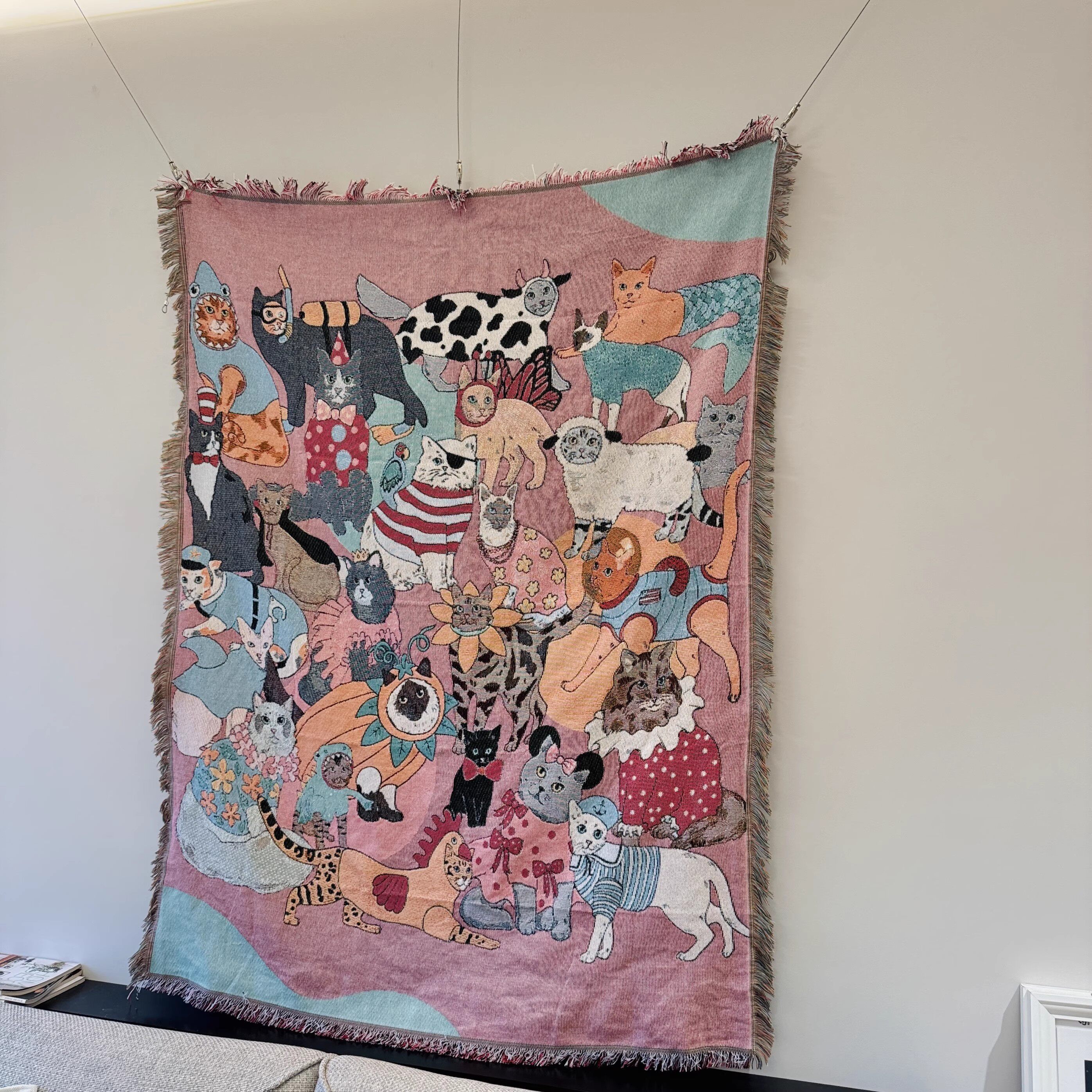 Karenmabon英國原單復古中古風毯掛毯粉色貓咪沙發裝飾毯