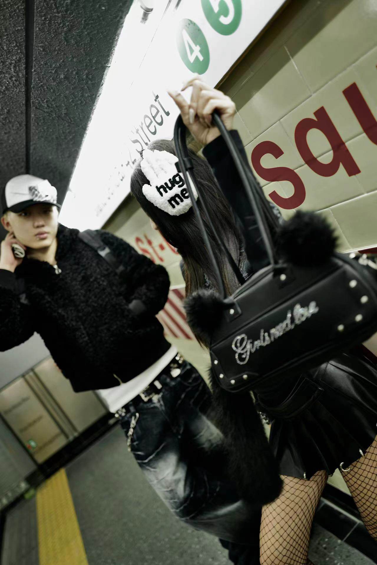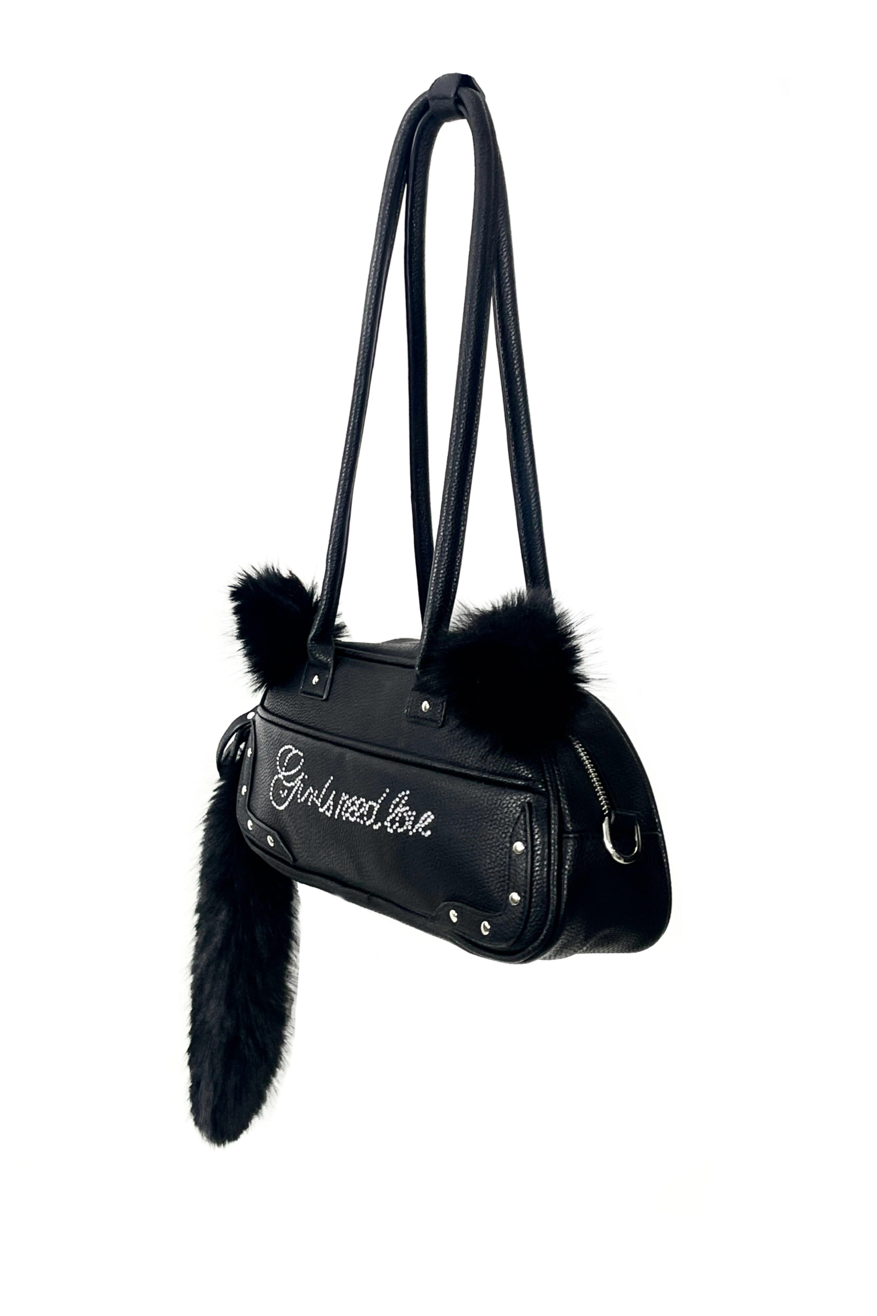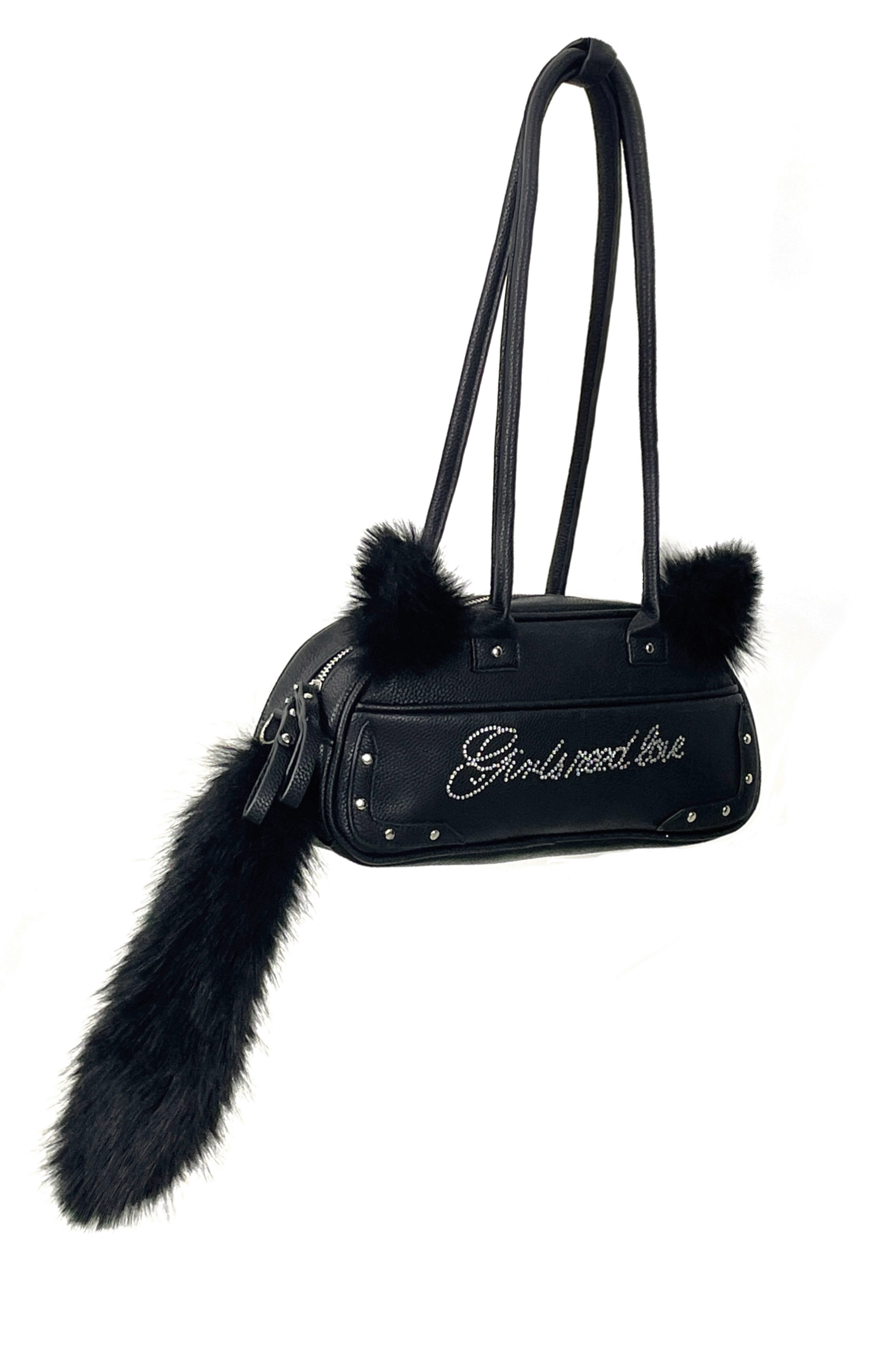 SAUCE原創新款可愛毛絨貓尾巴手提包鑲鑽字母皮包單肩斜背腋下包