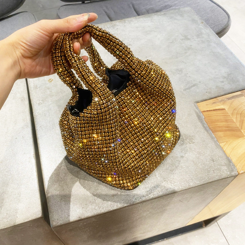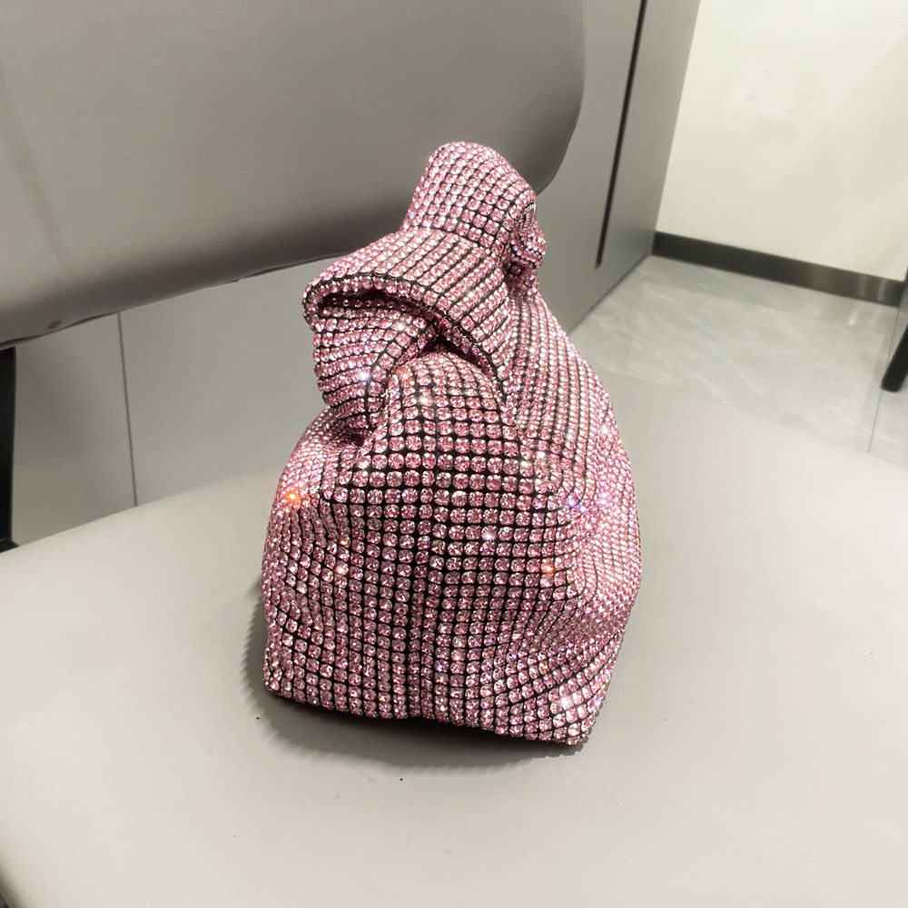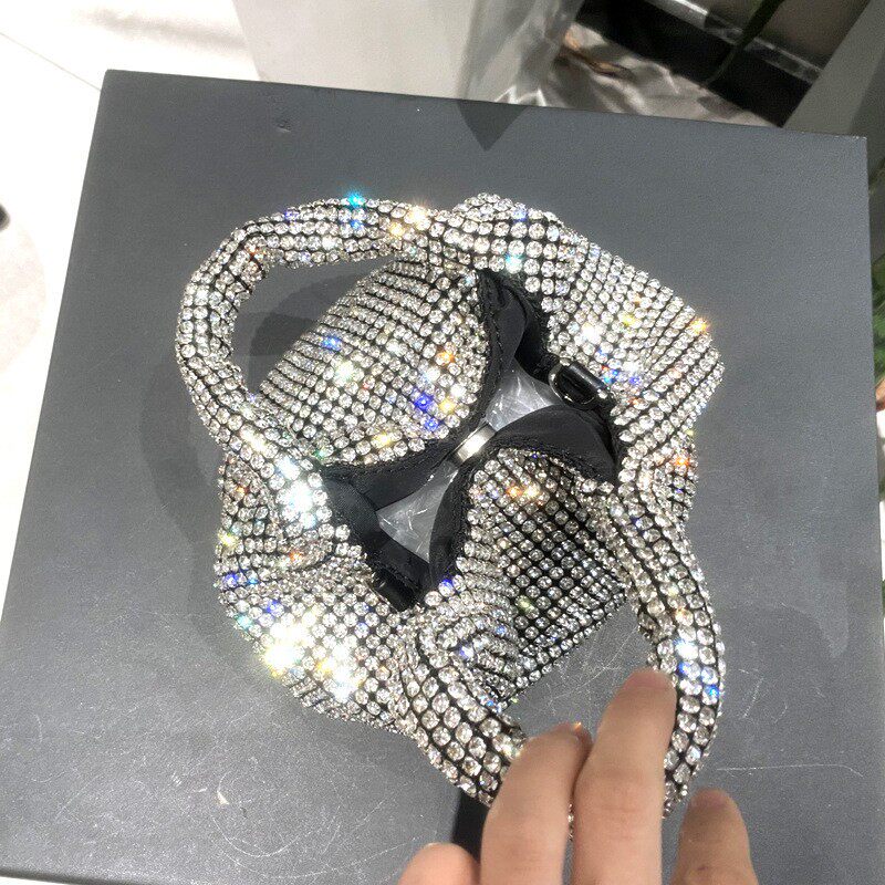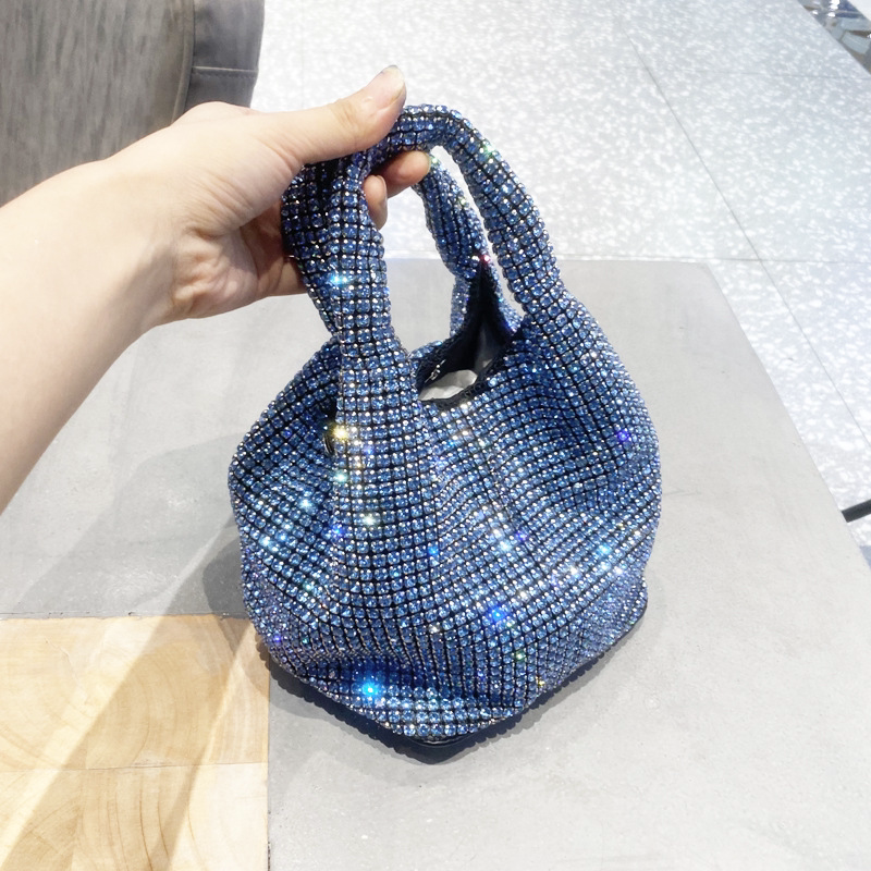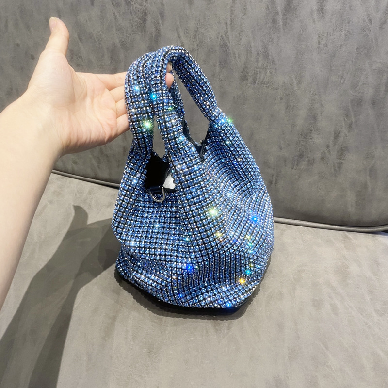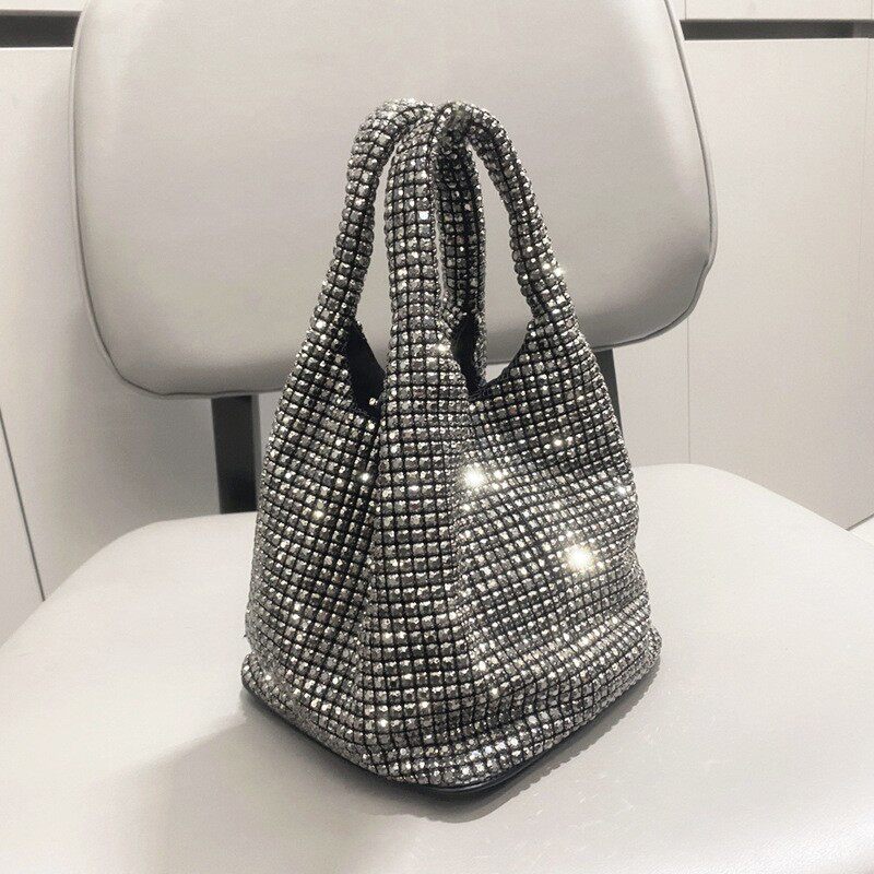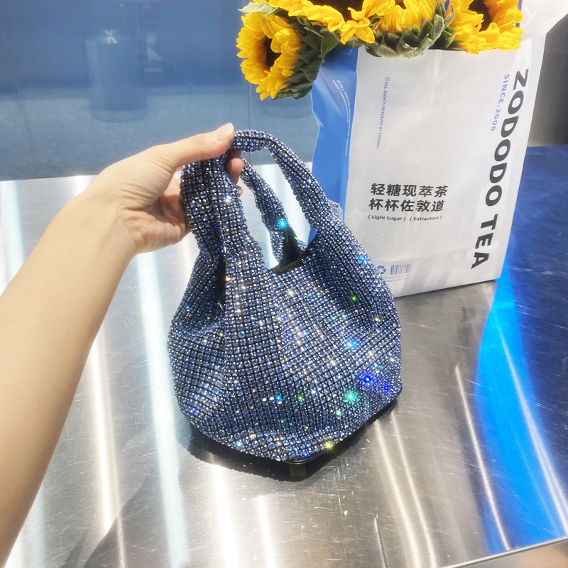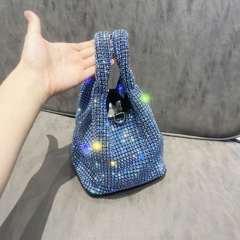 菜籃子水鑽包水桶包包女新款鑲鑽晚宴包手提斜背手拎包銀色粉