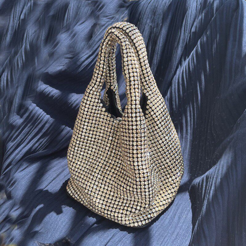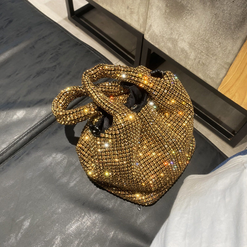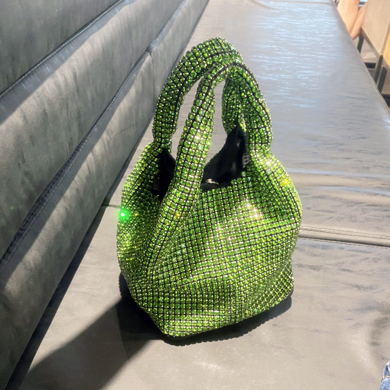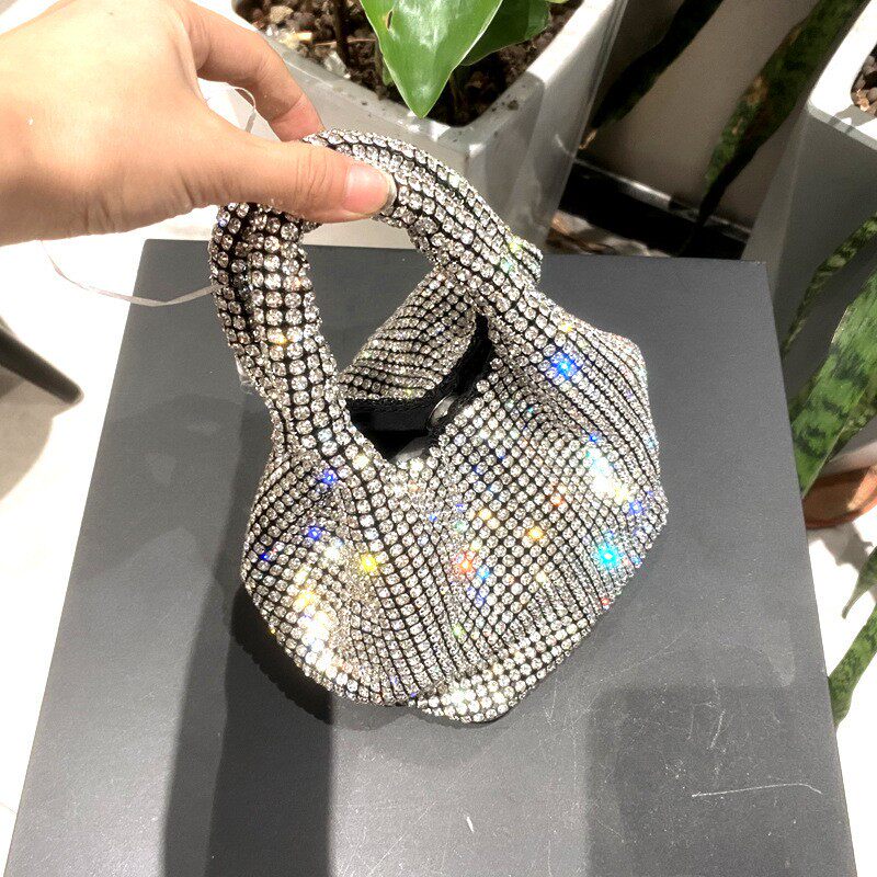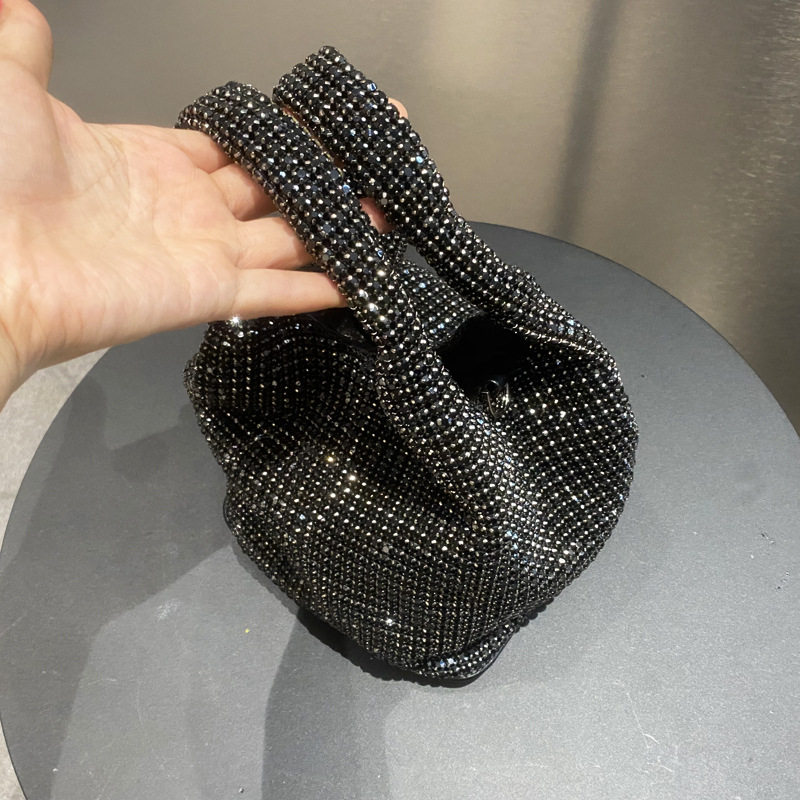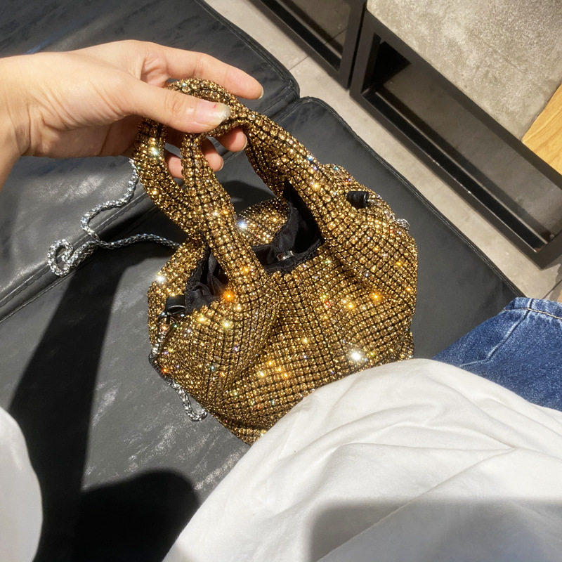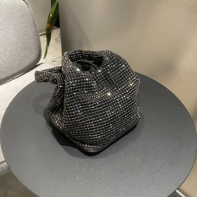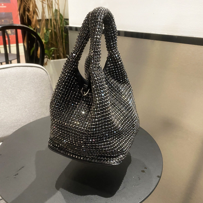 菜籃子水鑽包水桶包包女新款鑲鑽晚宴包手提斜背手拎包銀色粉