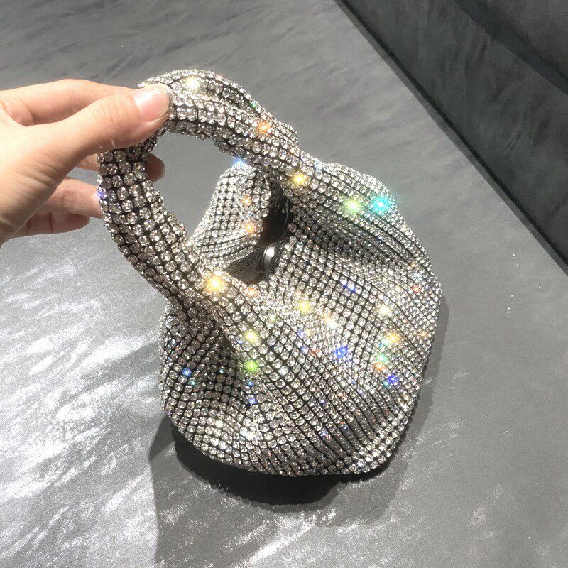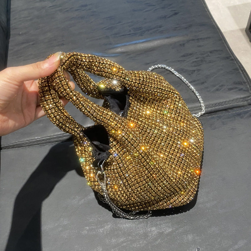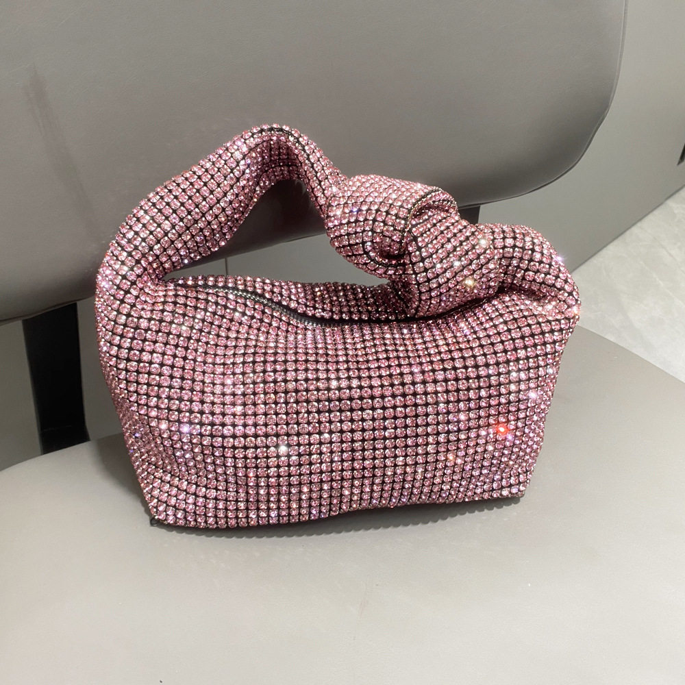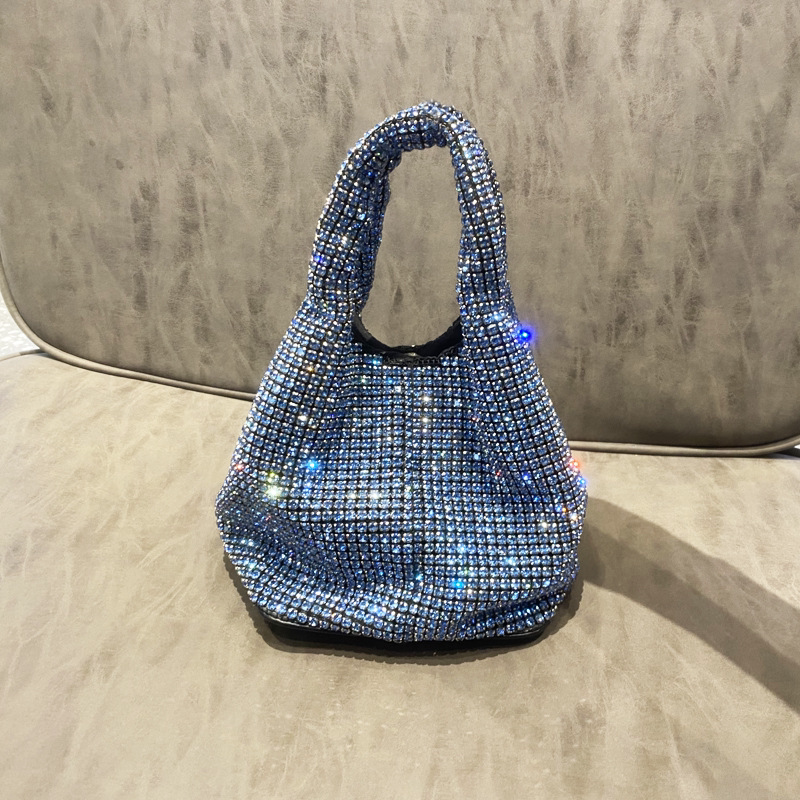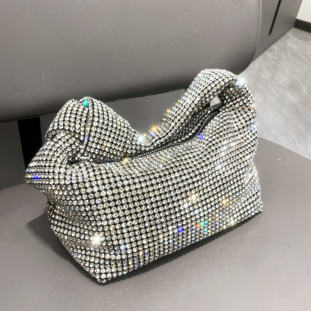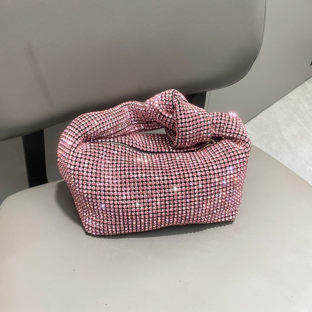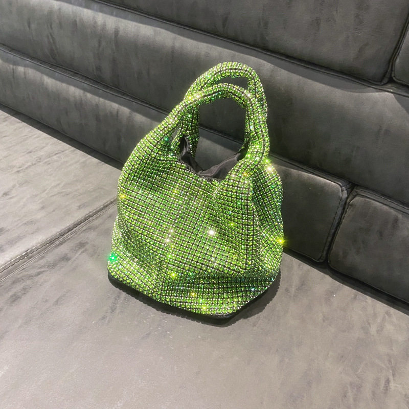 菜籃子水鑽包水桶包包女新款鑲鑽晚宴包手提斜背手拎包銀色粉
