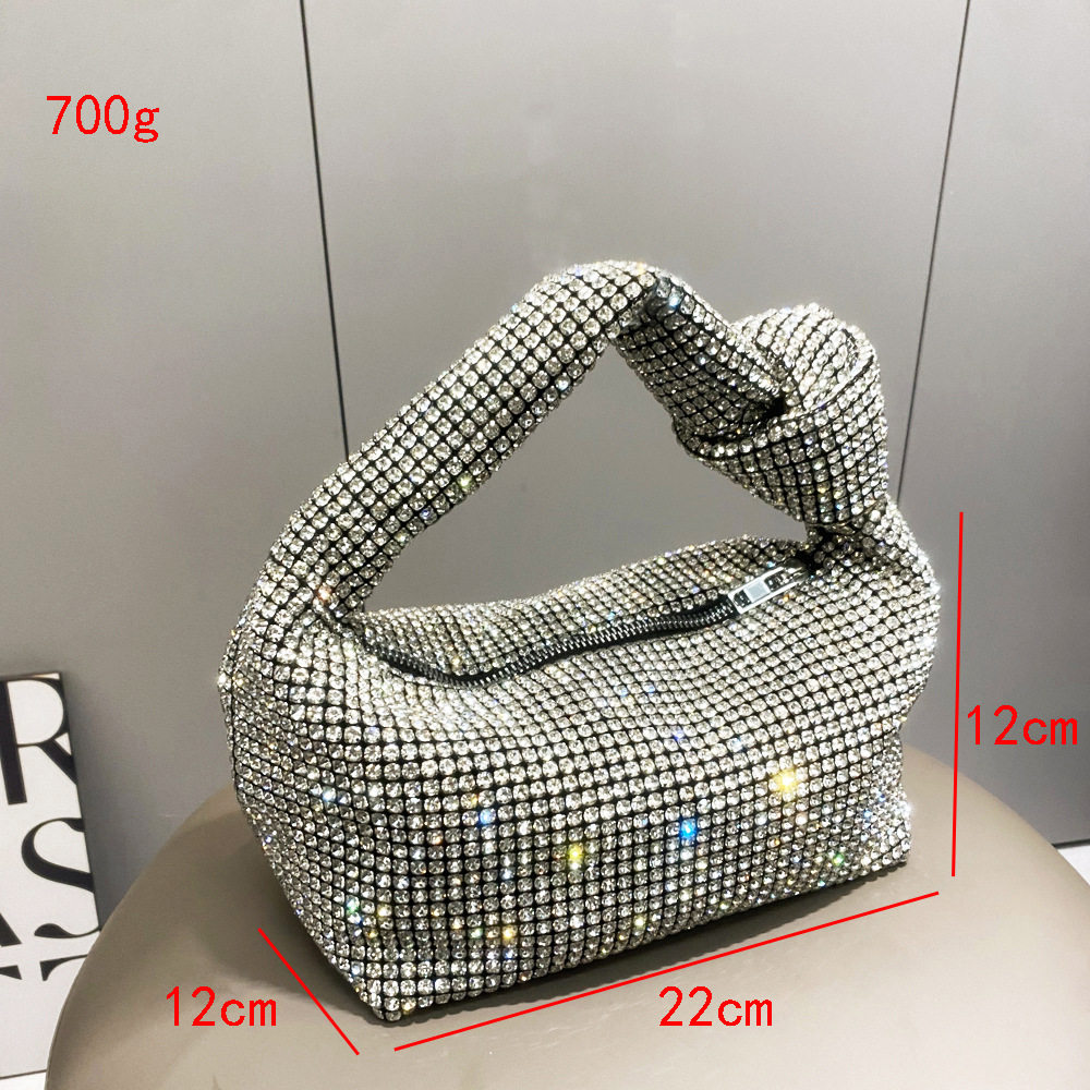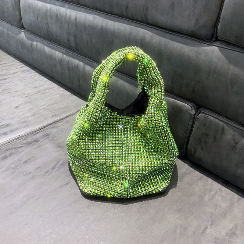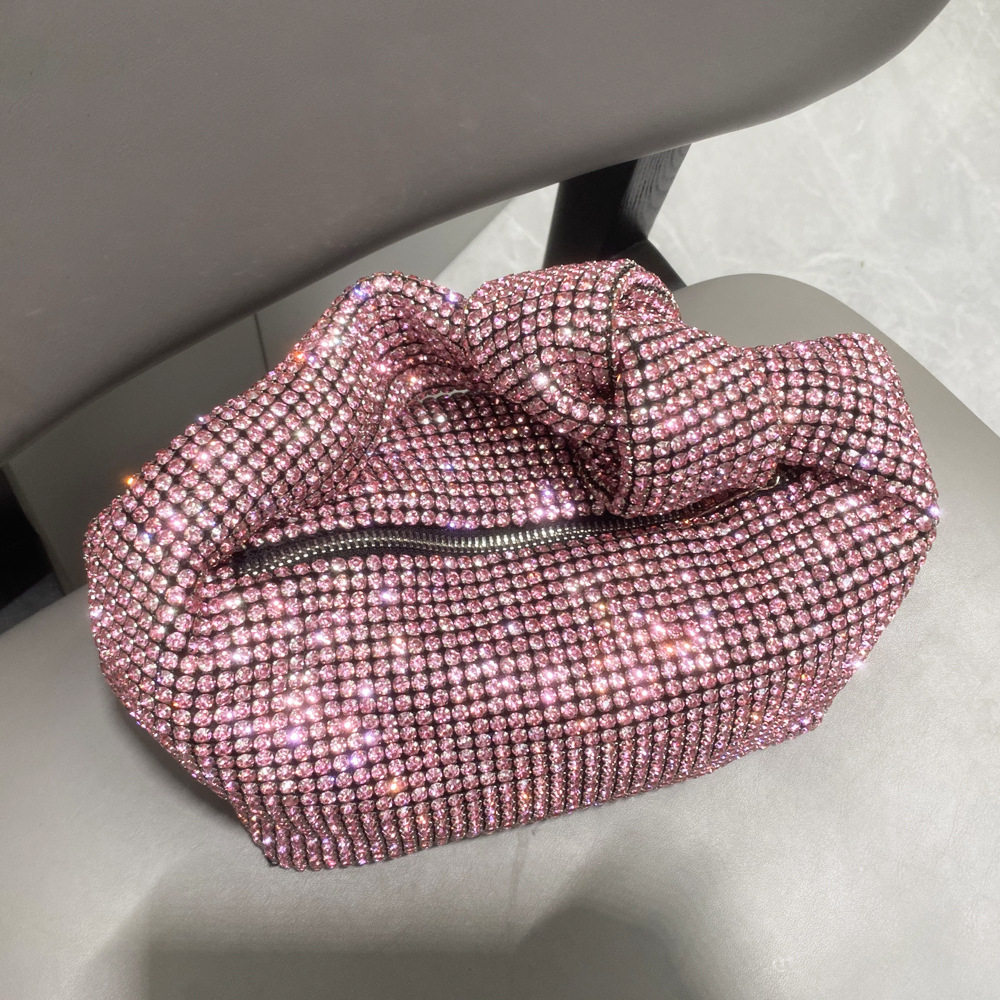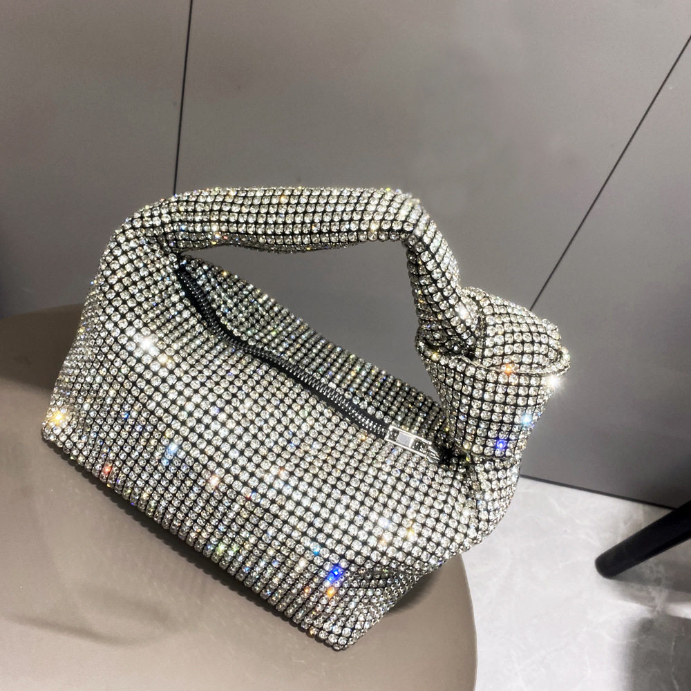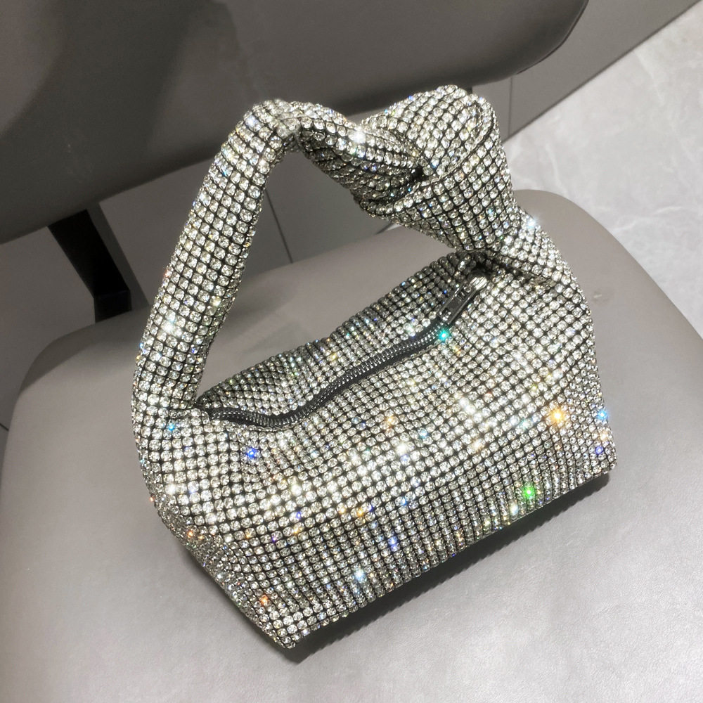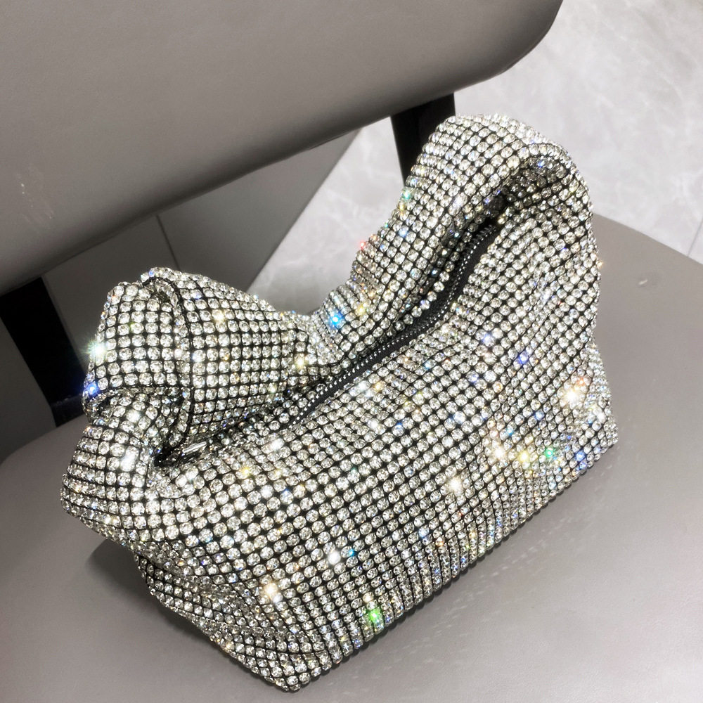 菜籃子水鑽包水桶包包女新款鑲鑽晚宴包手提斜背手拎包銀色粉
