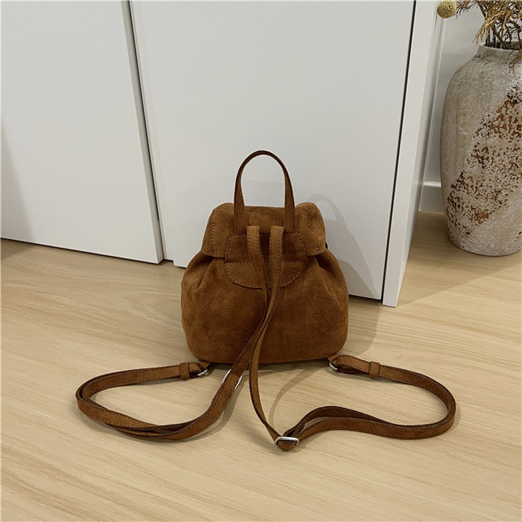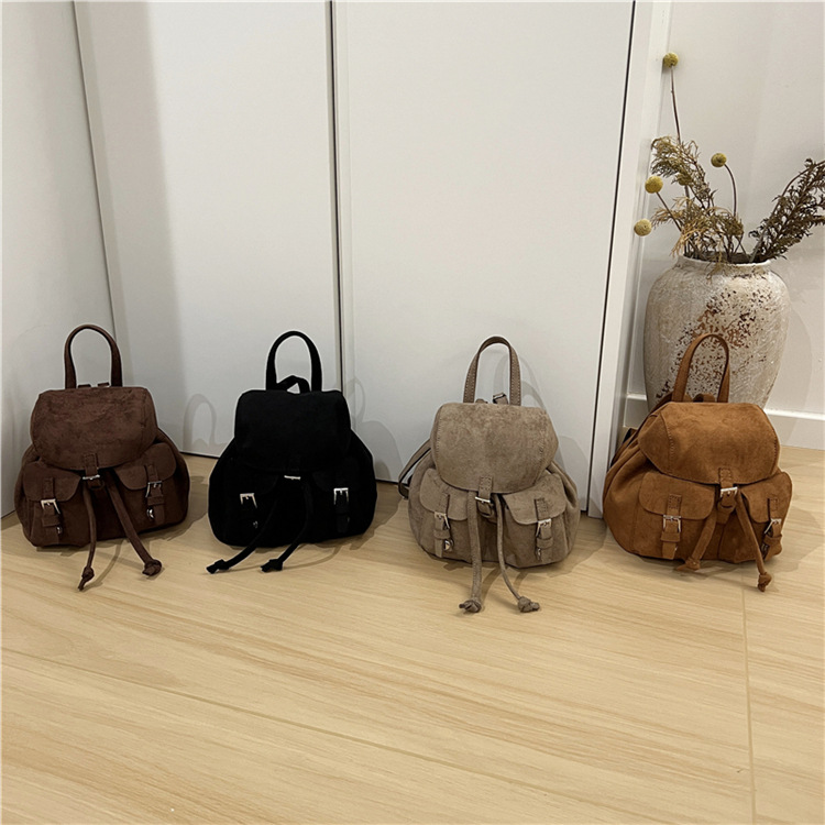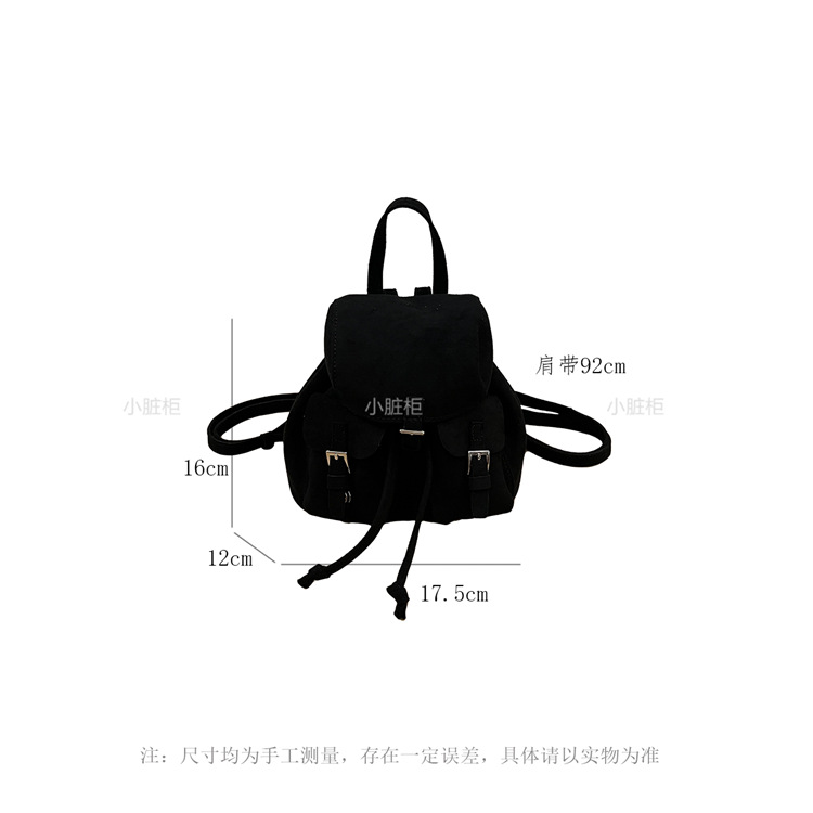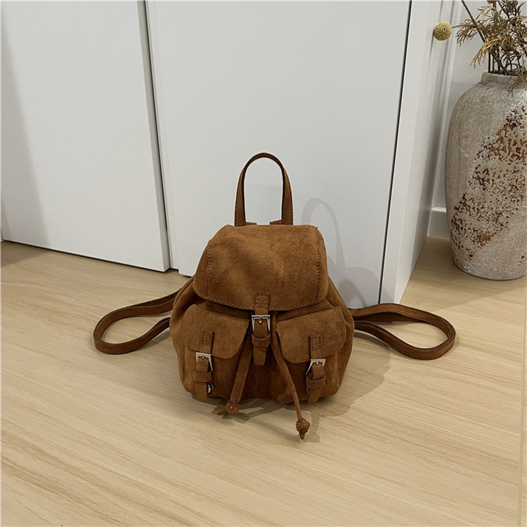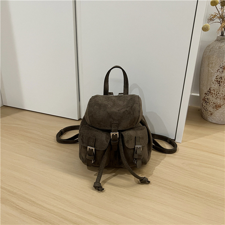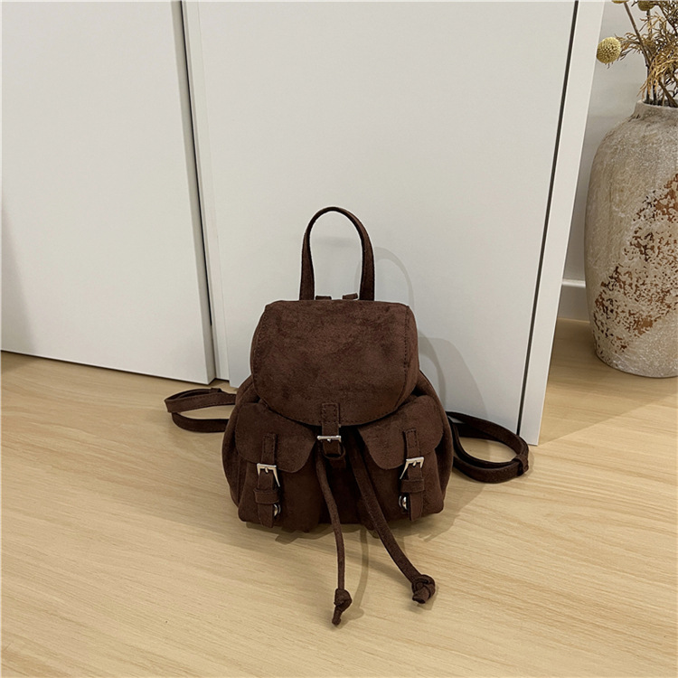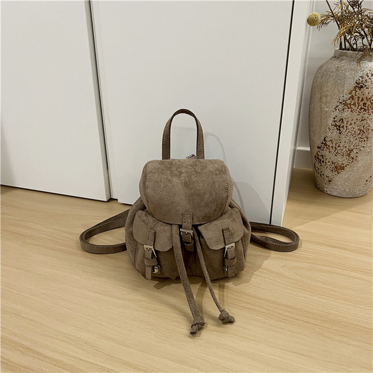 本季 磨砂迷你雙肩包女韓系絨面復古多口袋設計翻蓋抽繩小後背包