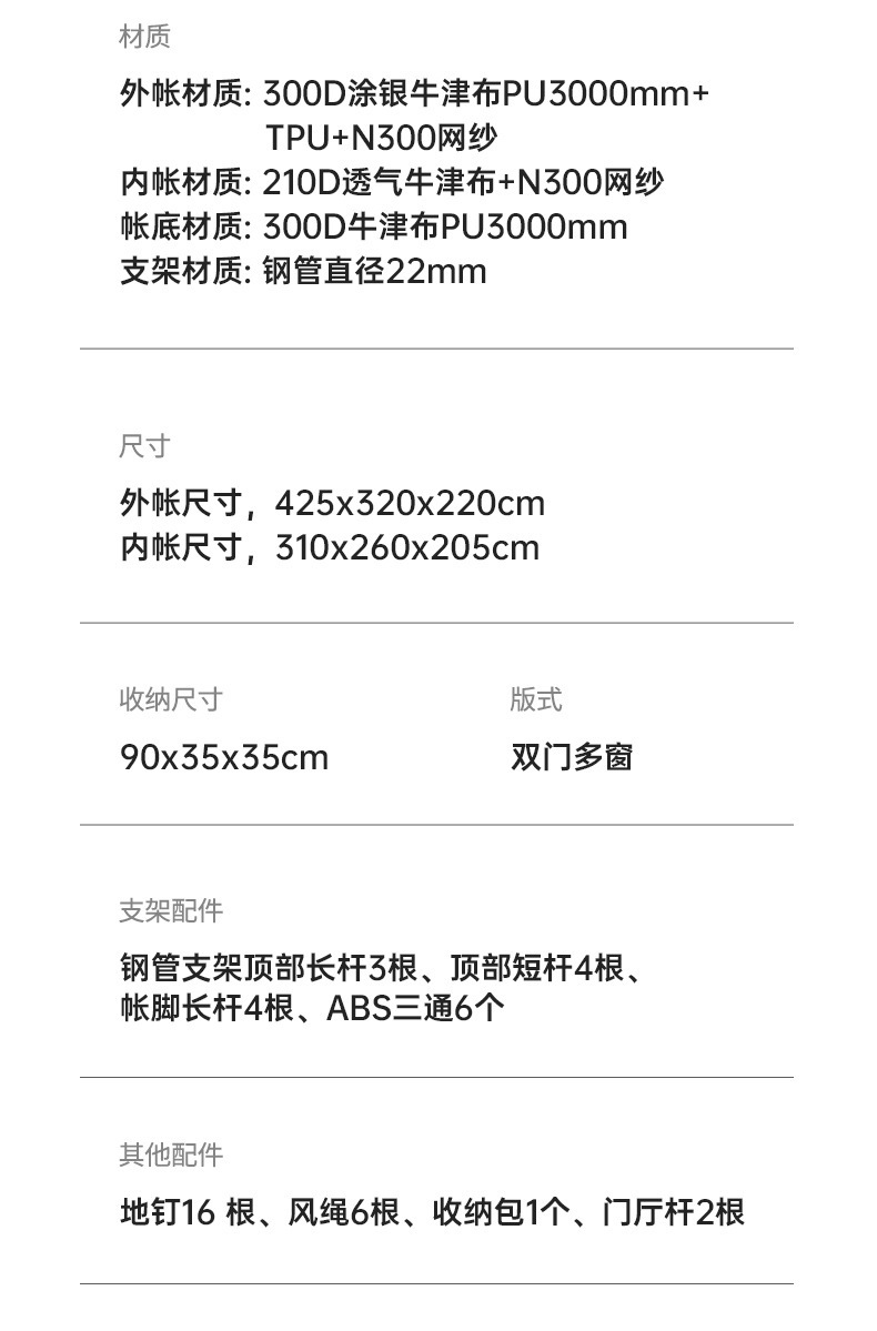 | 內帳材料 | 210D透氣牛津布+N300網紗 |