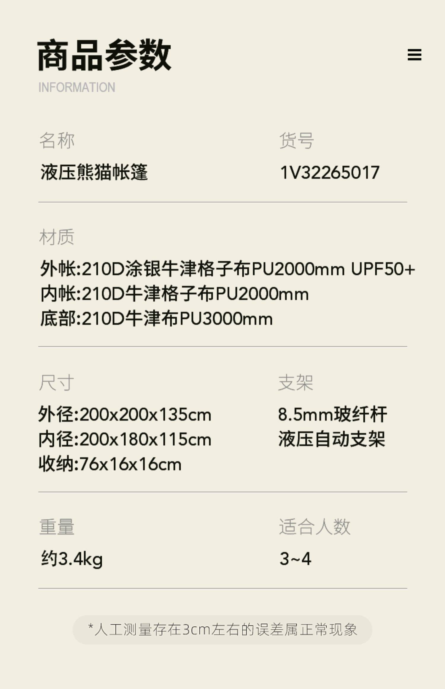 | 內帳材料 | 210D牛津布PU2000mm |