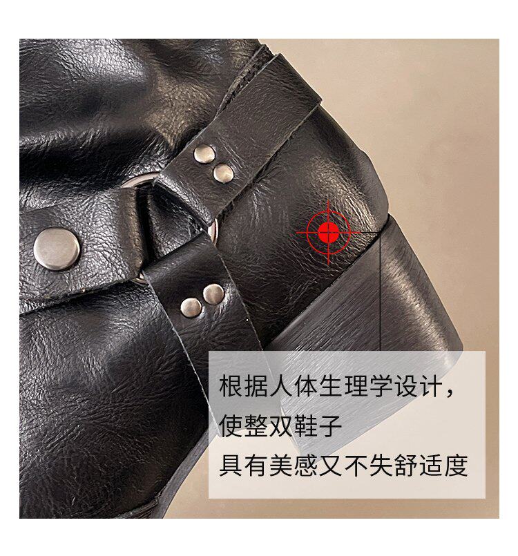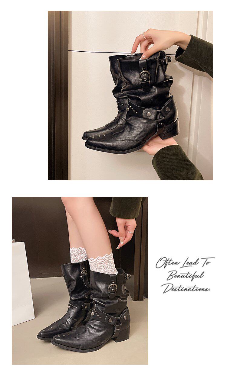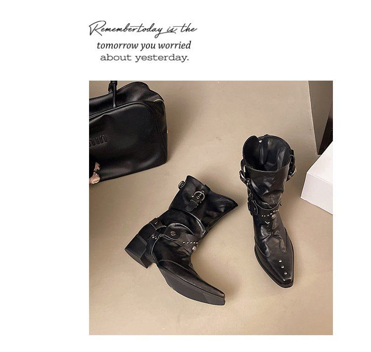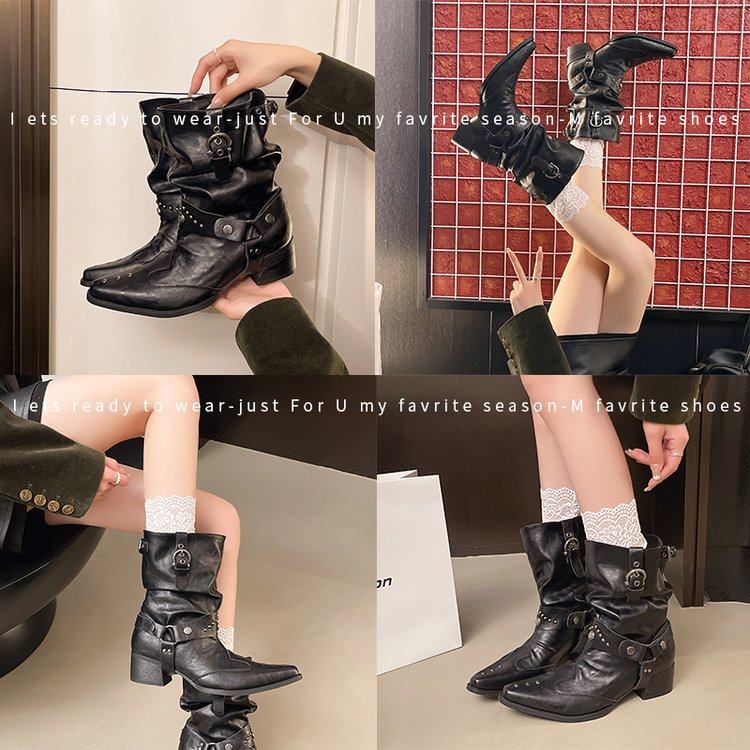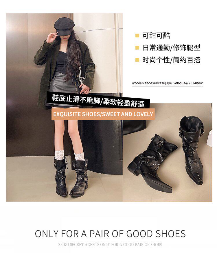 2025超火短靴尖頭粗跟鉚釘堆堆靴西部牛仔時裝靴女英倫風個性靴子