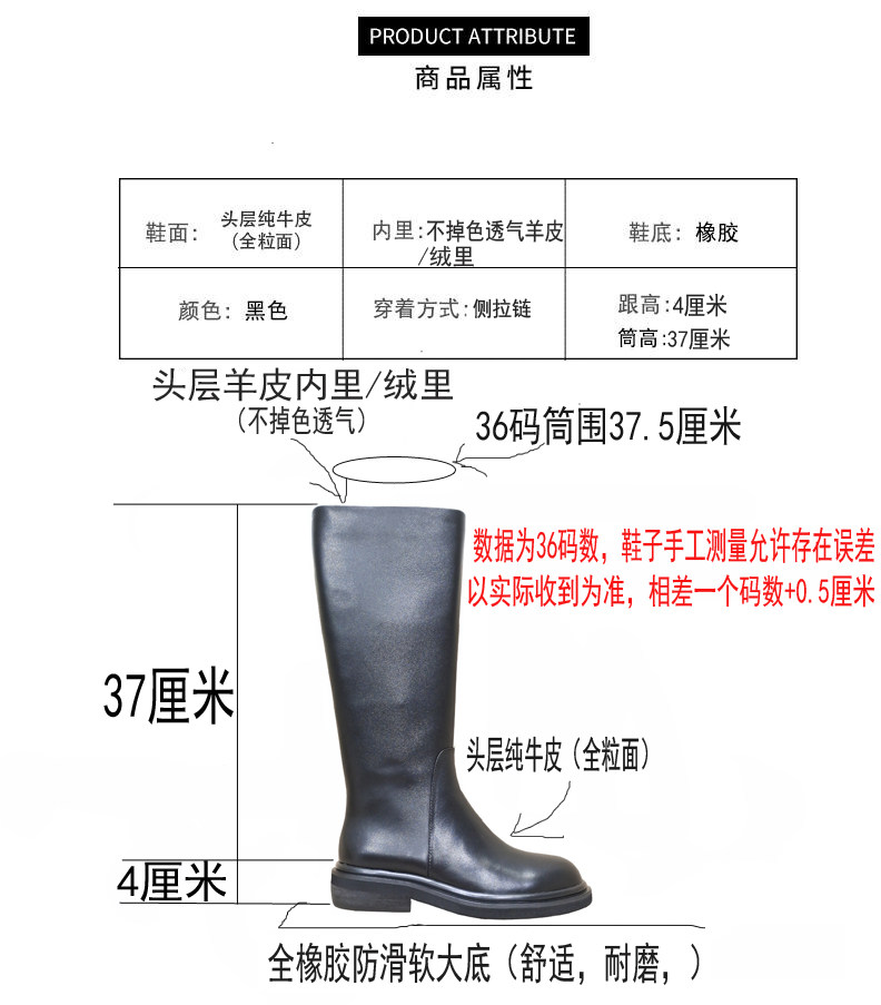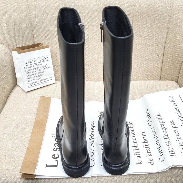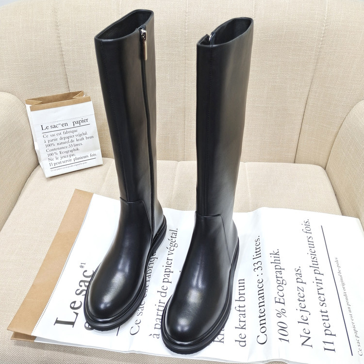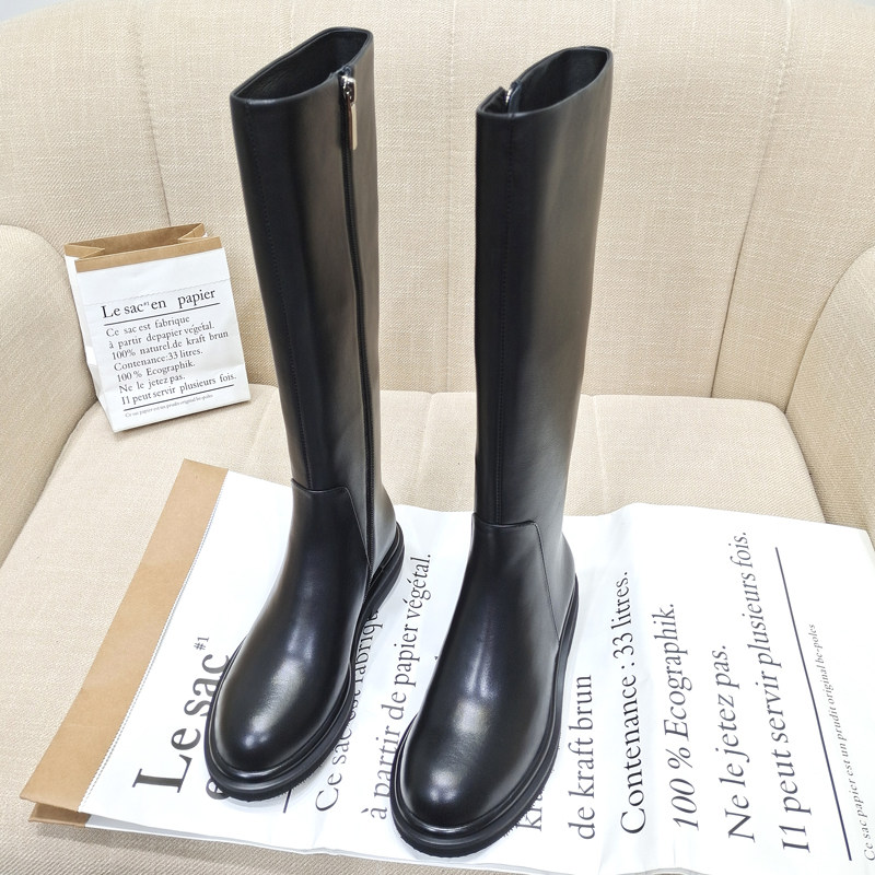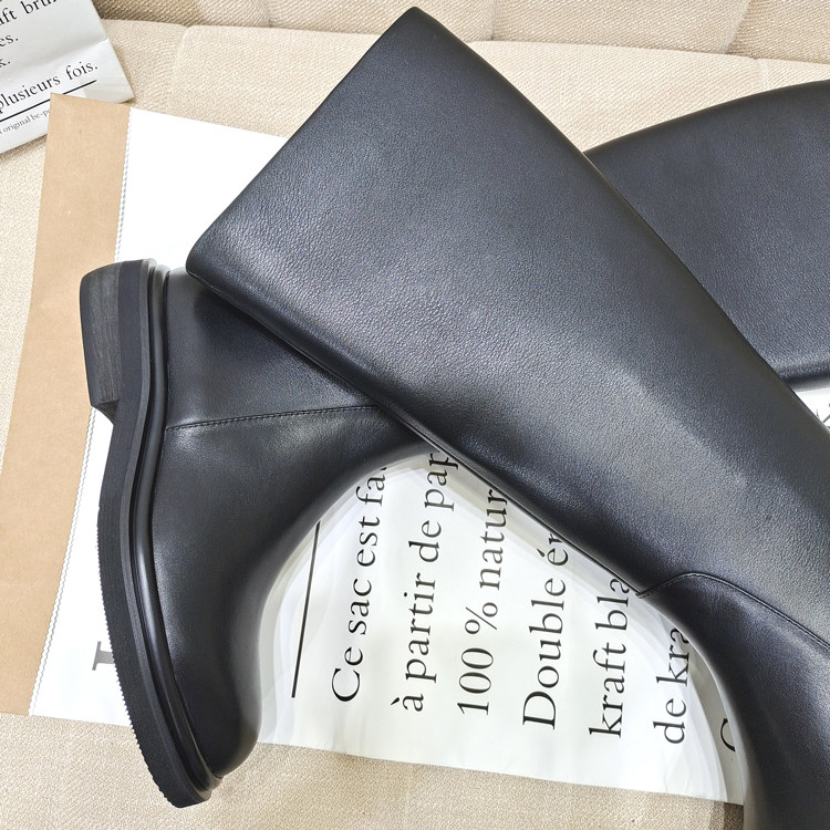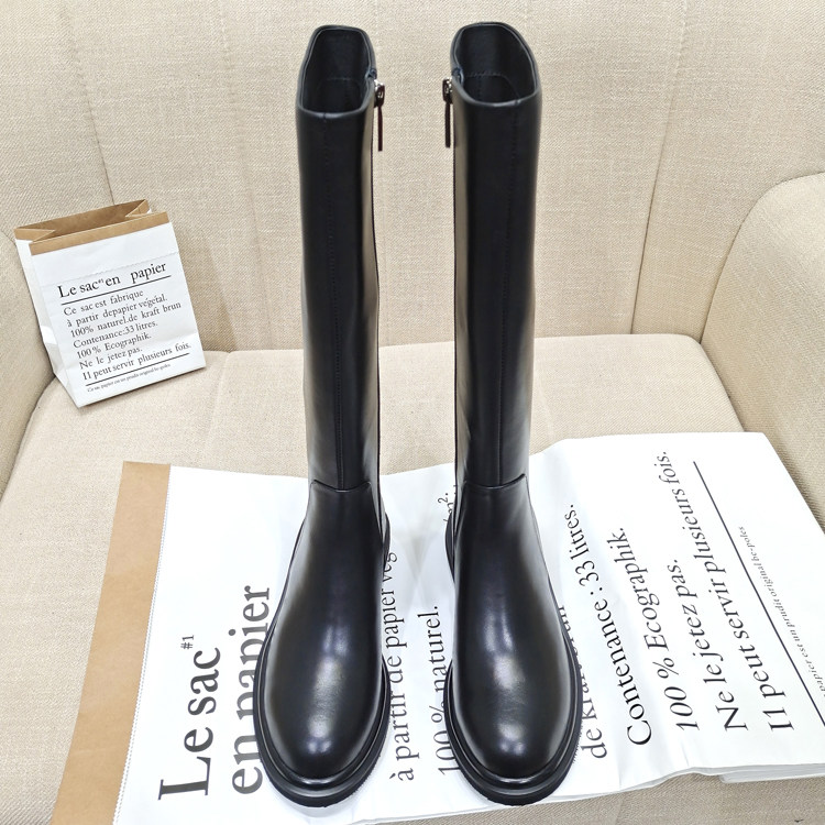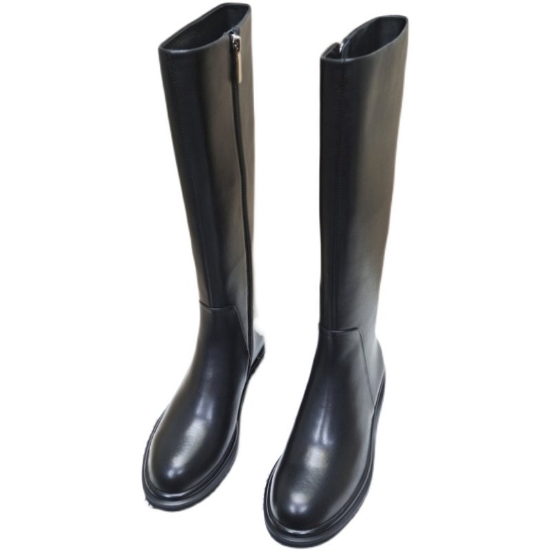 歐美2026真皮牛皮長筒靴女顯瘦圓頭粗跟中跟高筒女靴側拉鍊馬丁靴