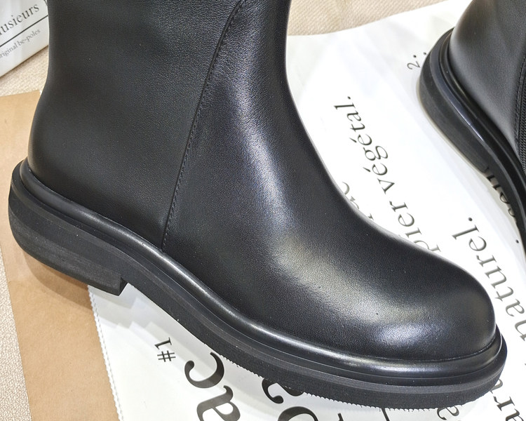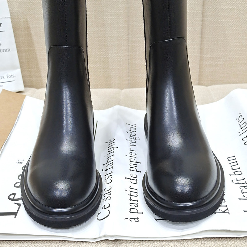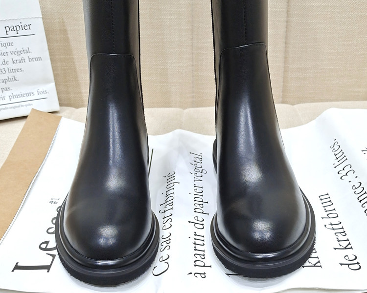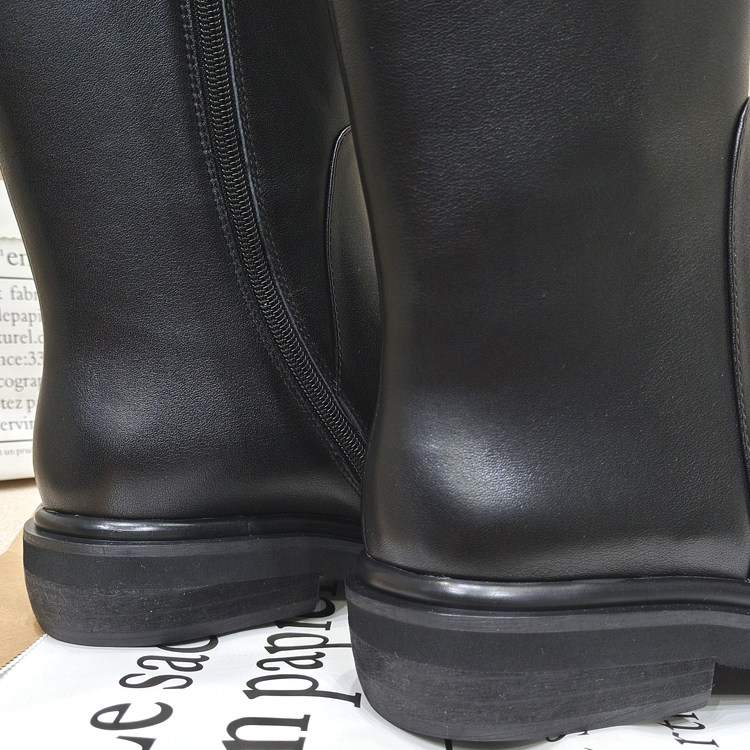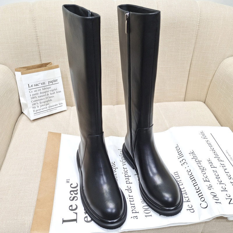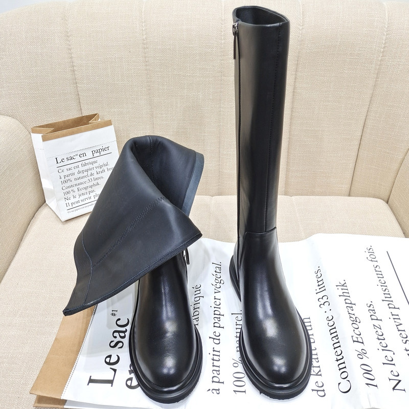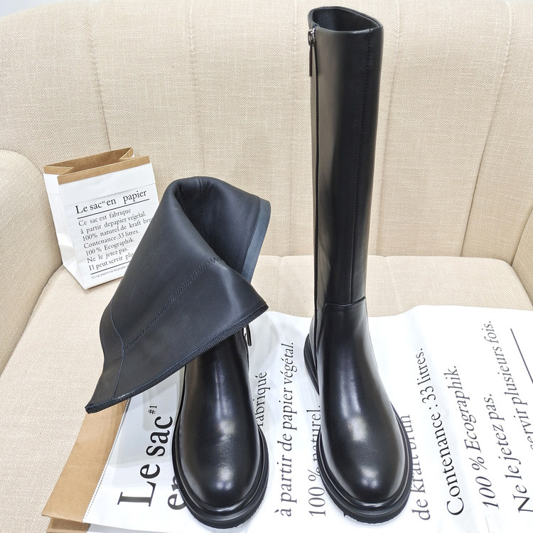 歐美2026真皮牛皮長筒靴女顯瘦圓頭粗跟中跟高筒女靴側拉鍊馬丁靴
