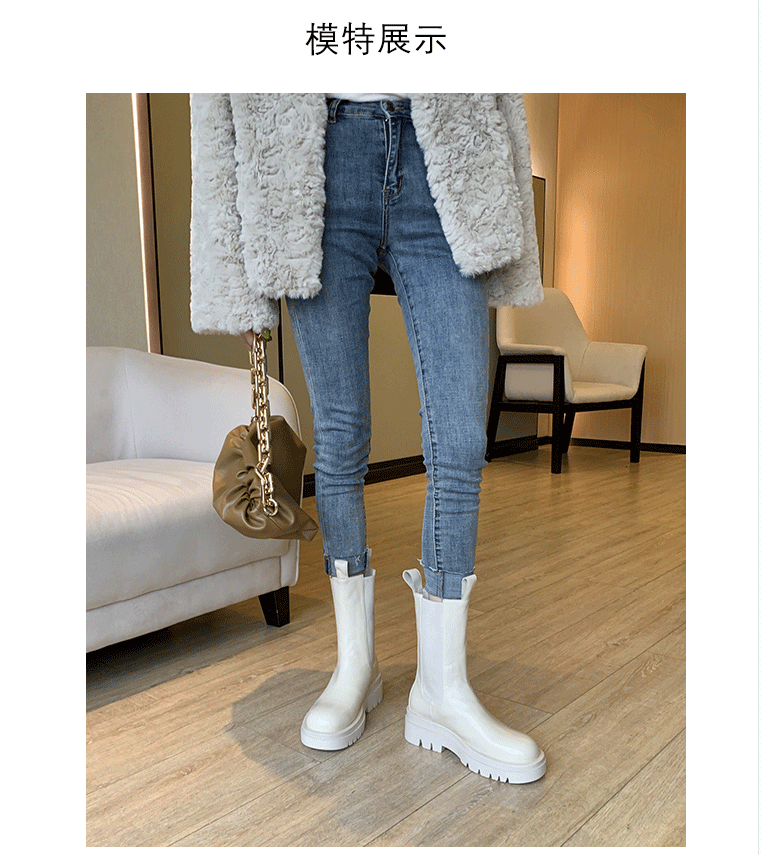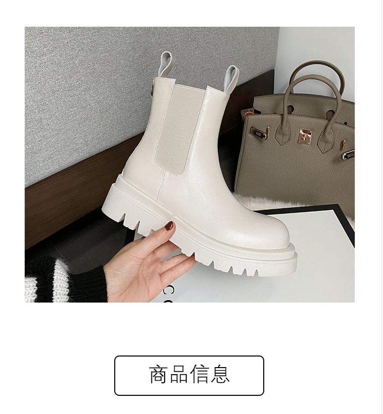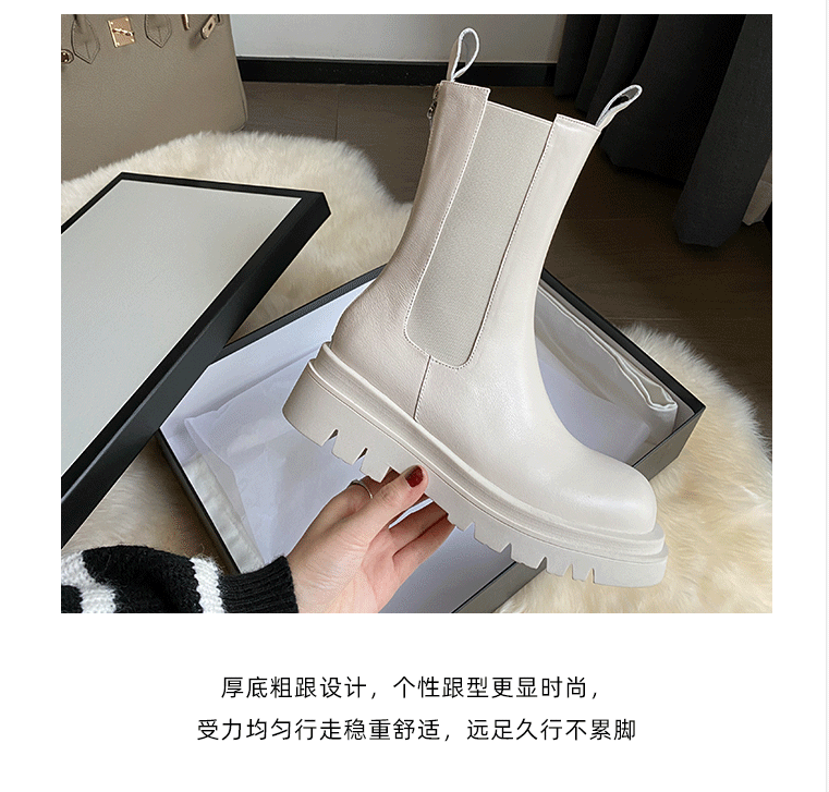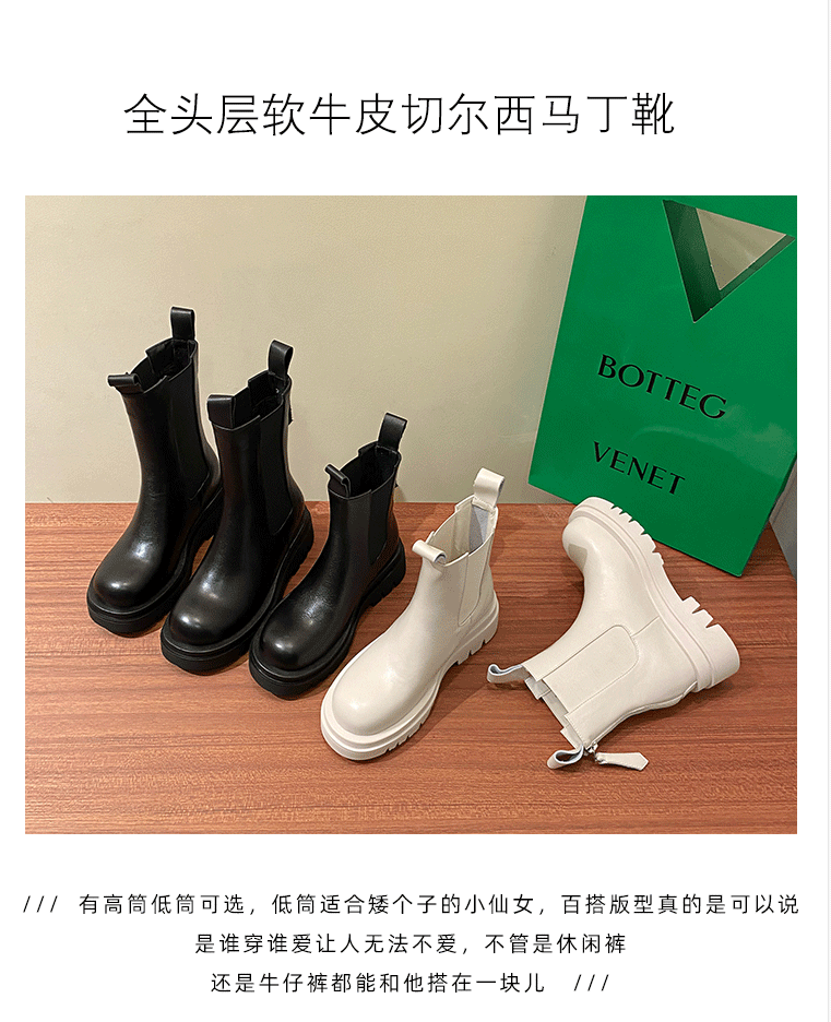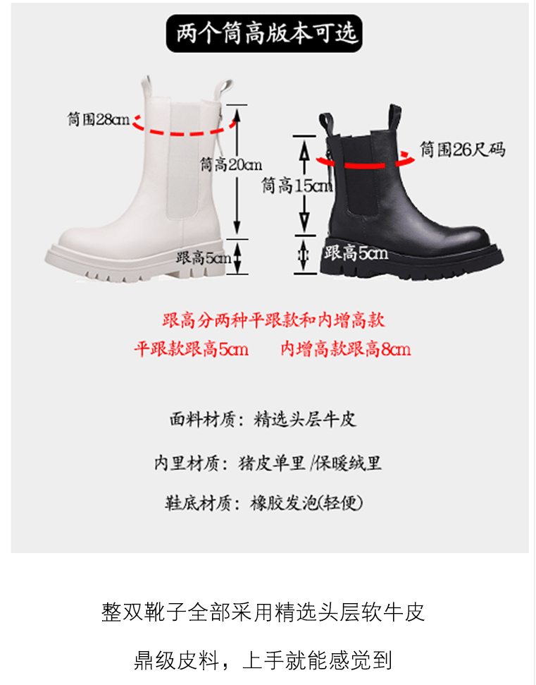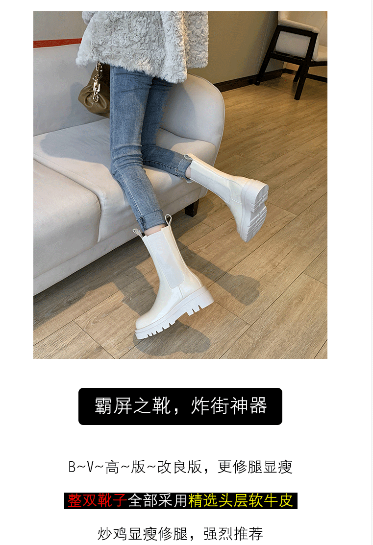mona同款松緊口切爾西白色真皮短靴內增高大碼41一43厚底菸筒靴女