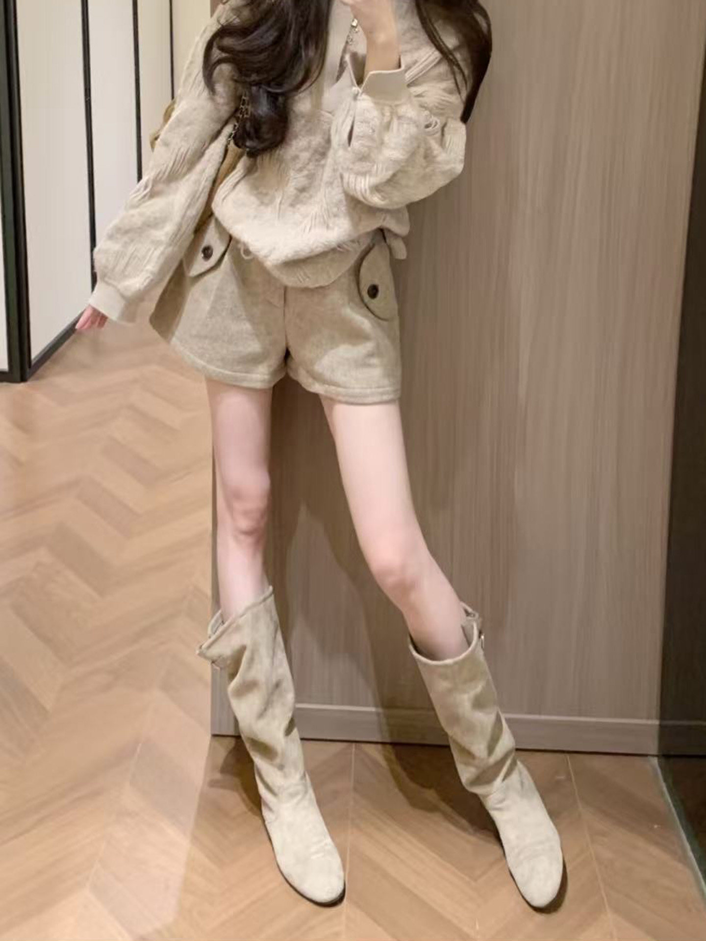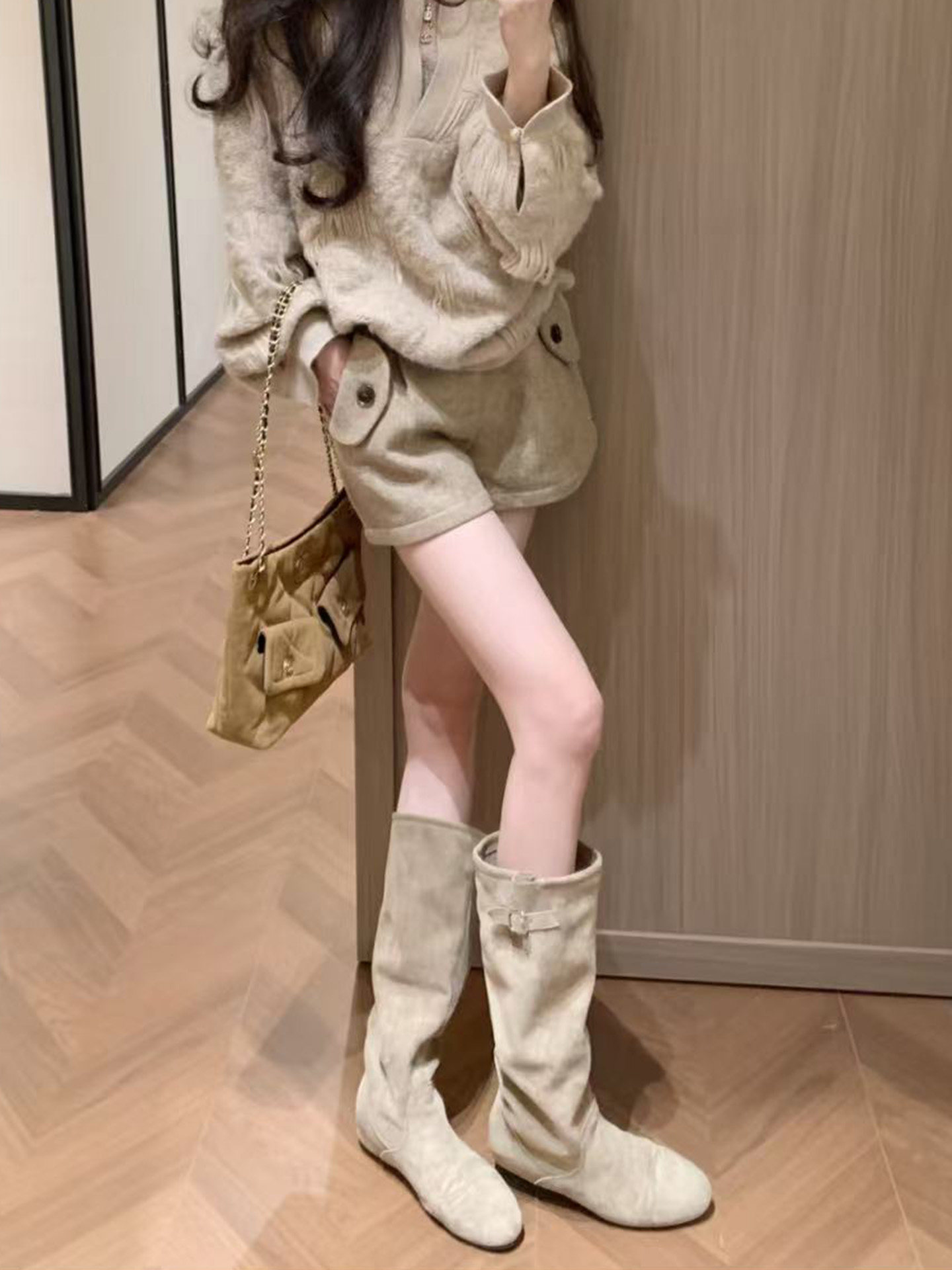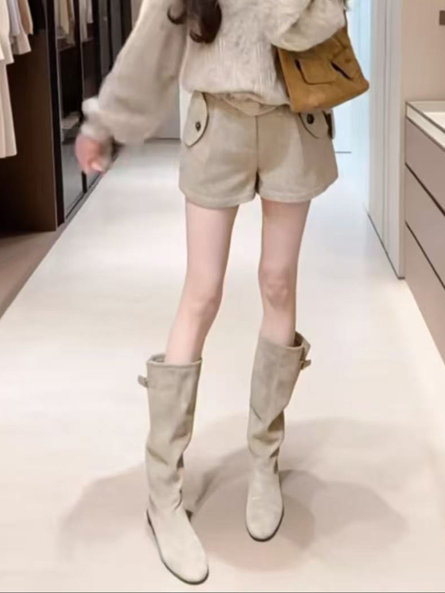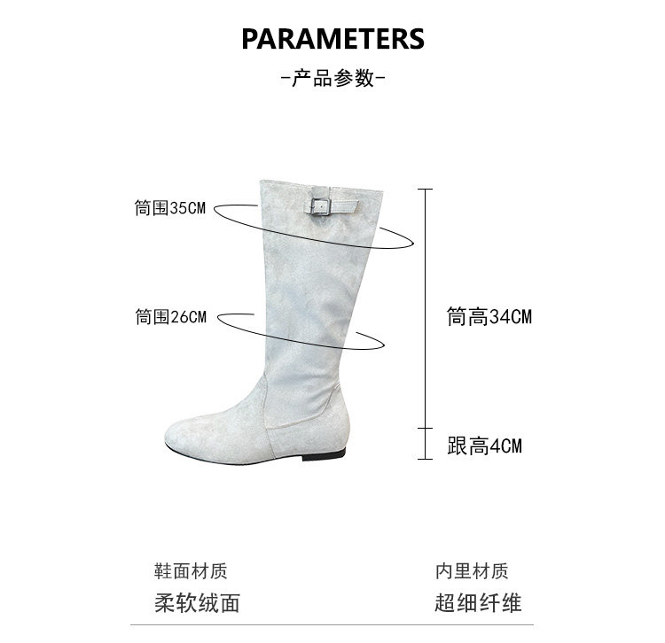 韓版高筒法式西部堆堆靴子女2025年秋冬新款圓頭絨面內增高長筒靴